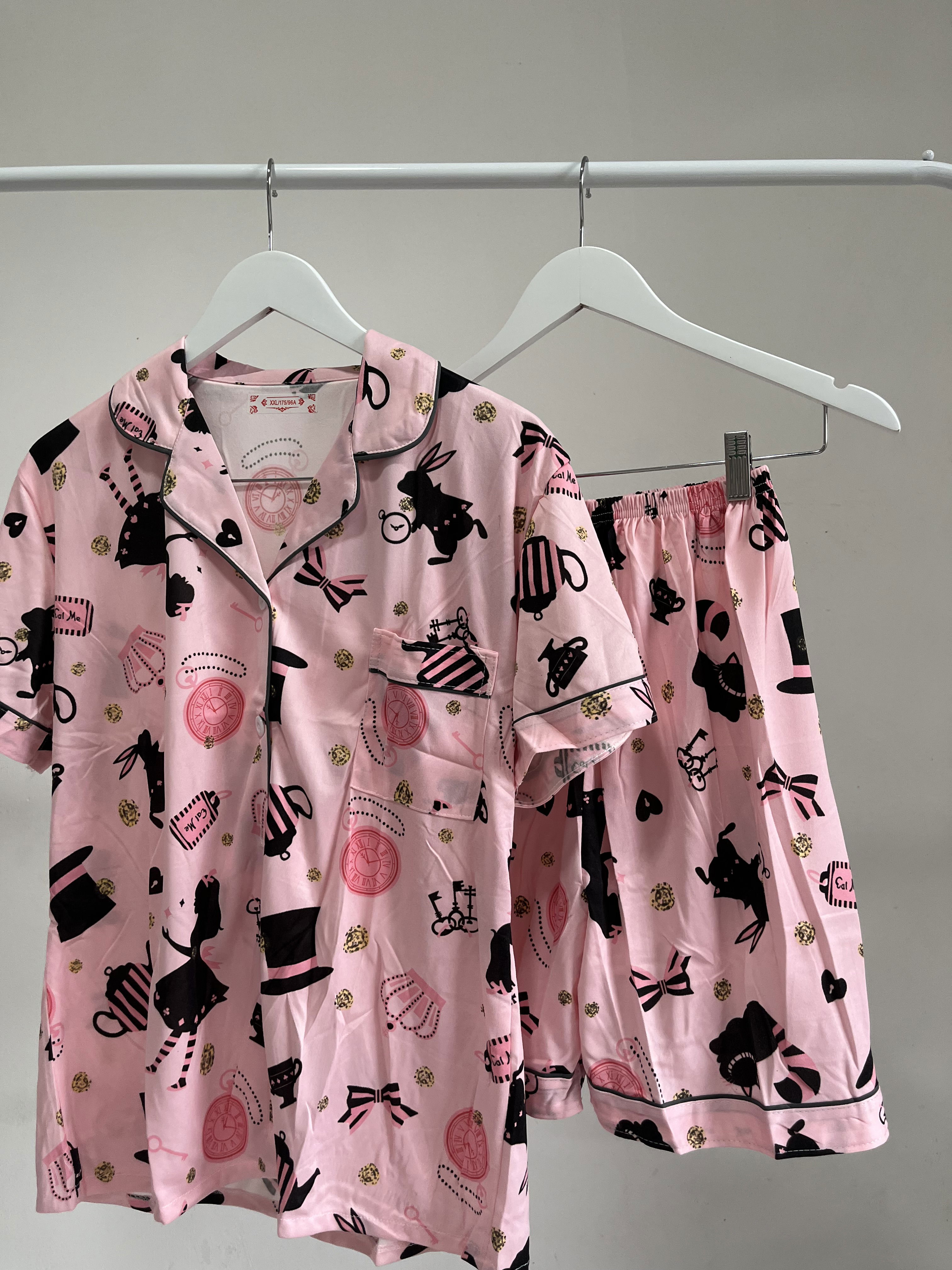 Pijama camisero importado de 2 piezas. Tela modal con satén. Camisa + short .