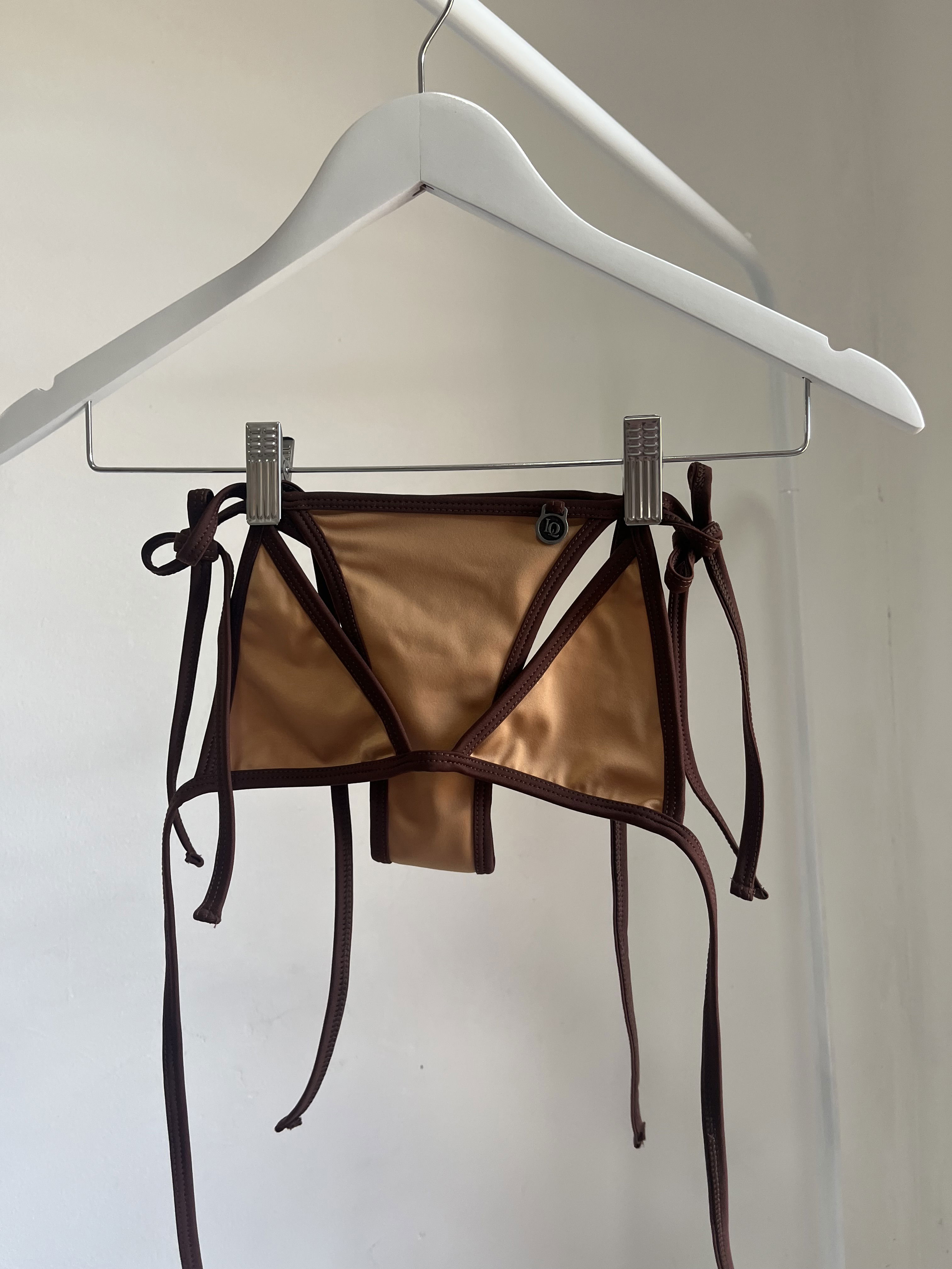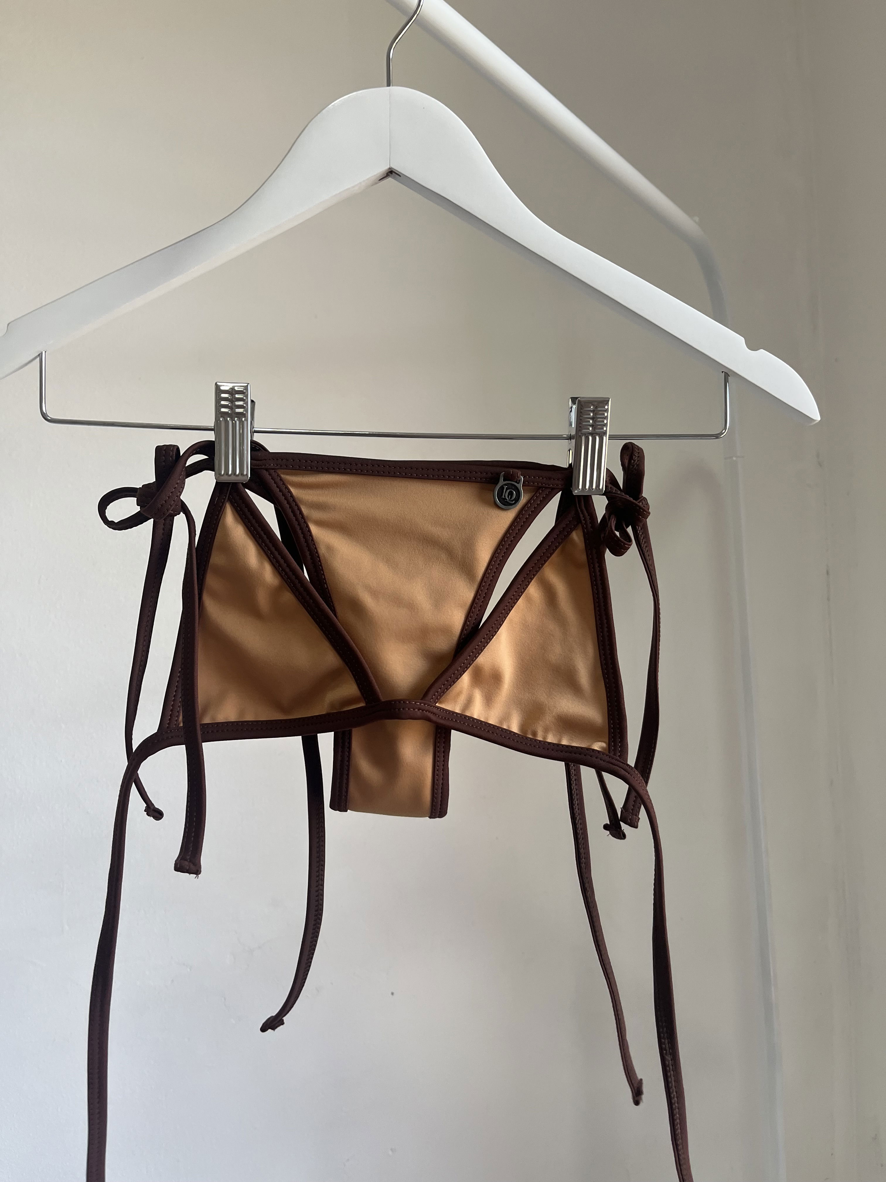 Triángulo fijo del estilo "micro bikini" y colaless para atar. Este modelo no trae tazas desmontables y no tiene el hueco para agregarle.