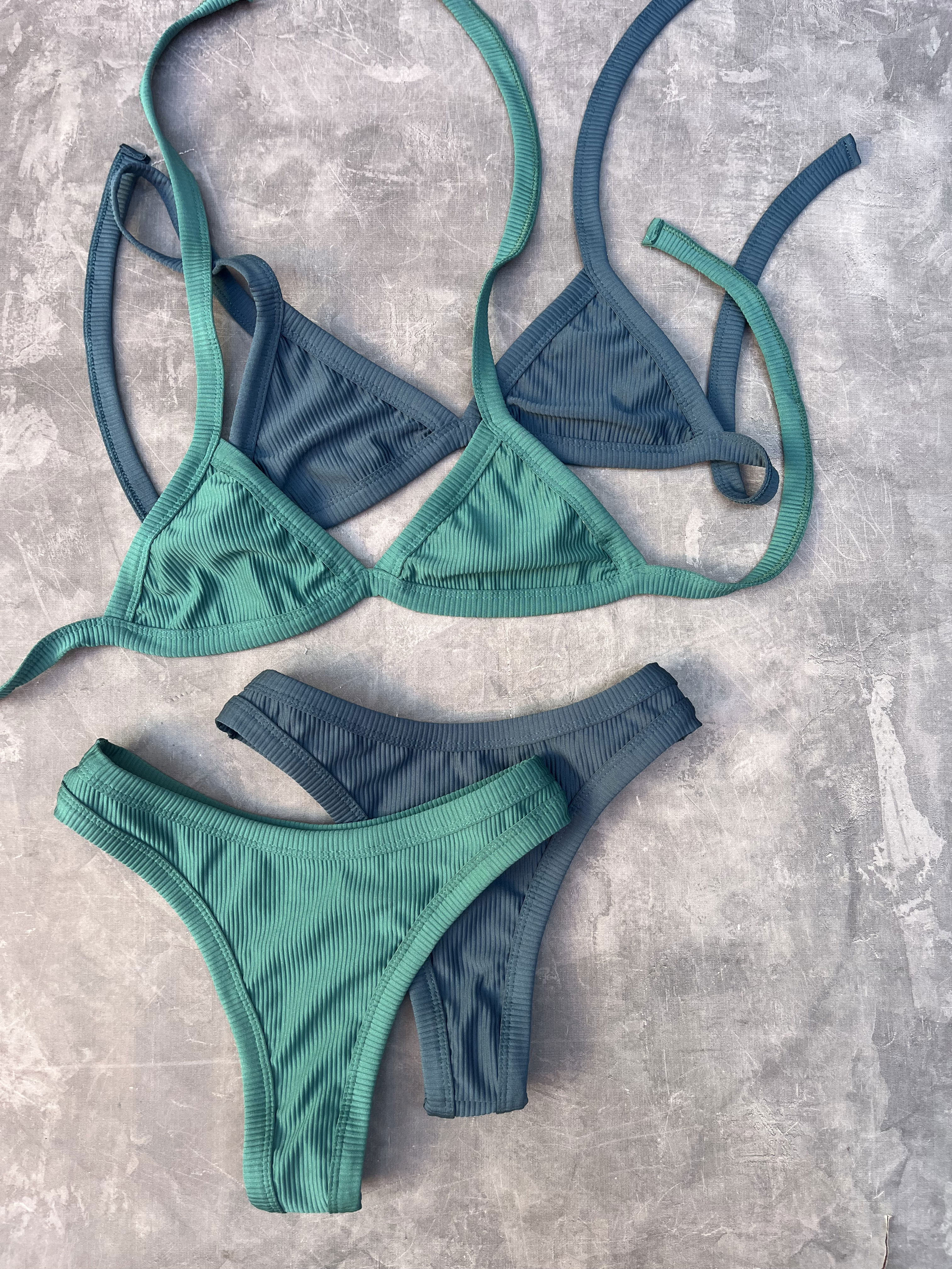 Triángulo con tiras para atar y colaless entera. El corpiño no trae tazas desmontables pero SI TRAE LA ABERTURA PARA AGREGARLE. es una de las bikinis más elegidas por su comodidad y sostén !