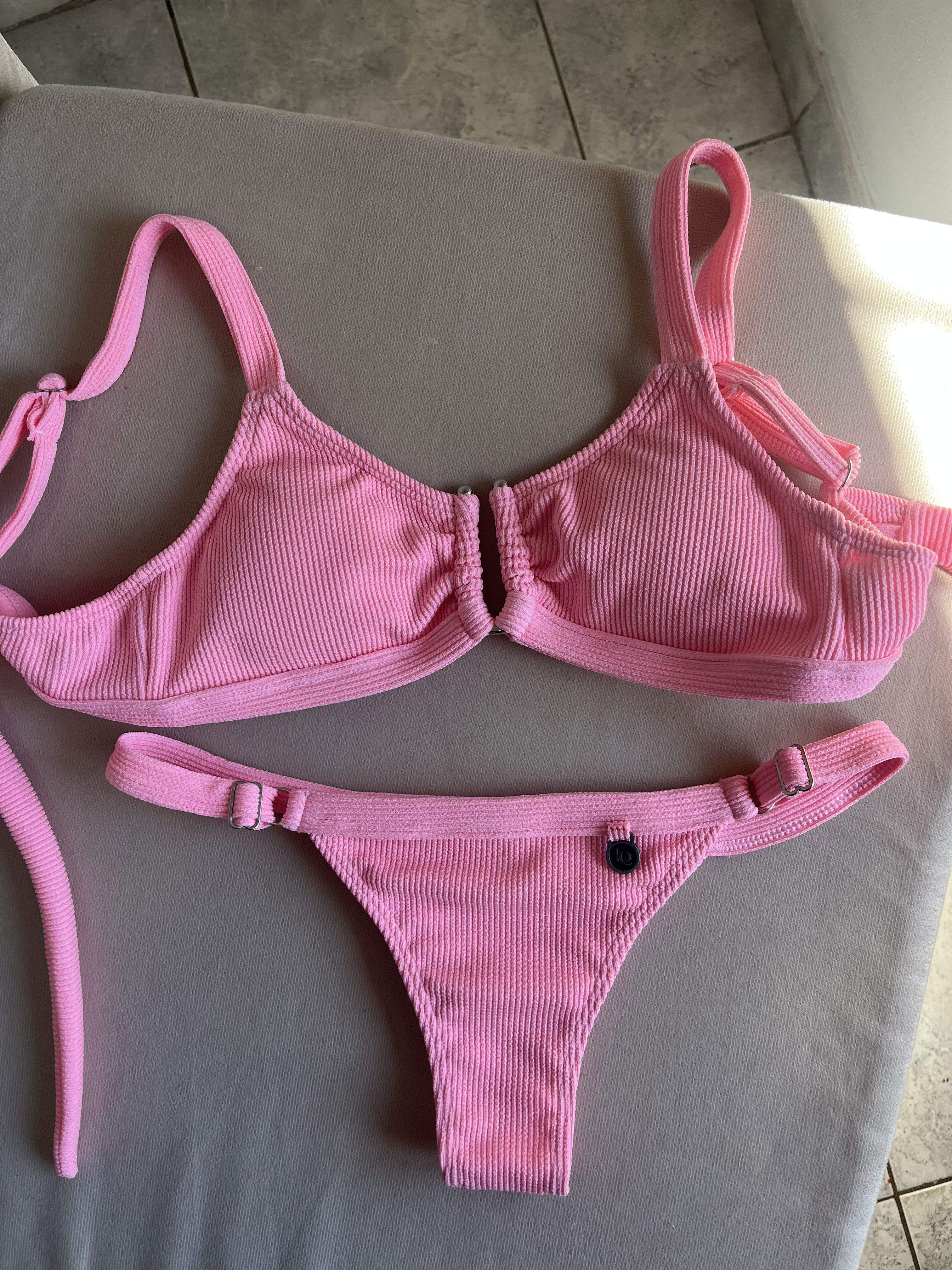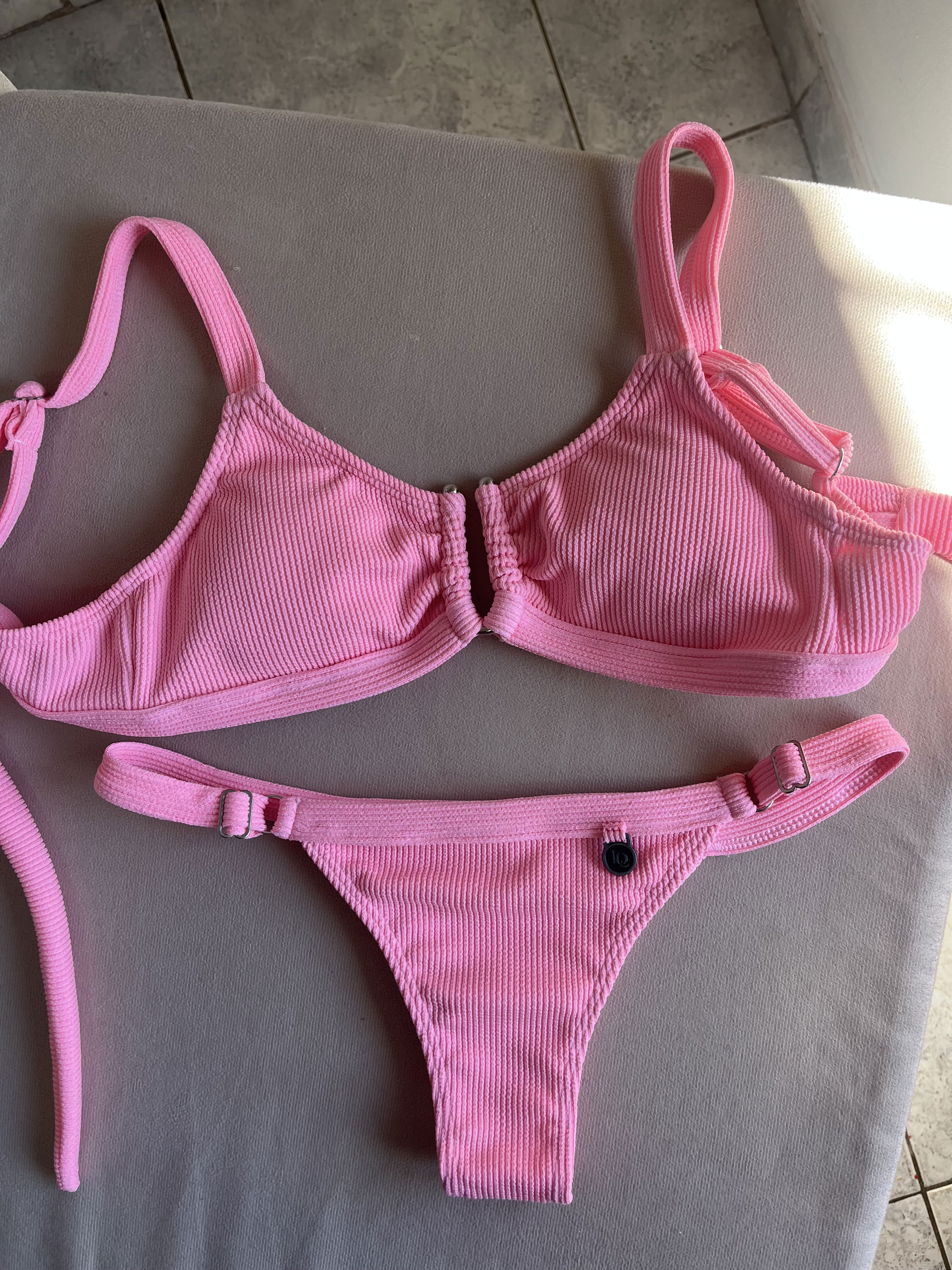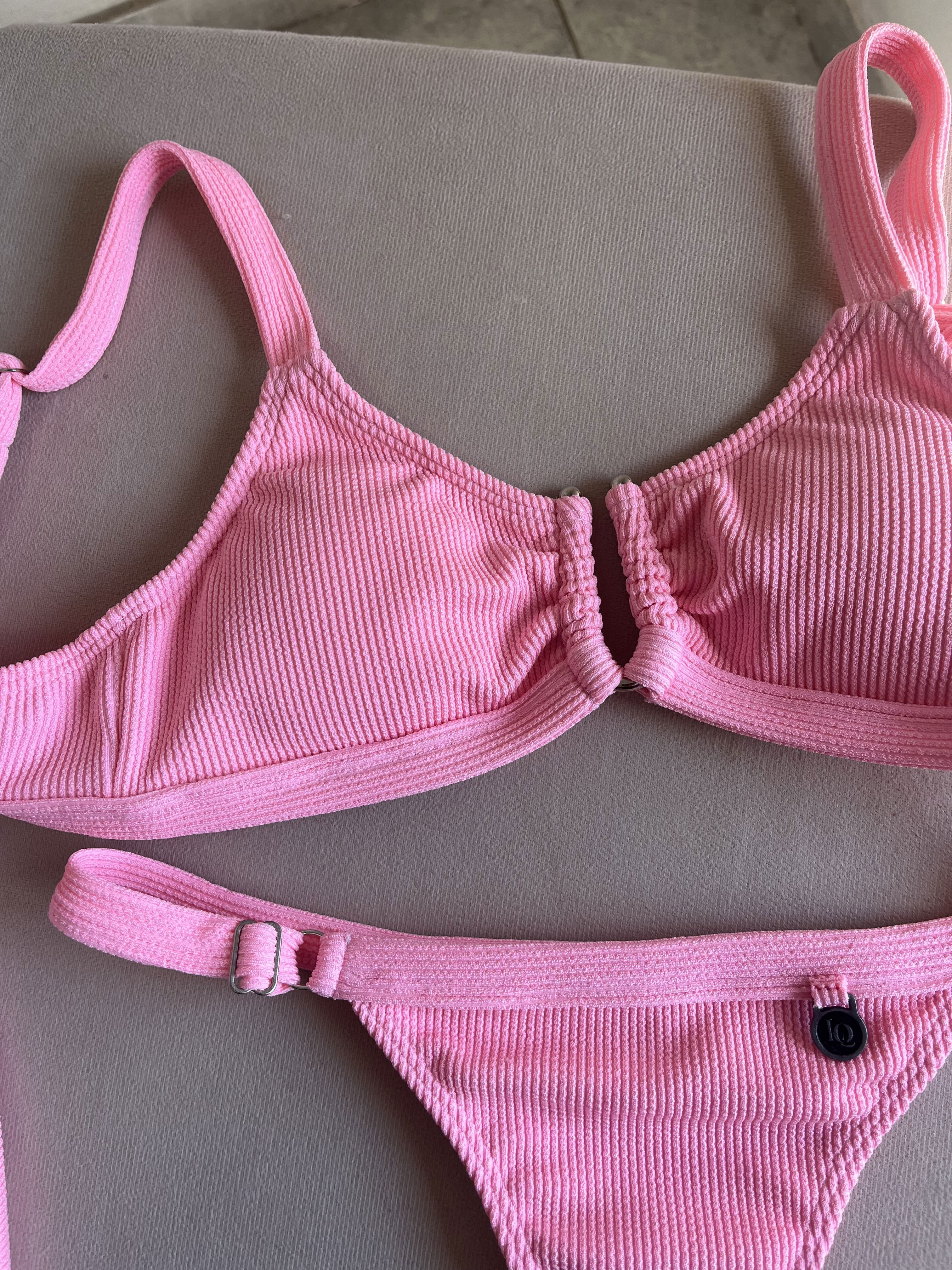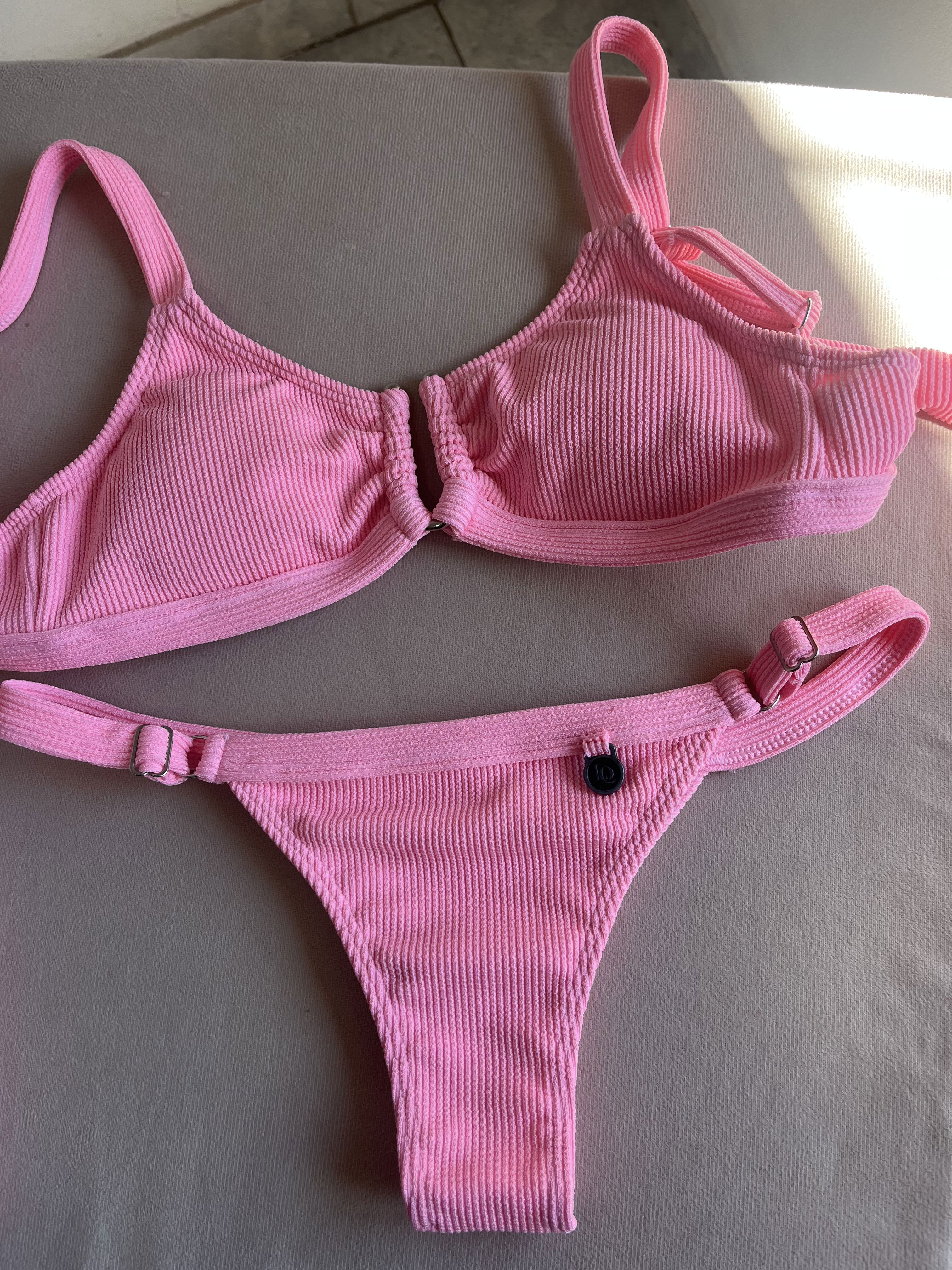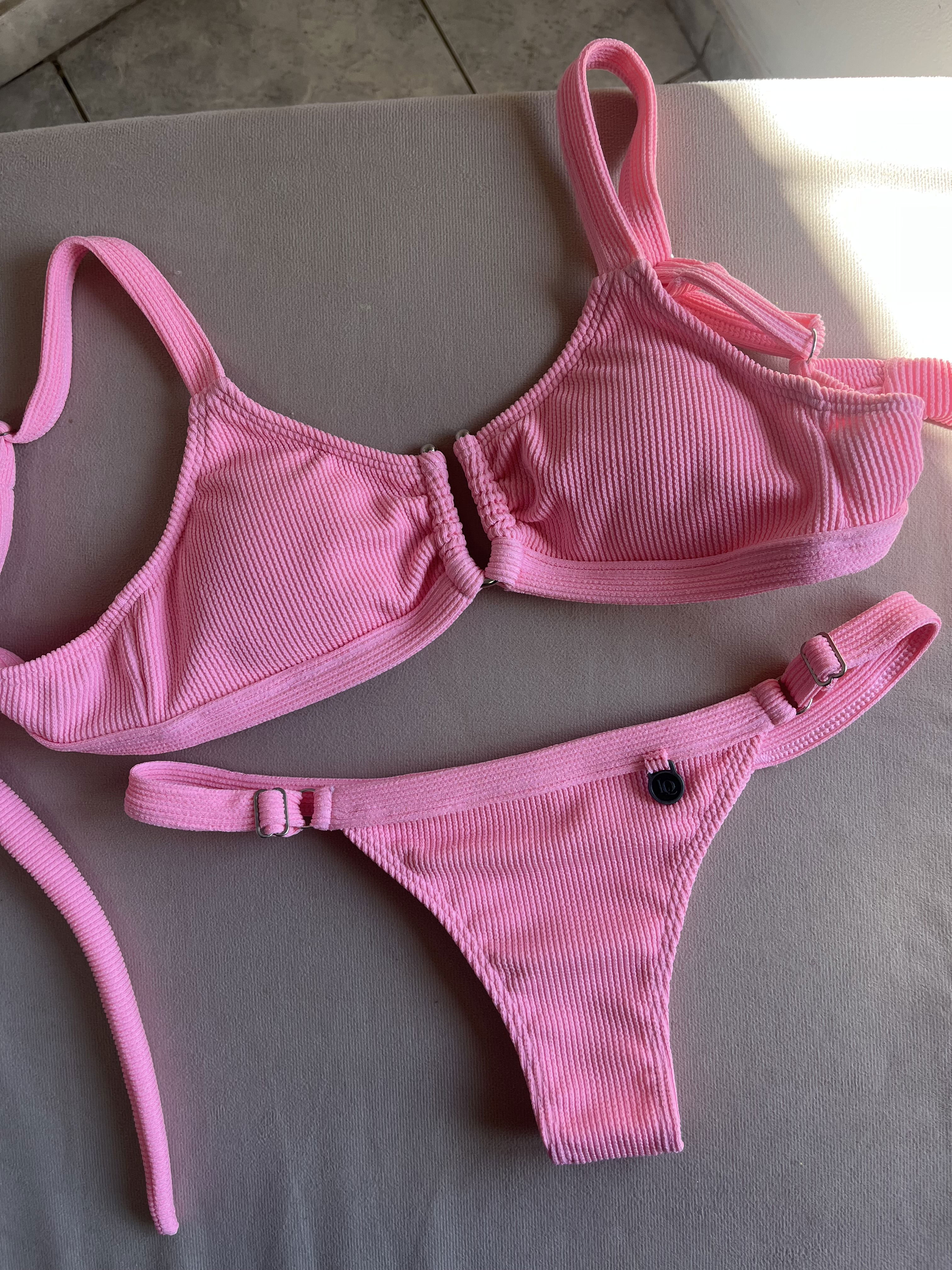 Top texturado con herraje, breteles regulables y espalda para atar. Colaless regulable