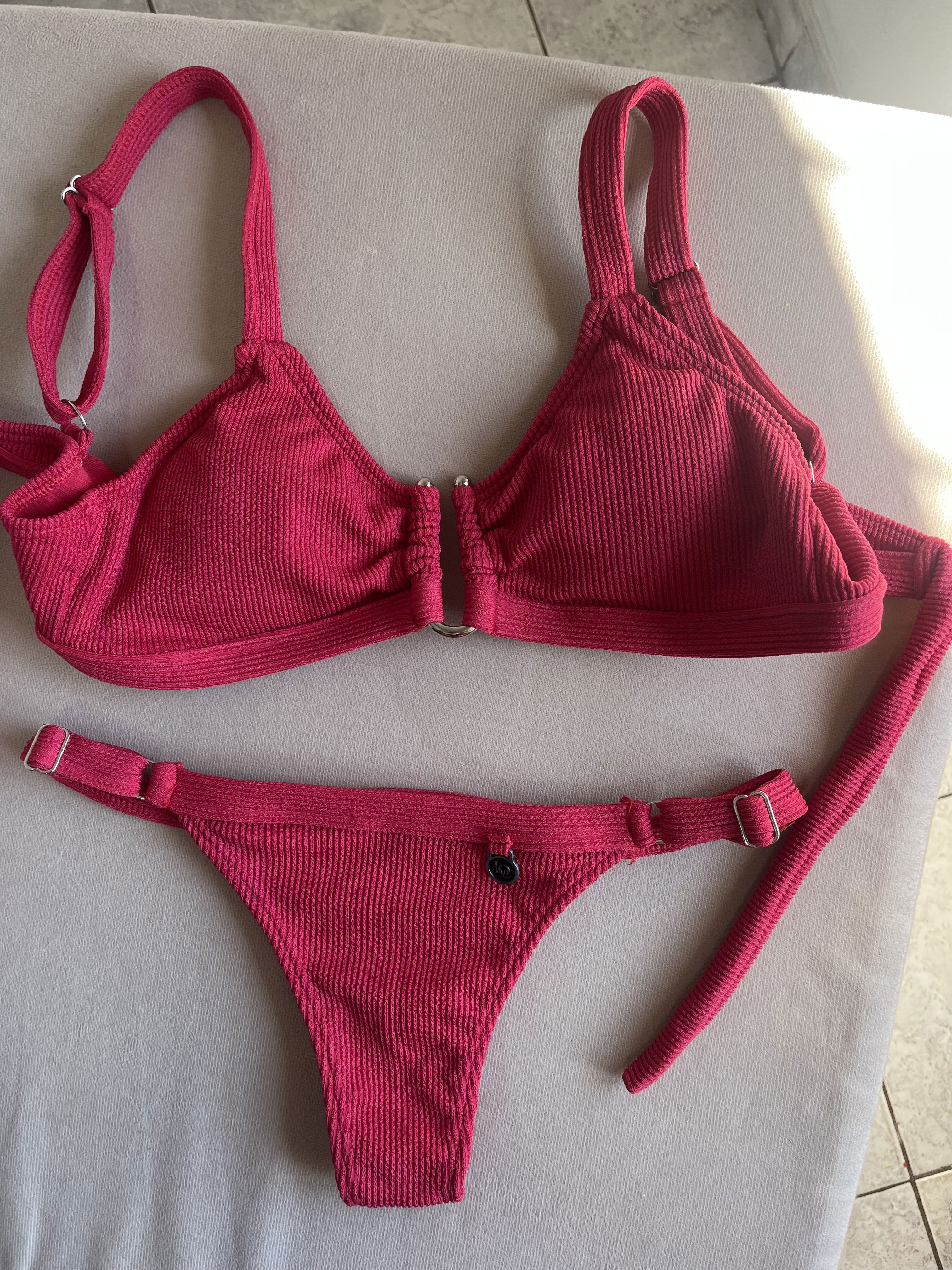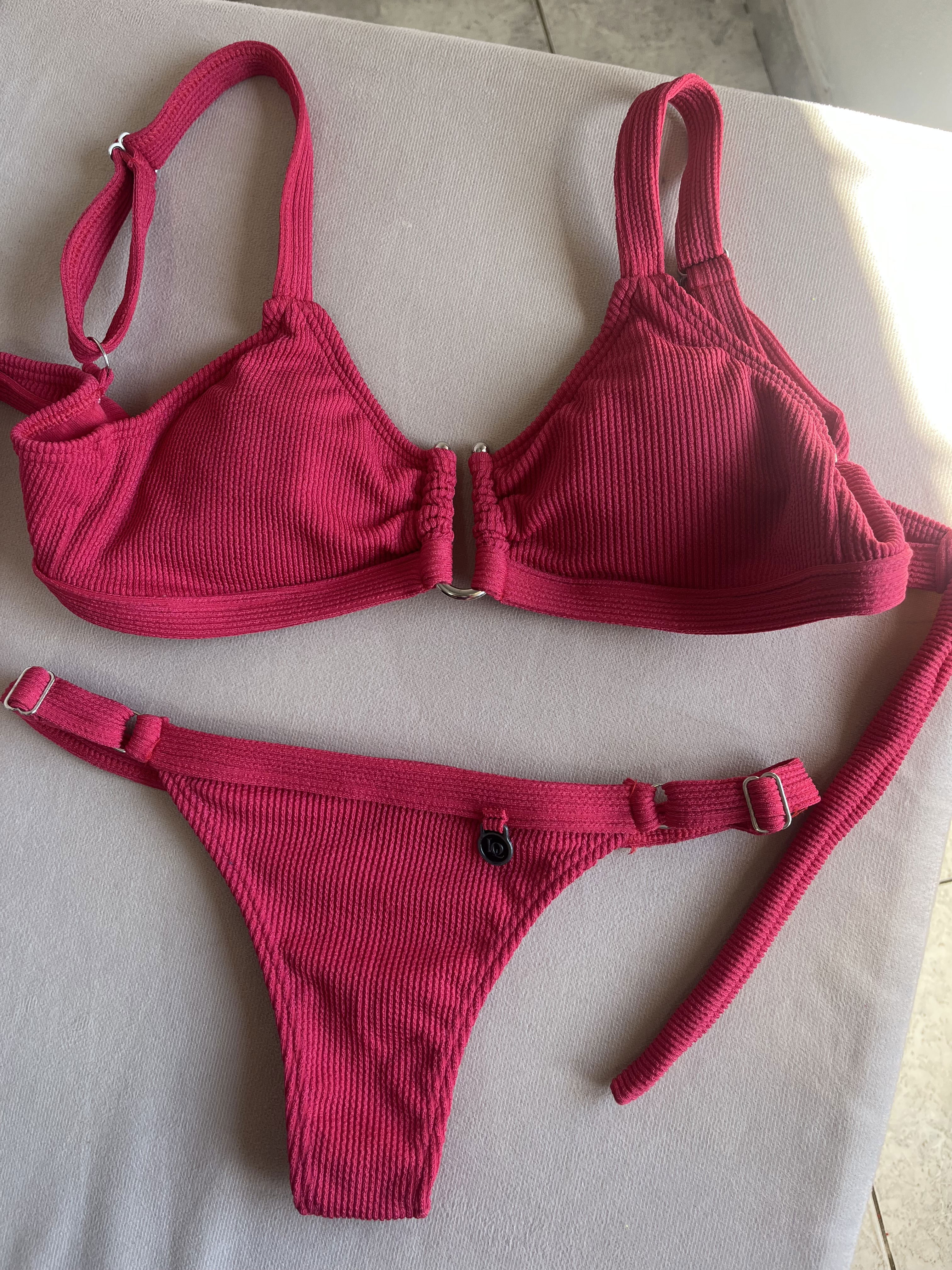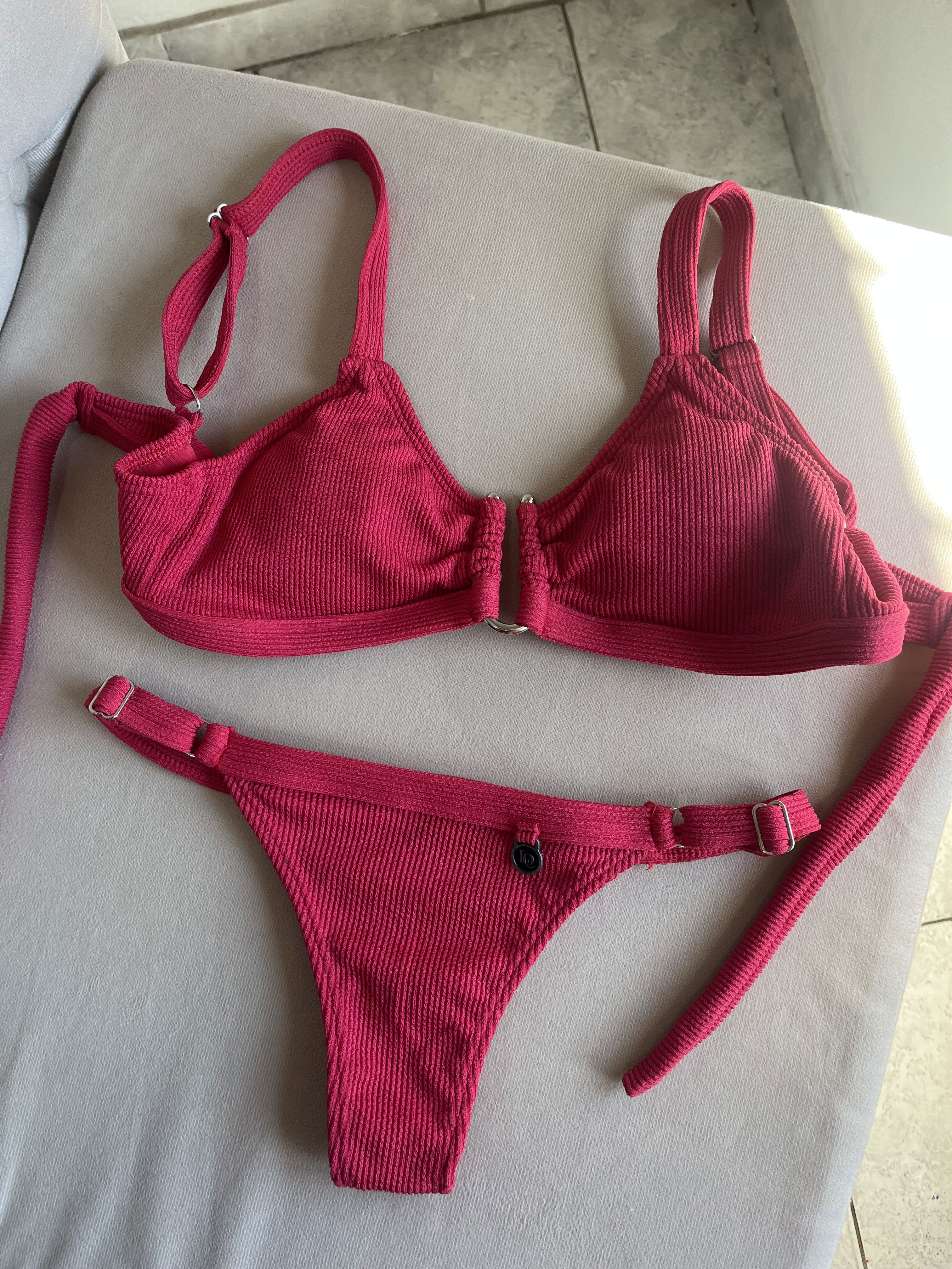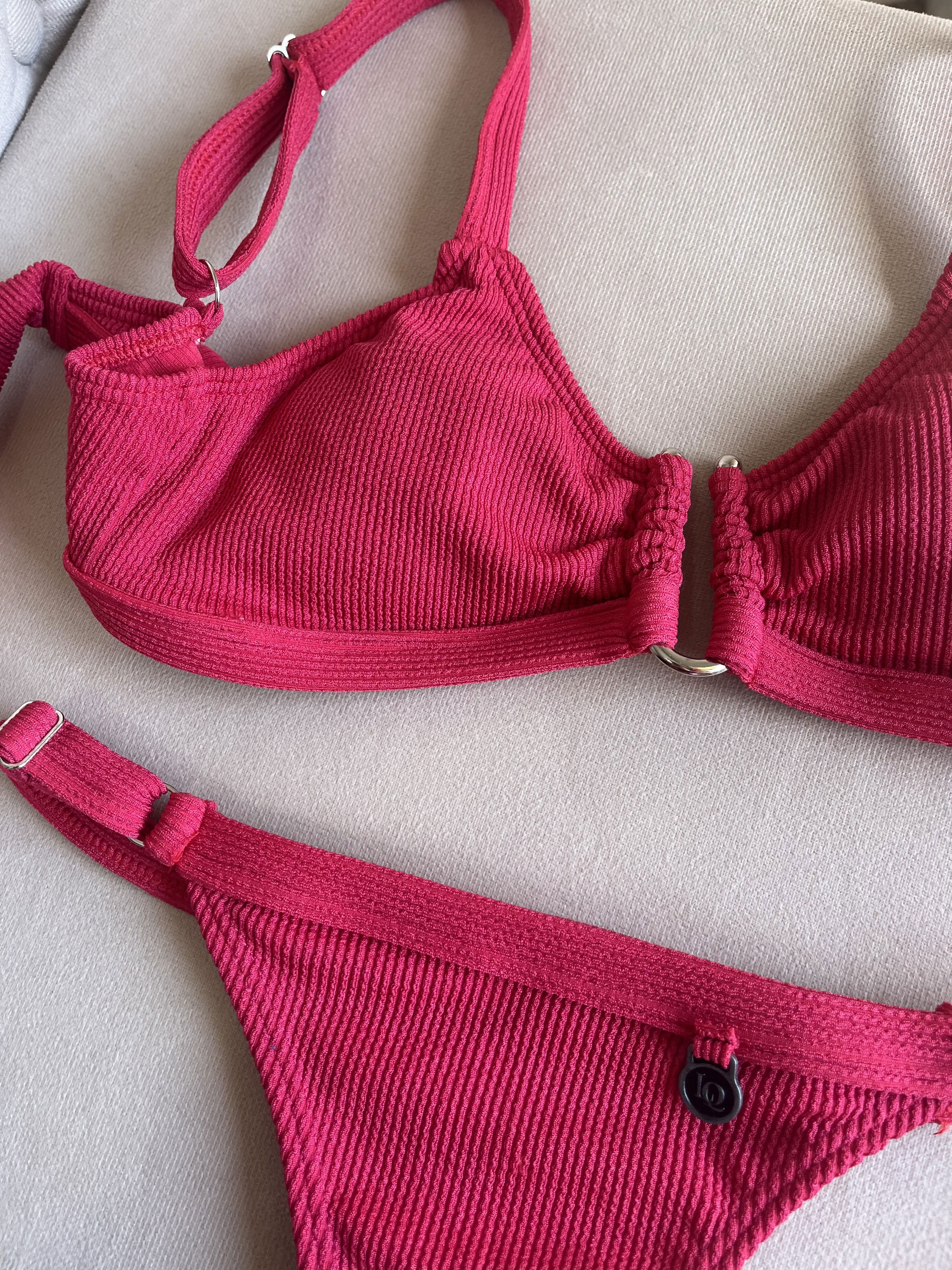 Top texturado con herraje, breteles regulables y espalda para atar. Colaless regulable