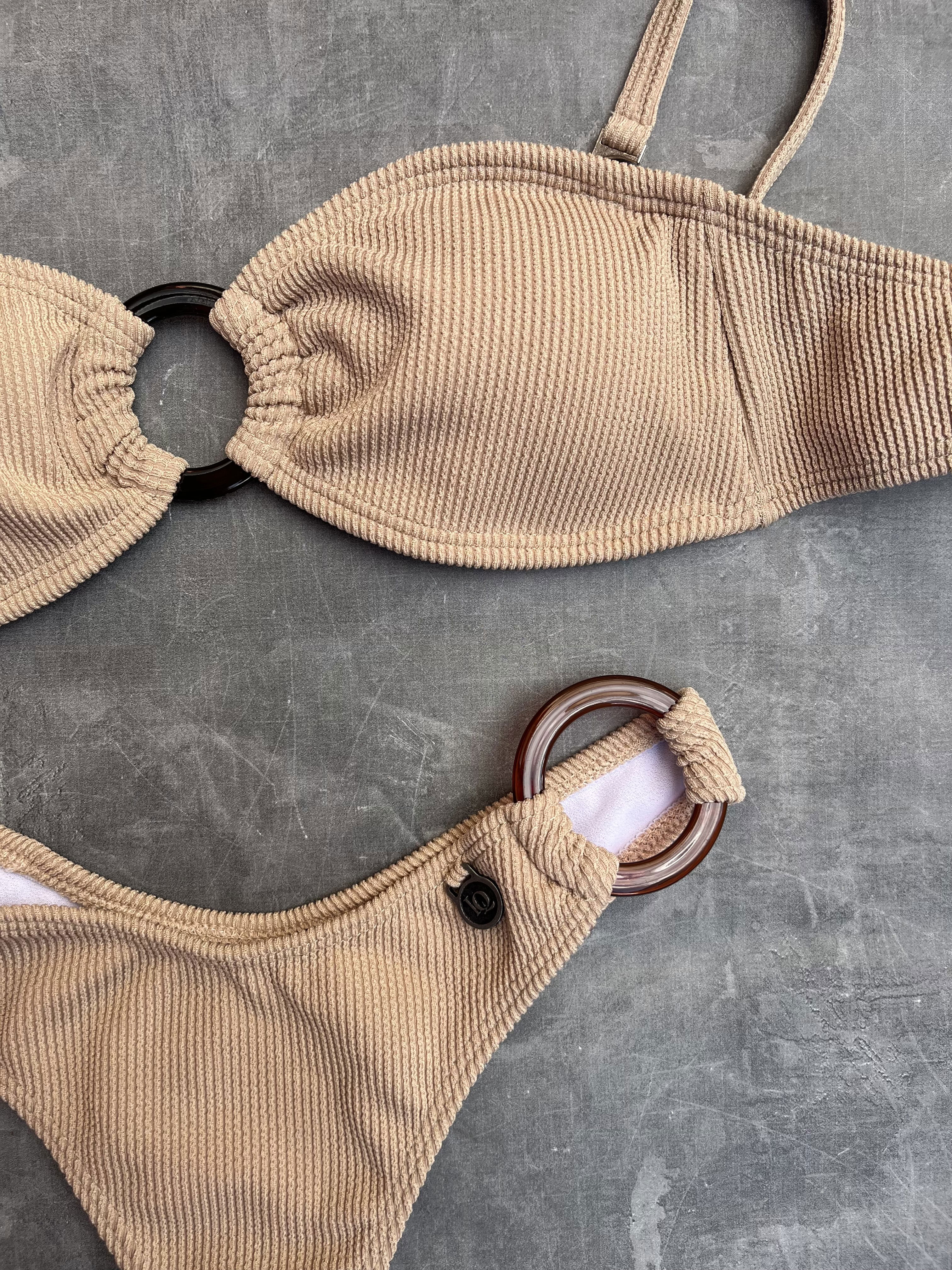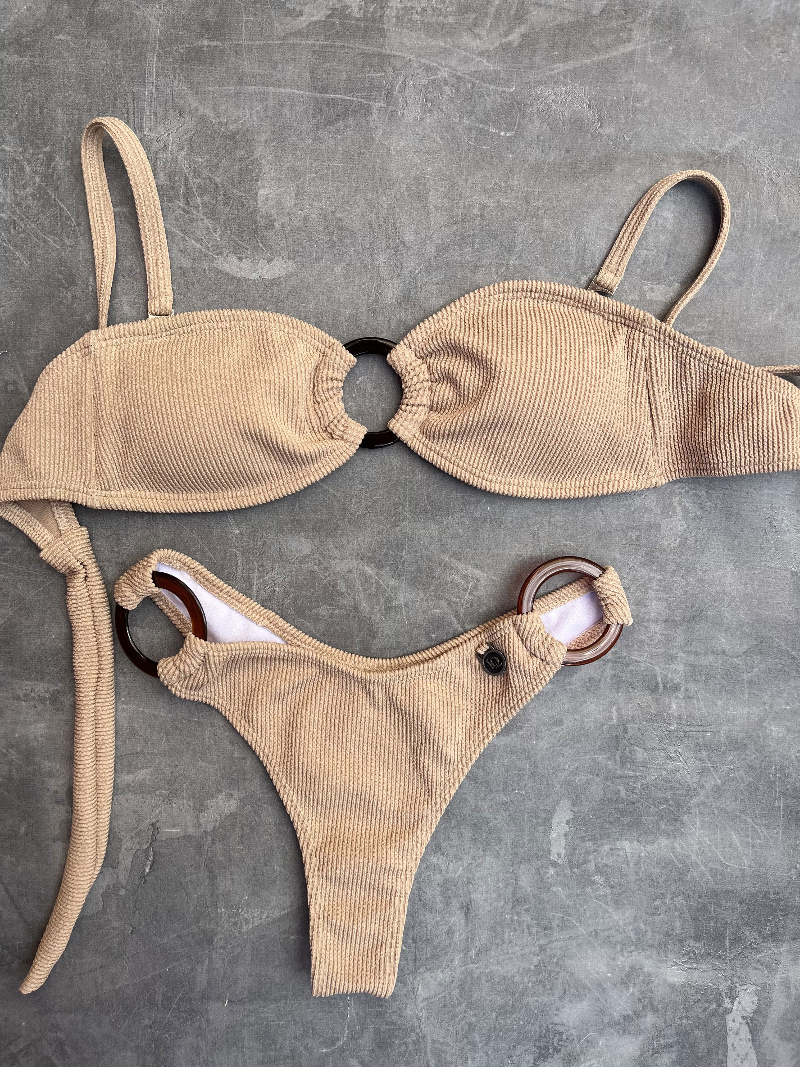 Top straples con argolla Carey , breteles desmontable, regulables y espalda para atar. Colaless con detalle de argollas Carey.