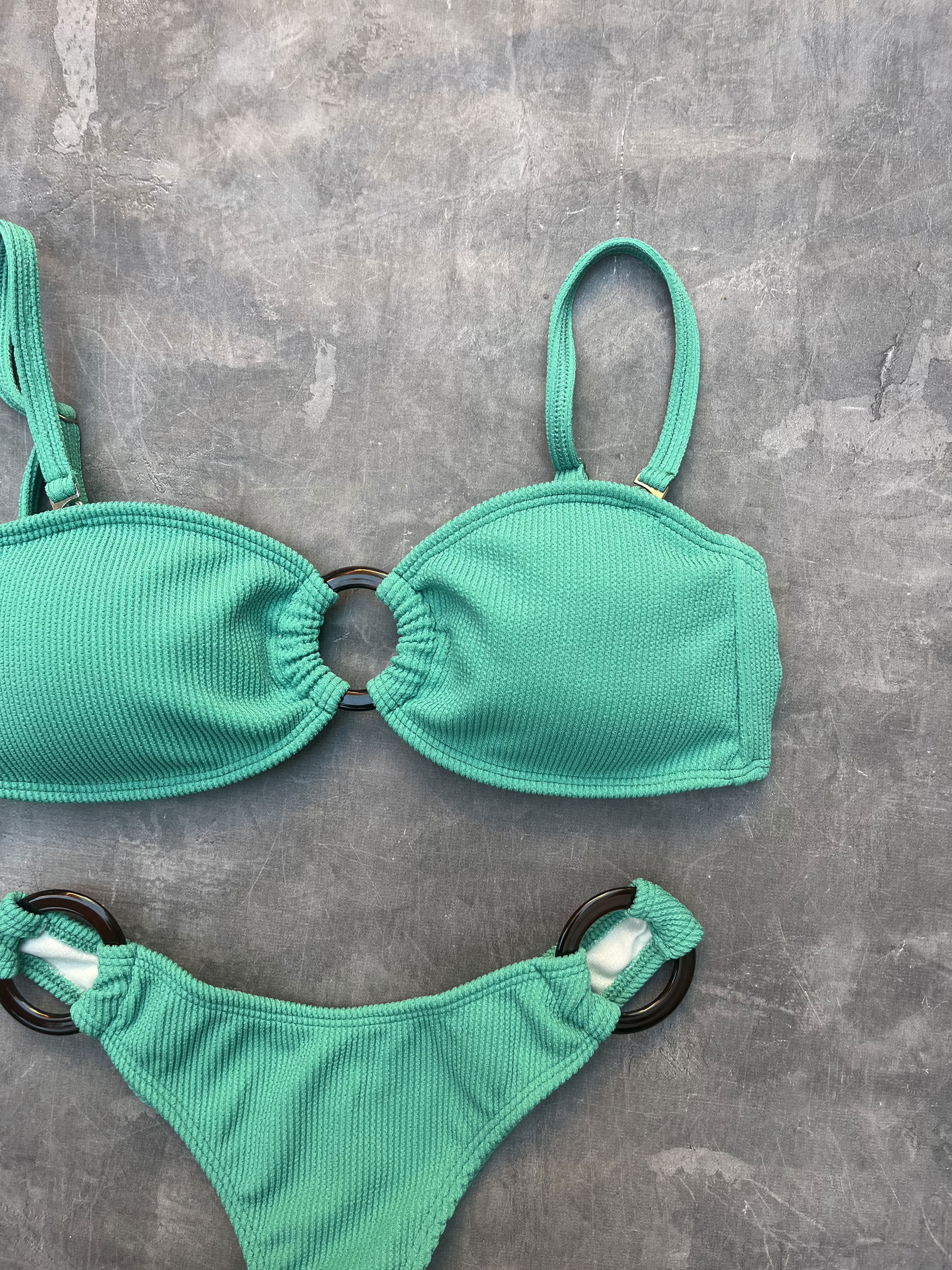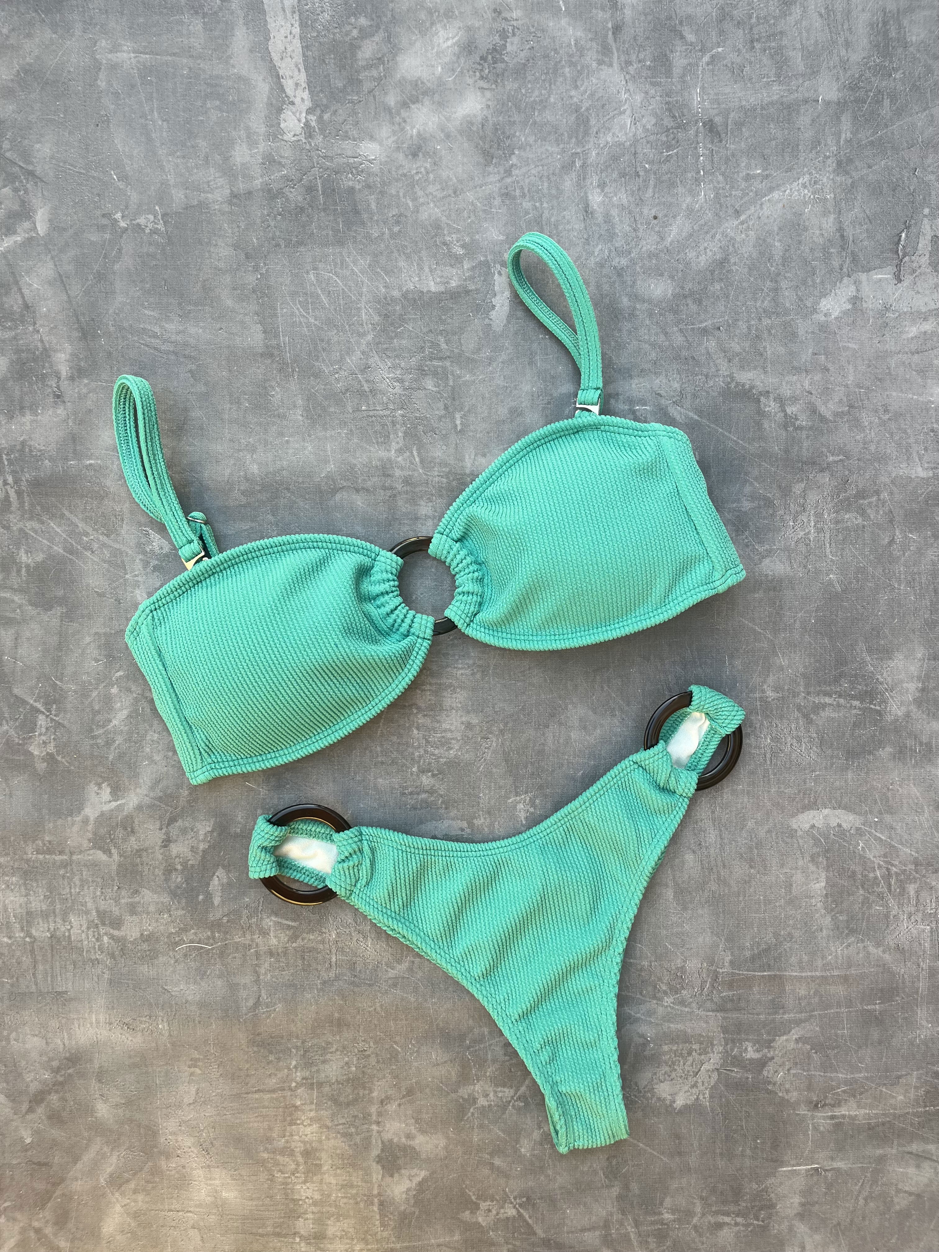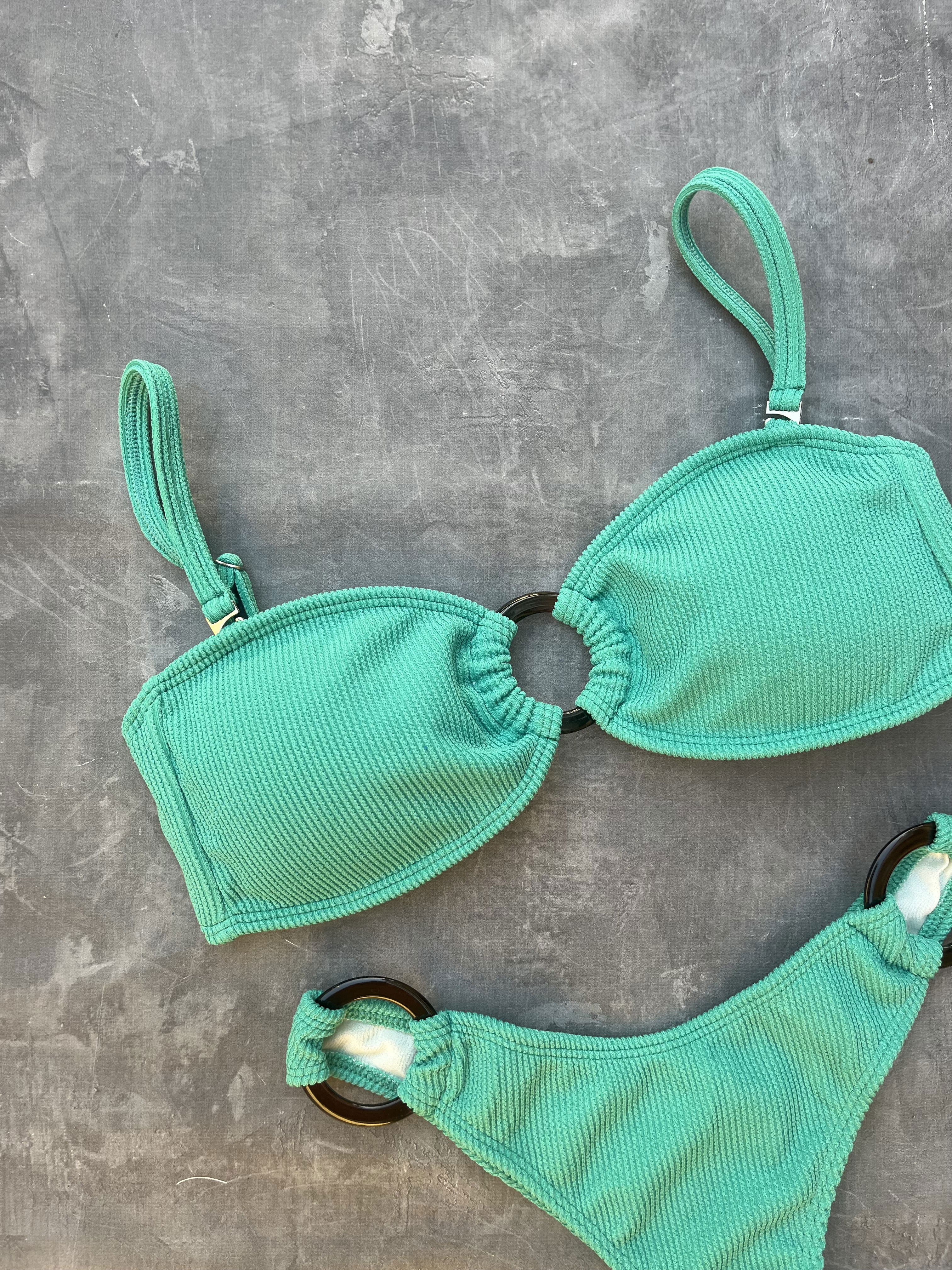 Top straples con argolla Carey , breteles desmontable, regulables y espalda para atar. Colaless con detalle de argollas Carey.