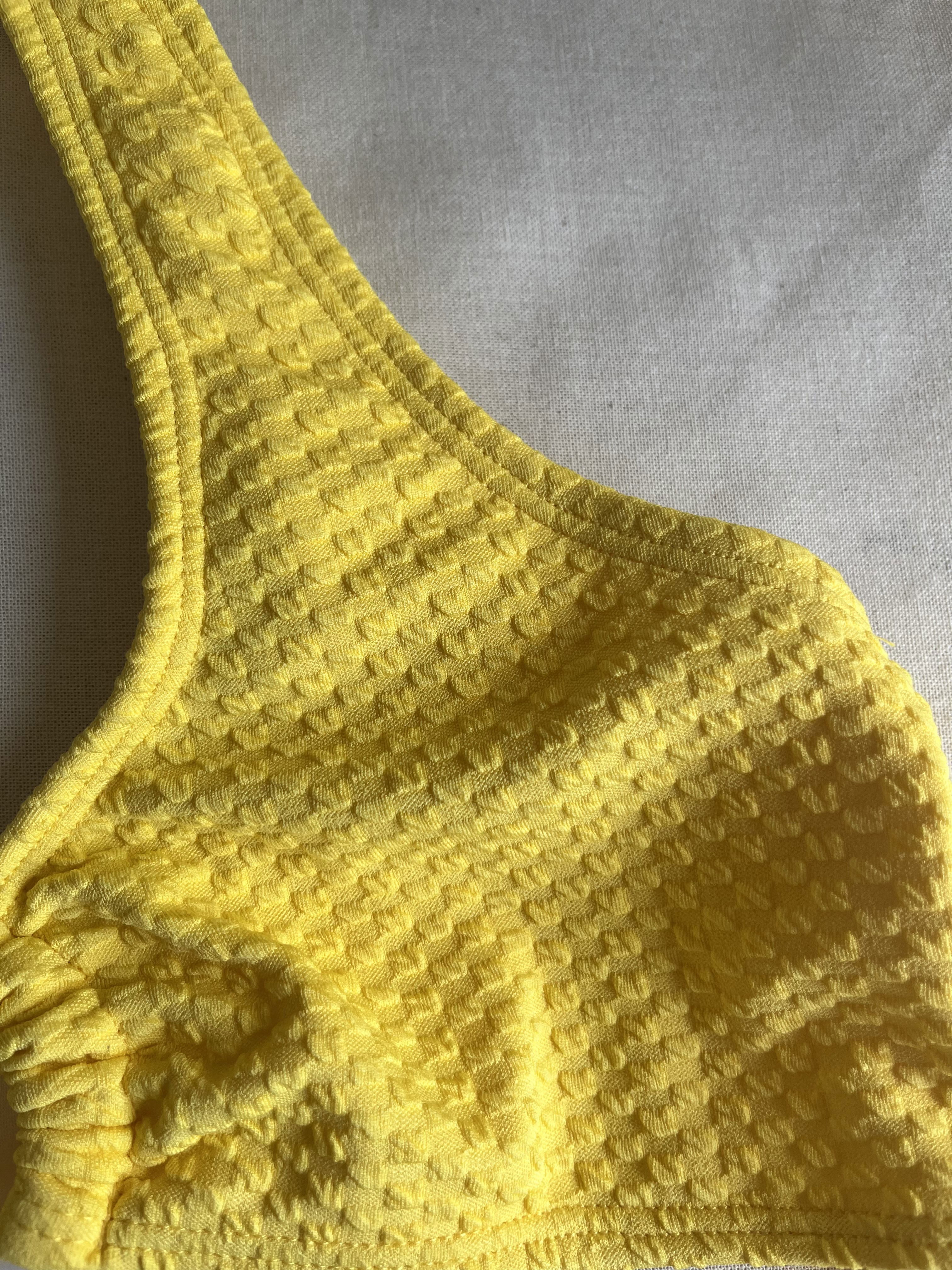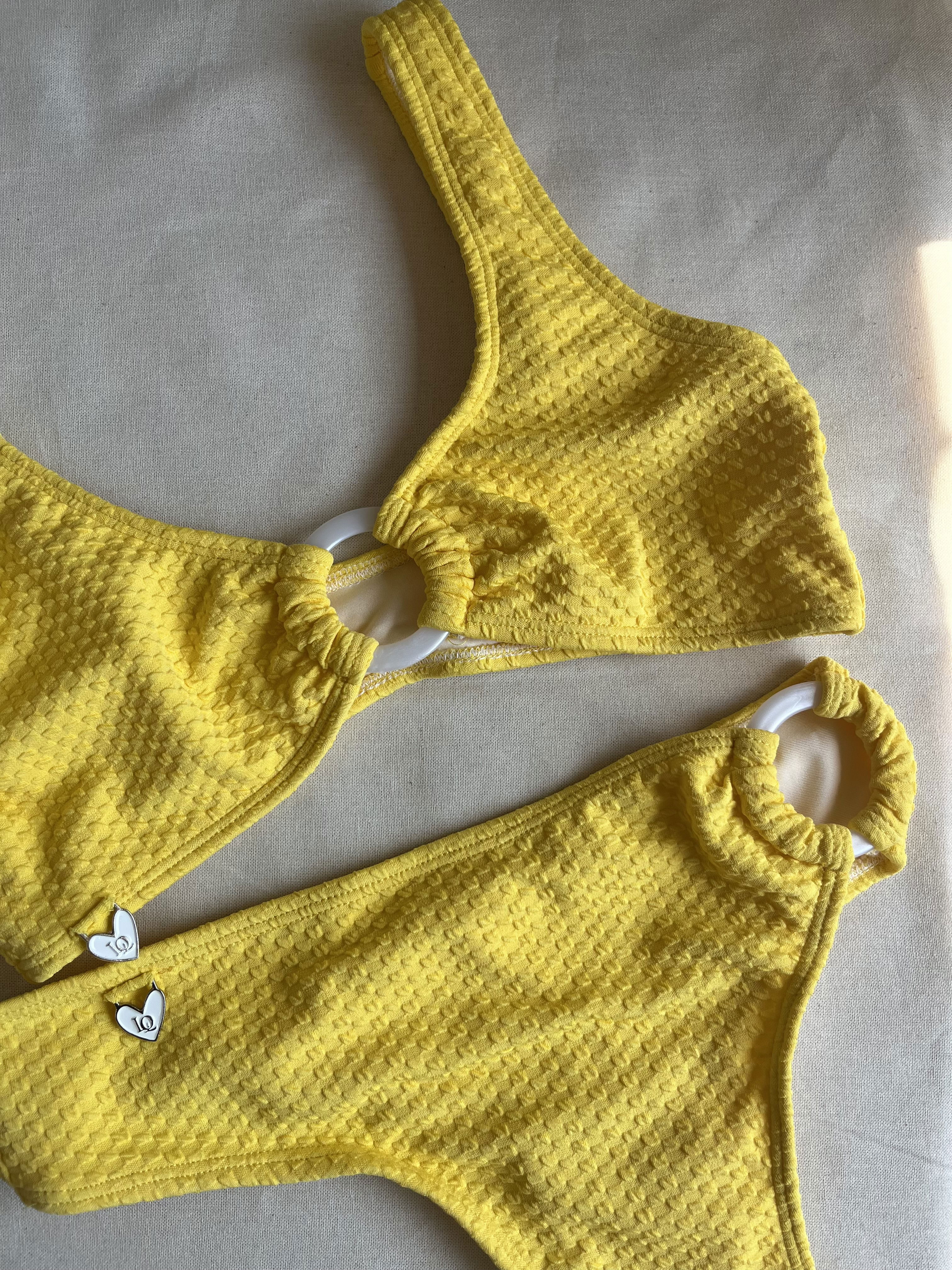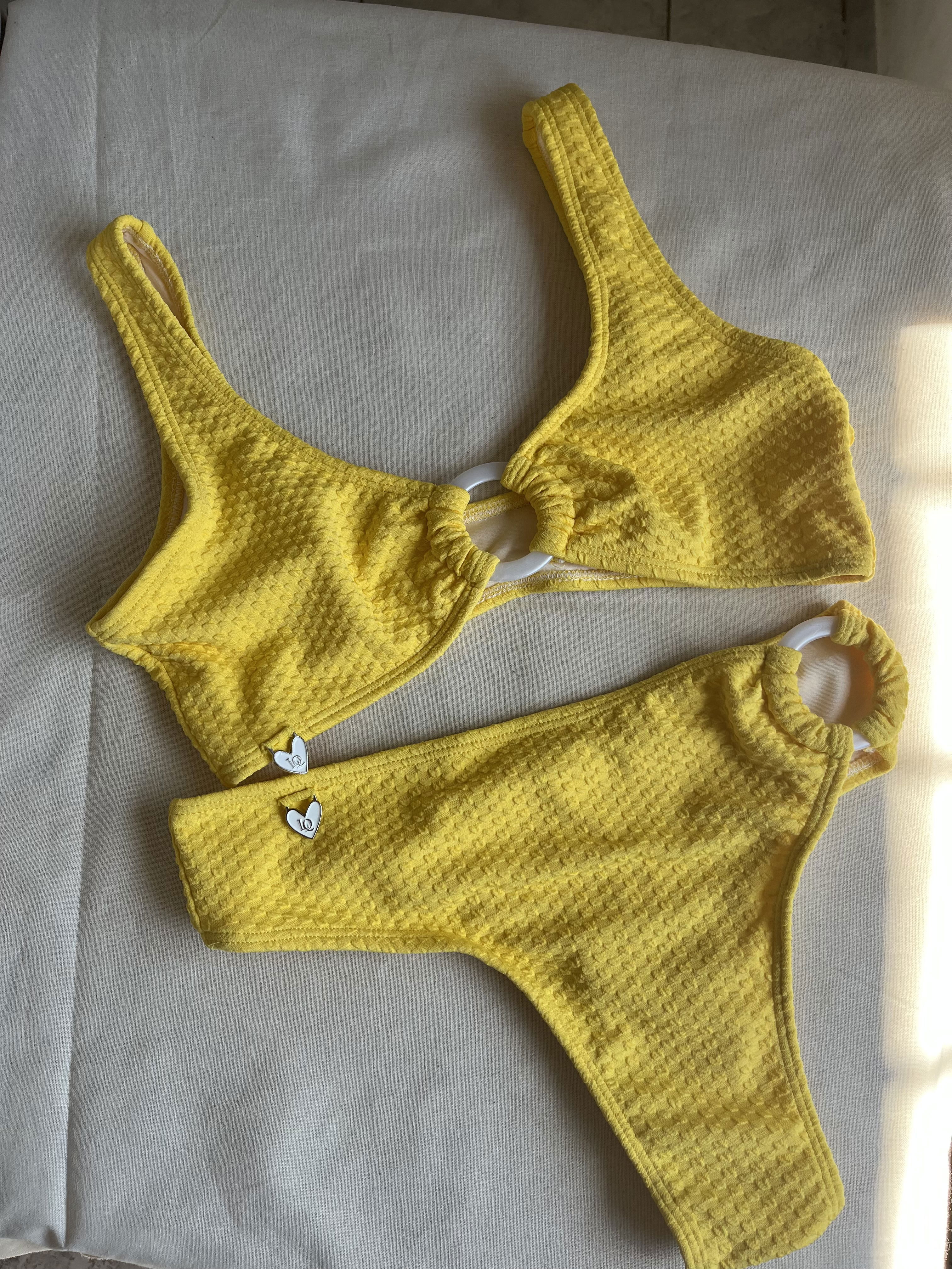 Top con argolla Carey . Colaless tiro alto con detalle de argolla Carey.