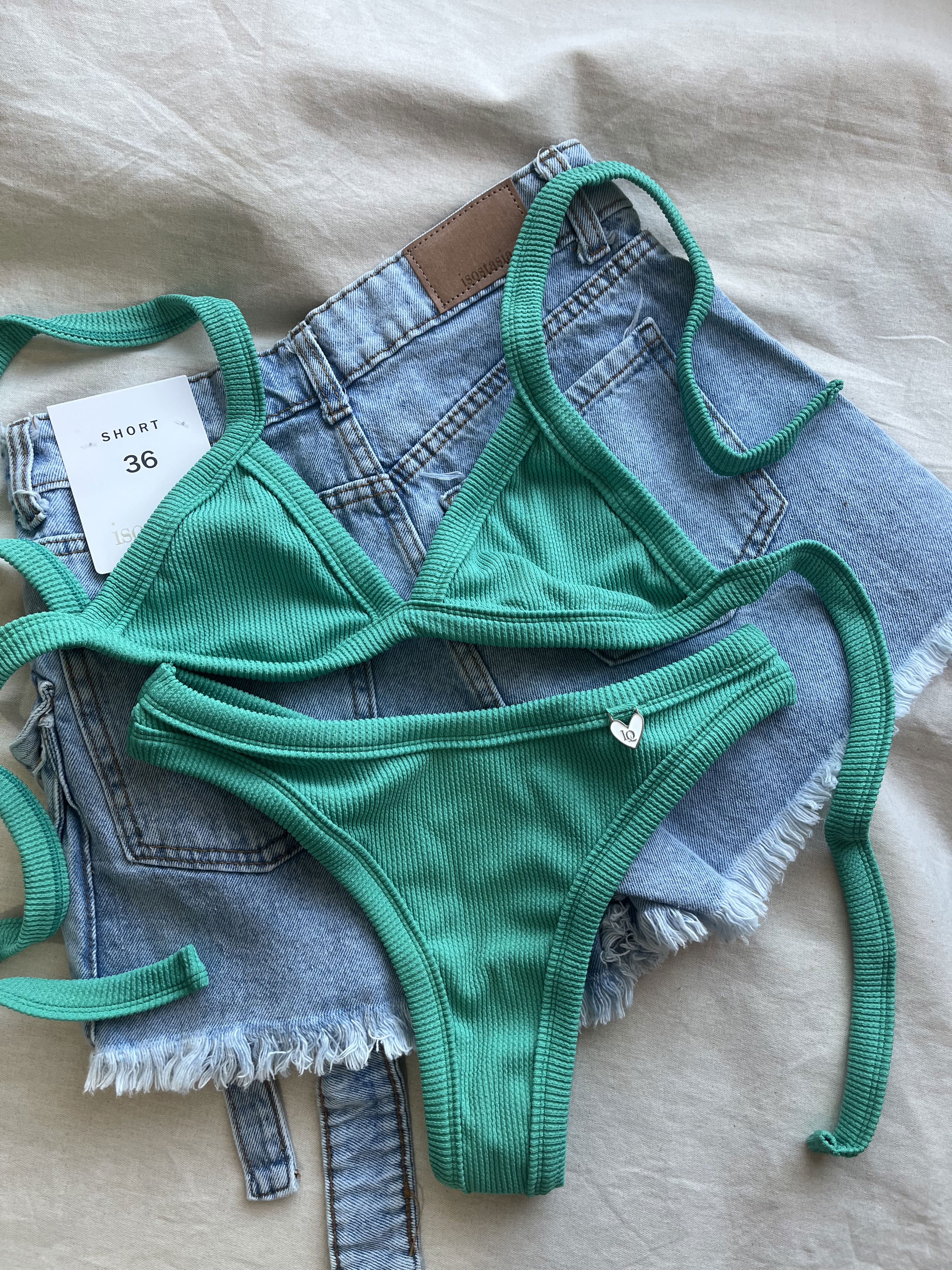 Triángulo con tiras para atar y colaless entera. El corpiño NO TRAE tazas desmontables pero TIENE ABERTURA PARA AGREGARLE.
