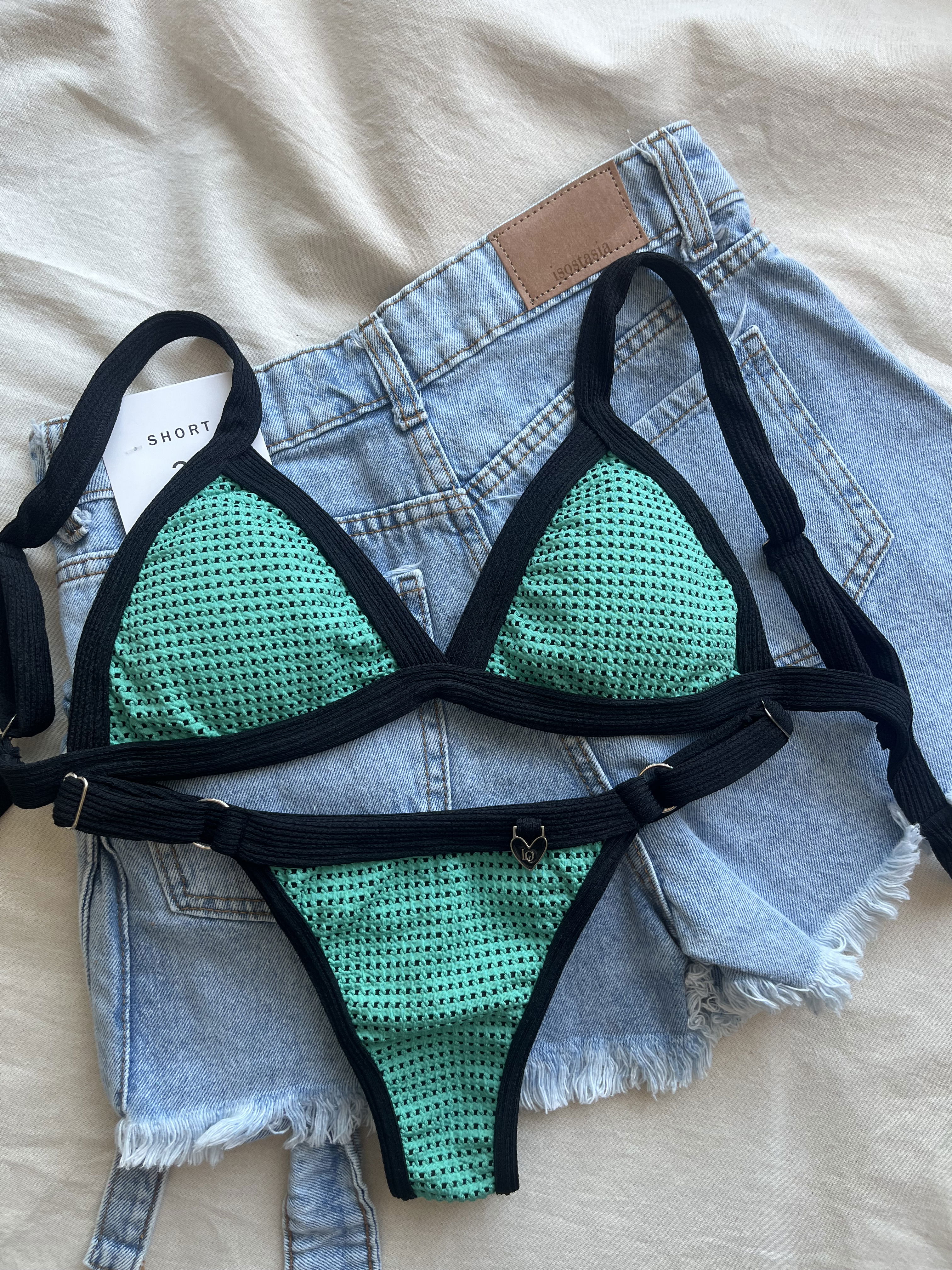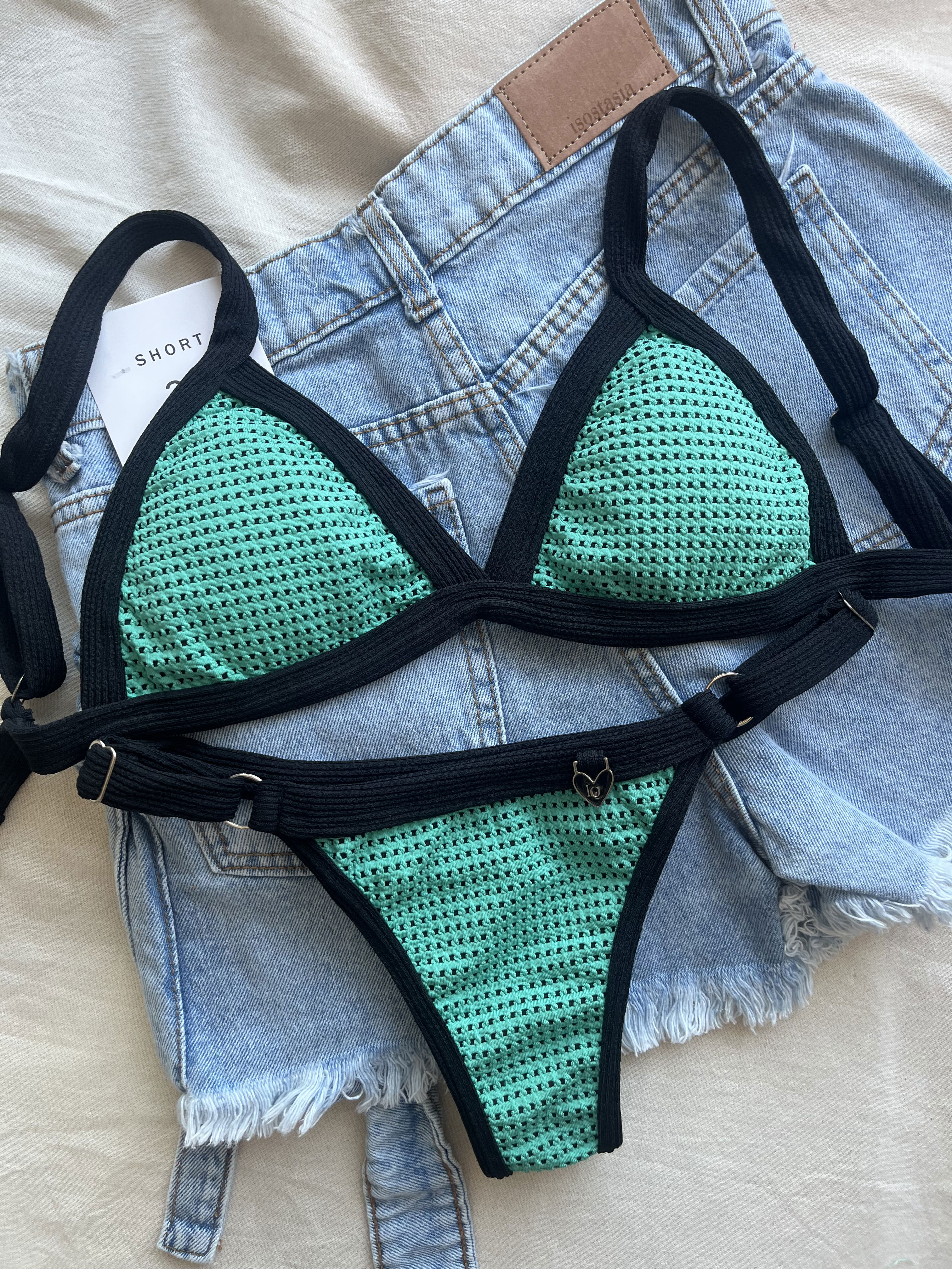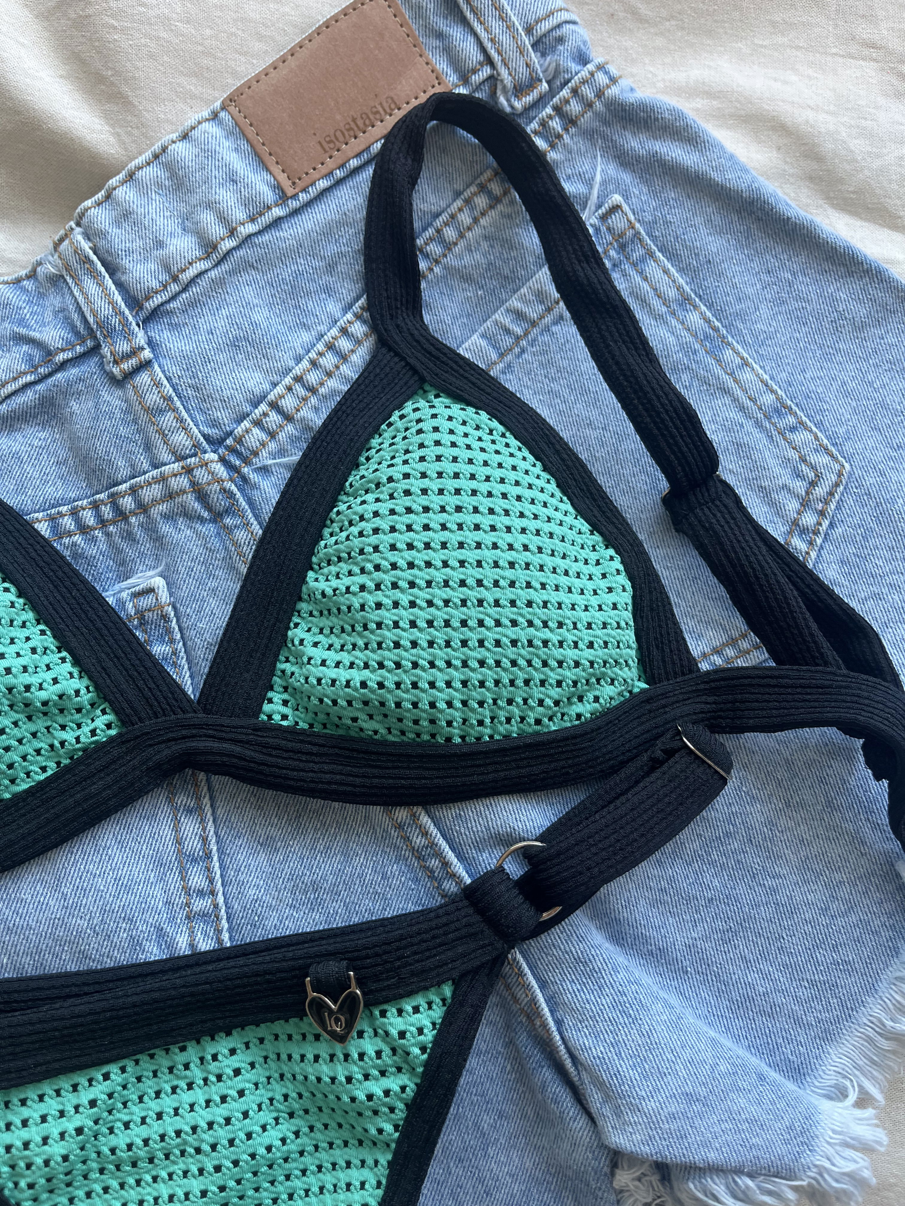 Triángulo texturado con breteles regulables y espalda para atar. Colaless regulable