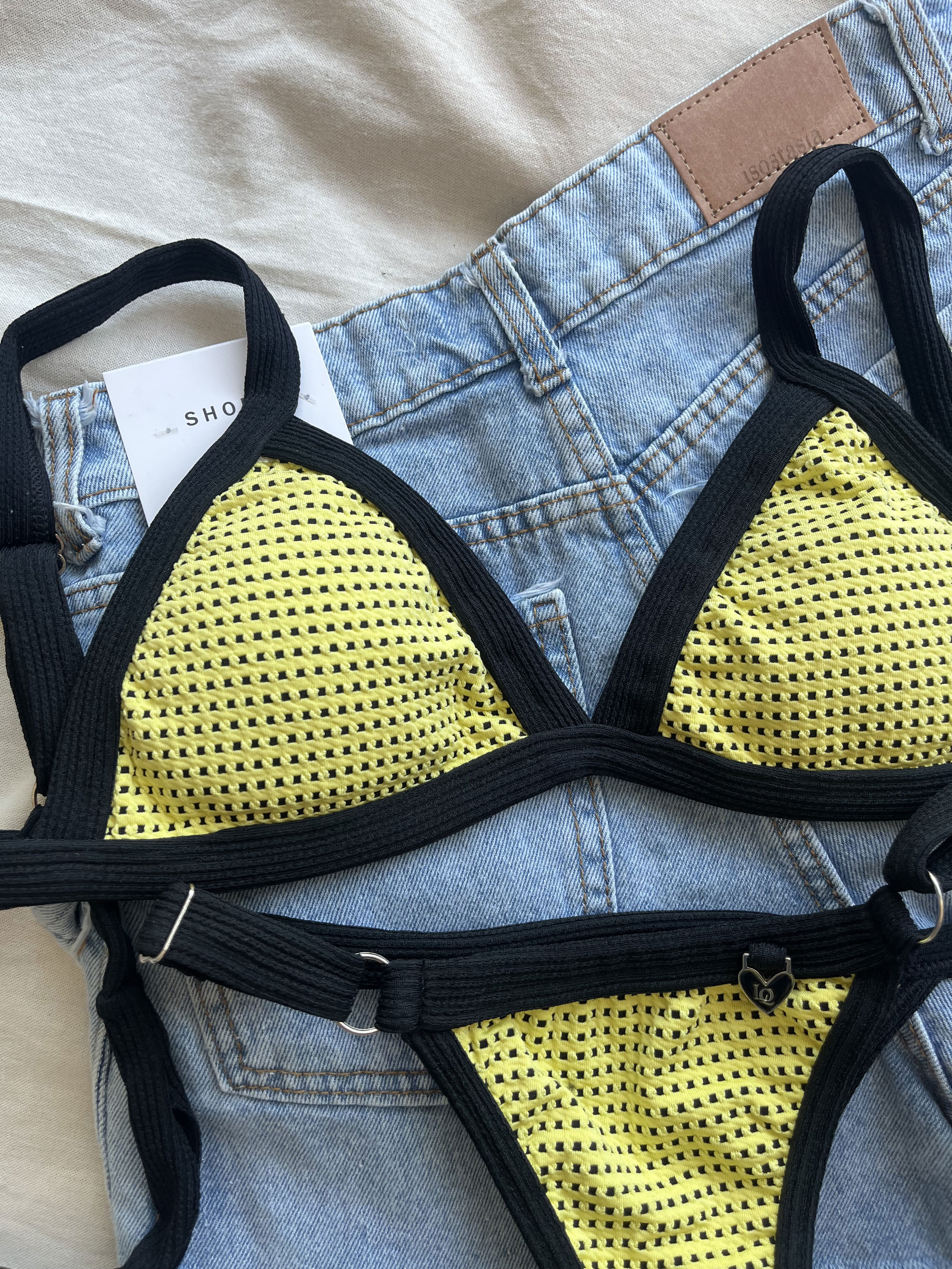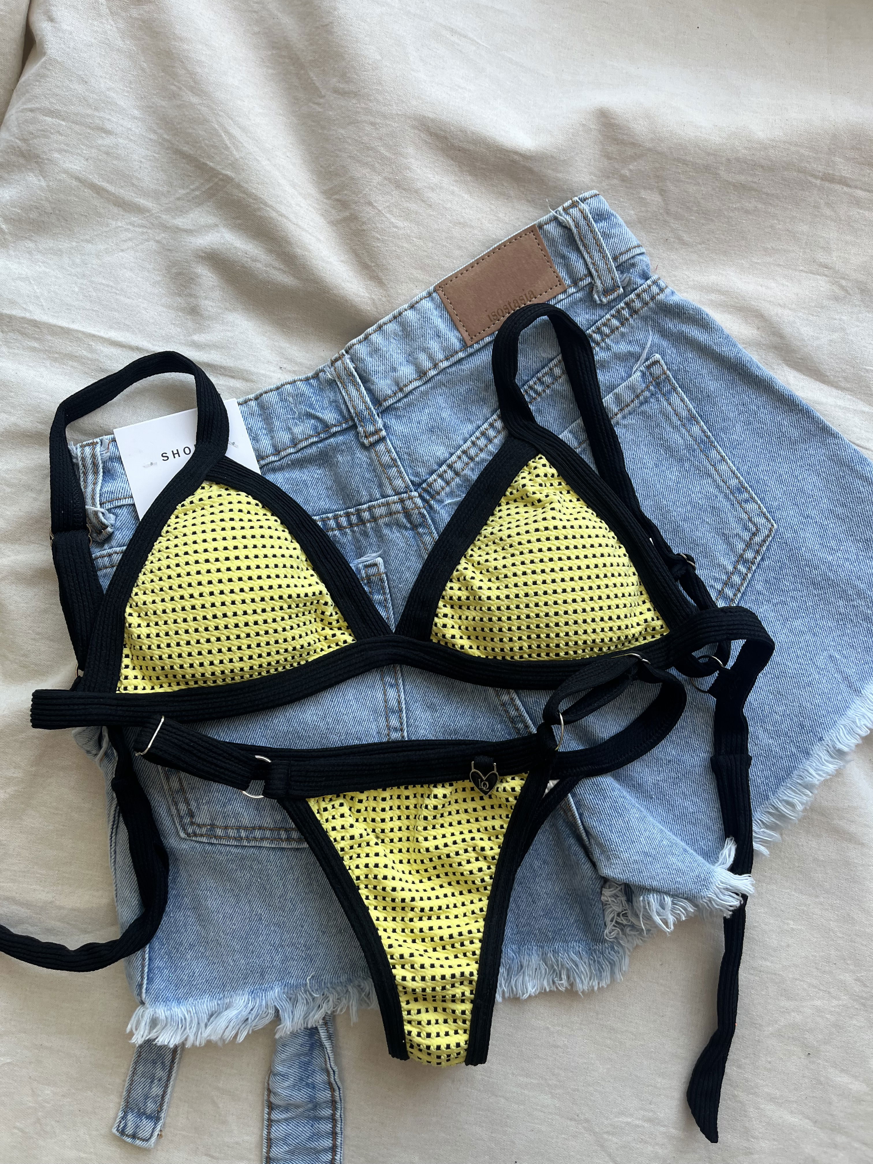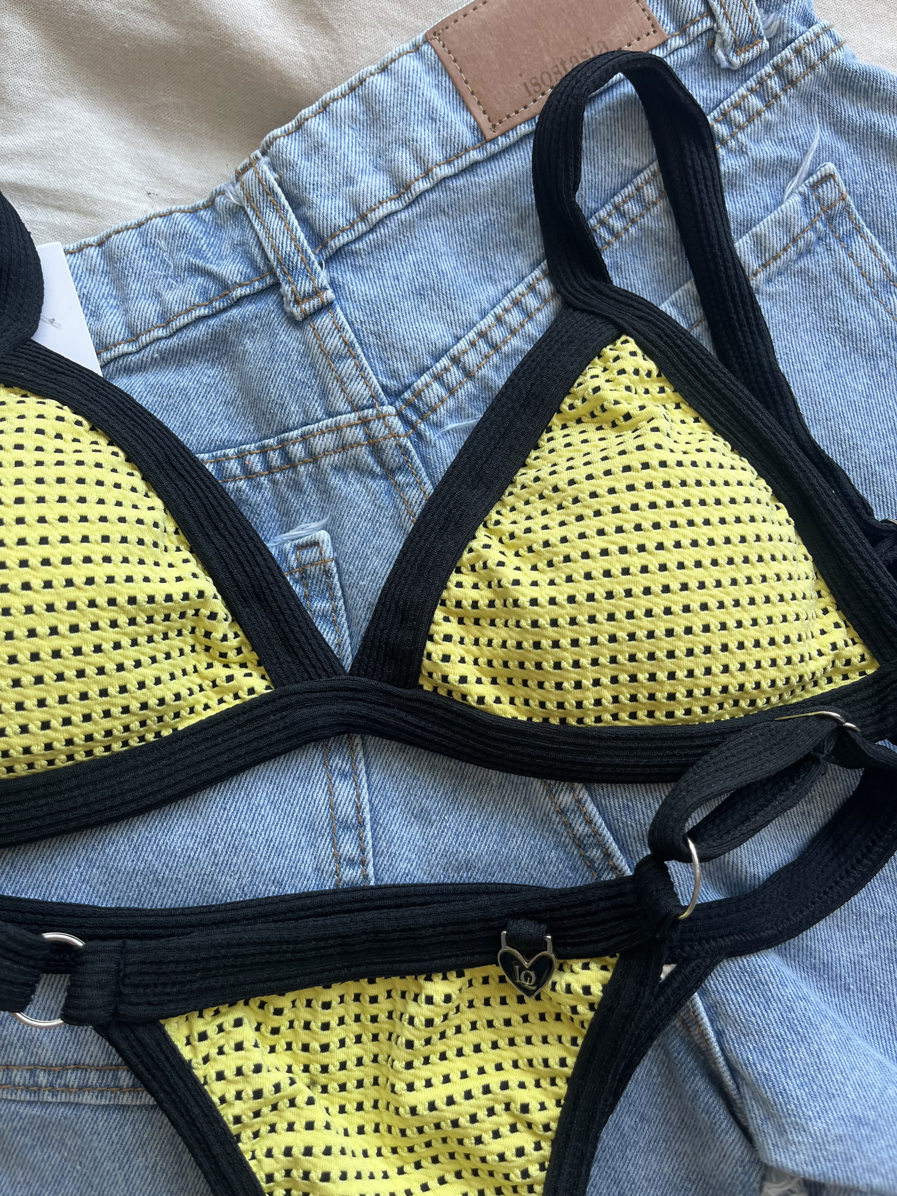 Triángulo texturado con breteles regulables y espalda para atar. Colaless regulable