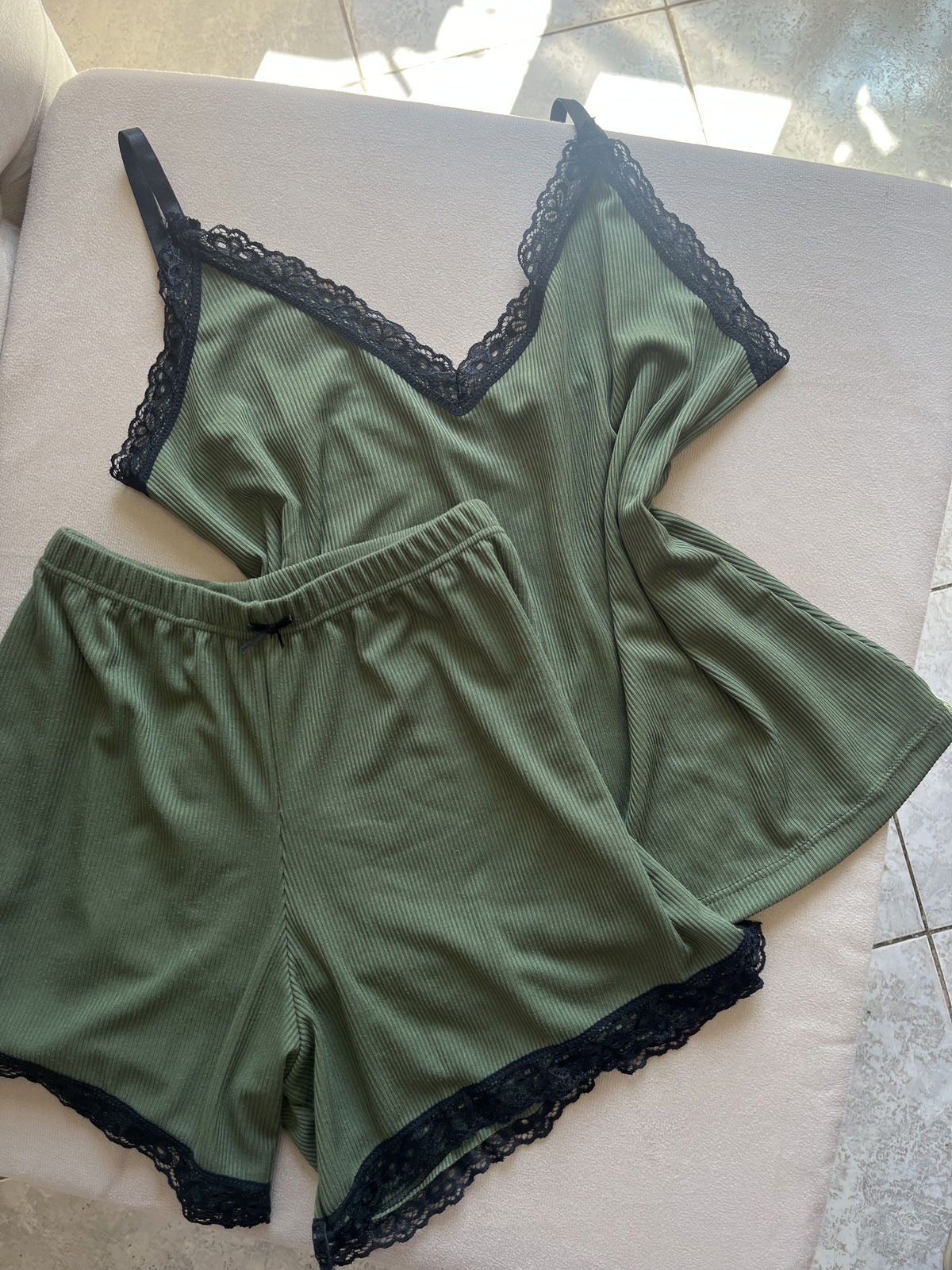 Pijama morley musculosa con breteles regulables y short , ambos con detalle de puntilla.