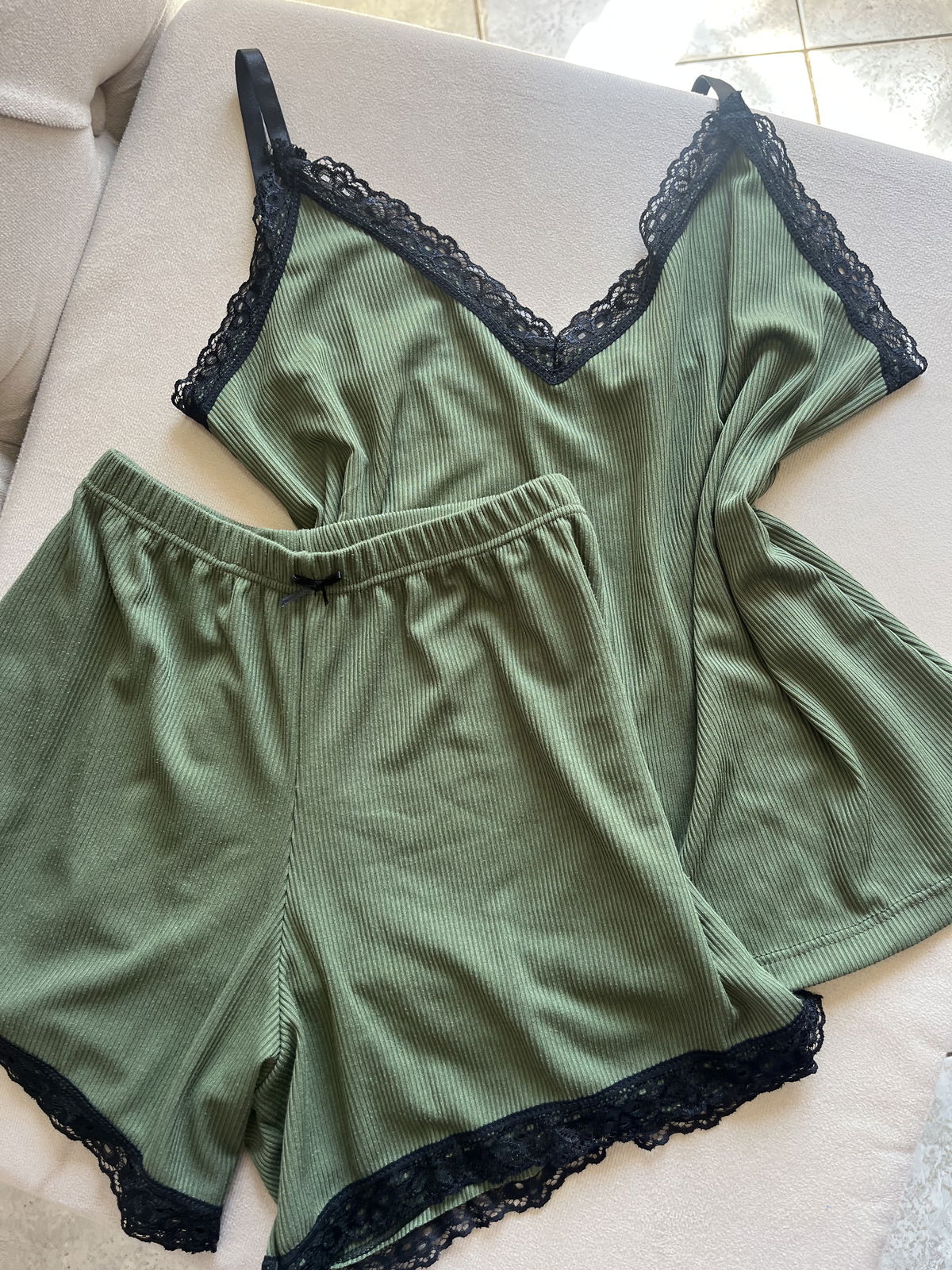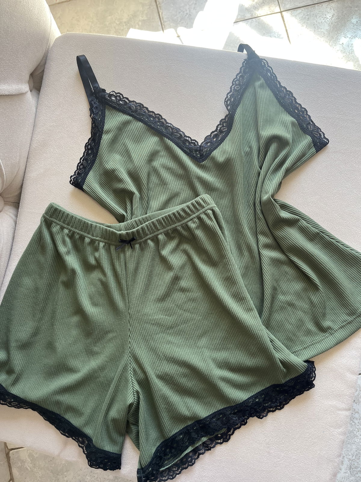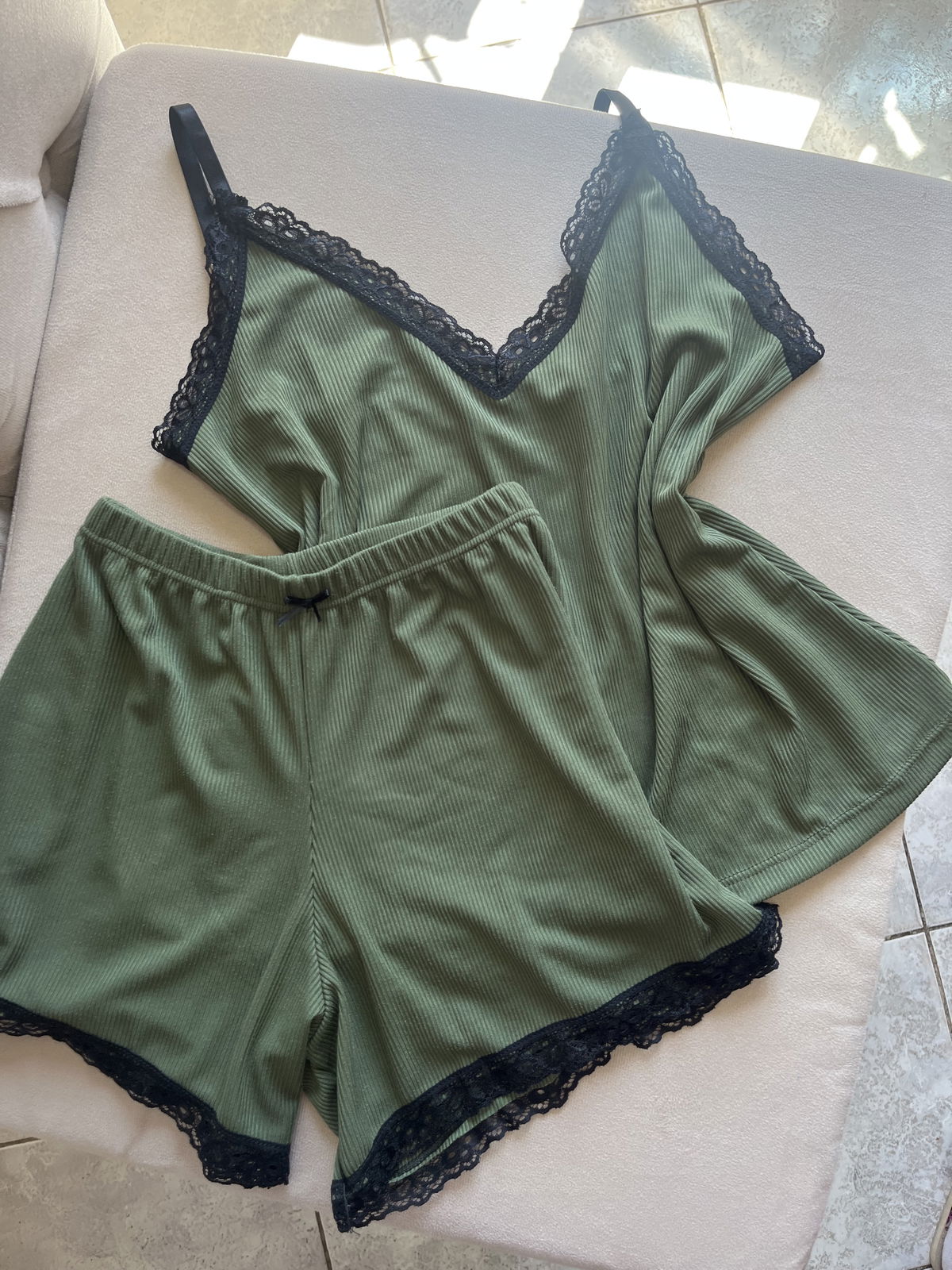 Pijama morley musculosa con breteles regulables y short , ambos con detalle de puntilla.