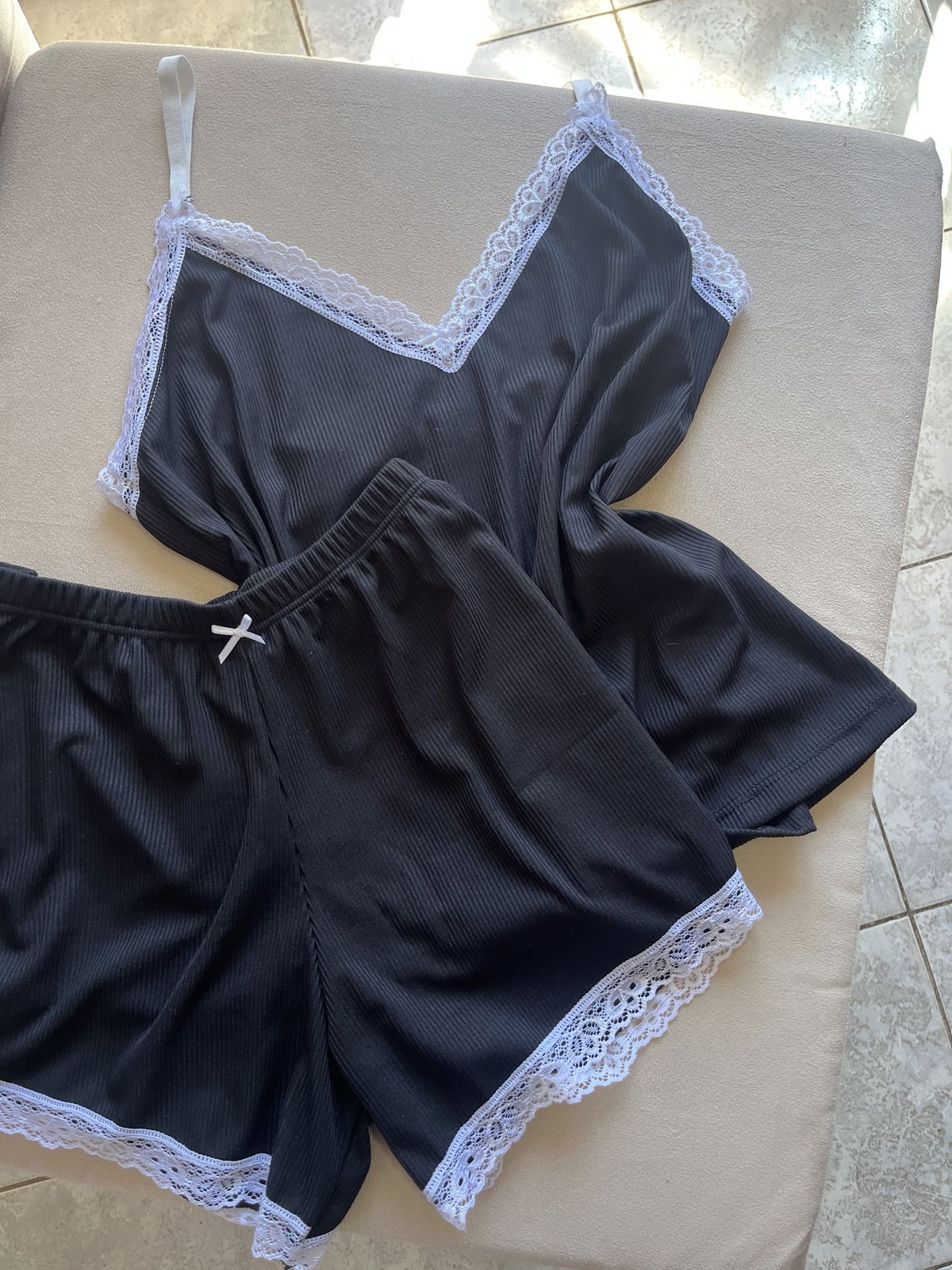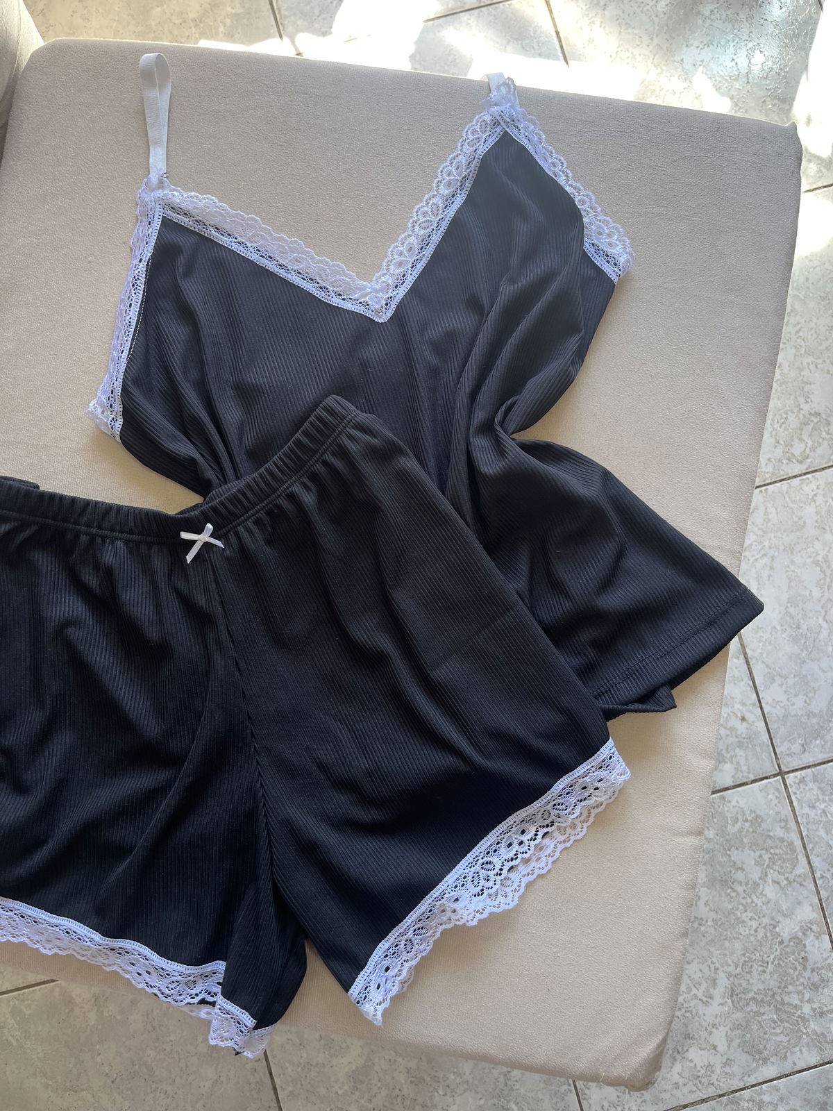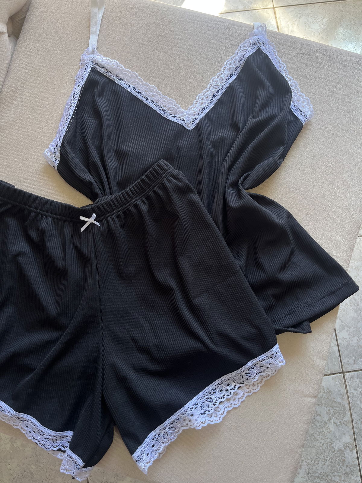 Pijama morley musculosa con breteles regulables y short , ambos con detalle de puntilla.