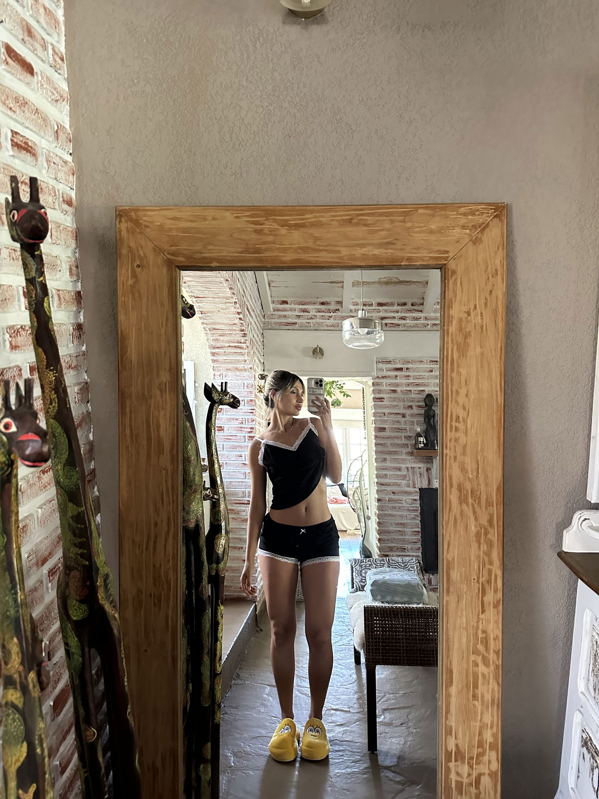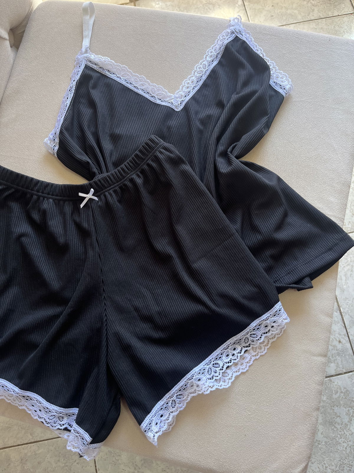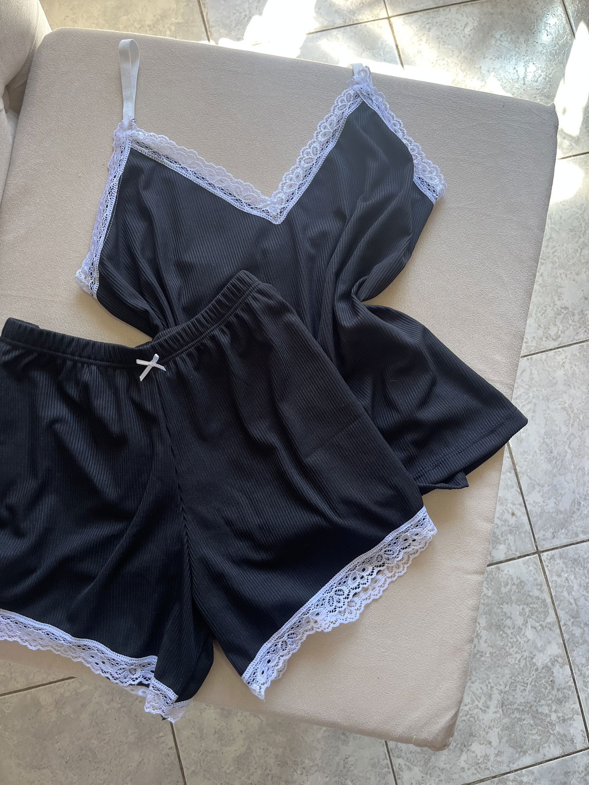 Pijama morley musculosa con breteles regulables y short , ambos con detalle de puntilla.