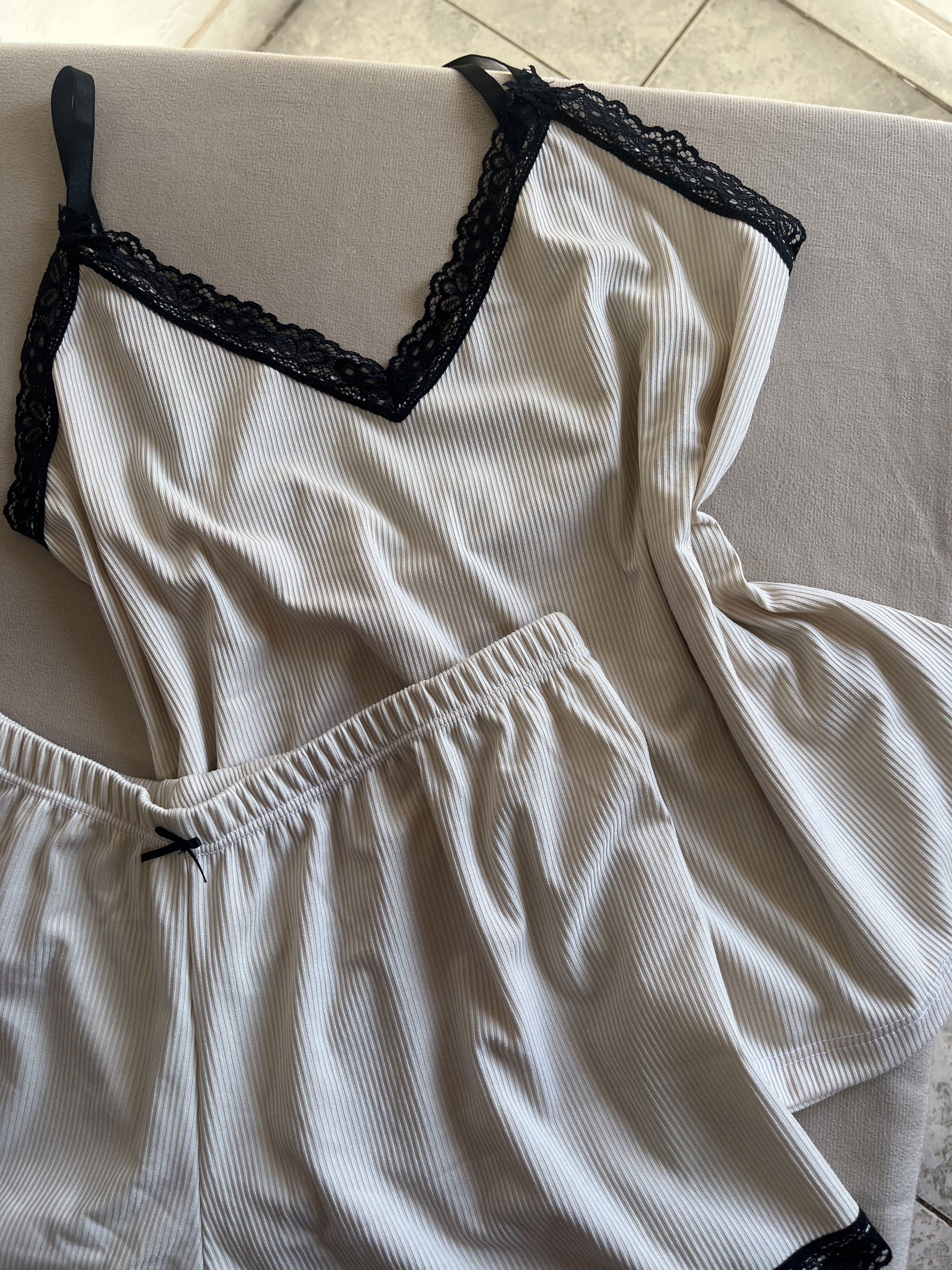 Pijama morley musculosa con breteles regulables y short , ambos con detalle de puntilla.