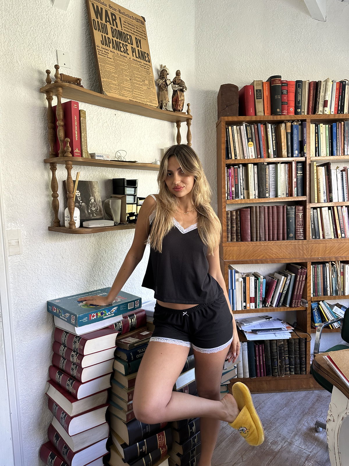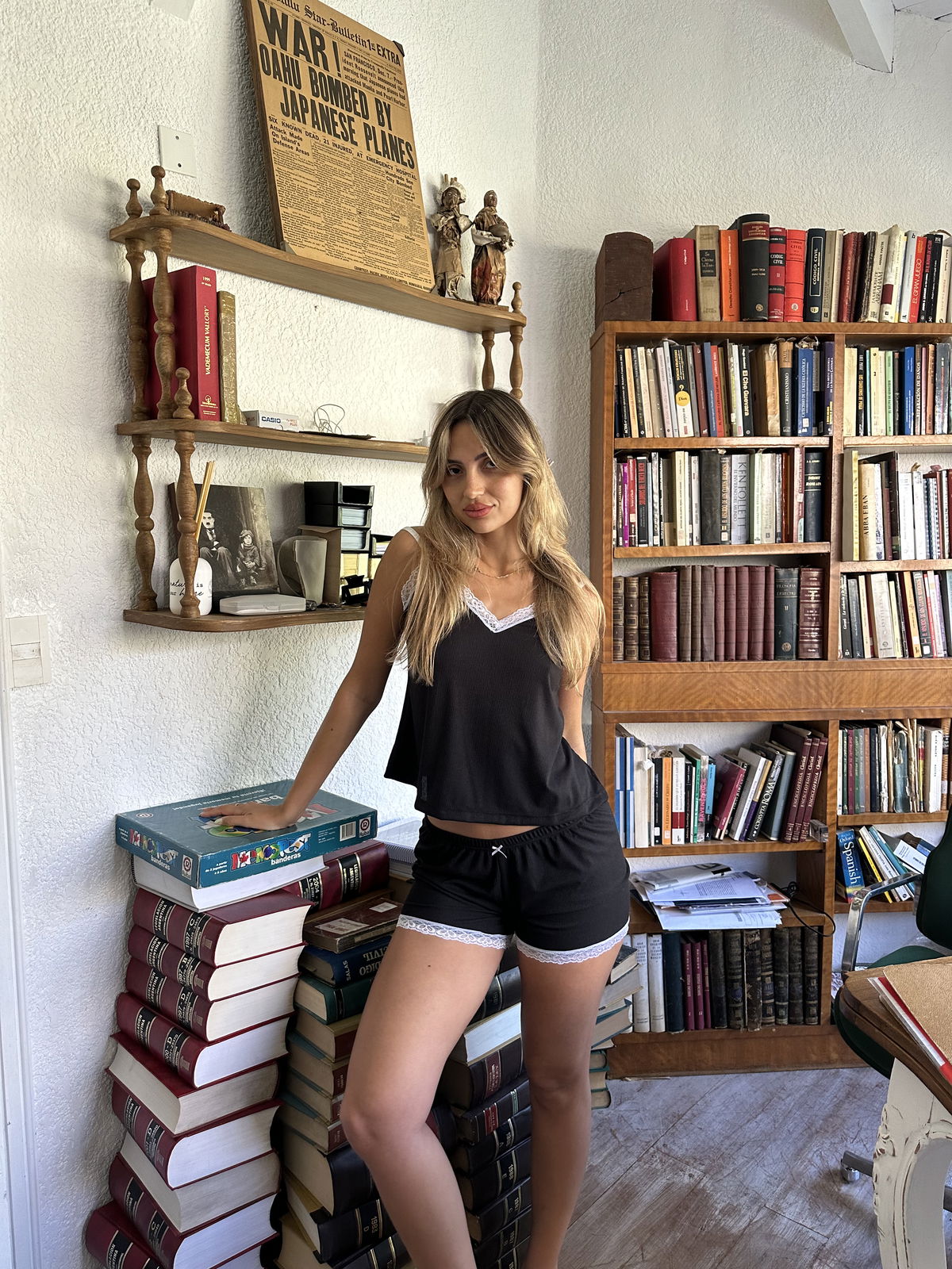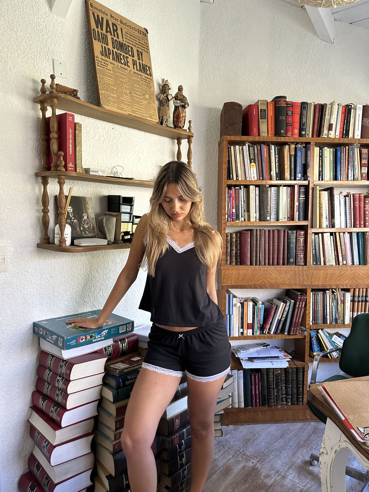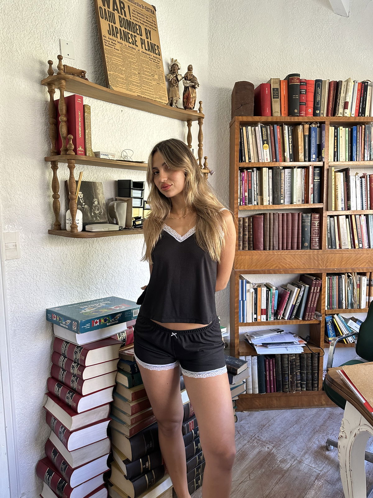 Pijama morley musculosa con breteles regulables y short , ambos con detalle de puntilla.