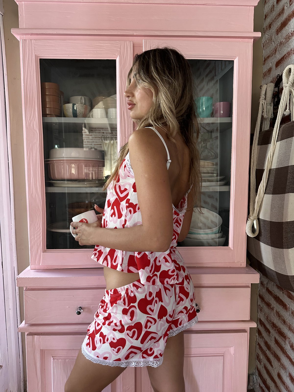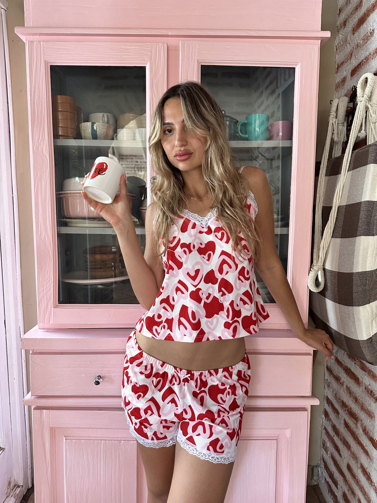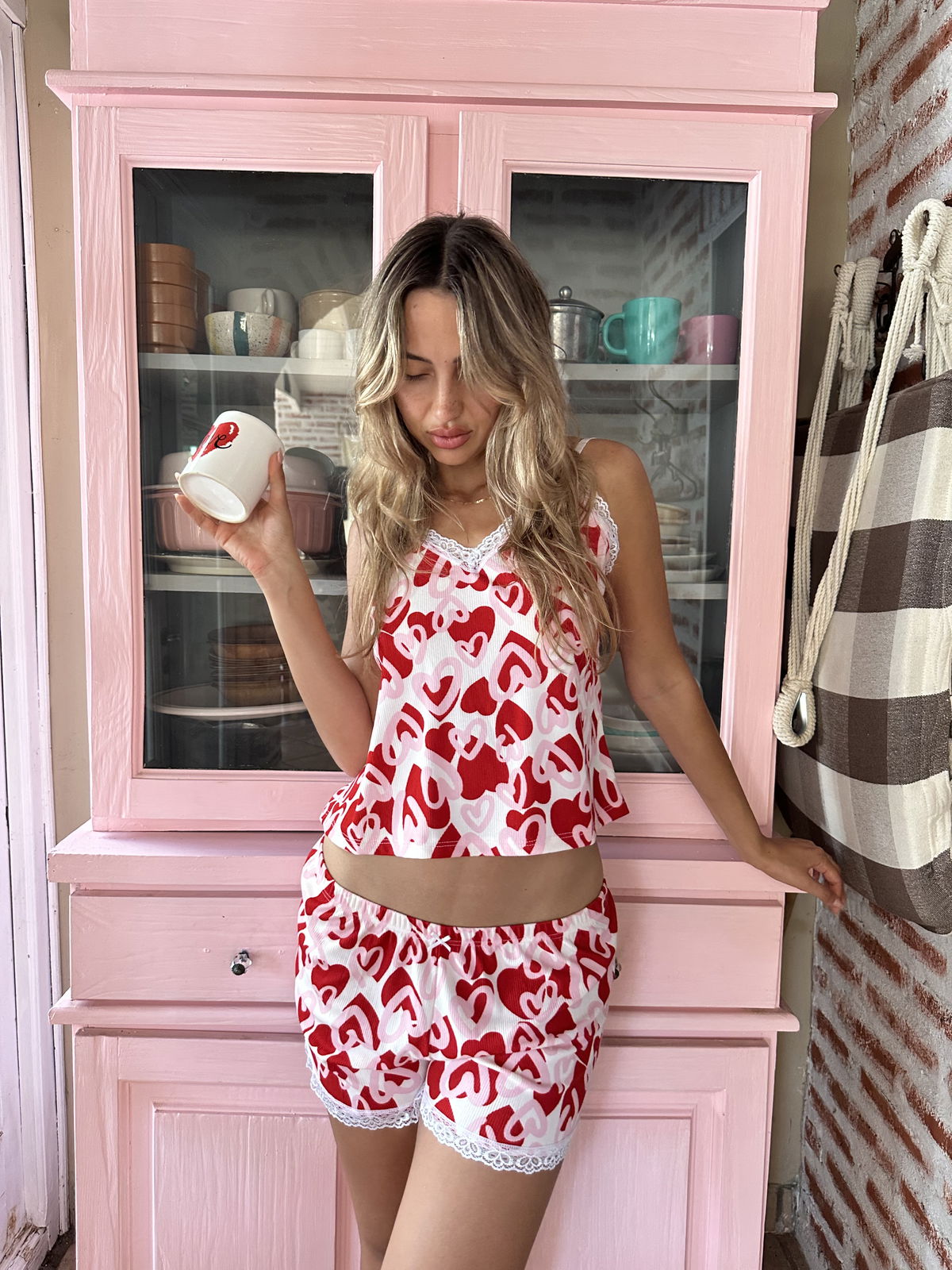Pijama morley musculosa con breteles regulables y short , ambos con detalle de puntilla.