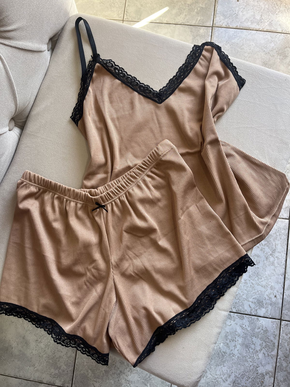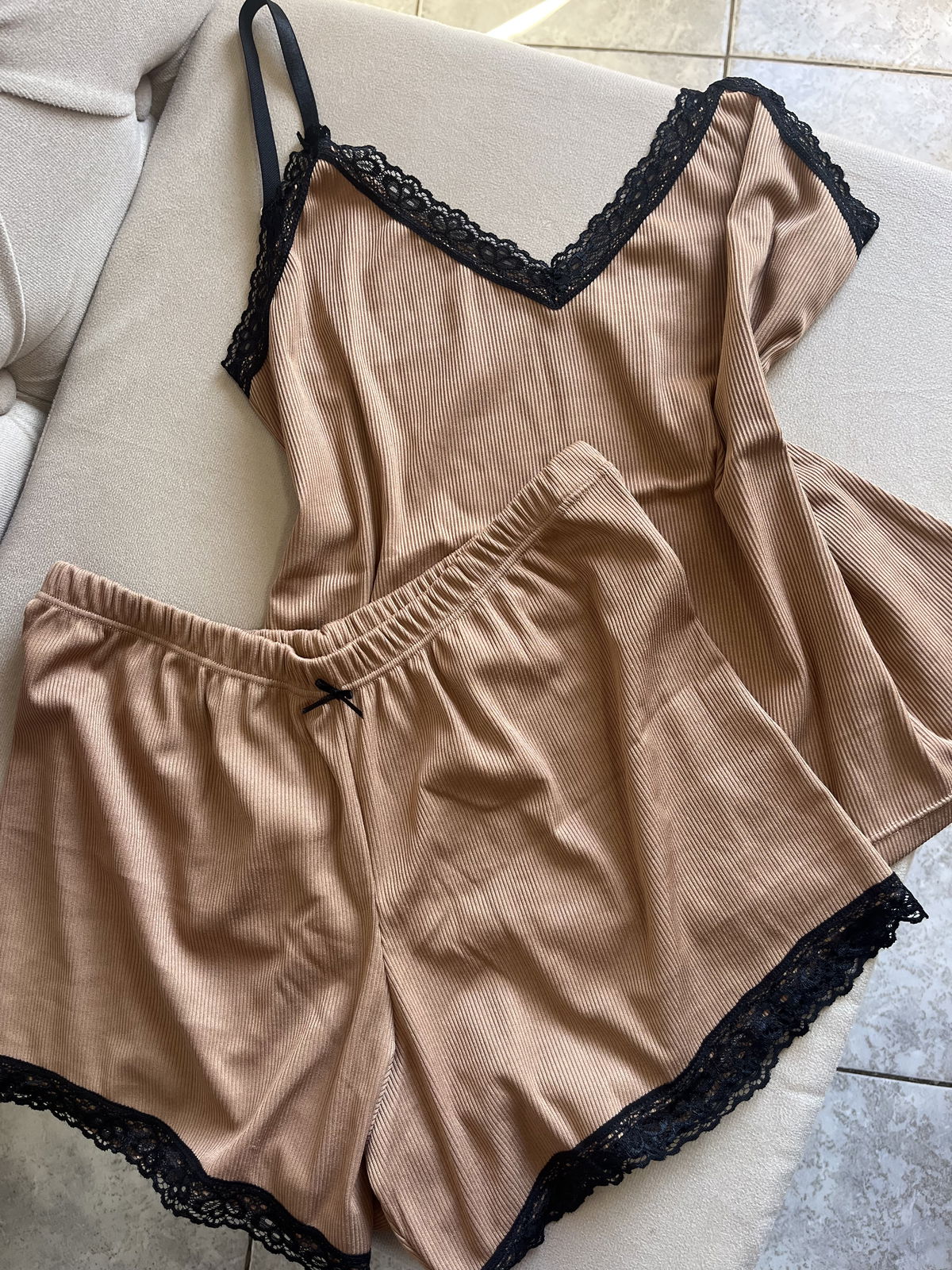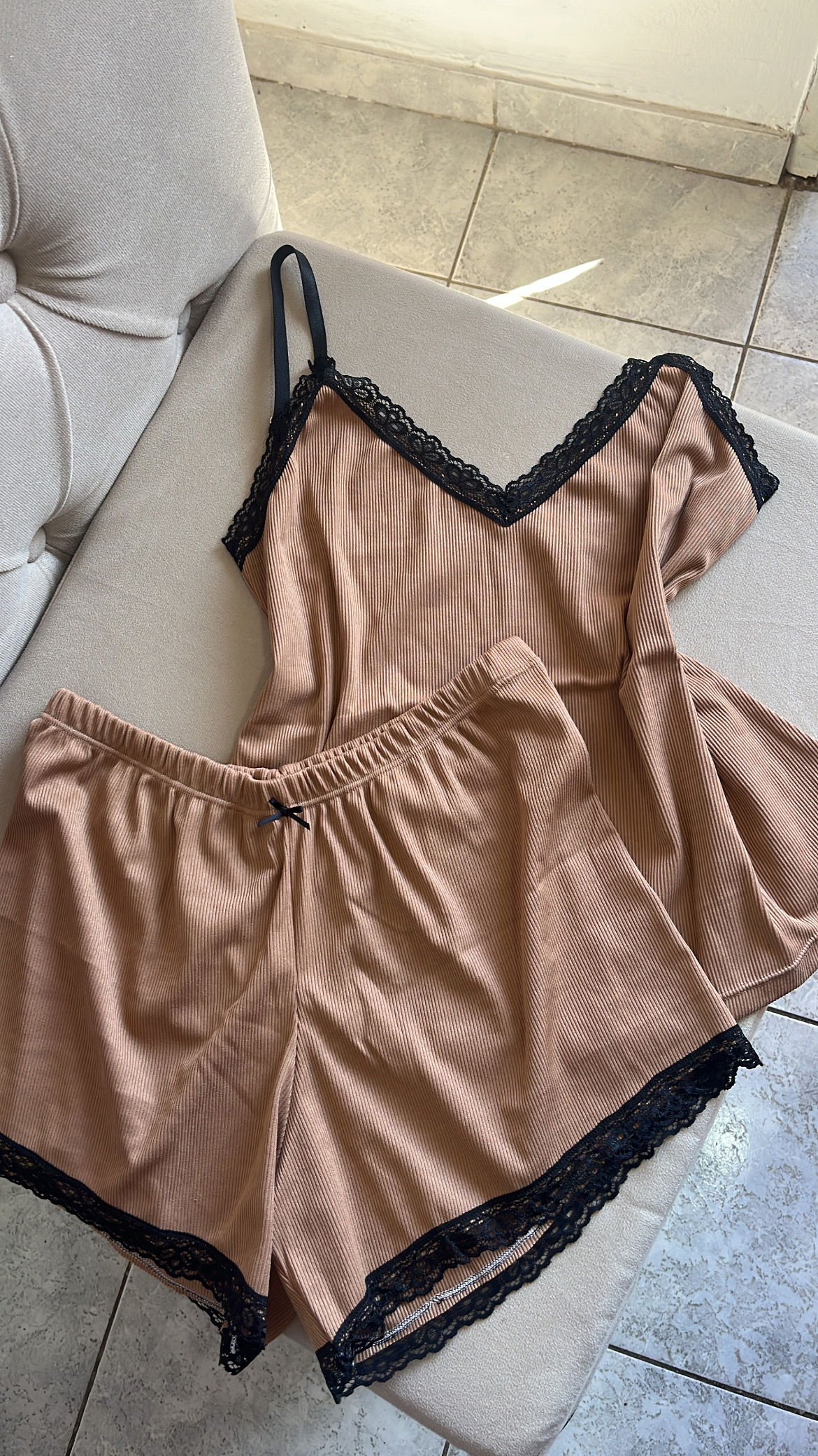 Pijama morley musculosa con breteles regulables y short , ambos con detalle de puntilla.