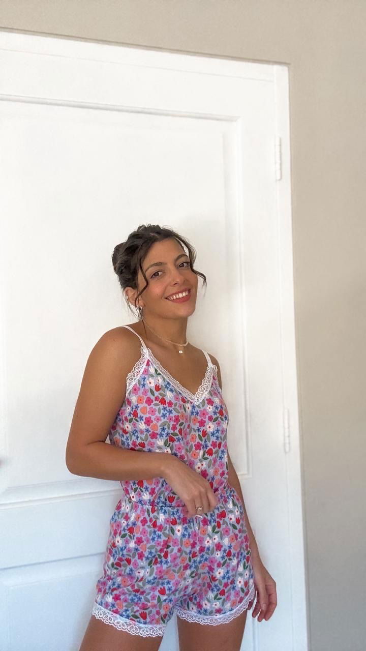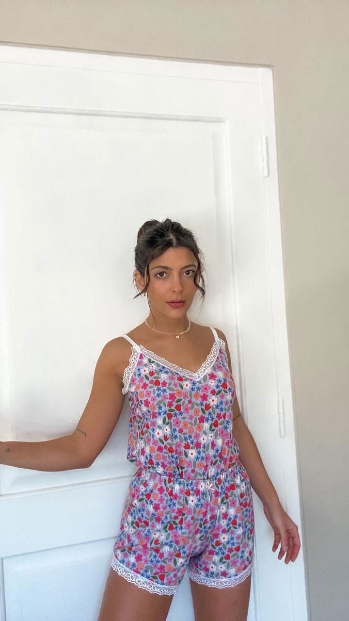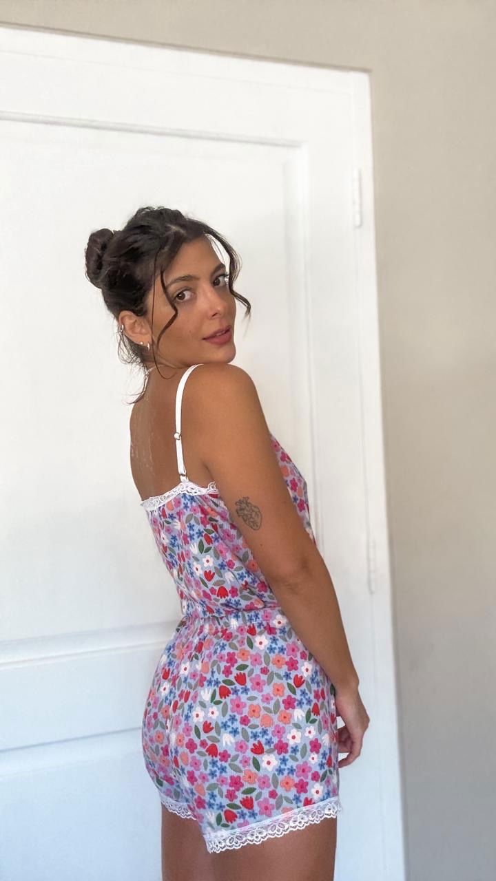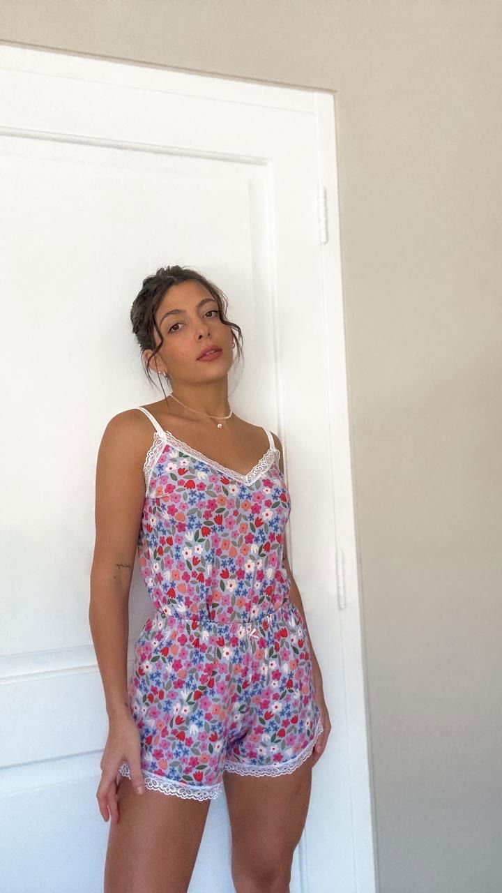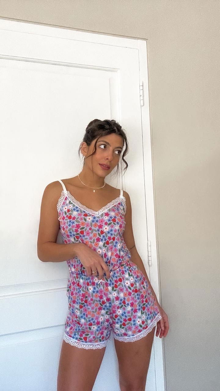 Pijama morley musculosa con breteles regulables y short , ambos con detalle de puntilla.