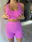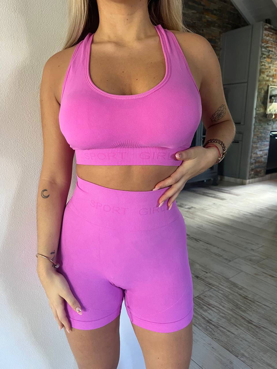 Top deportivo con tacitas desmontables. Short, con un poquito de frunce en la cola.