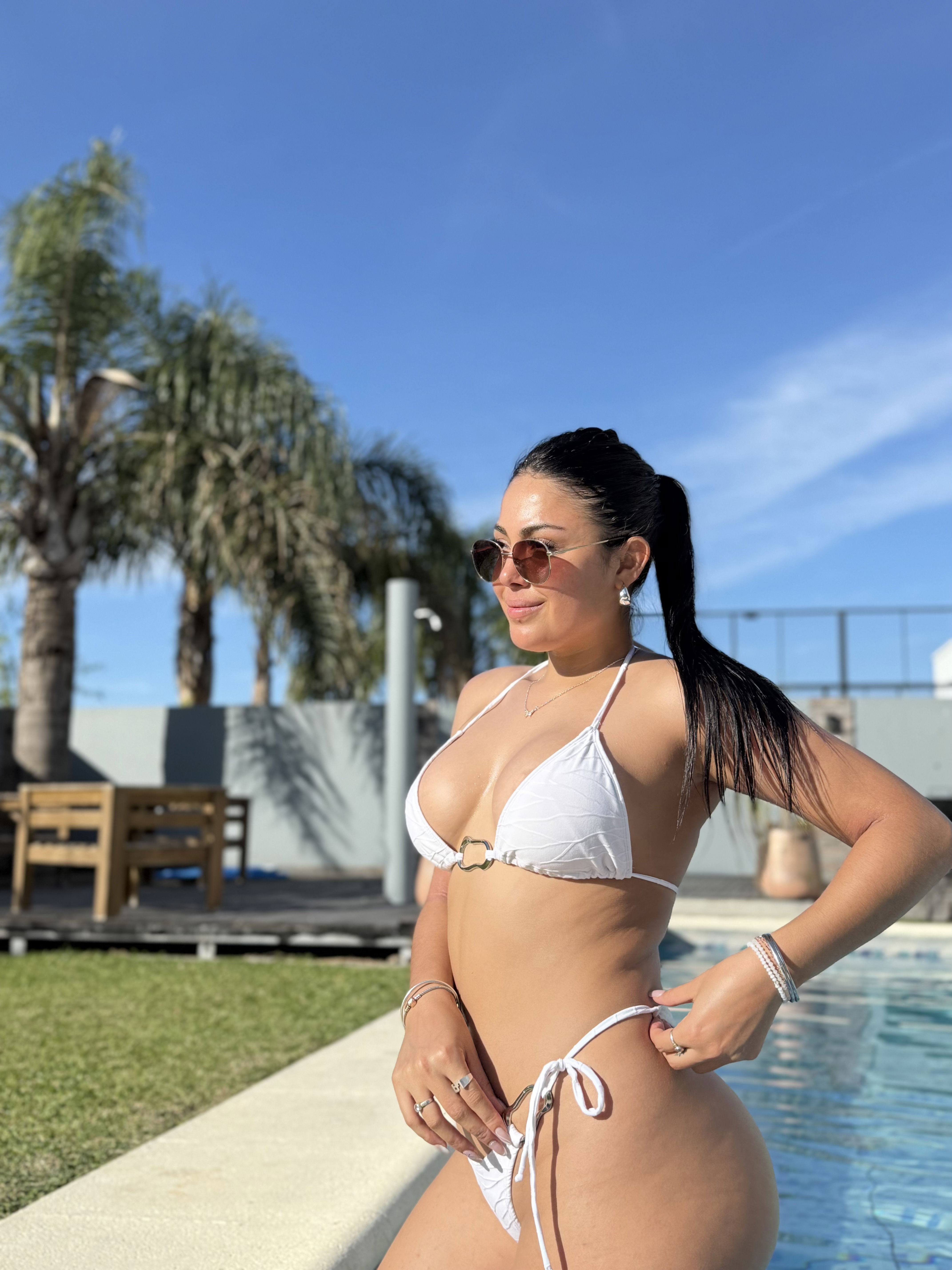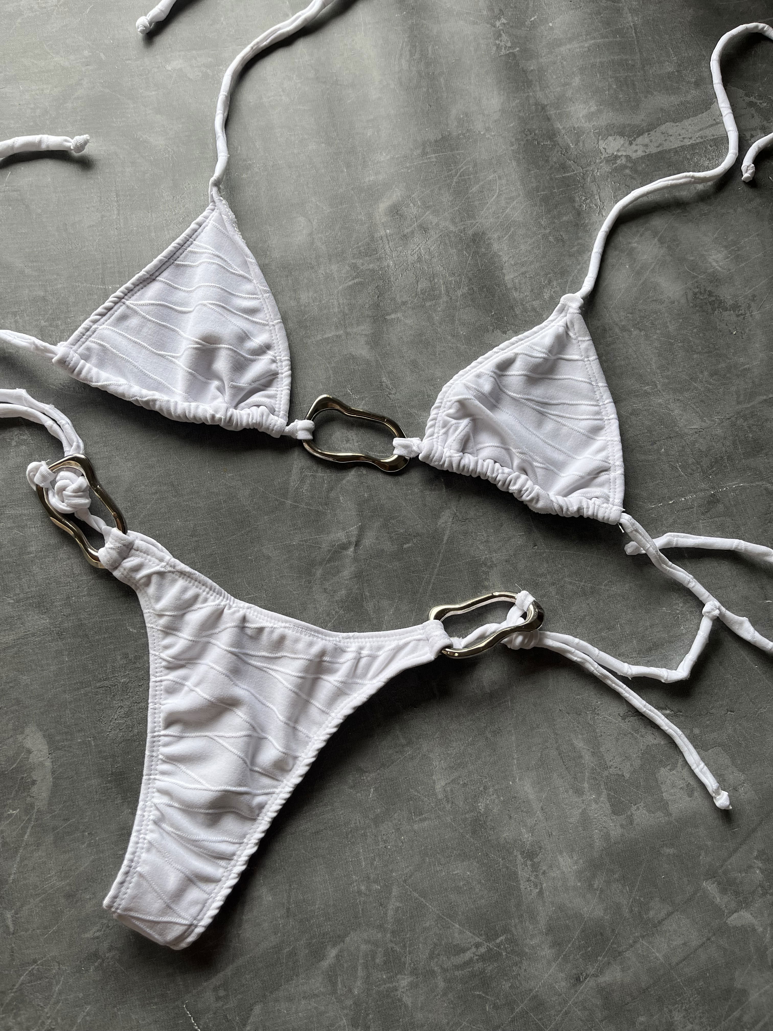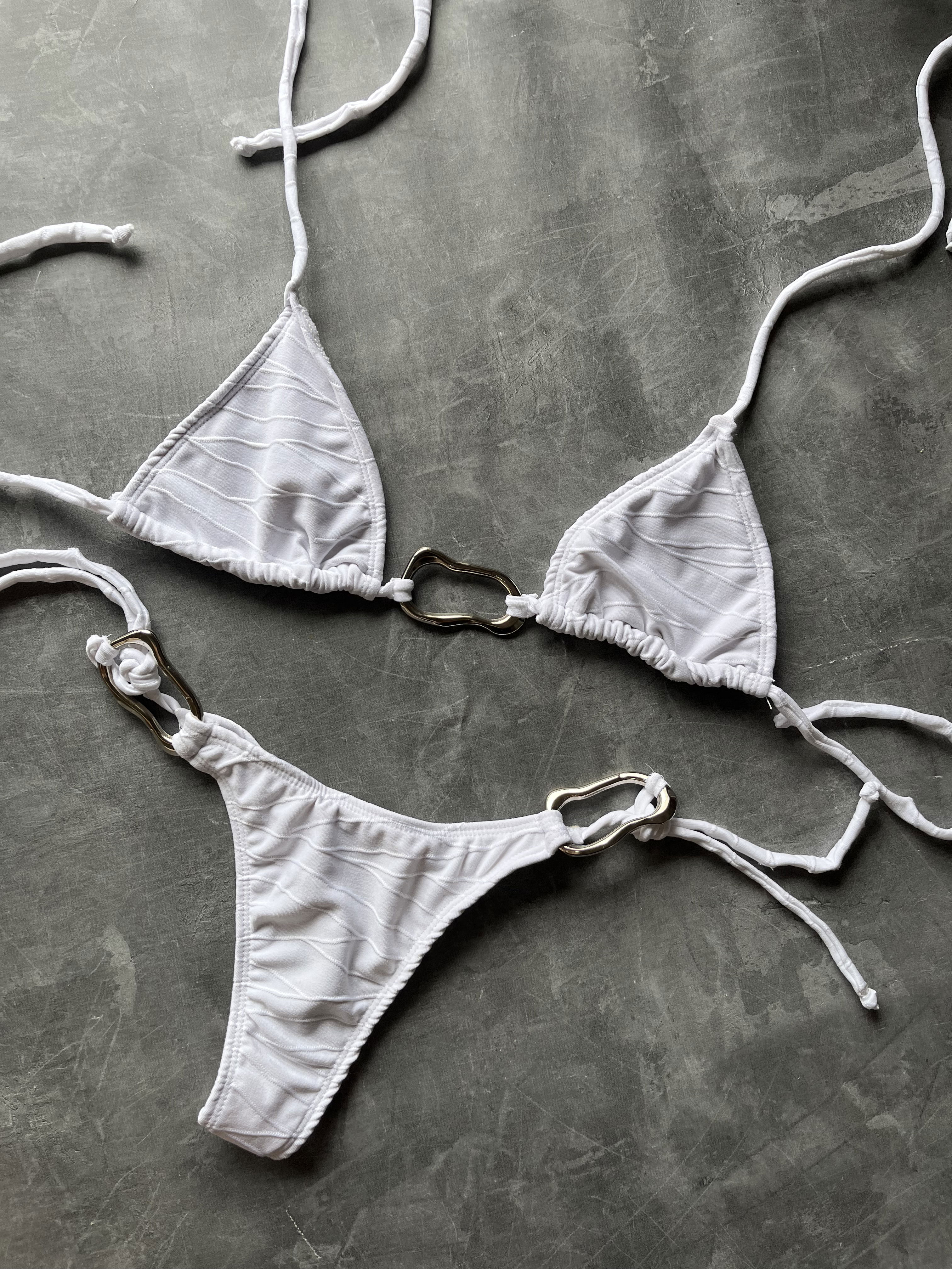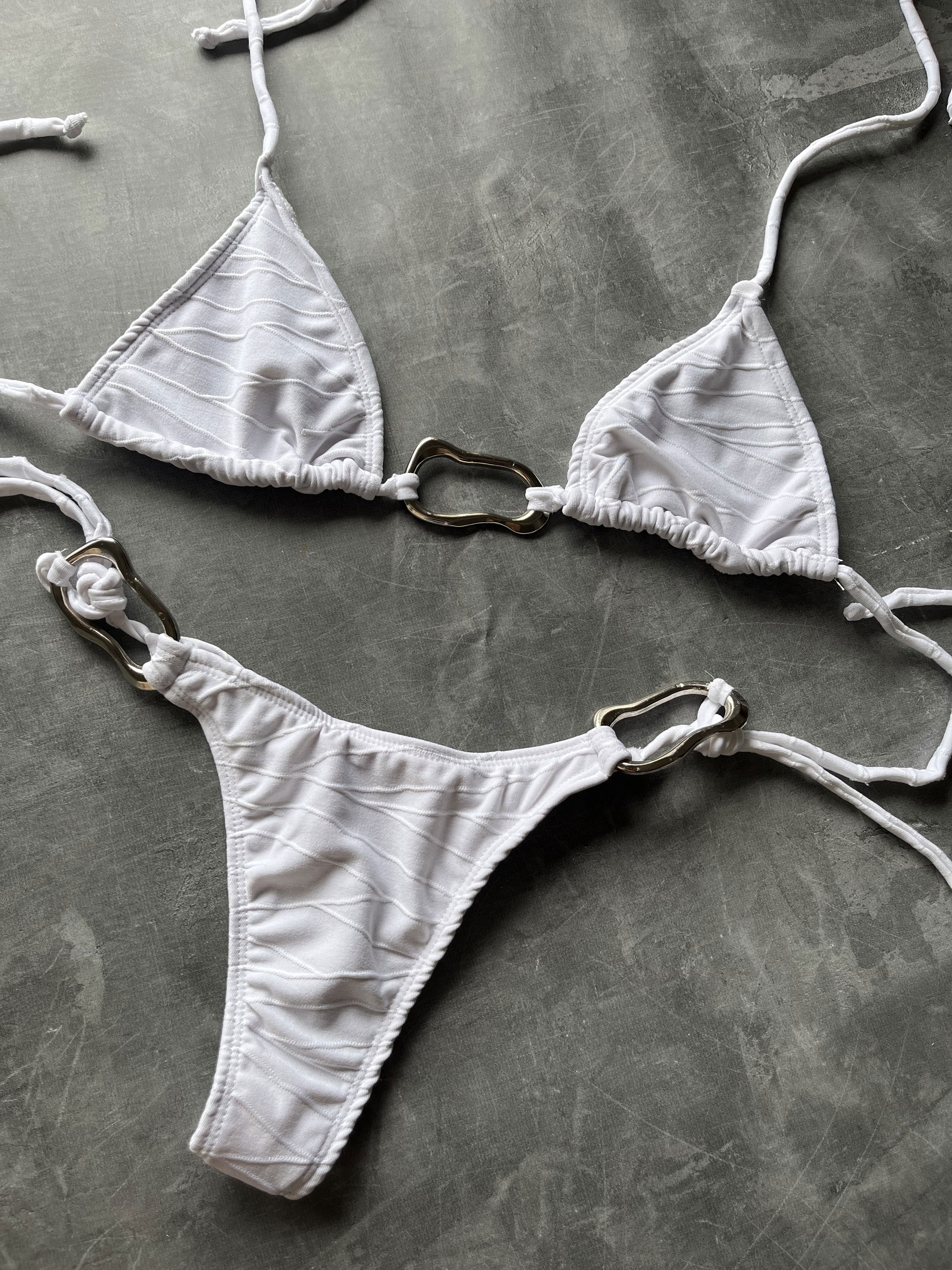 Triángulo con argolla amorfo y tiras para atar , colaless para atar con argollas. Este modelo no incluye tazas desmontables pero si tiene la abertura para agregarle . Tela texturada vivorita