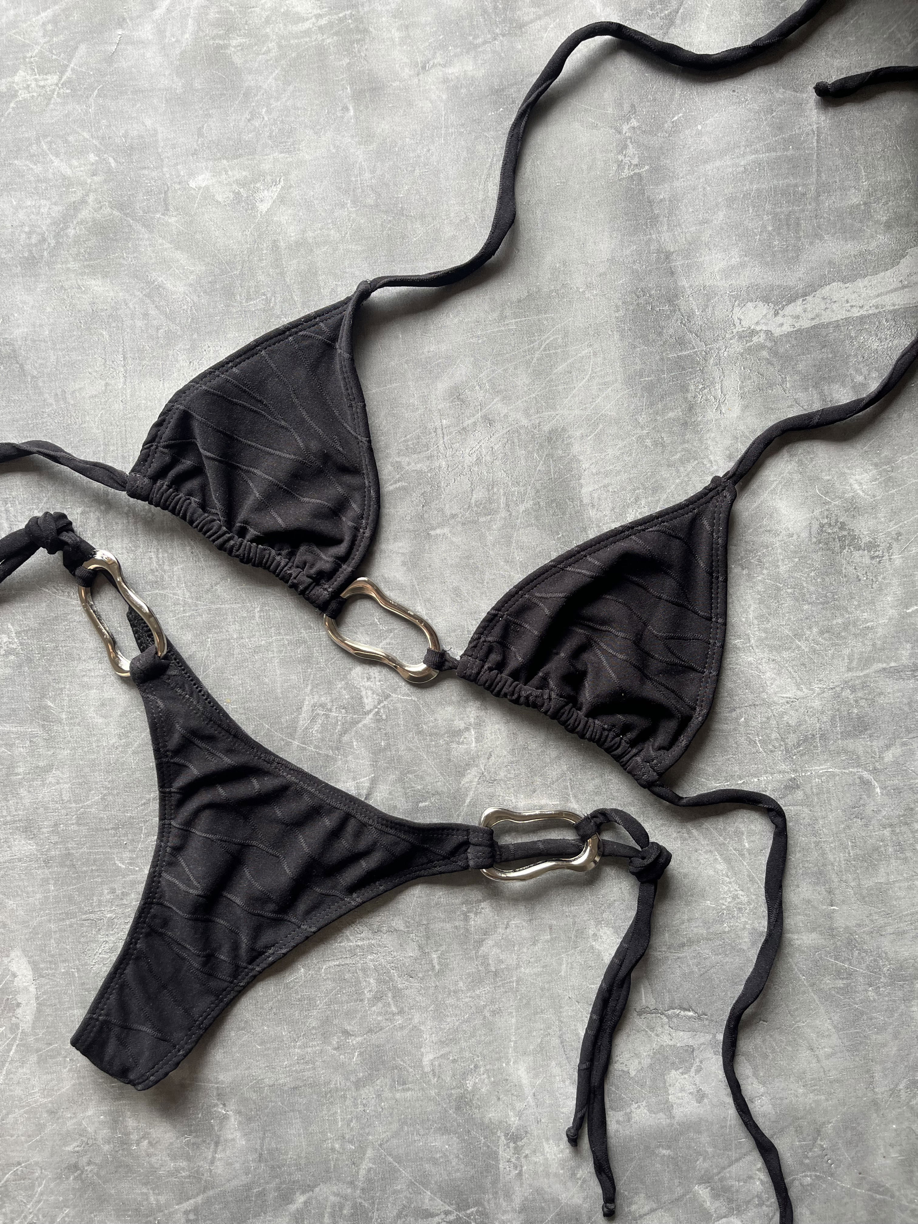 Triángulo con argolla amorfo y tiras para atar , colaless para atar con argollas. Este modelo no incluye tazas desmontables pero si tiene la abertura para agregarle . Tela texturada vivorita
