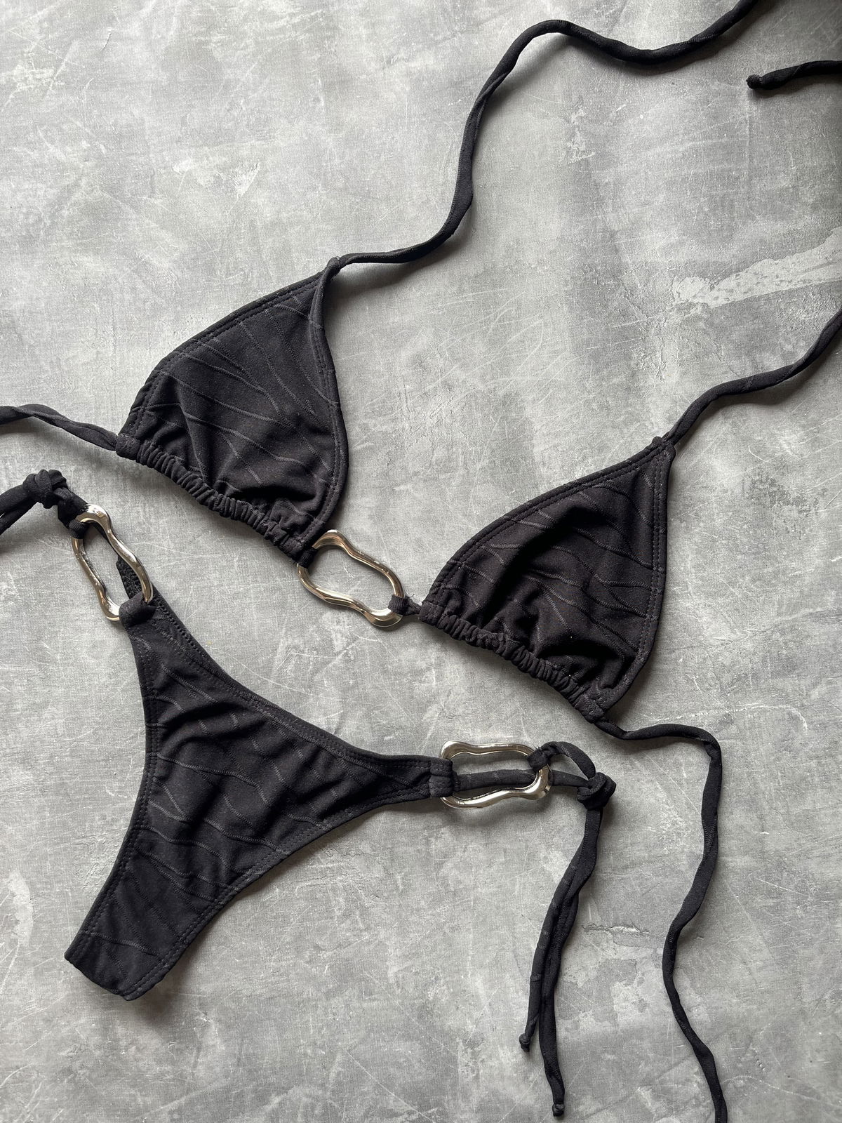 Triángulo con argolla amorfo y tiras para atar , colaless para atar con argollas. Este modelo no incluye tazas desmontables pero si tiene la abertura para agregarle .