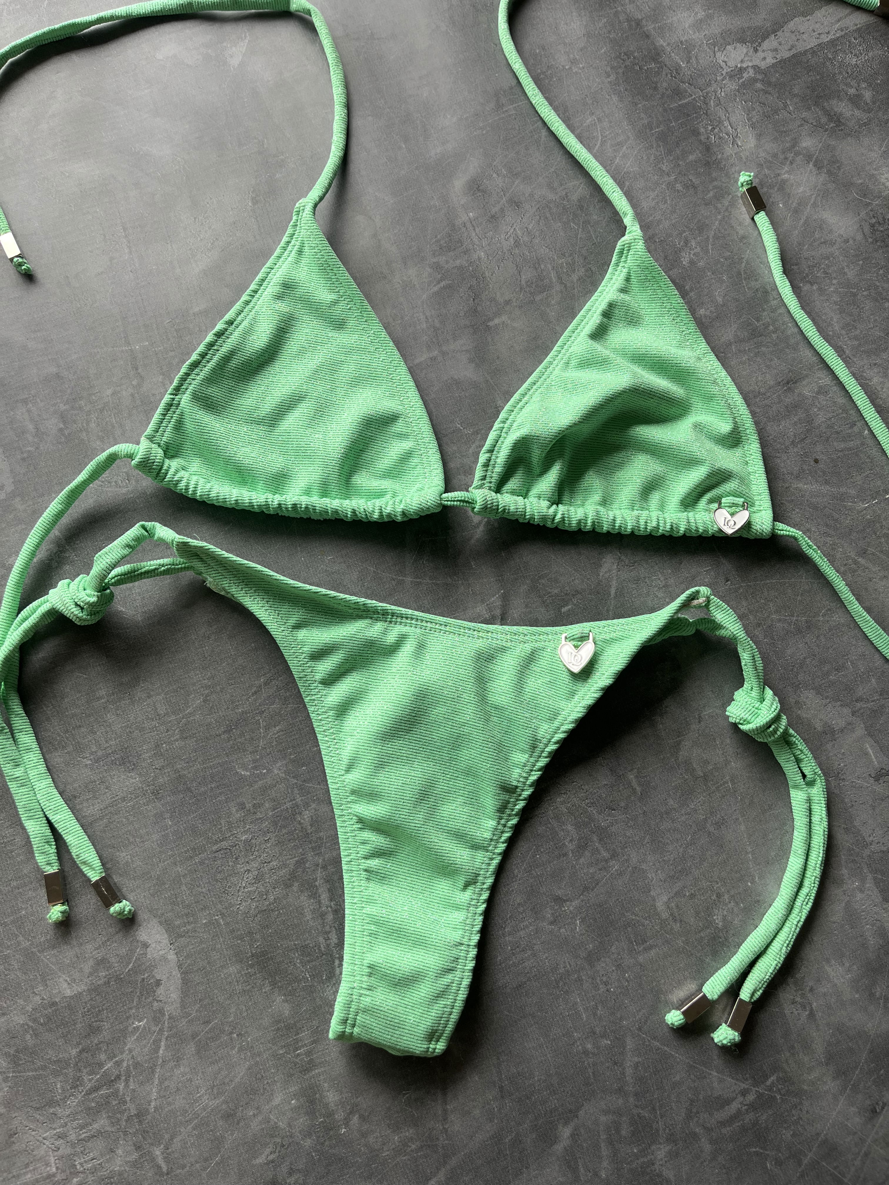 Triángulo de glitter y tiras para atar , colaless para atar . Terminales metálicas en todas sus tiras y chapita en corpiño y bombo.