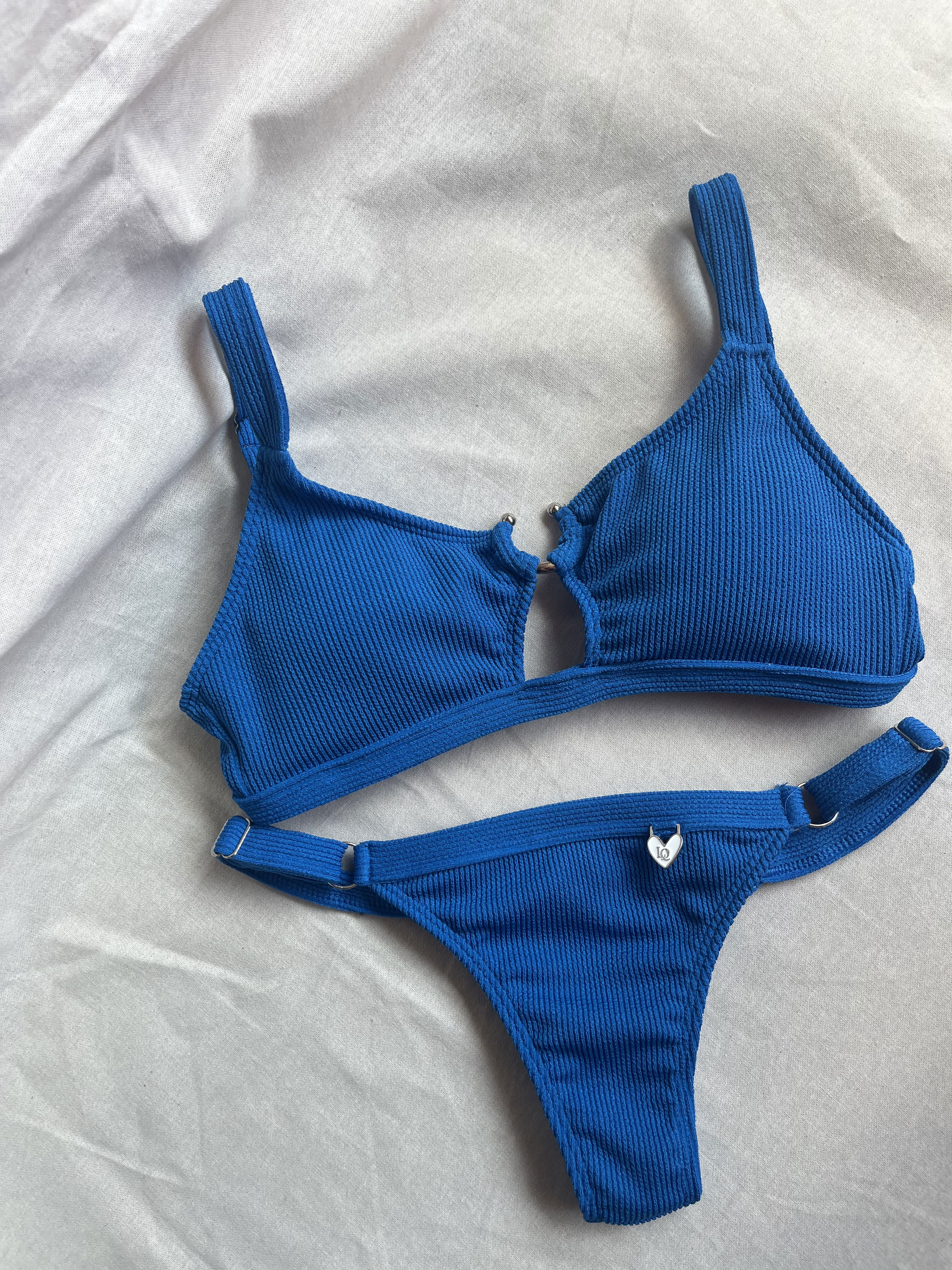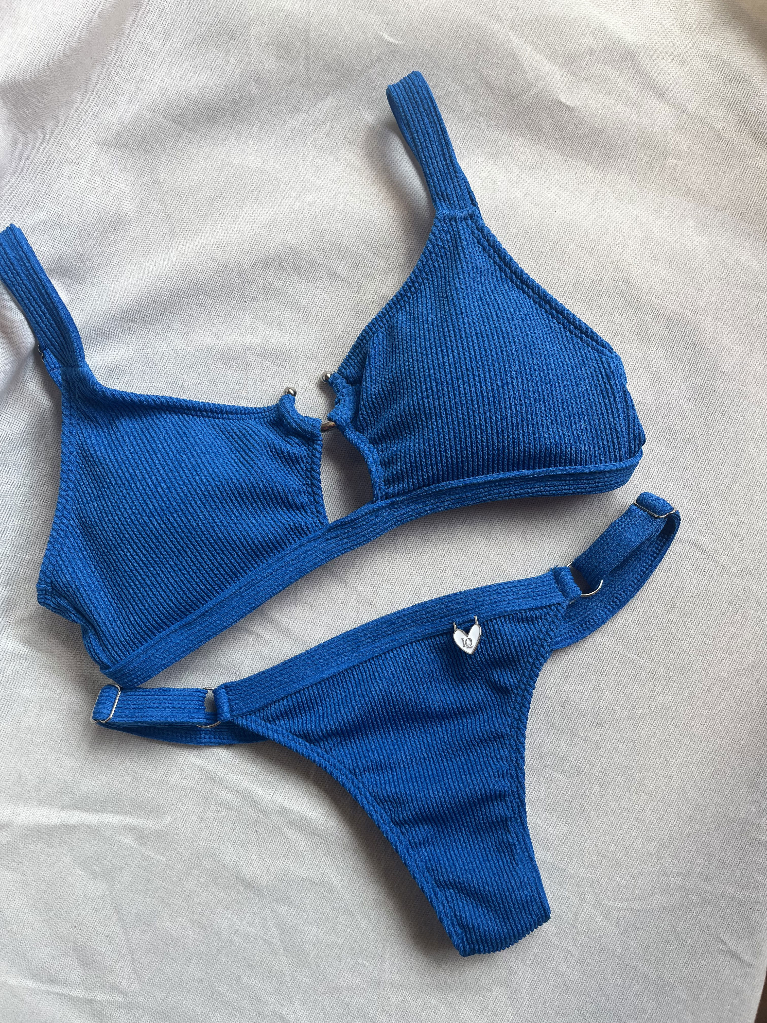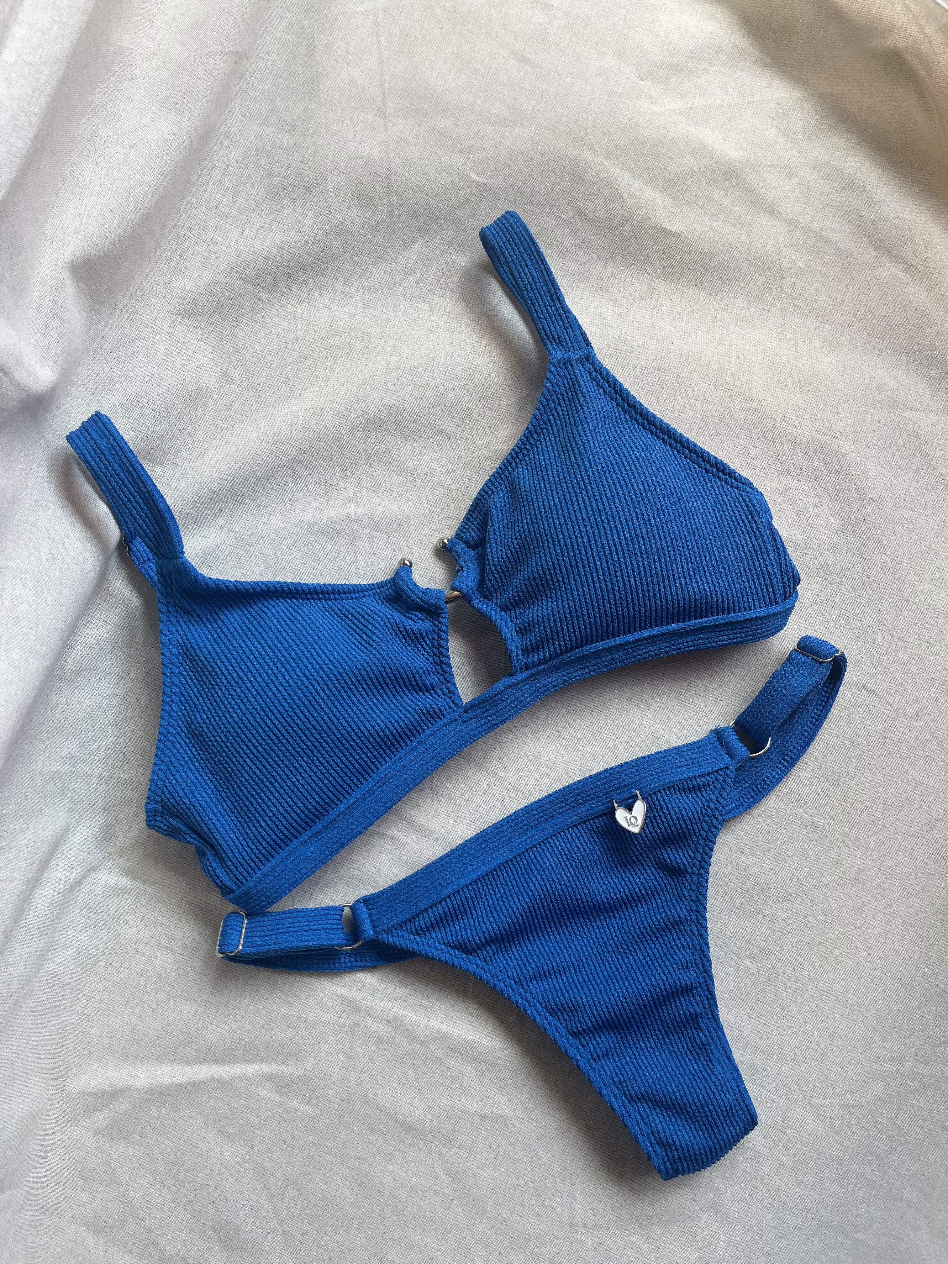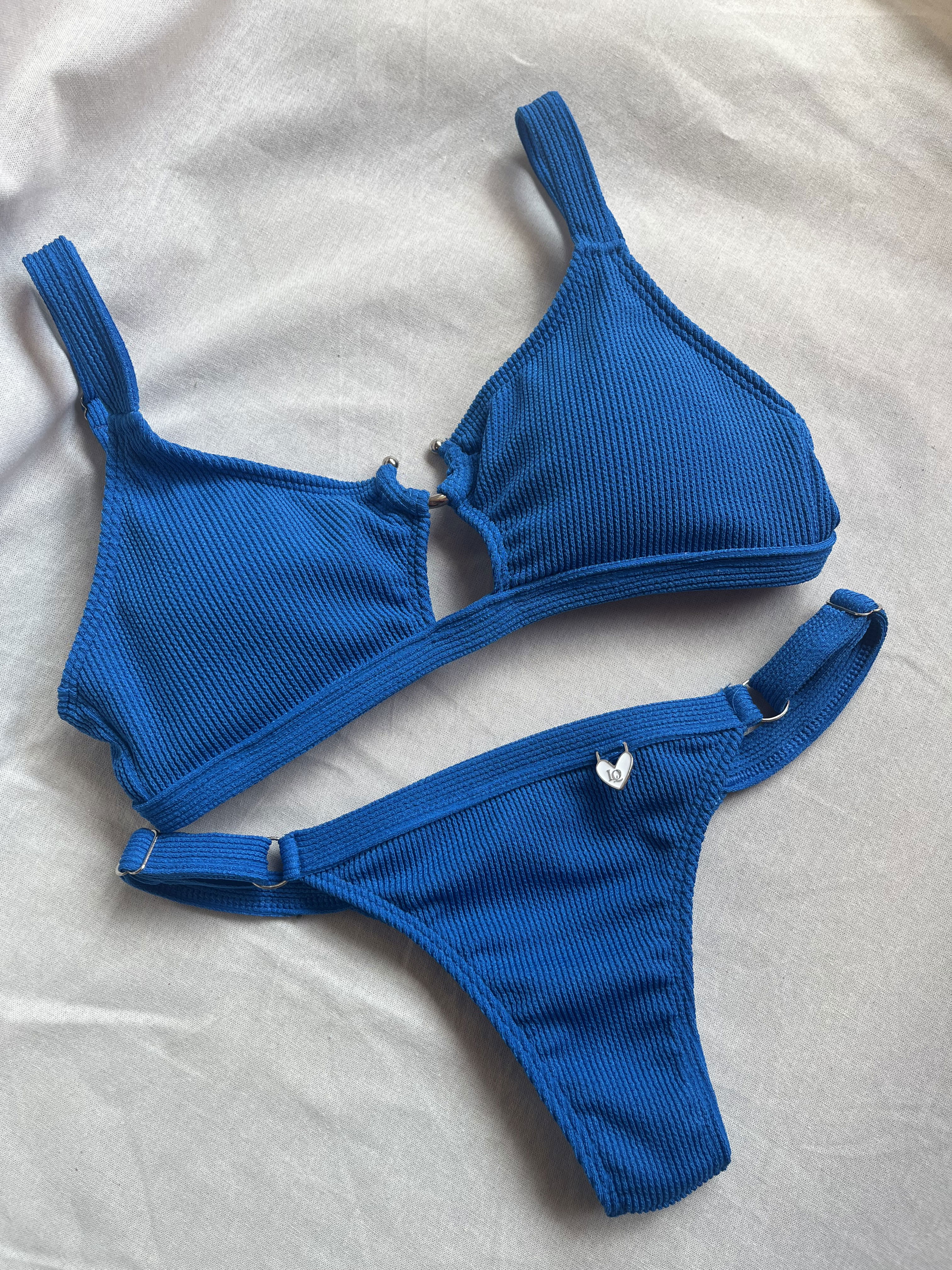 Top texturado con herraje, breteles regulables y espalda para atar. Colaless regulable