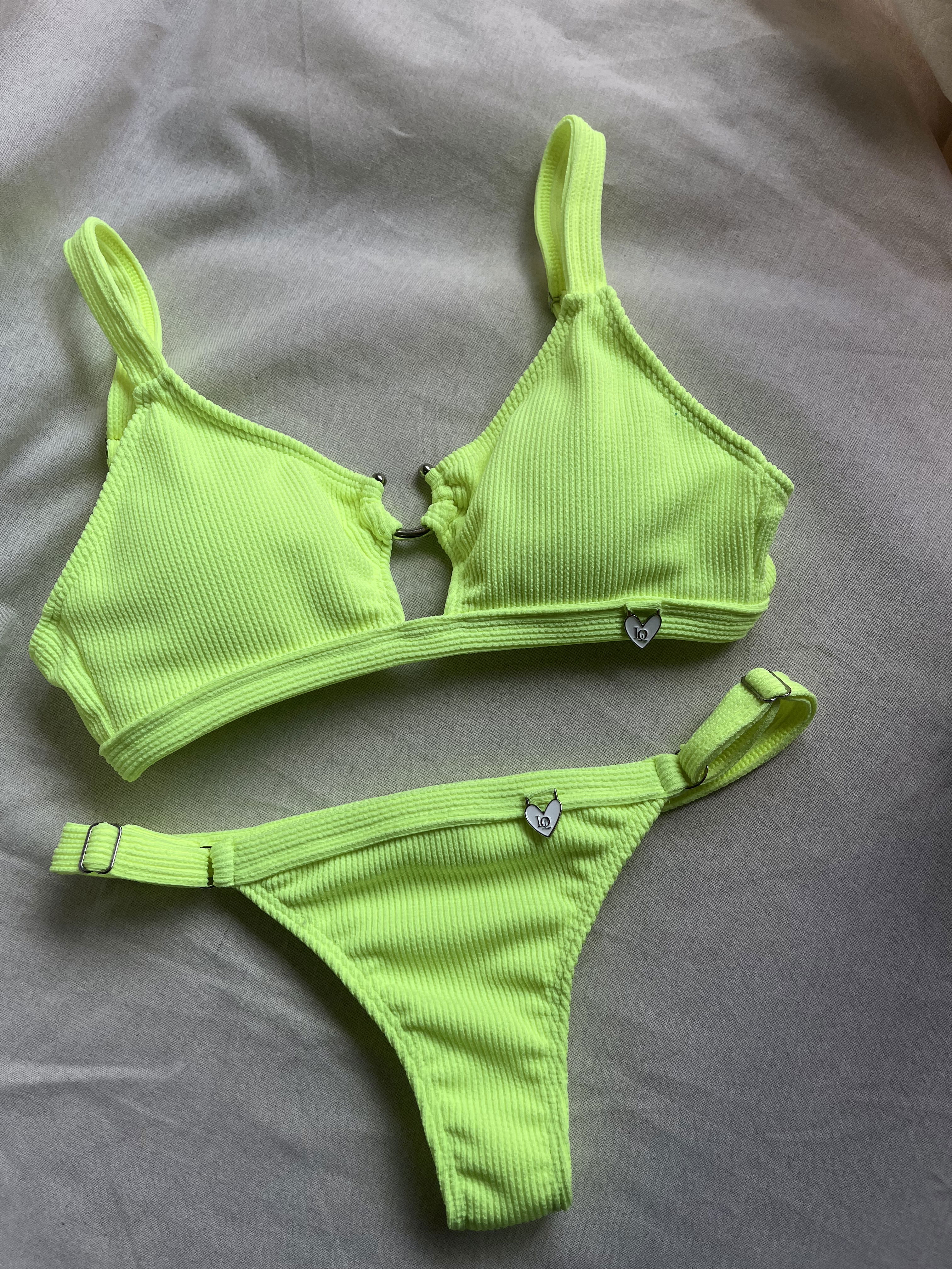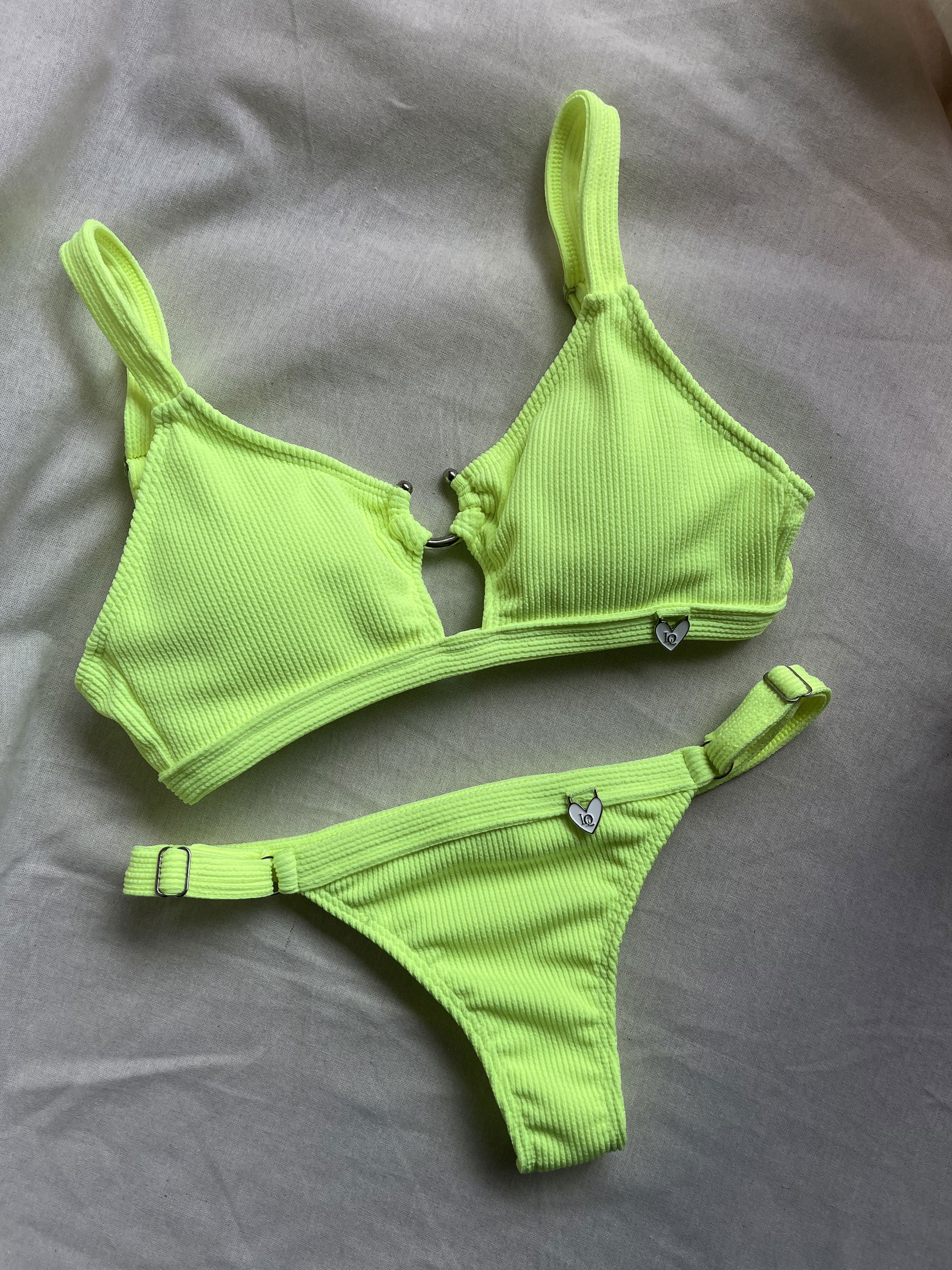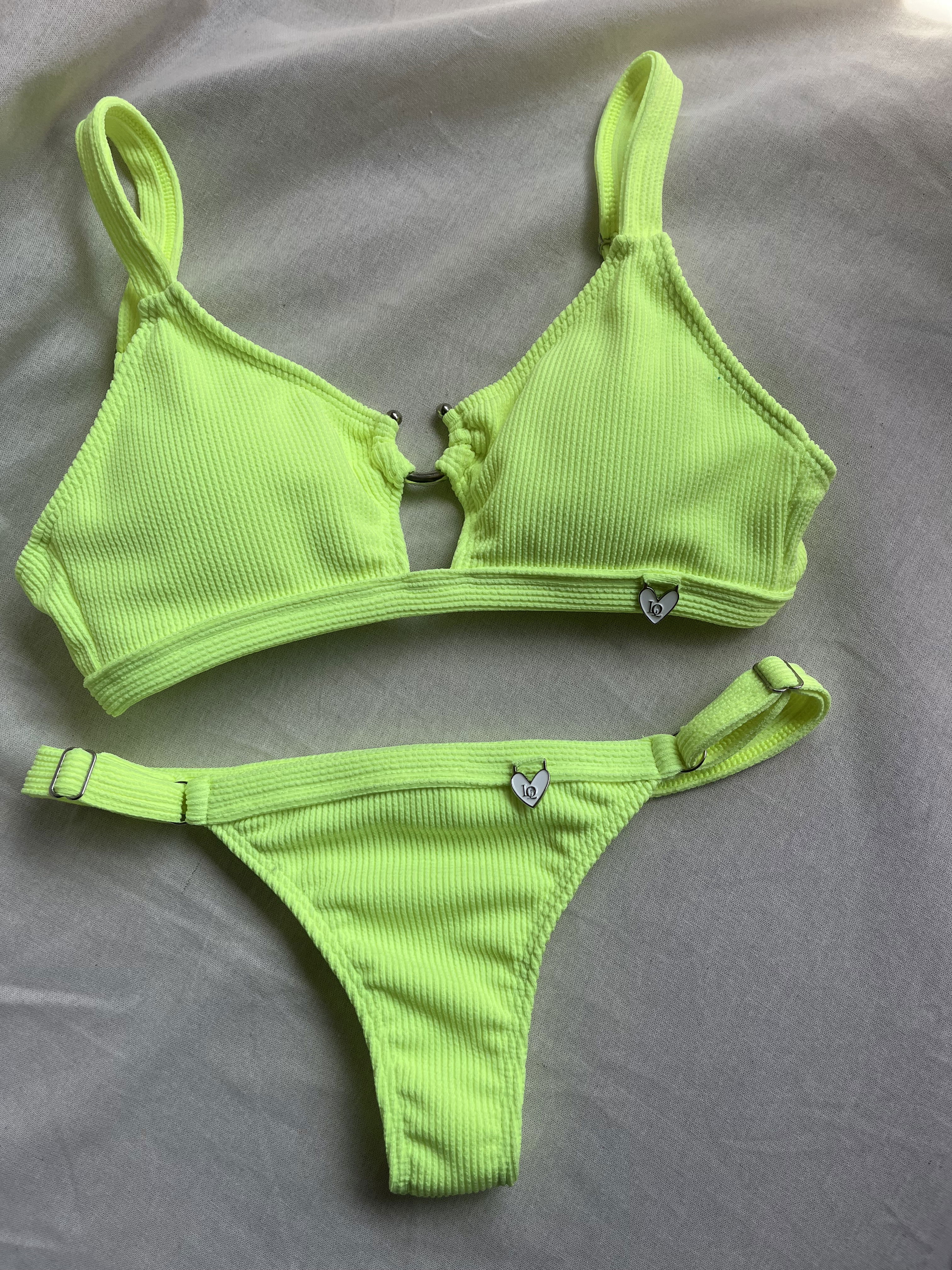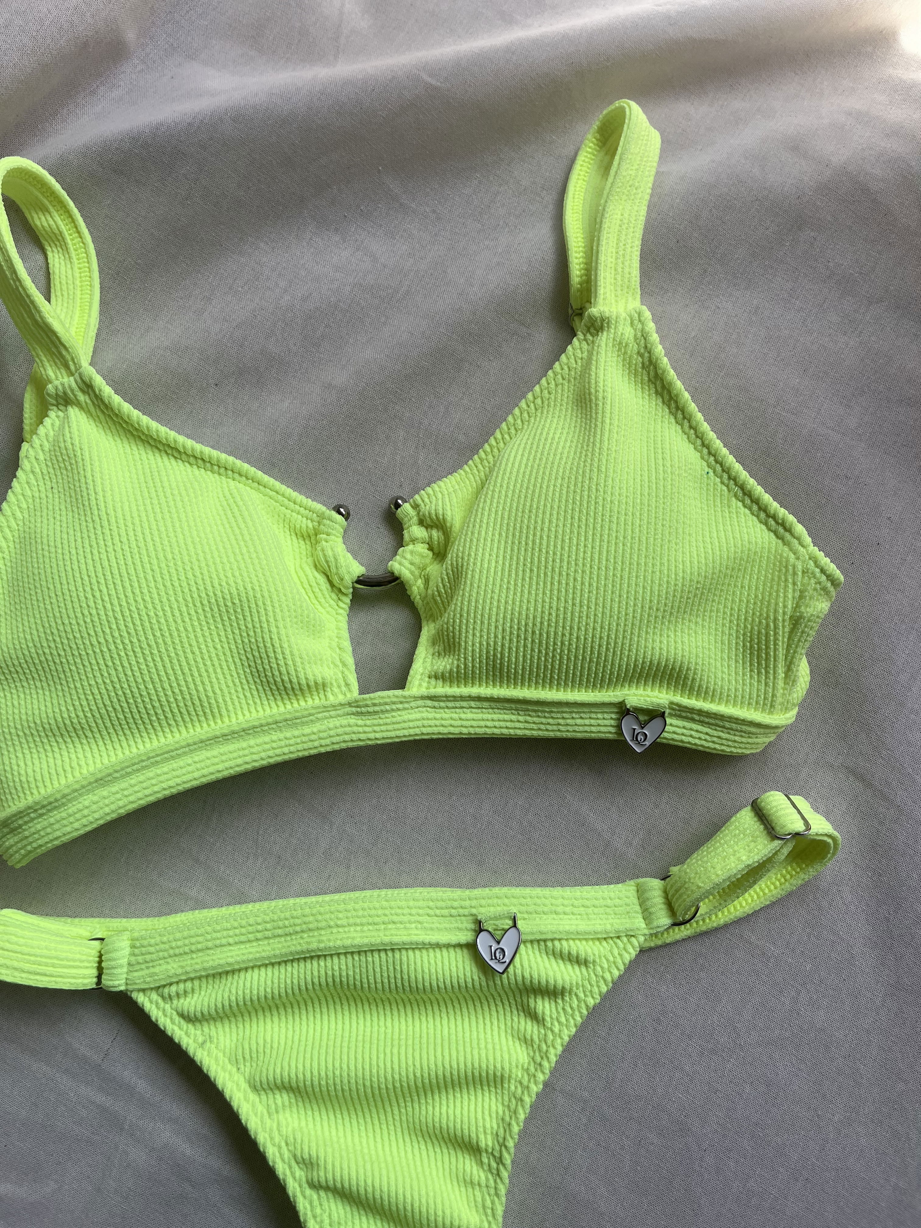 Top texturado con herraje, breteles regulables y espalda para atar. Colaless regulable