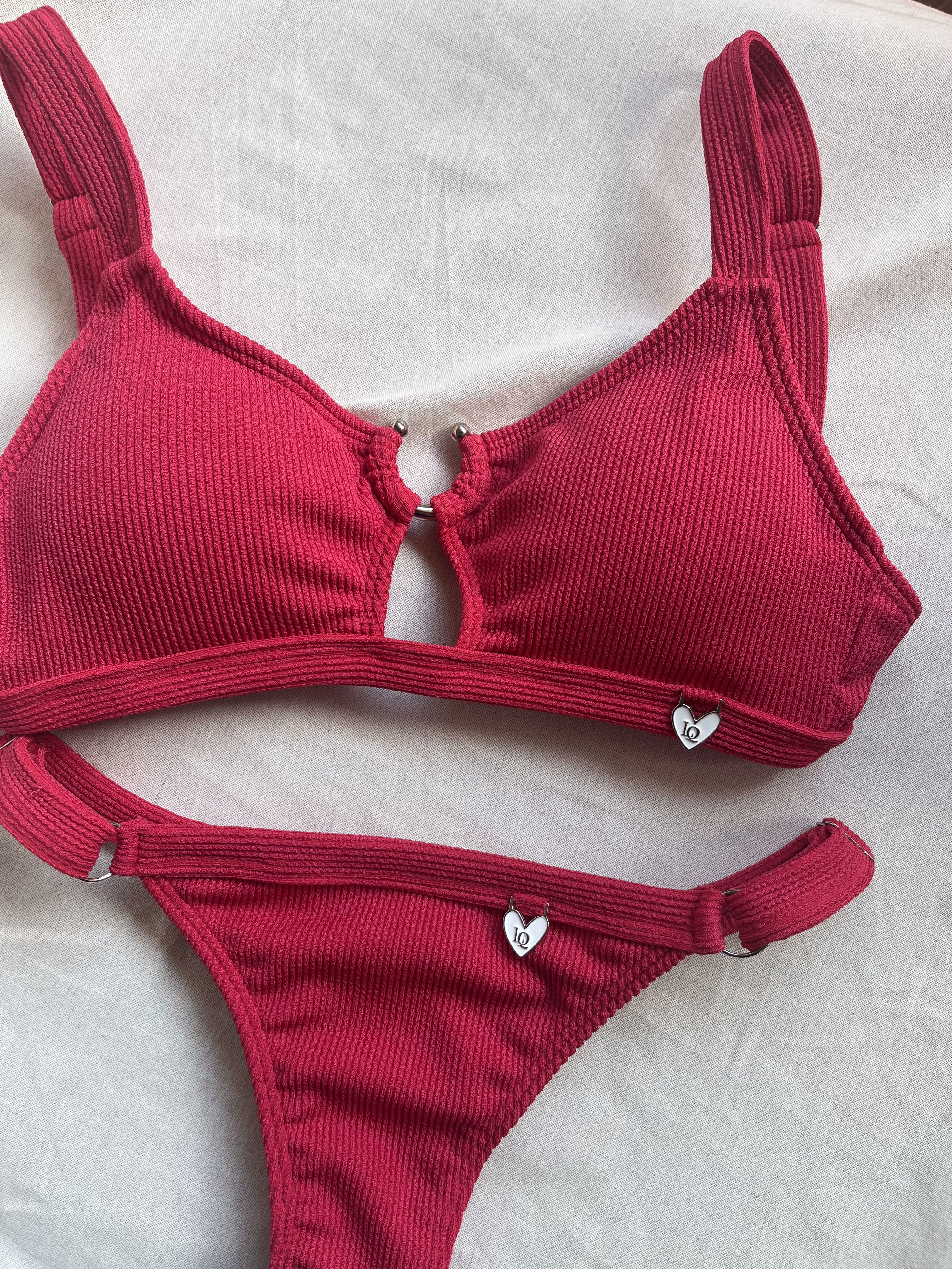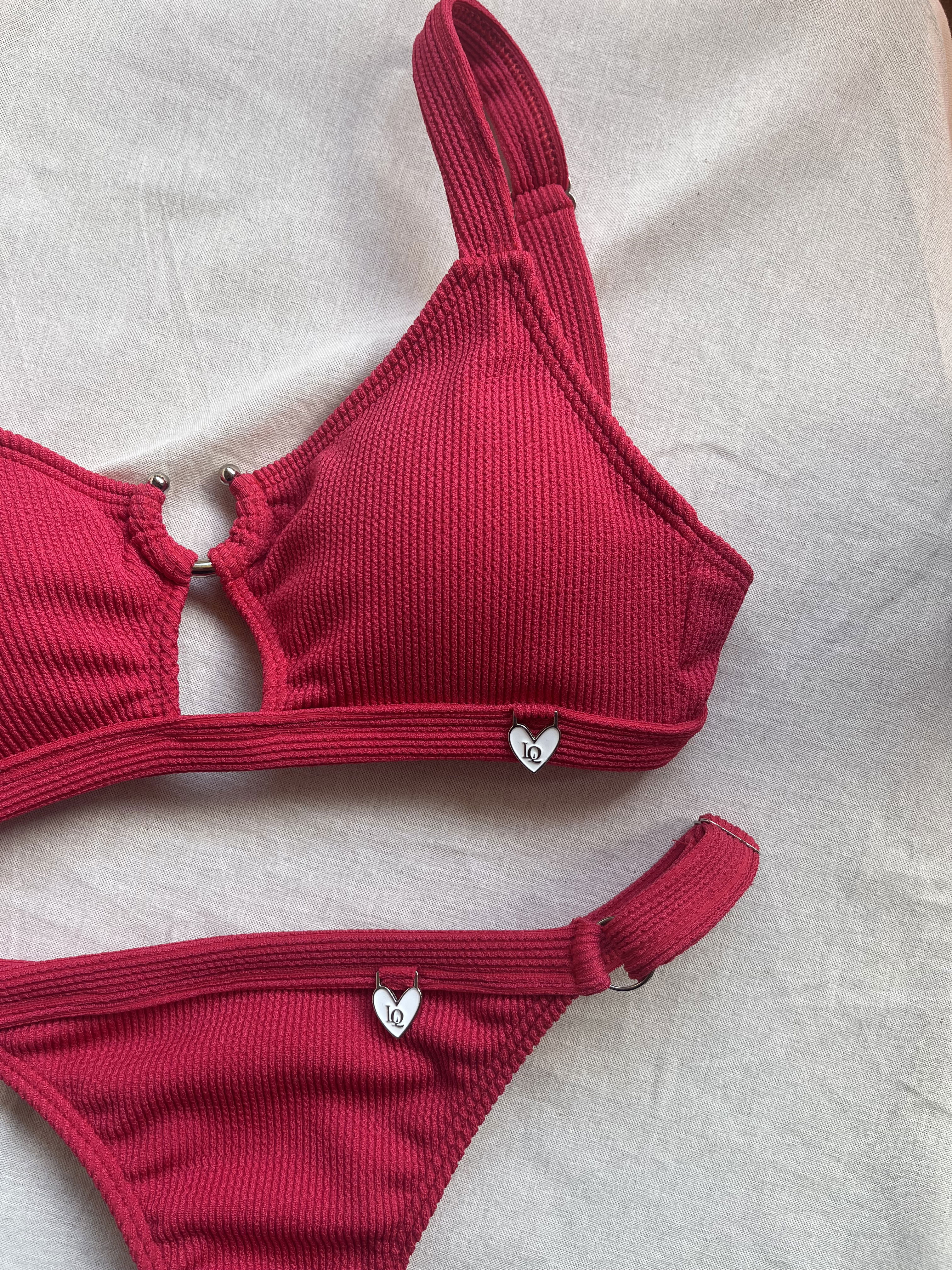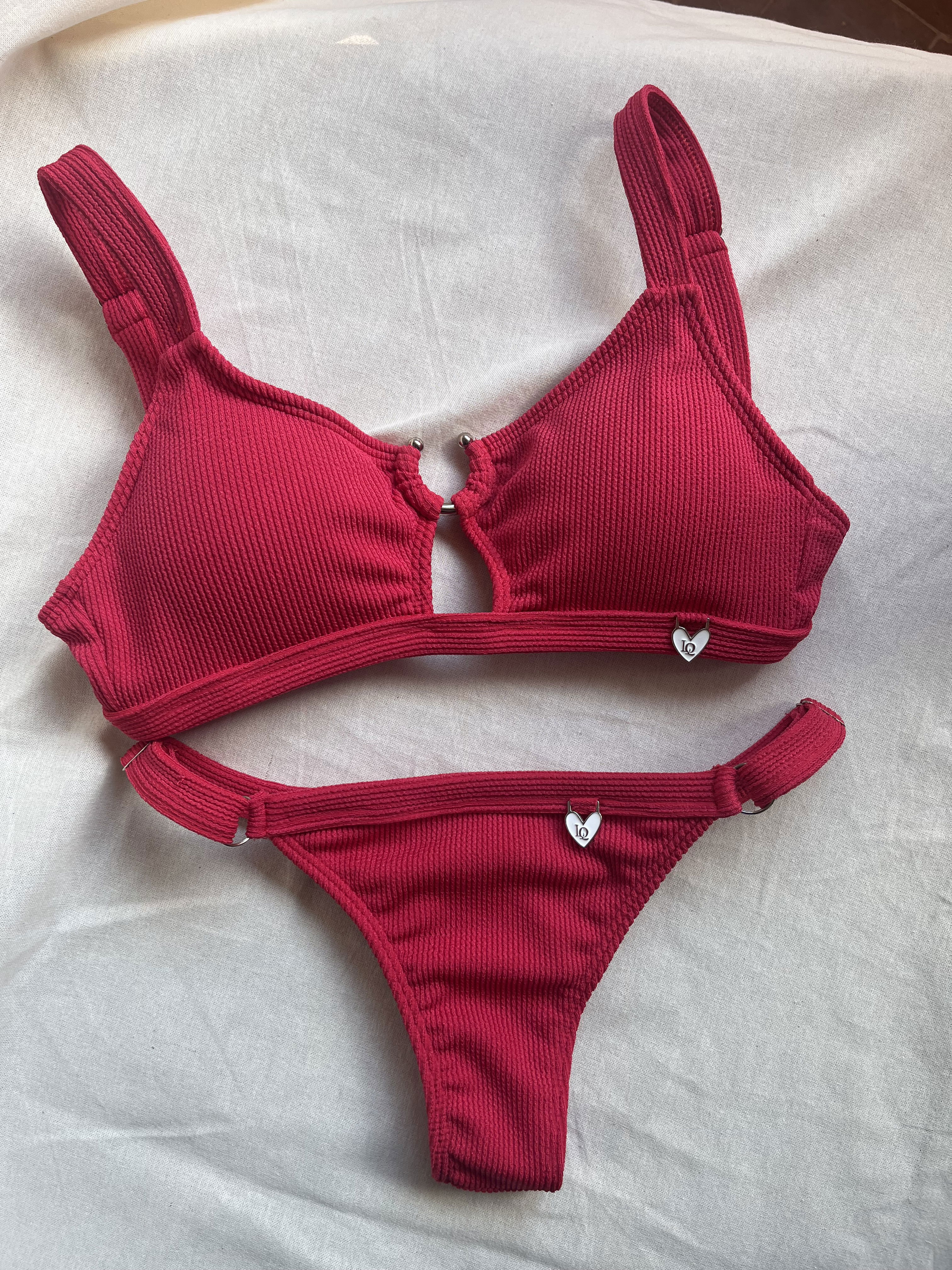 Top texturado con herraje, breteles regulables y espalda para atar. Colaless regulable