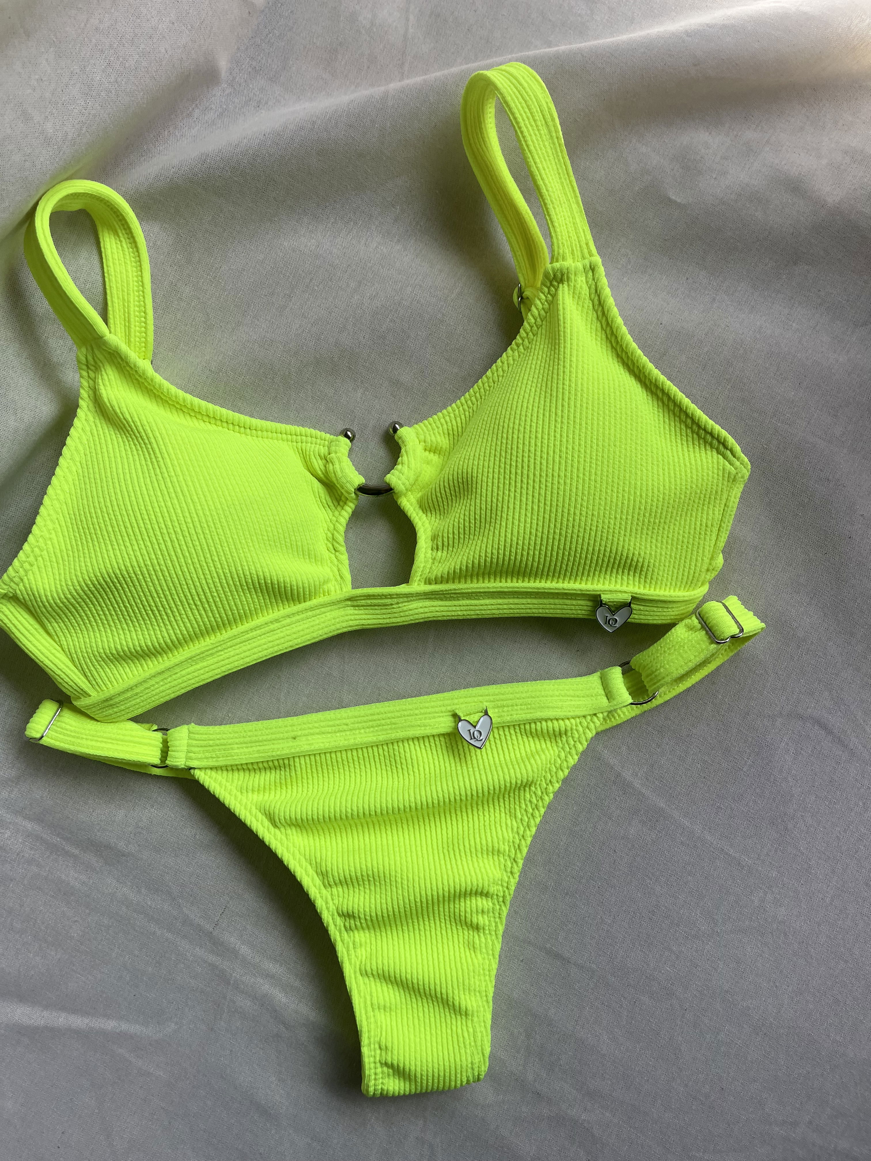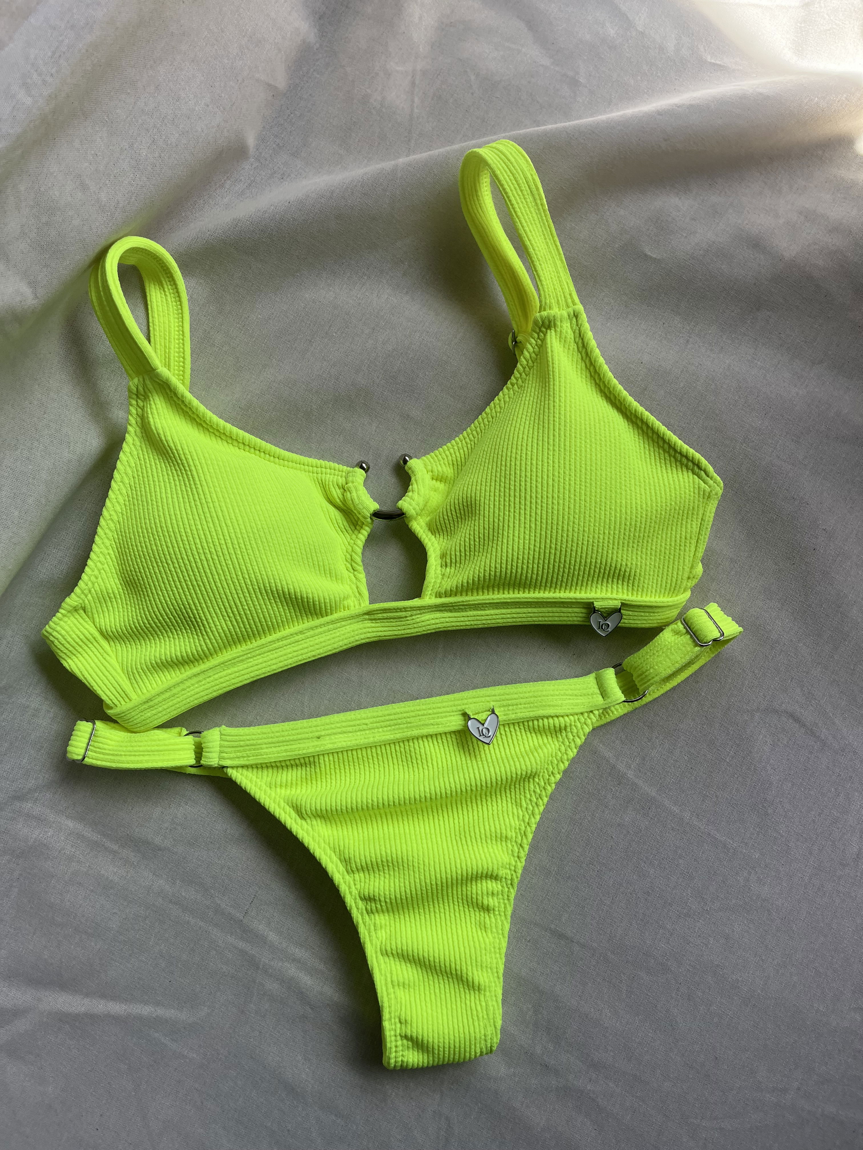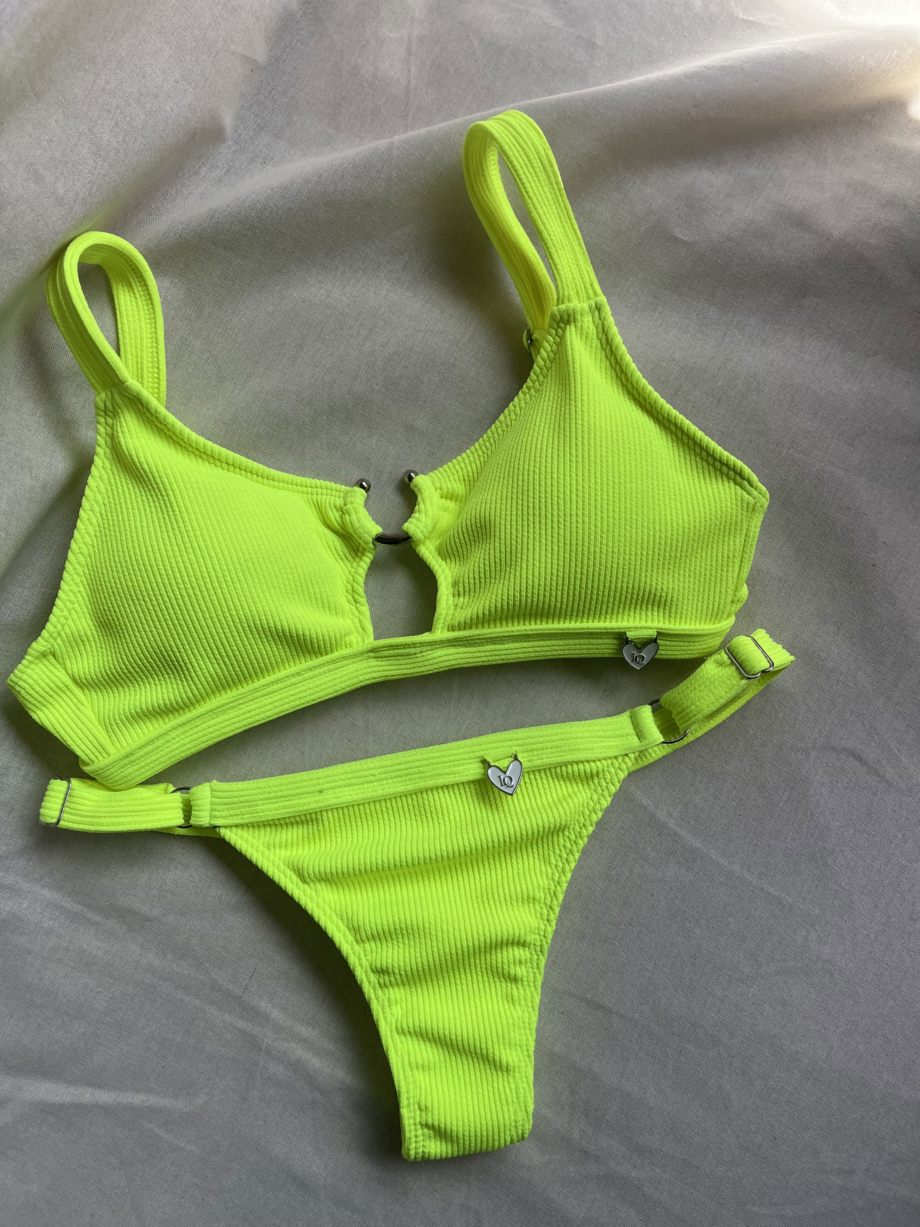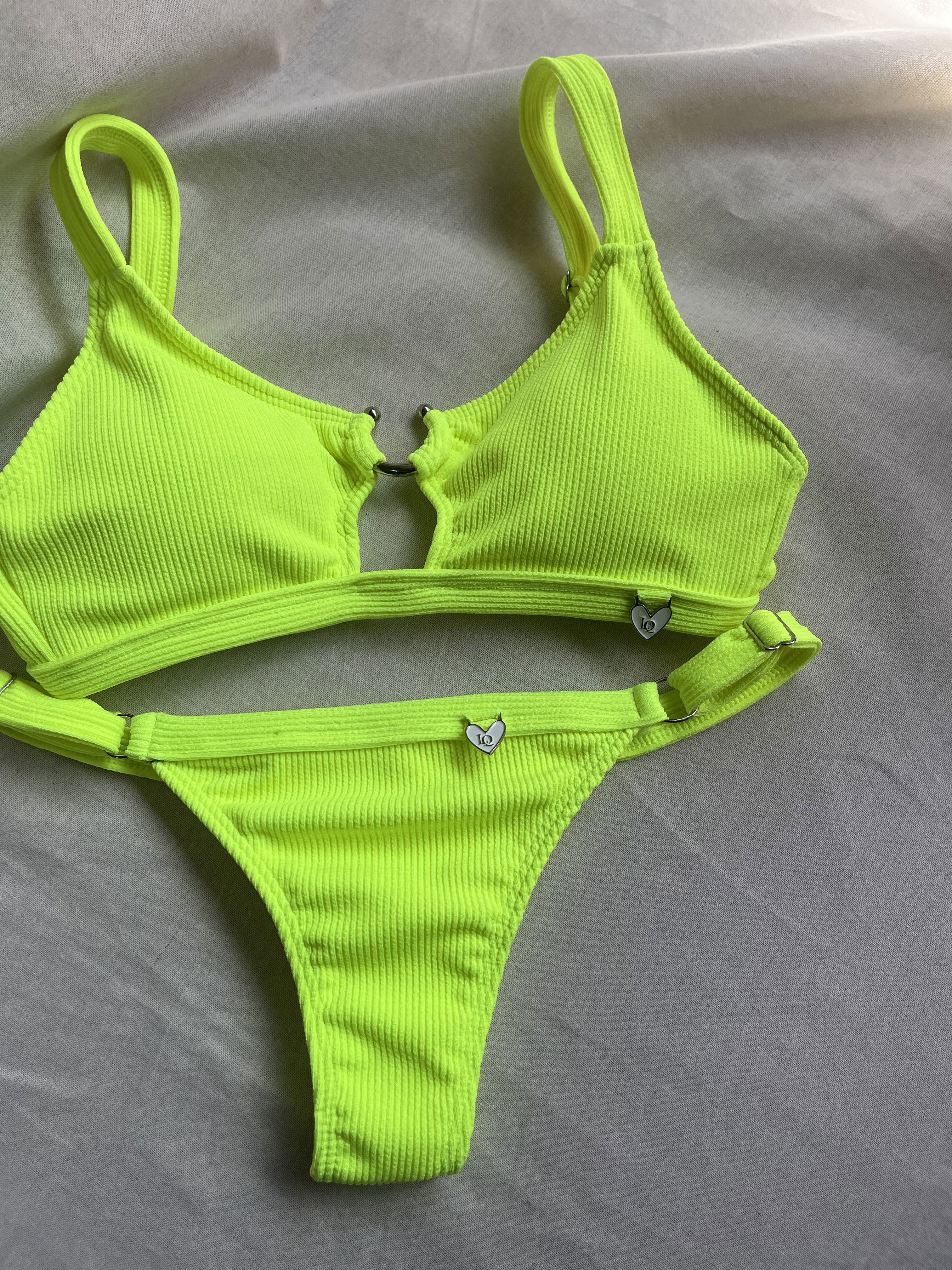Top texturado con herraje, breteles regulables y espalda para atar. Colaless regulable
