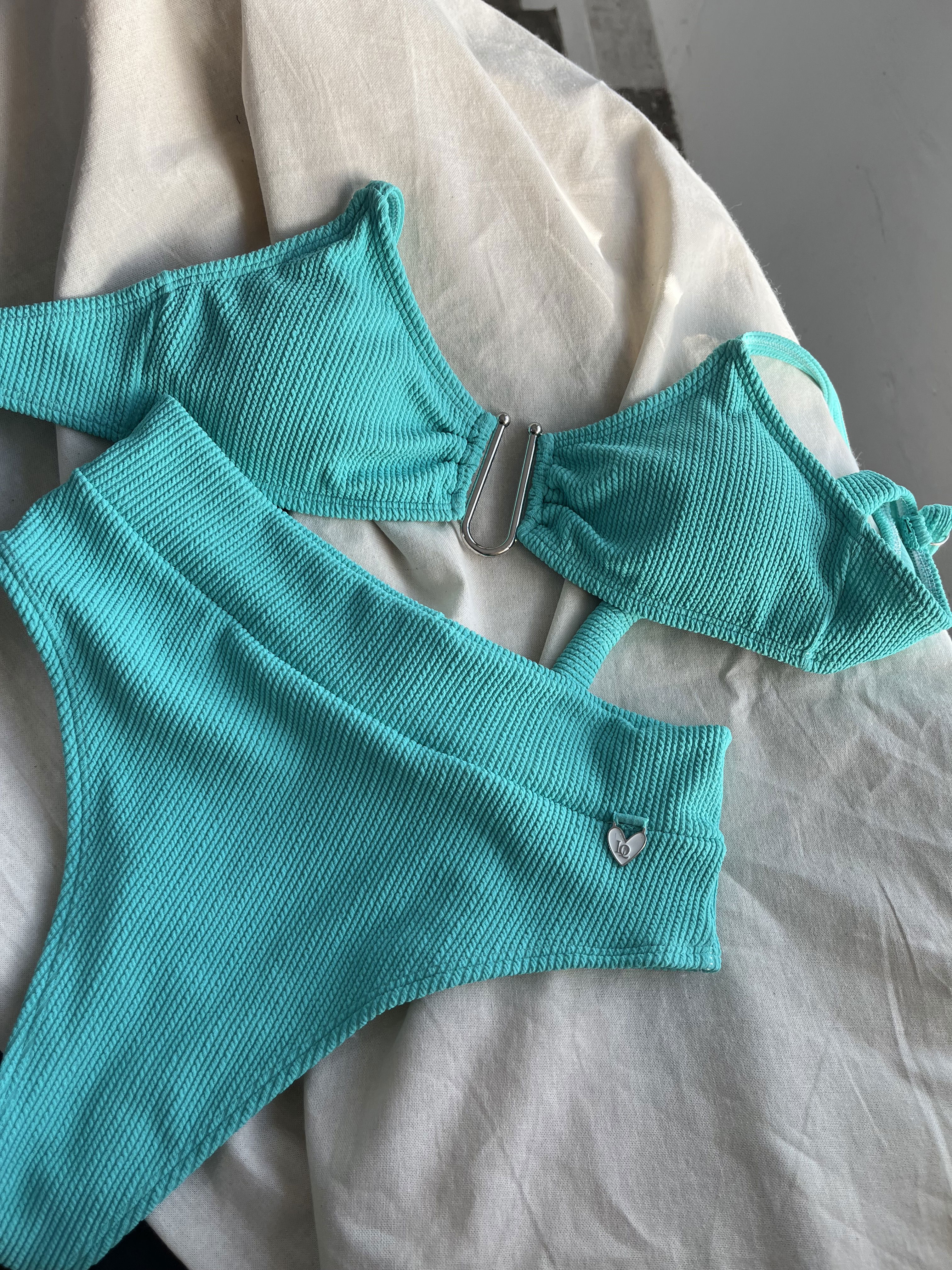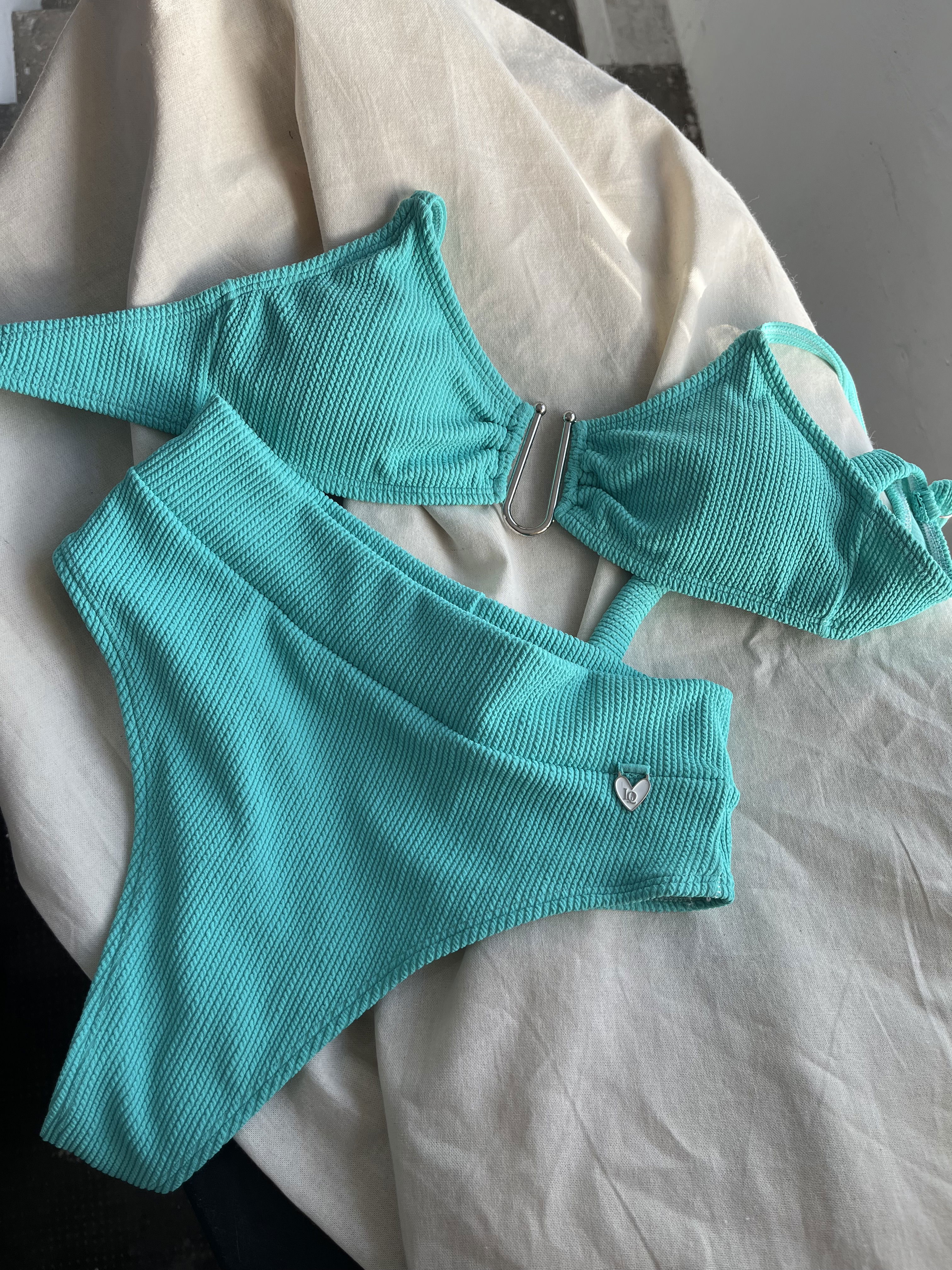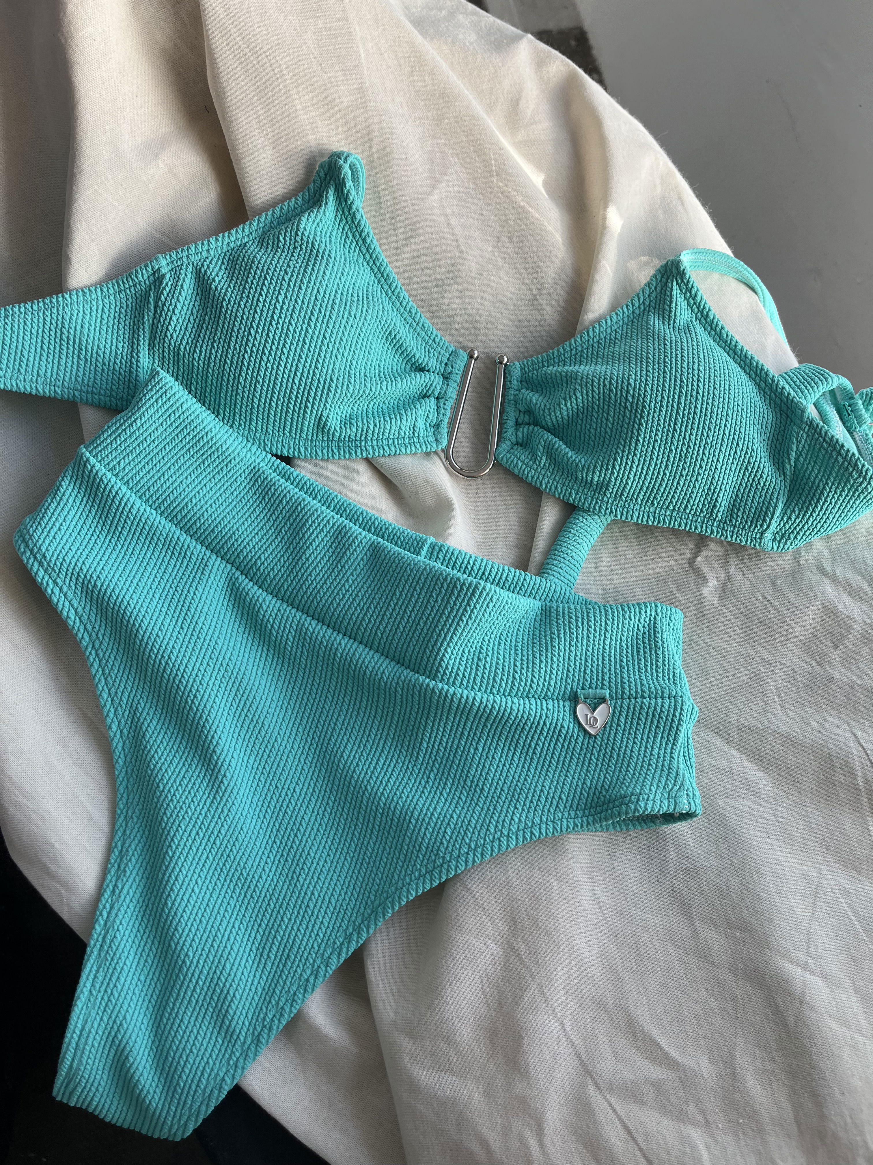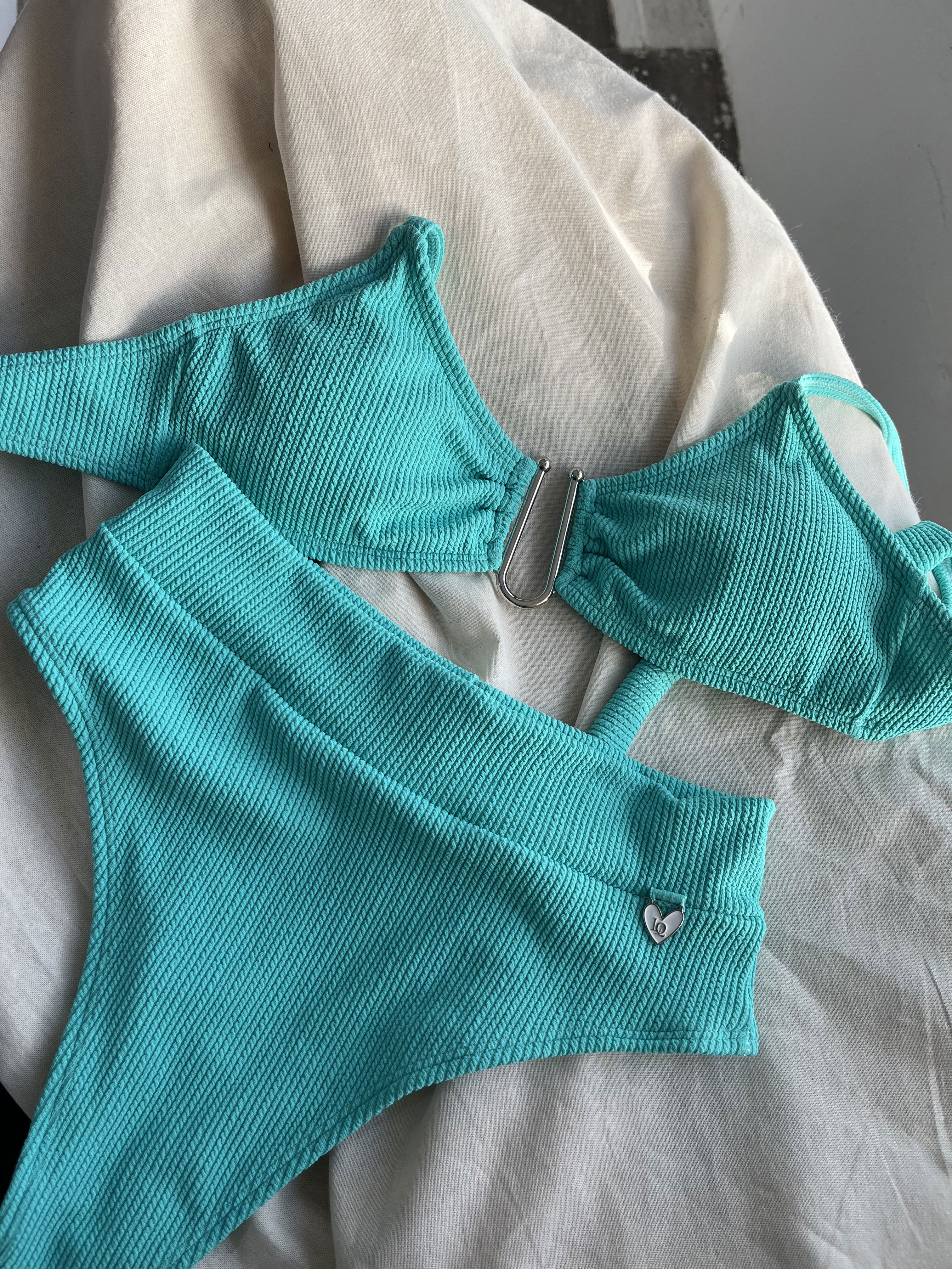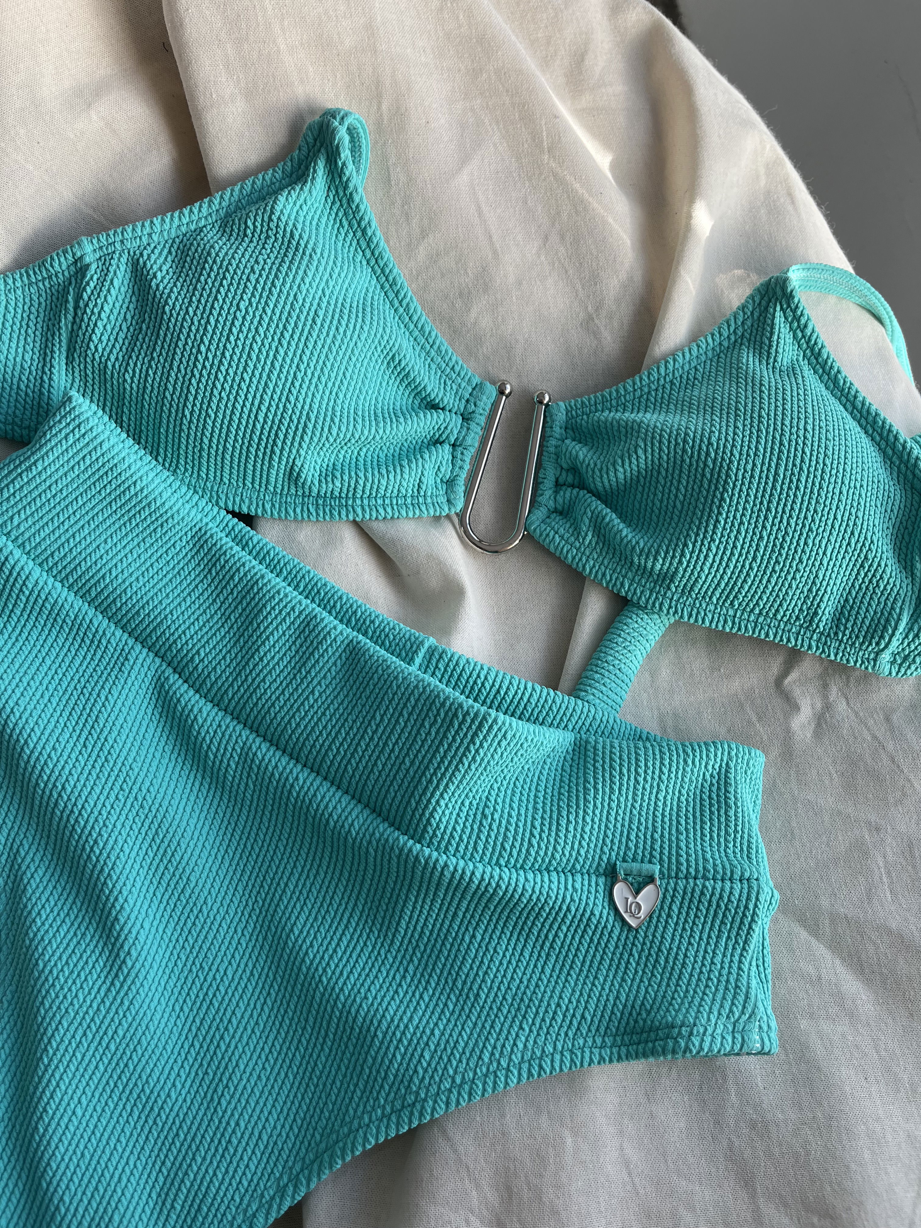 Top texturado con herraje, breteles regulables y espalda para atar.