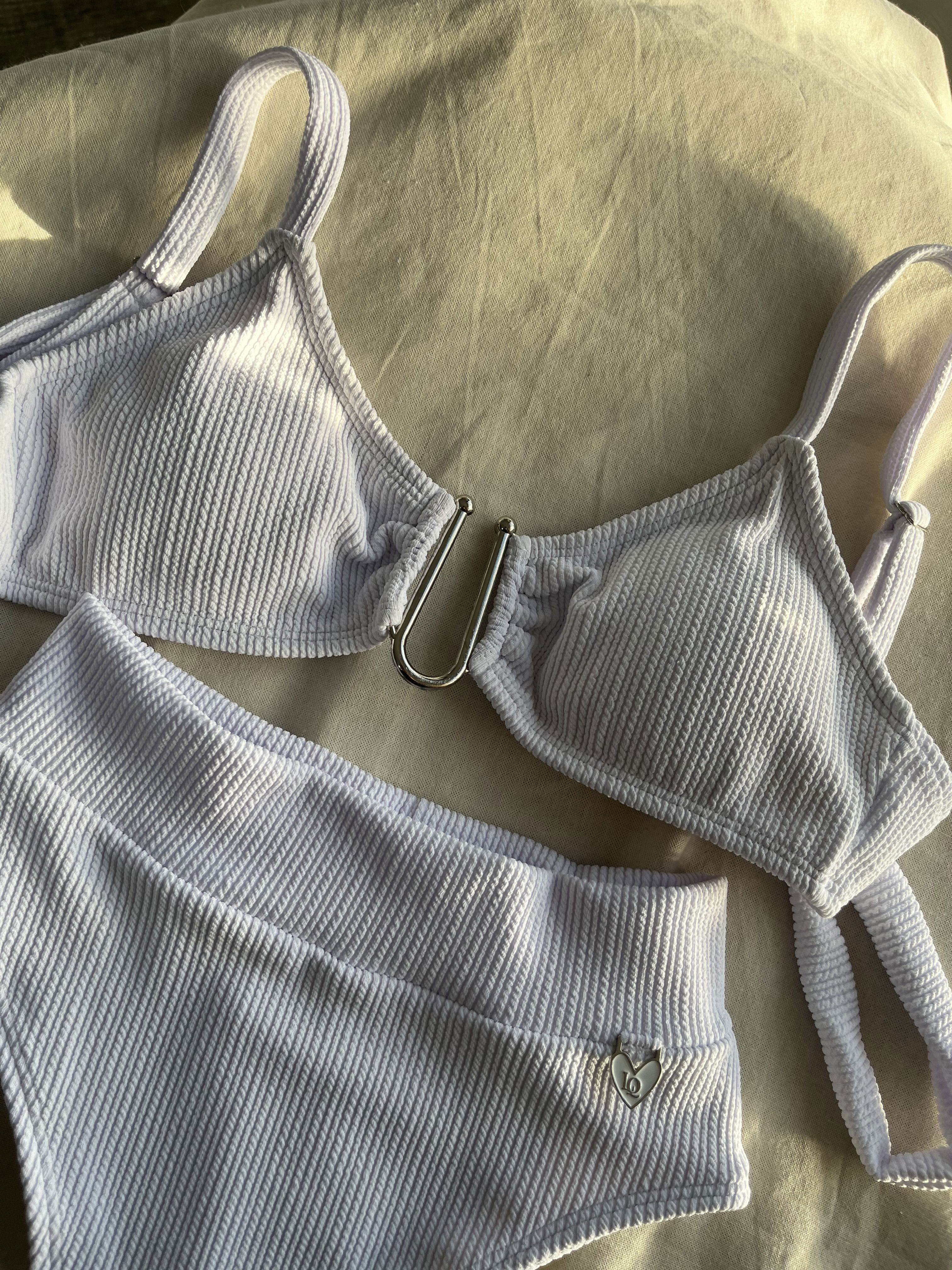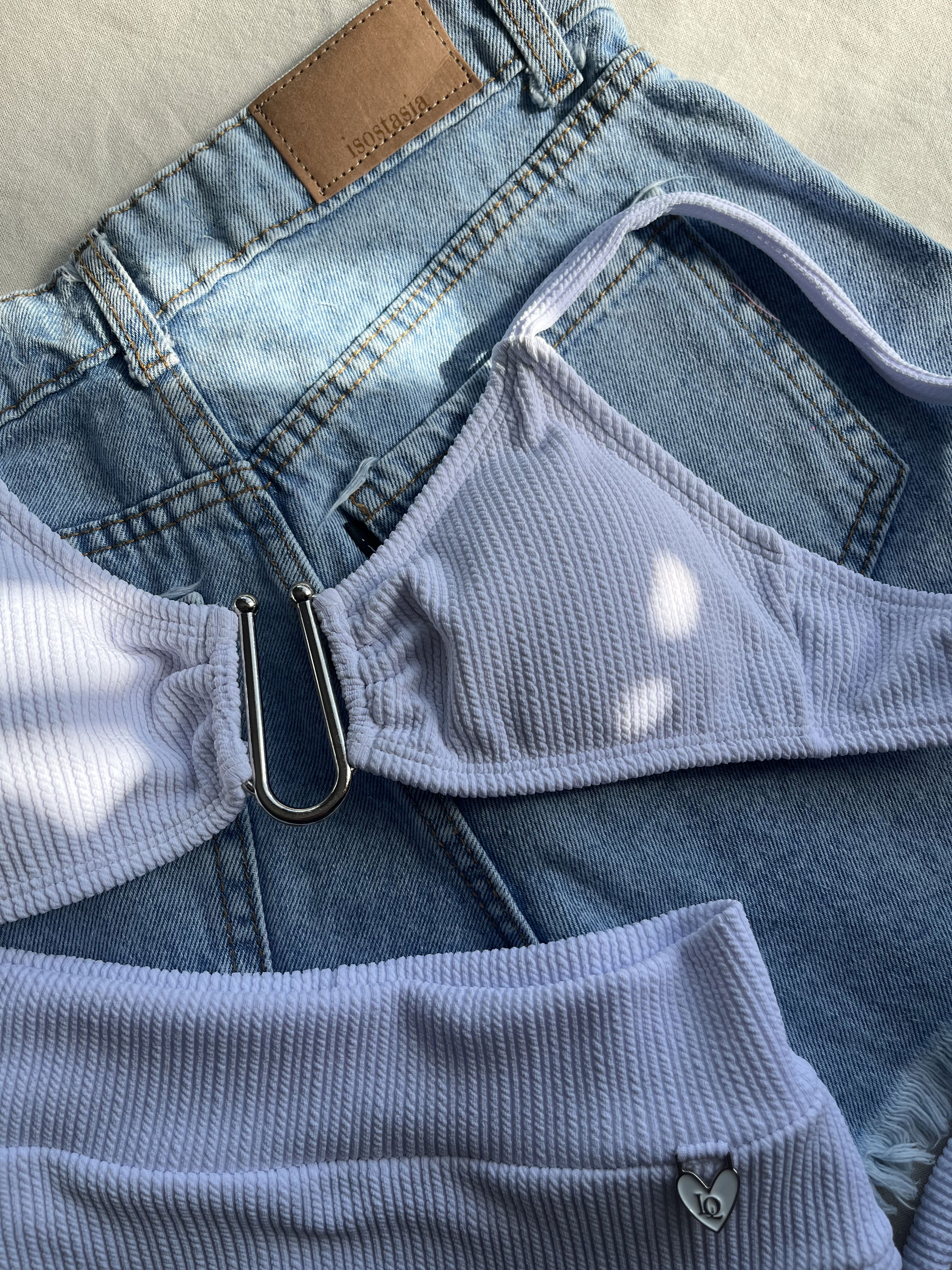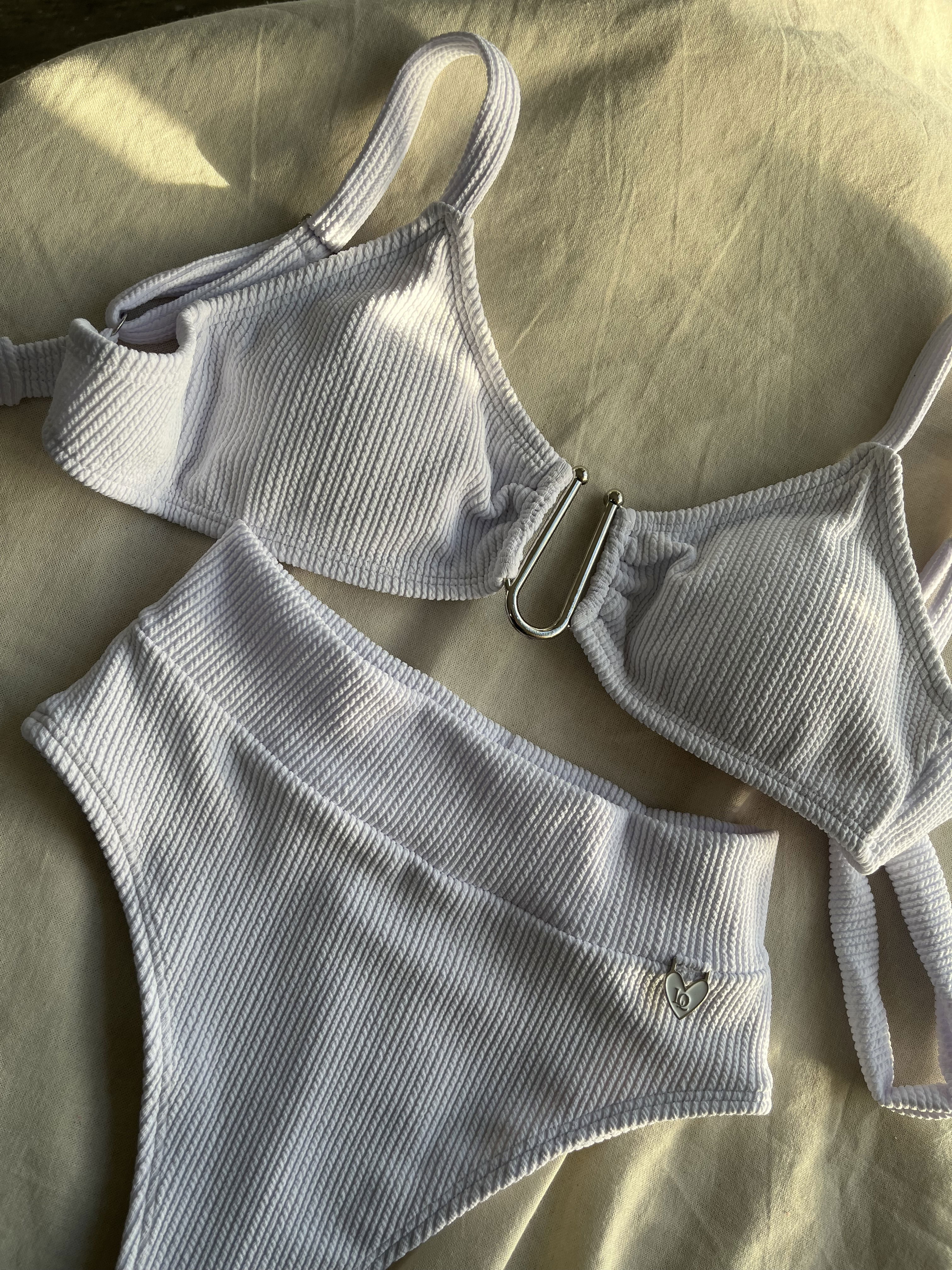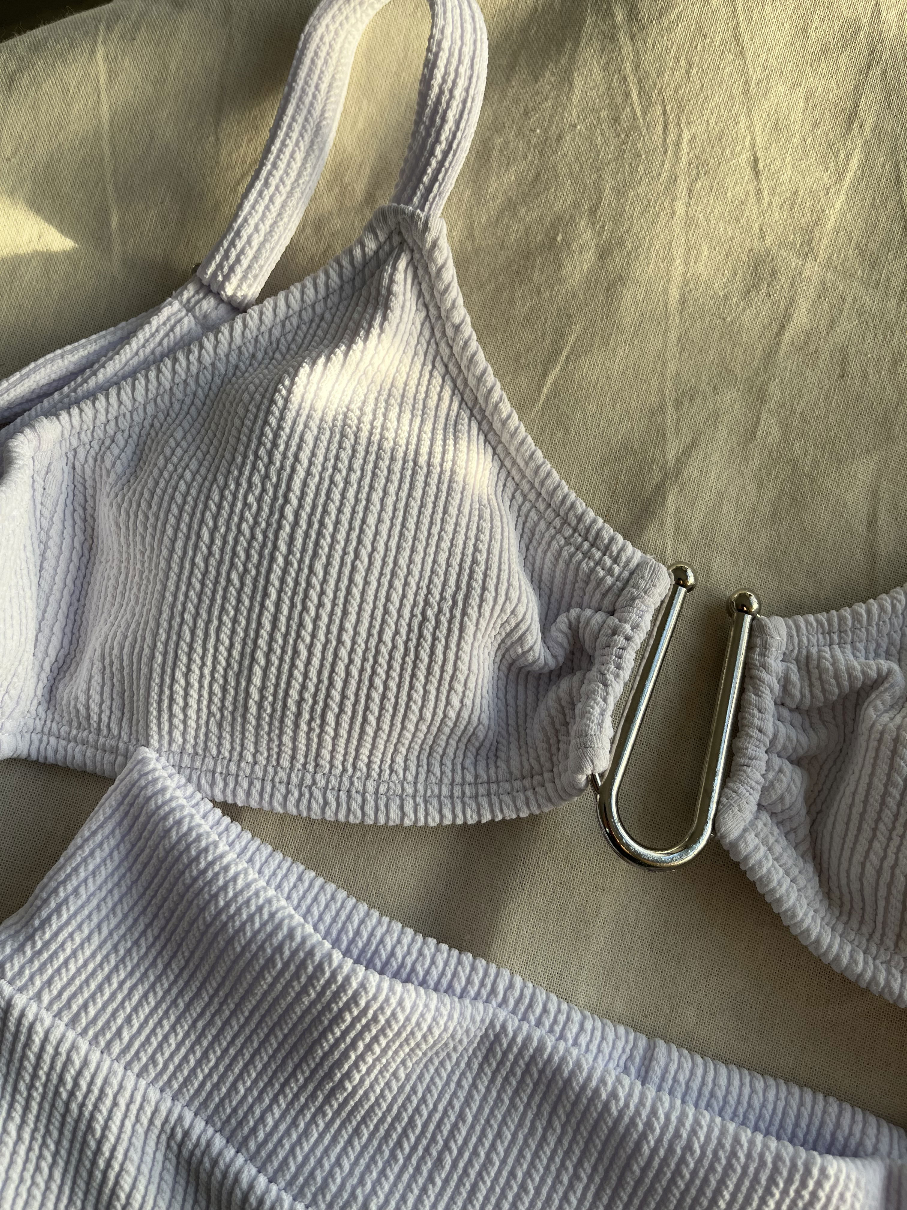 Top texturado con herraje, breteles regulables y espalda para atar.