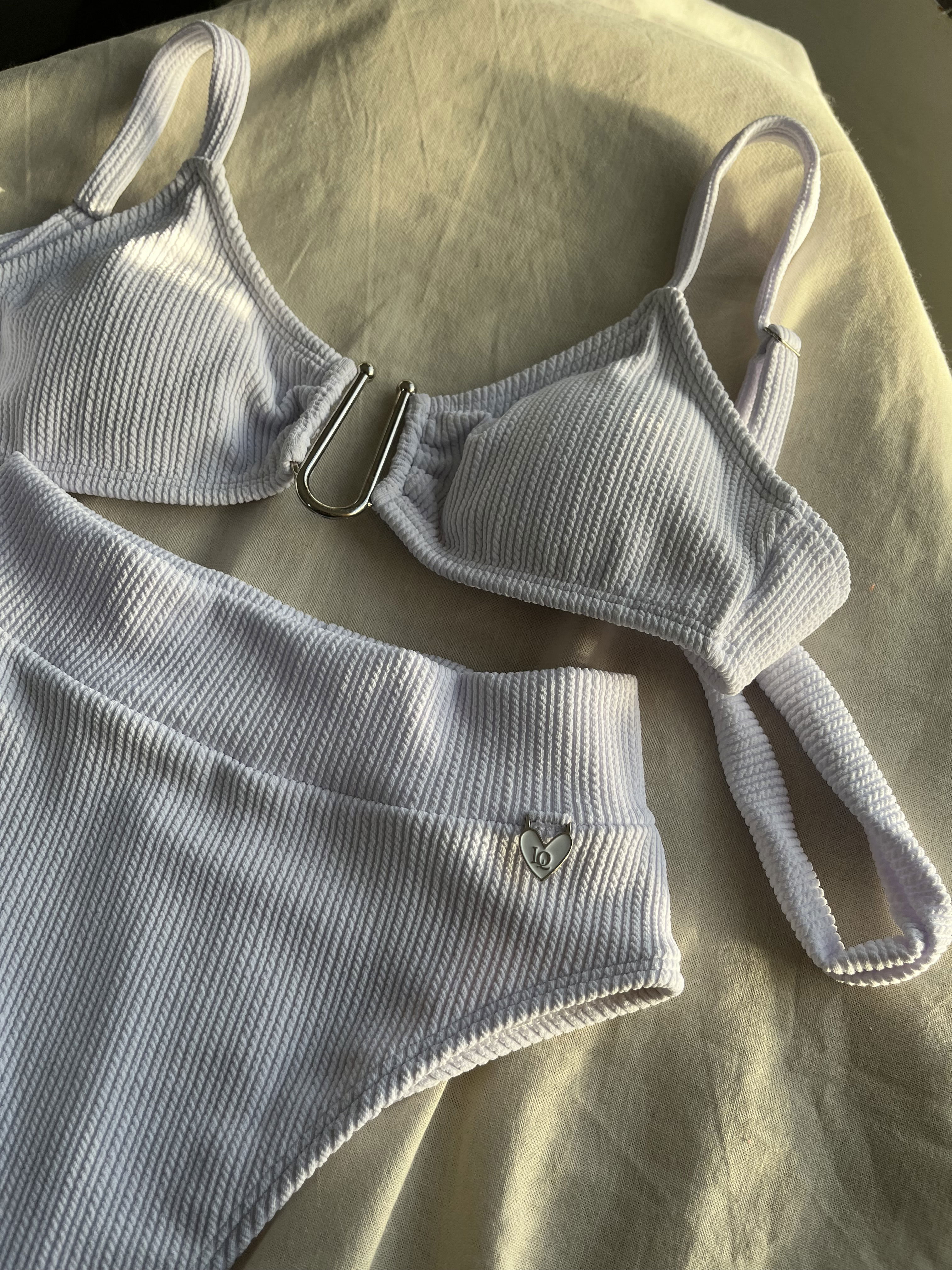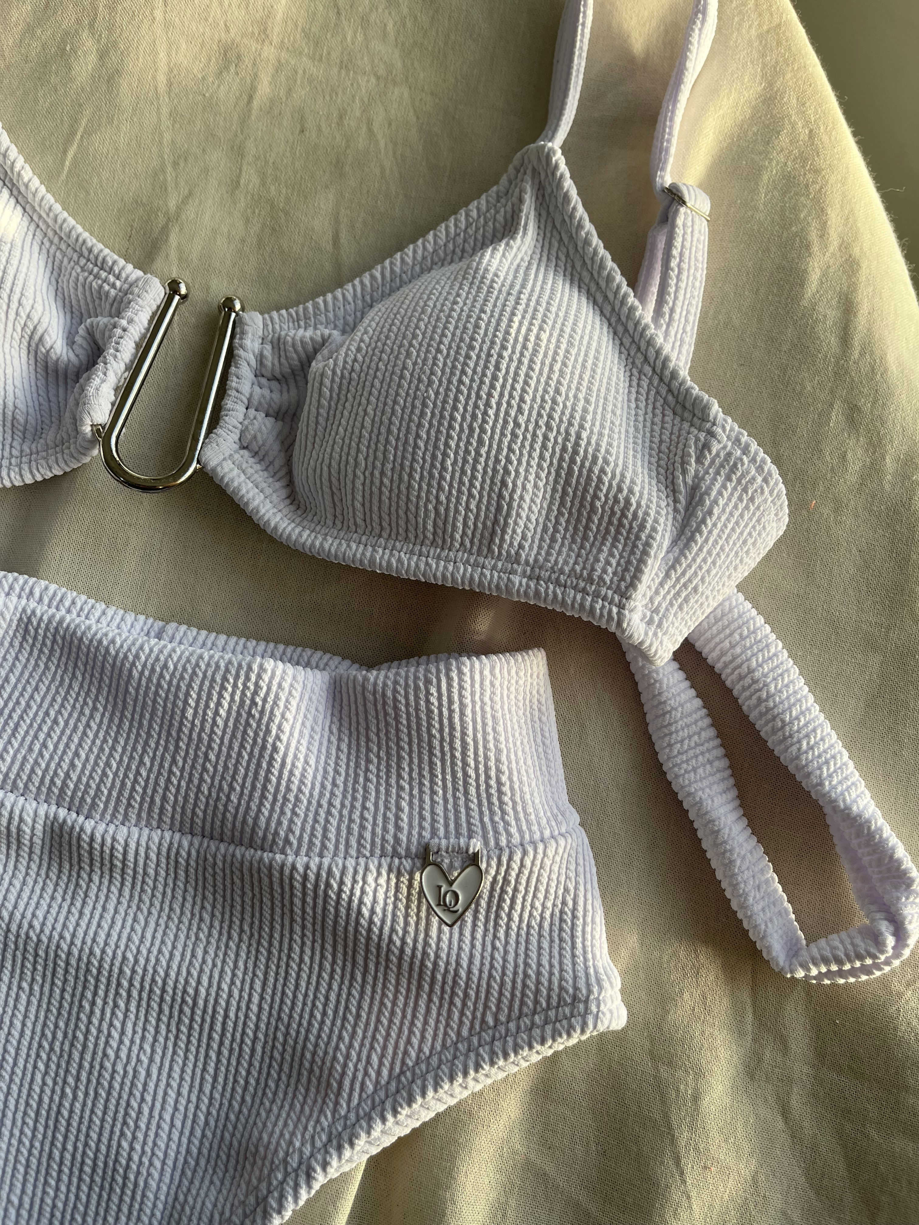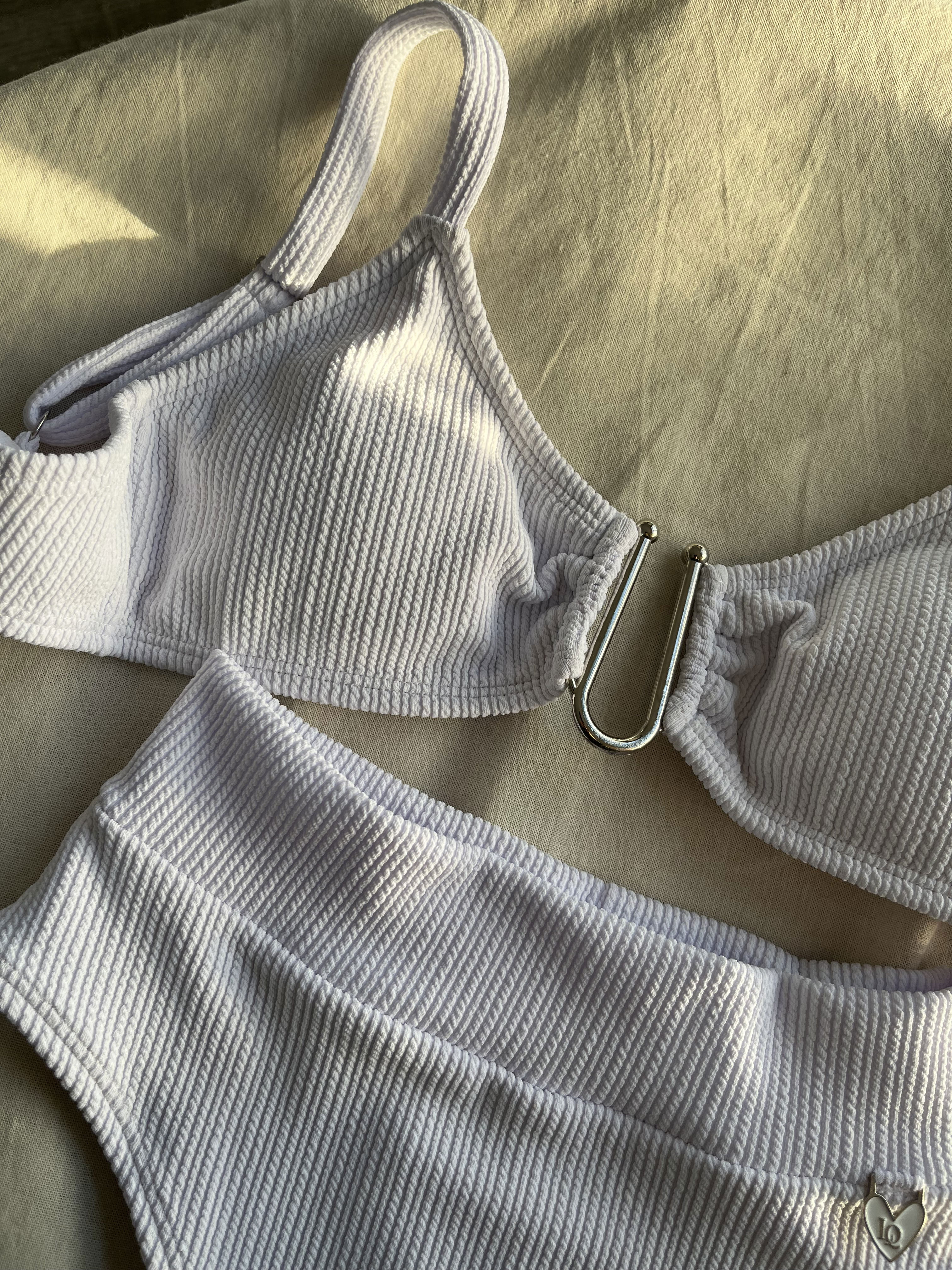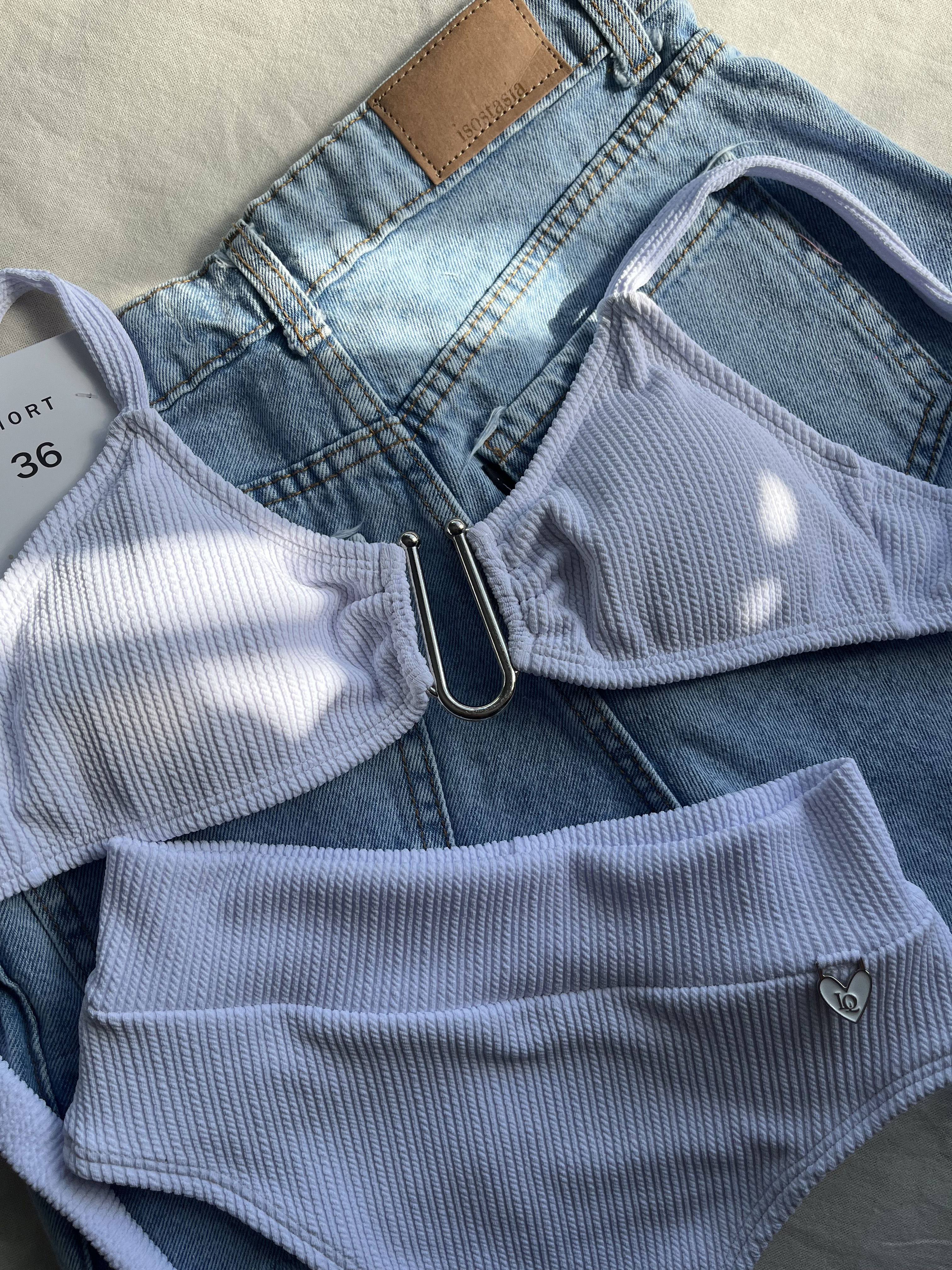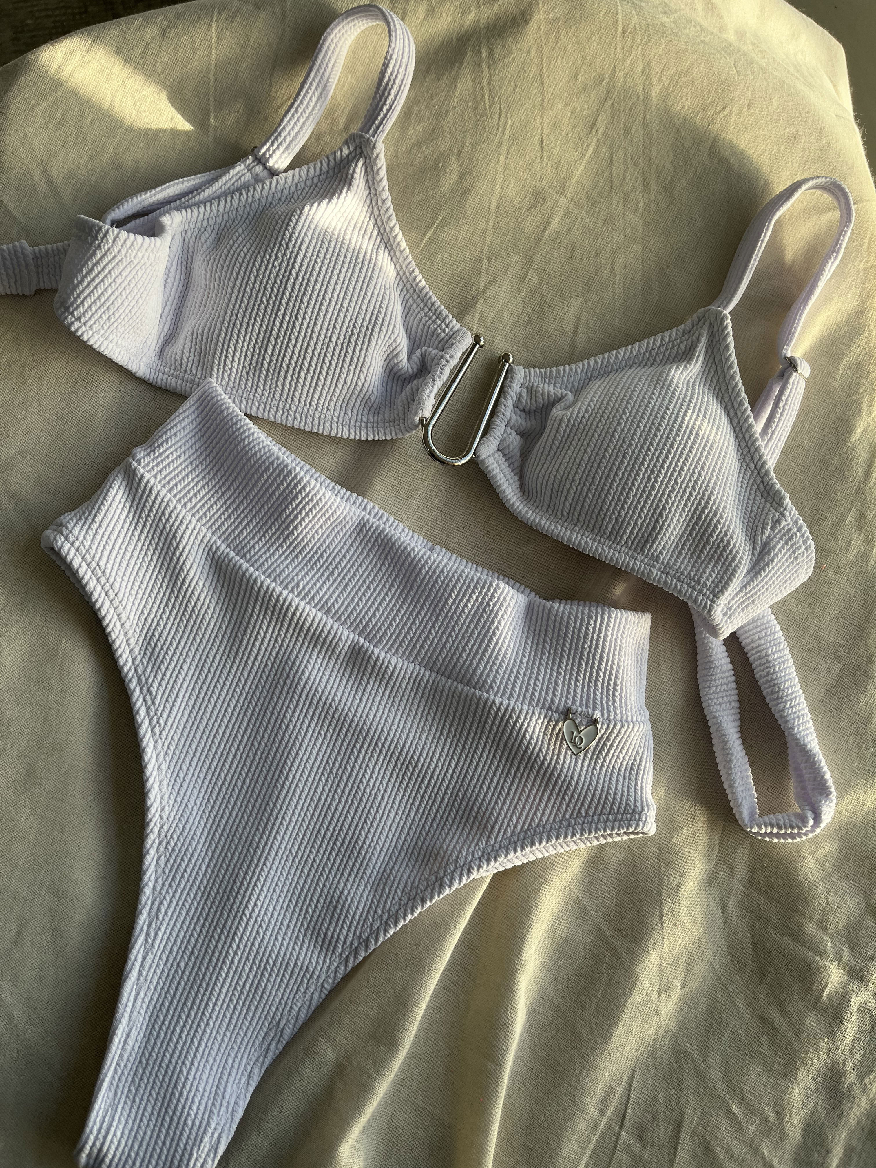 Top texturado con herraje, breteles regulables y espalda para atar.