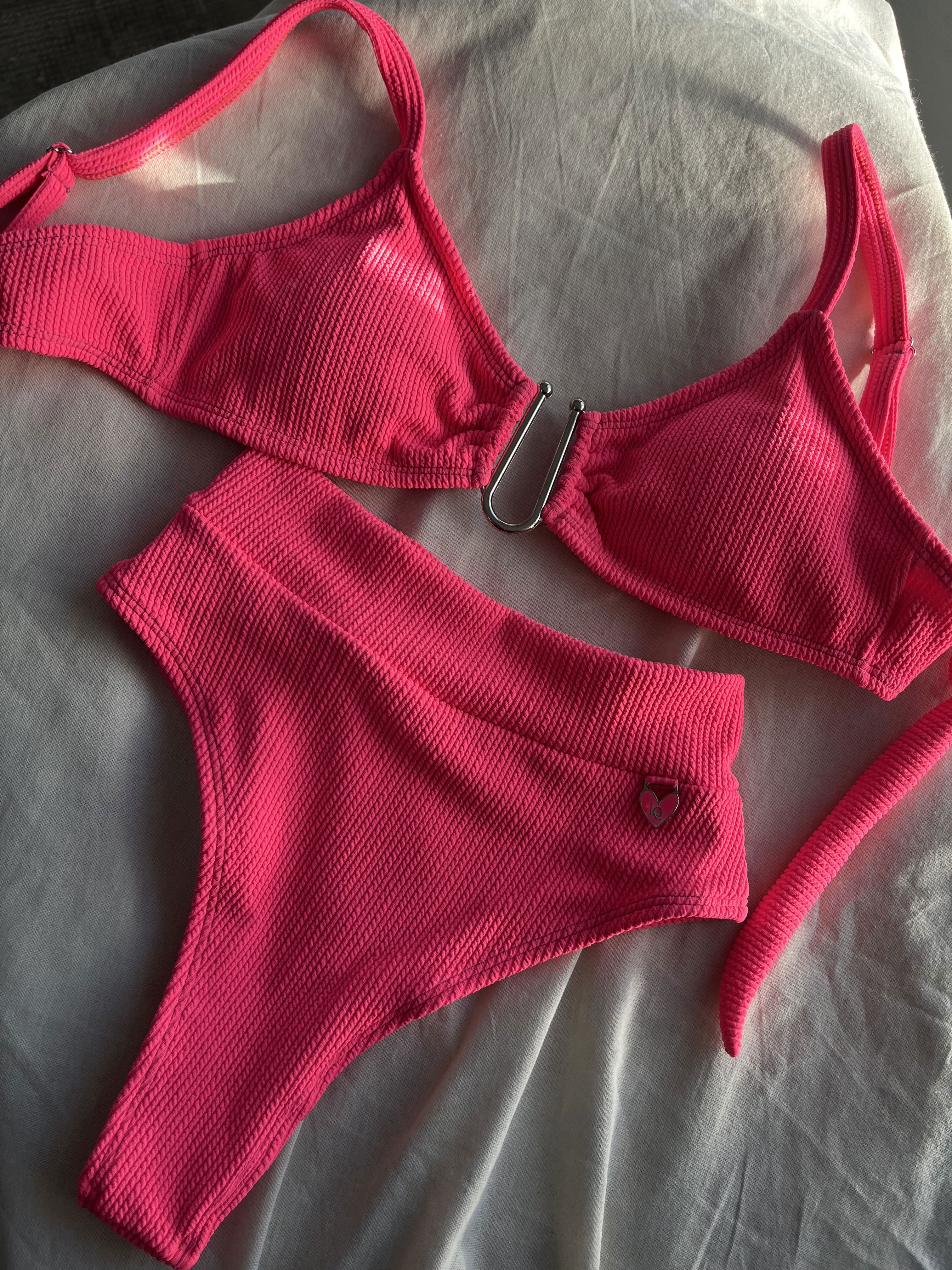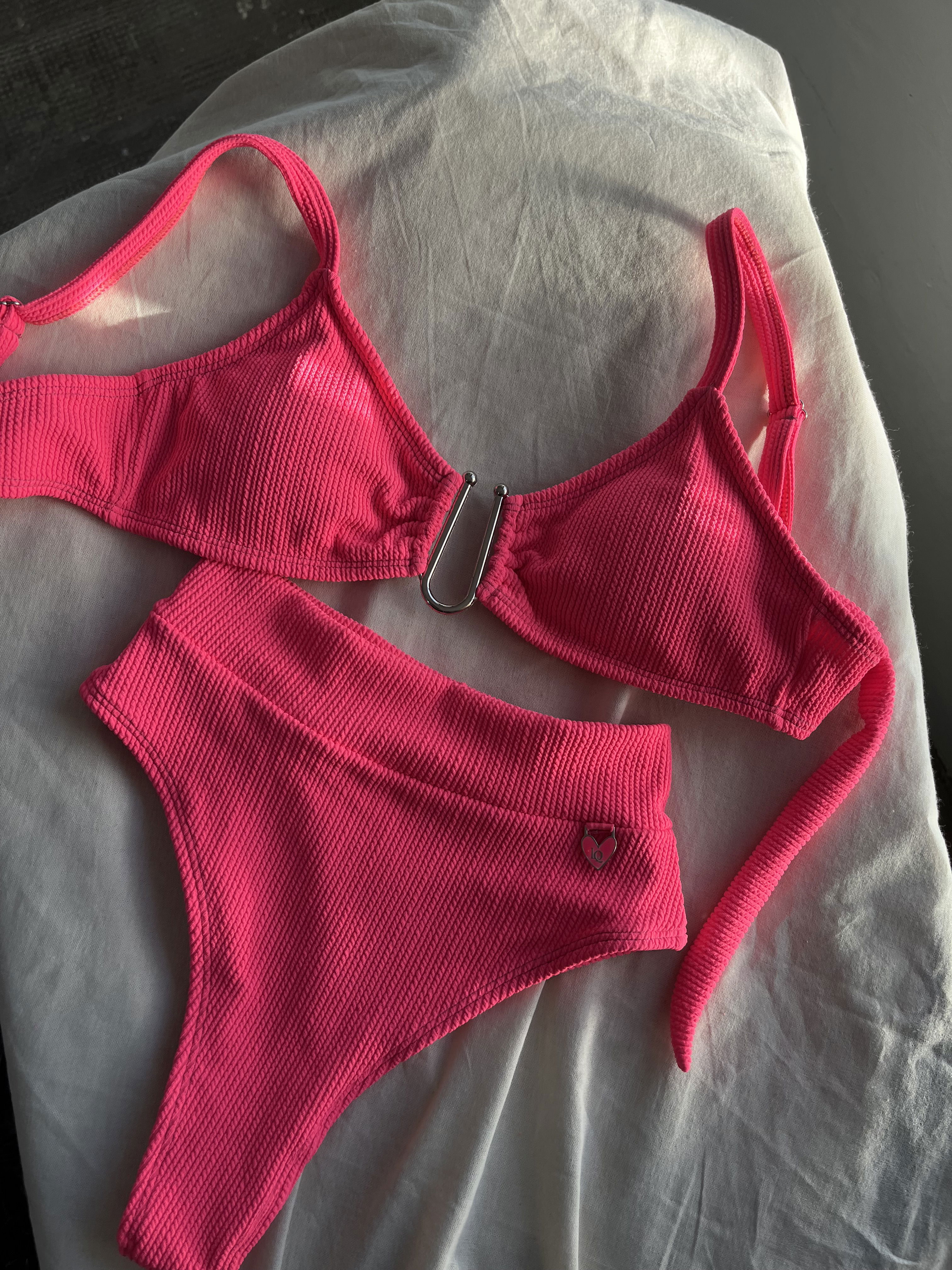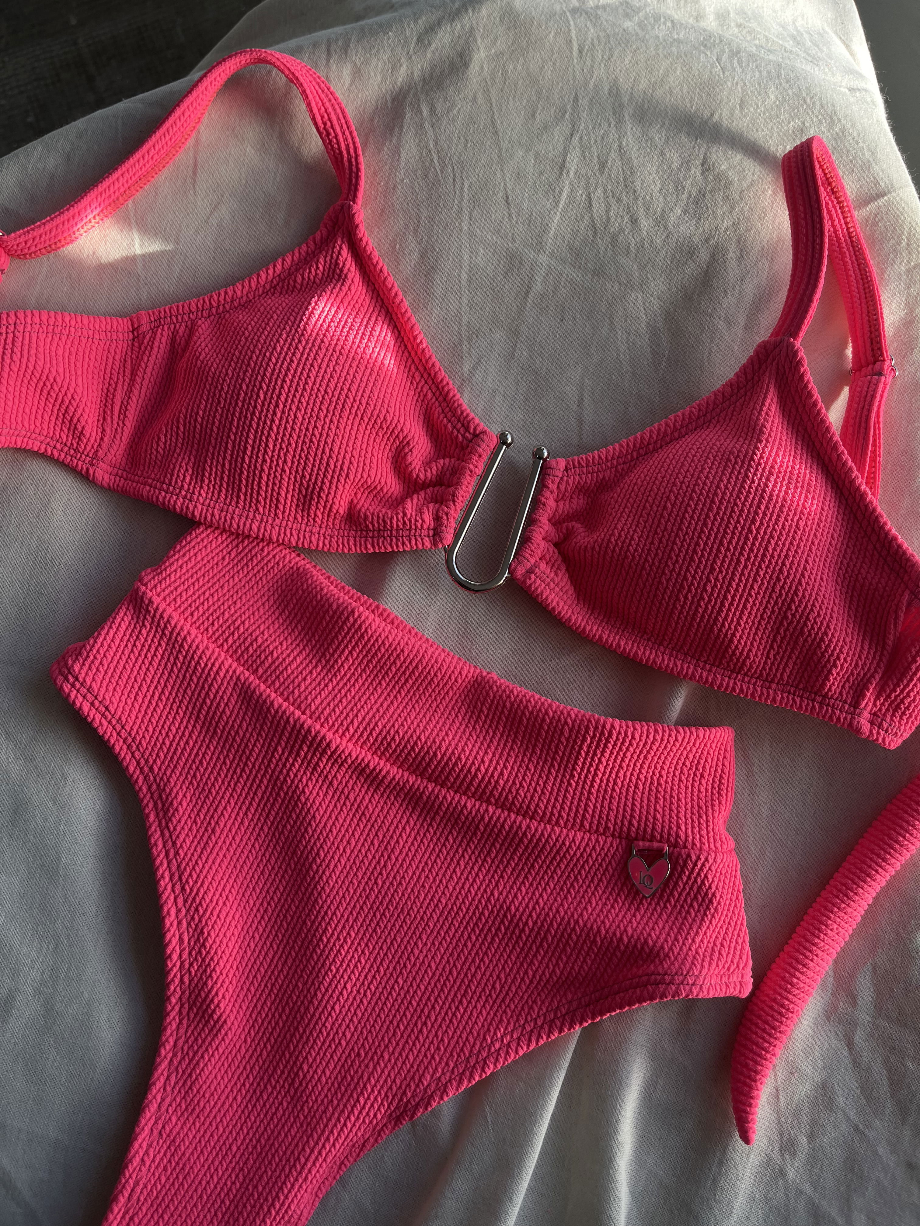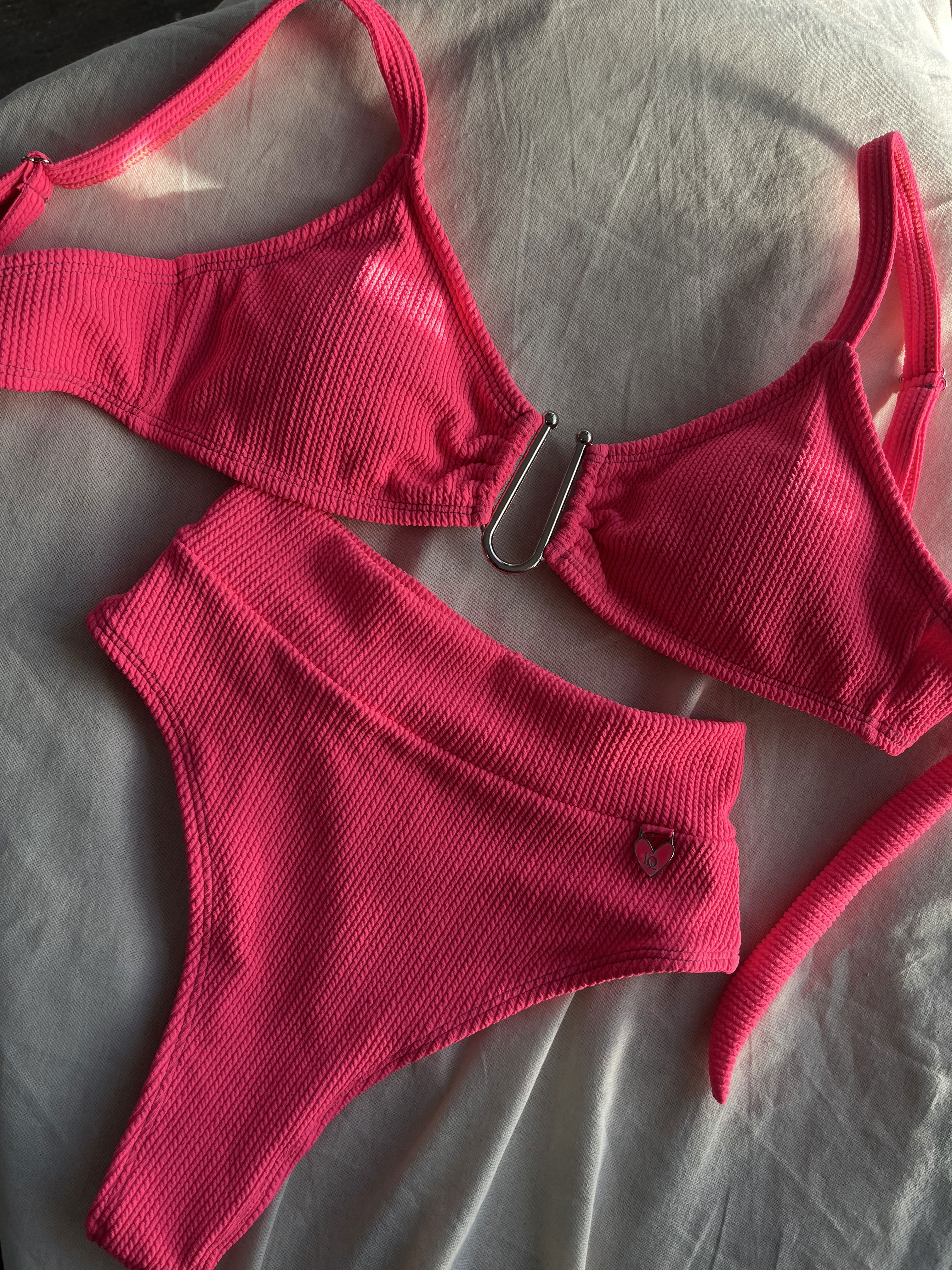 Top texturado con herraje, breteles regulables y espalda para atar.