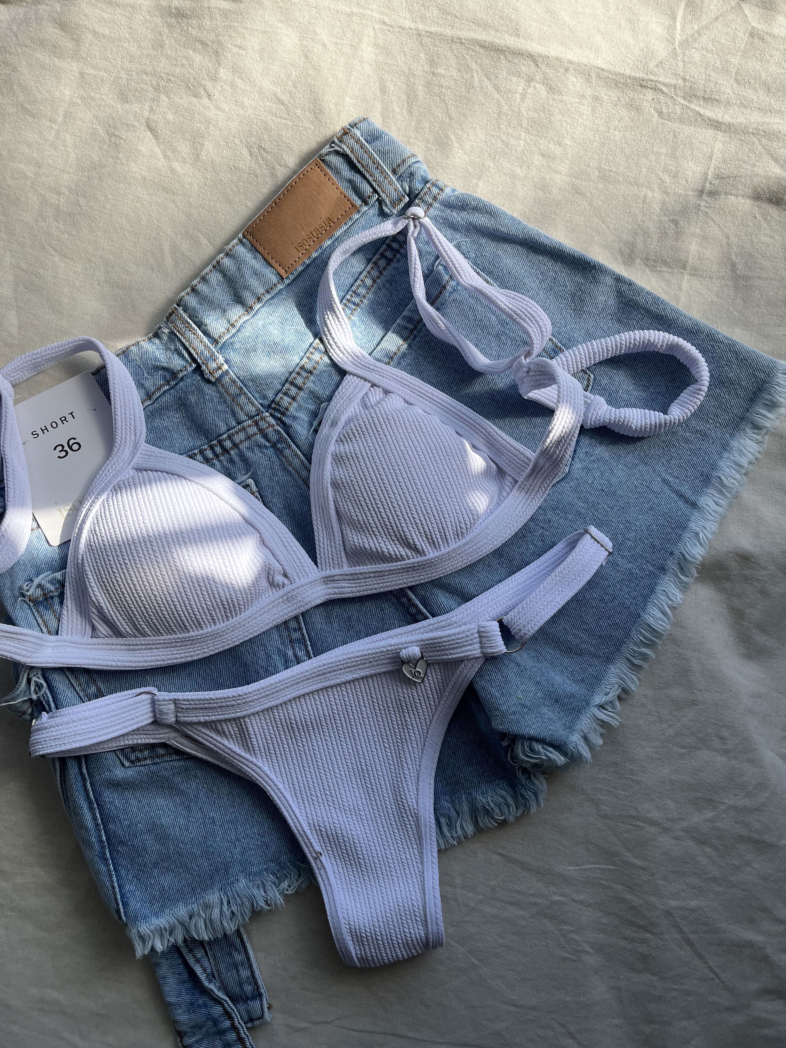 Triángulo texturado. Corpiño con breteles regulables y espalda para atar. Colaless regulable