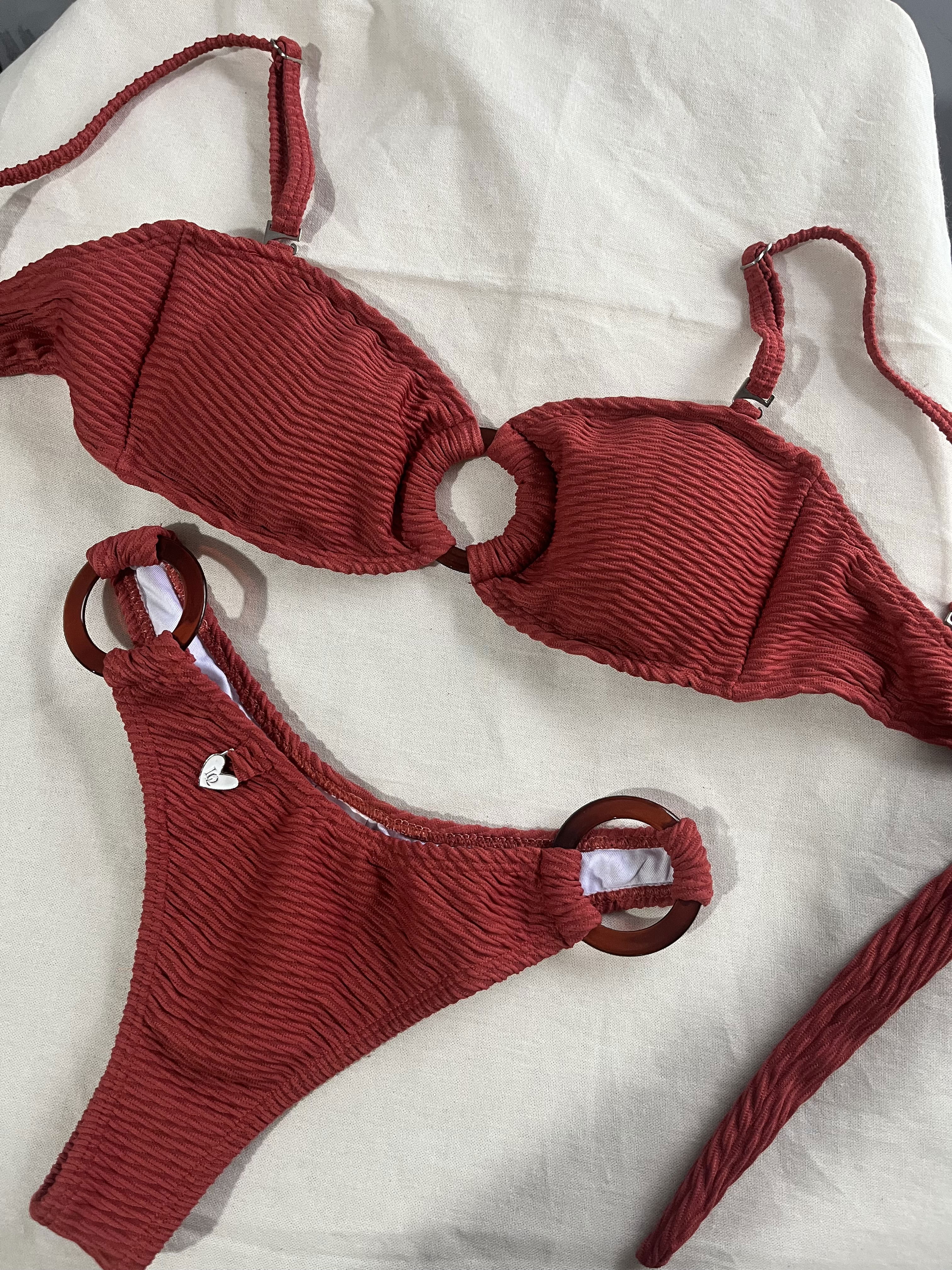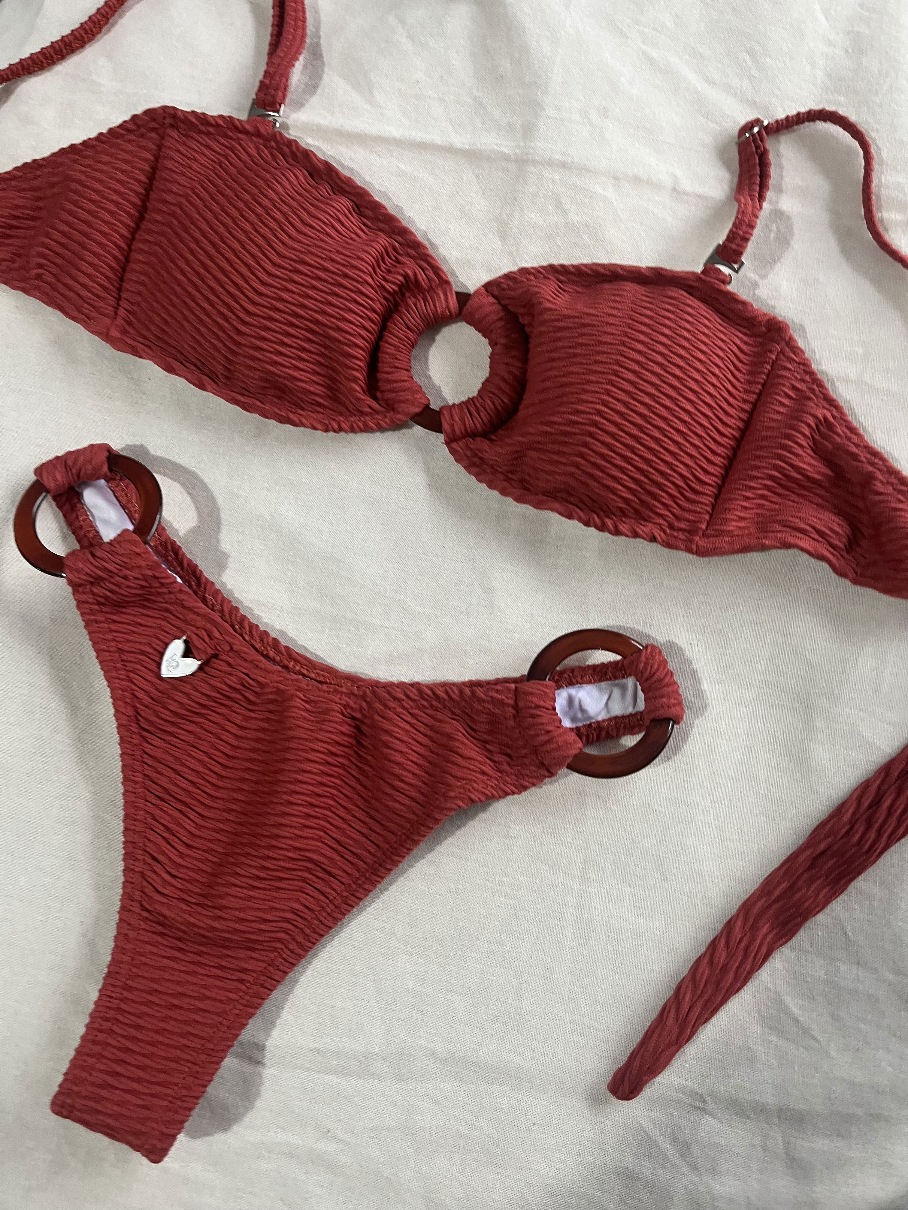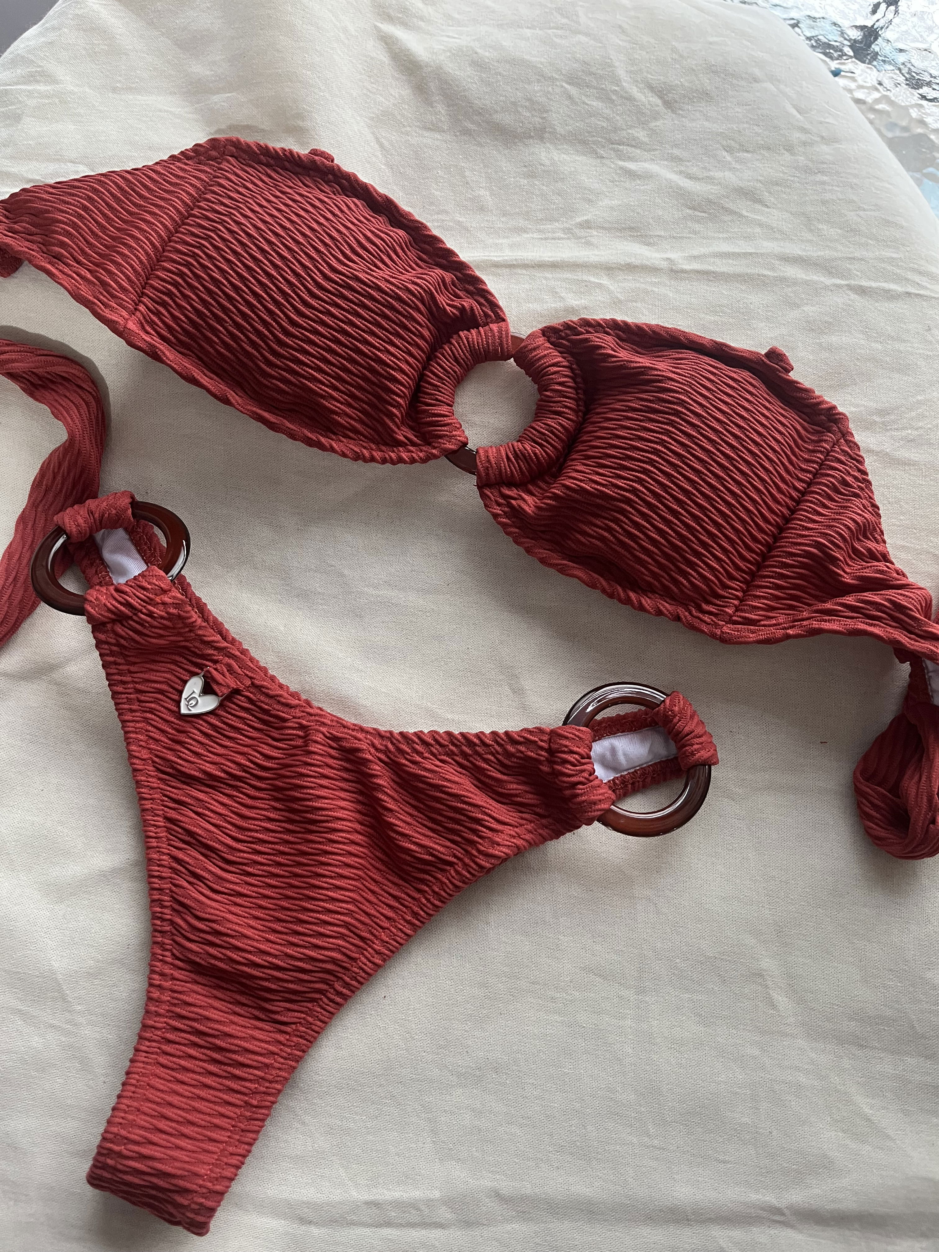 Top straples con argolla Carey , breteles desmontable, regulables y espalda para atar. Colaless con detalle de argollas Carey.