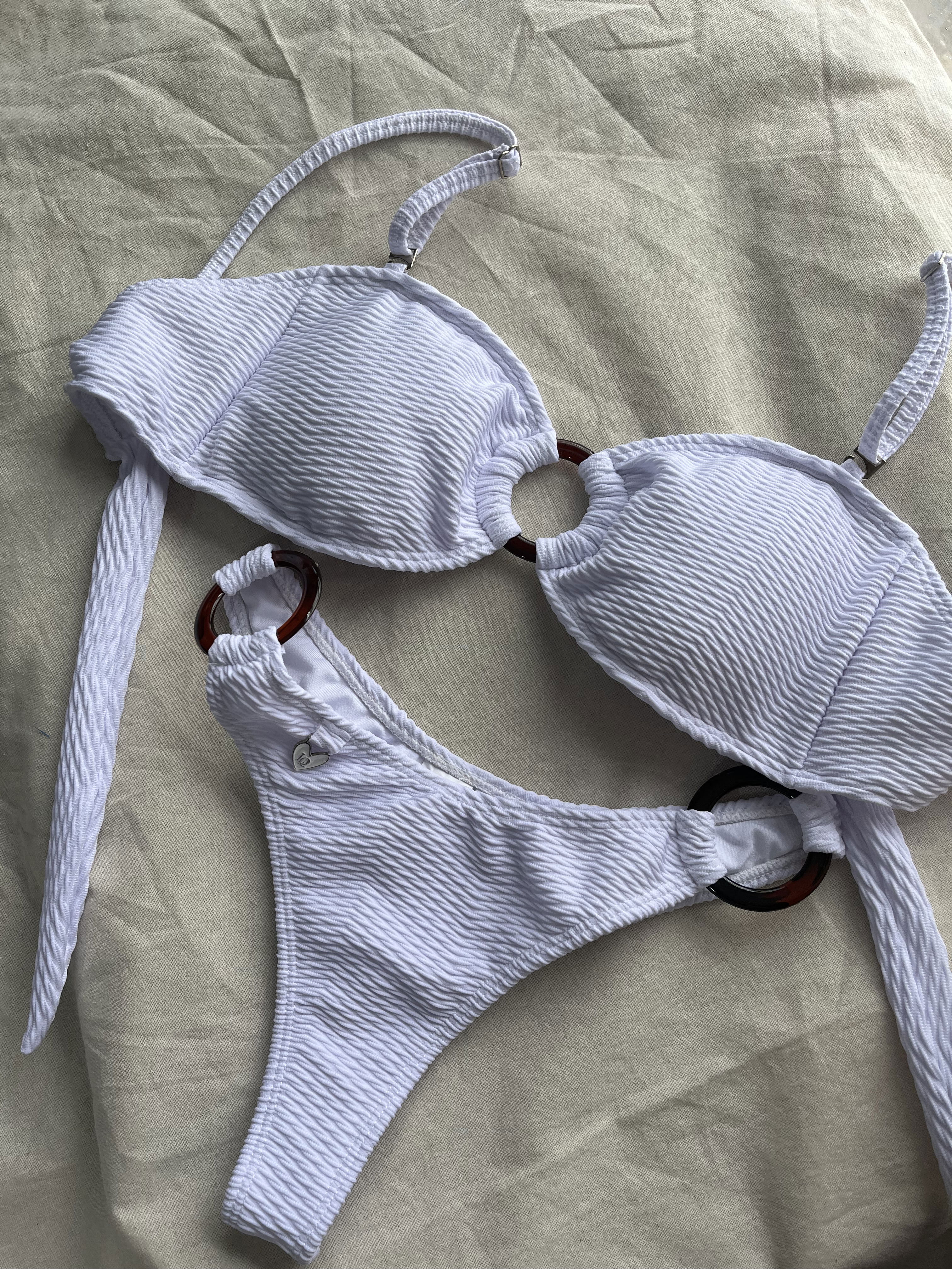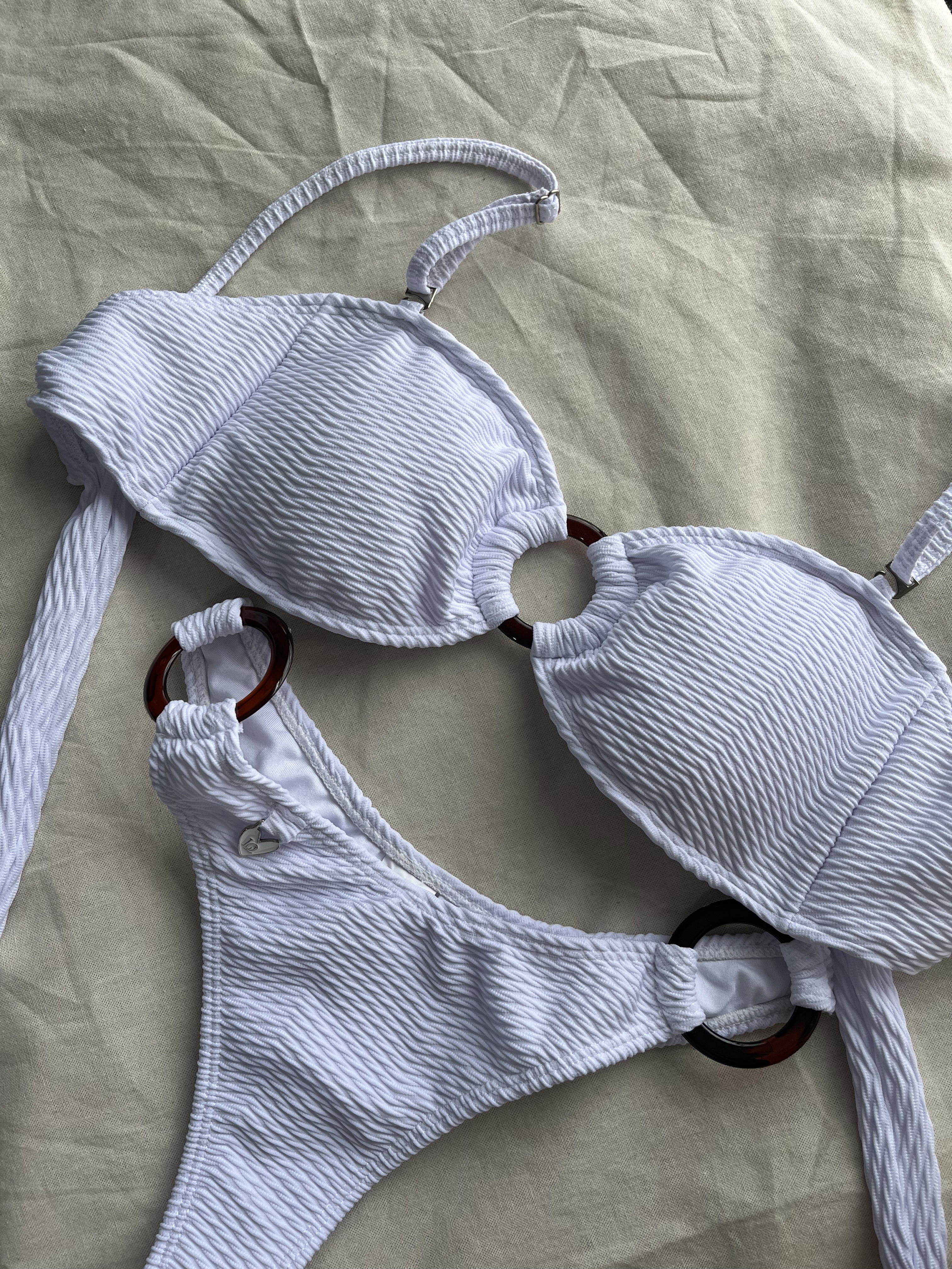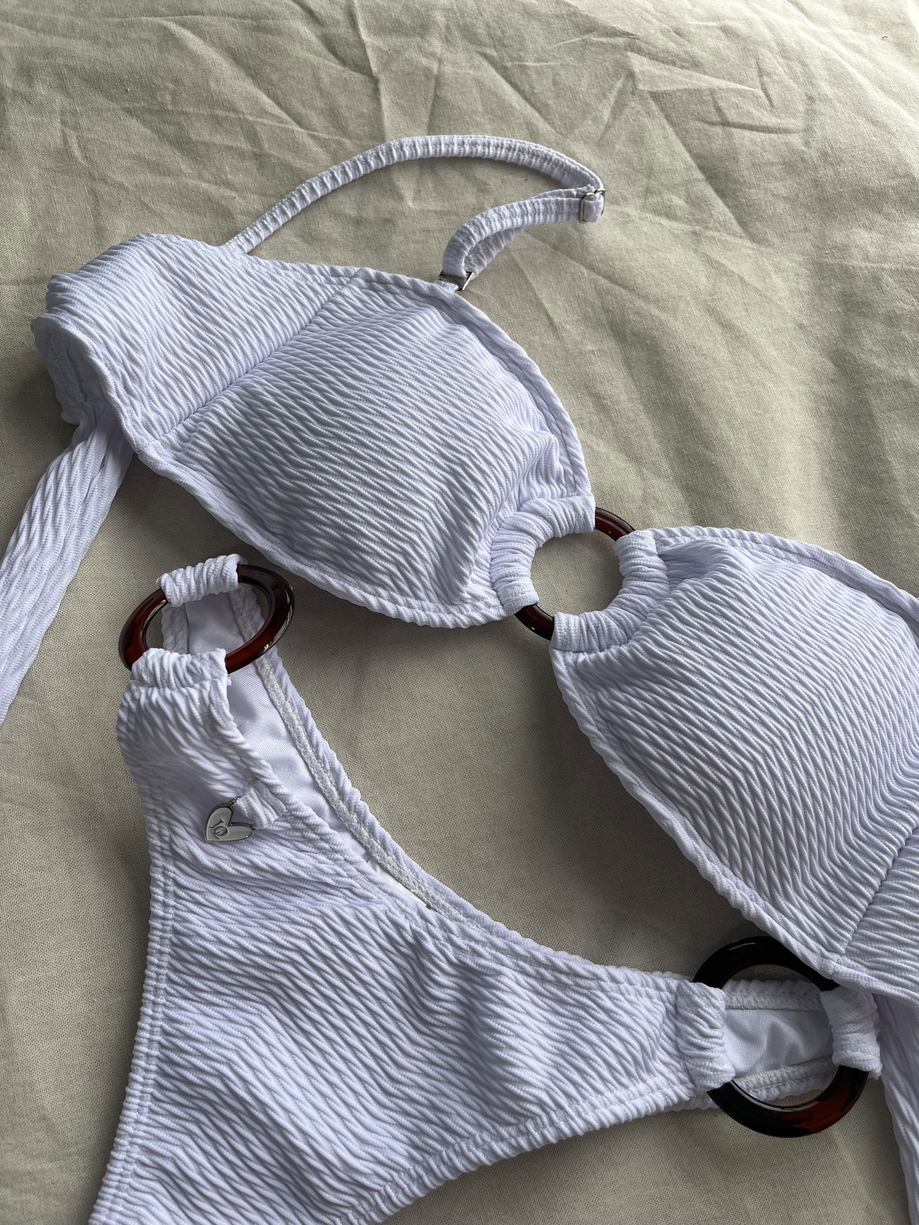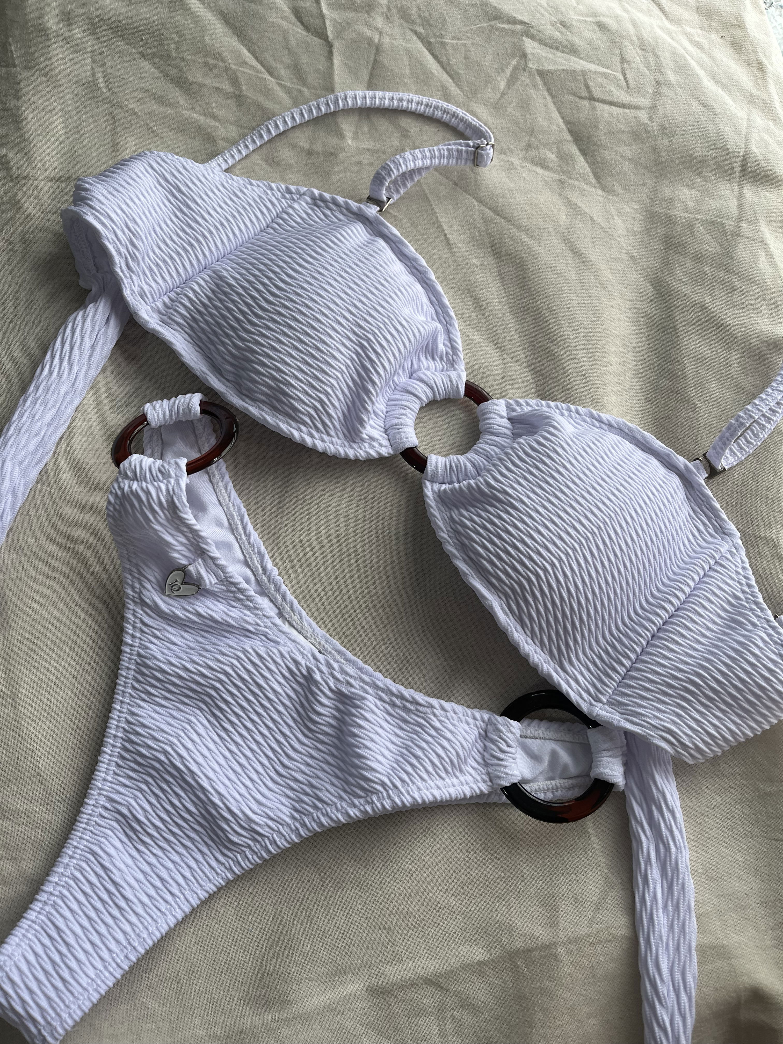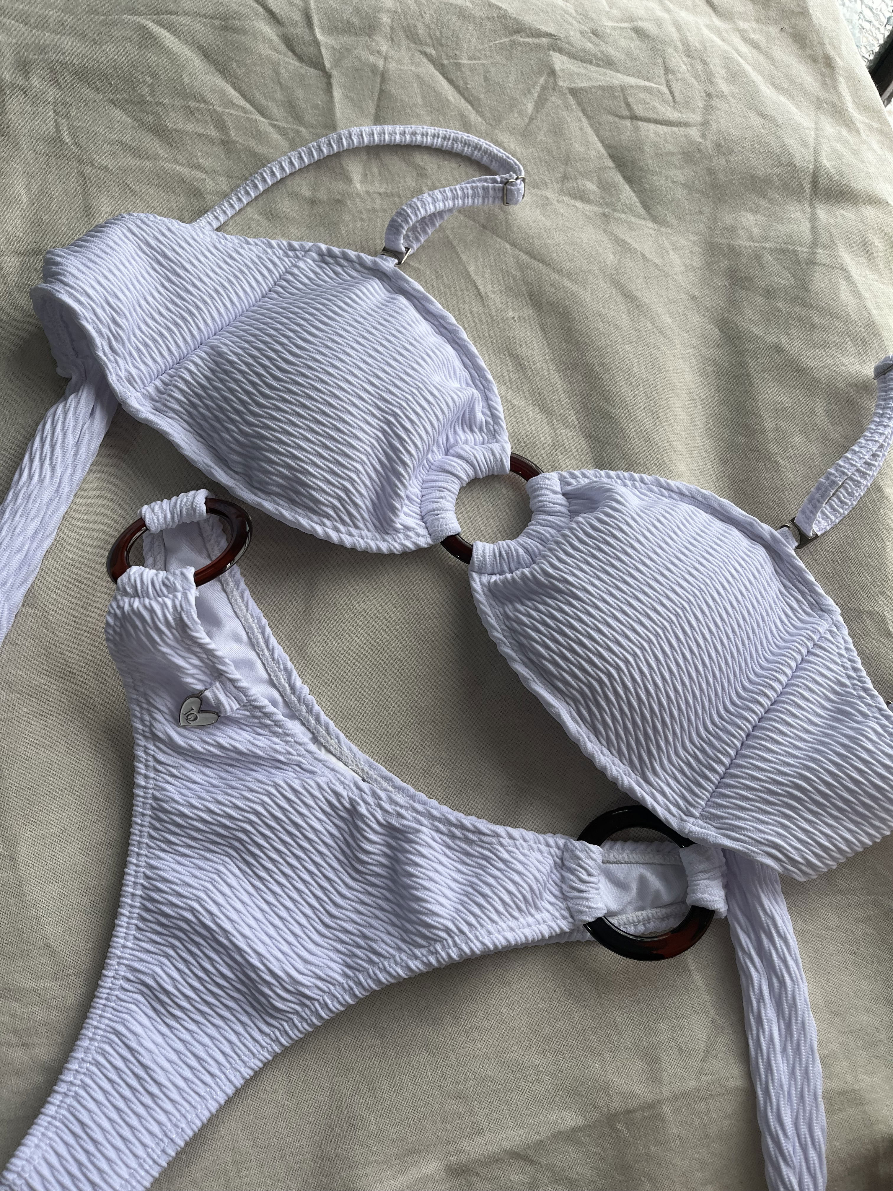 Top straples con argolla Carey , breteles desmontable, regulables y espalda para atar. Colaless con detalle de argollas Carey.