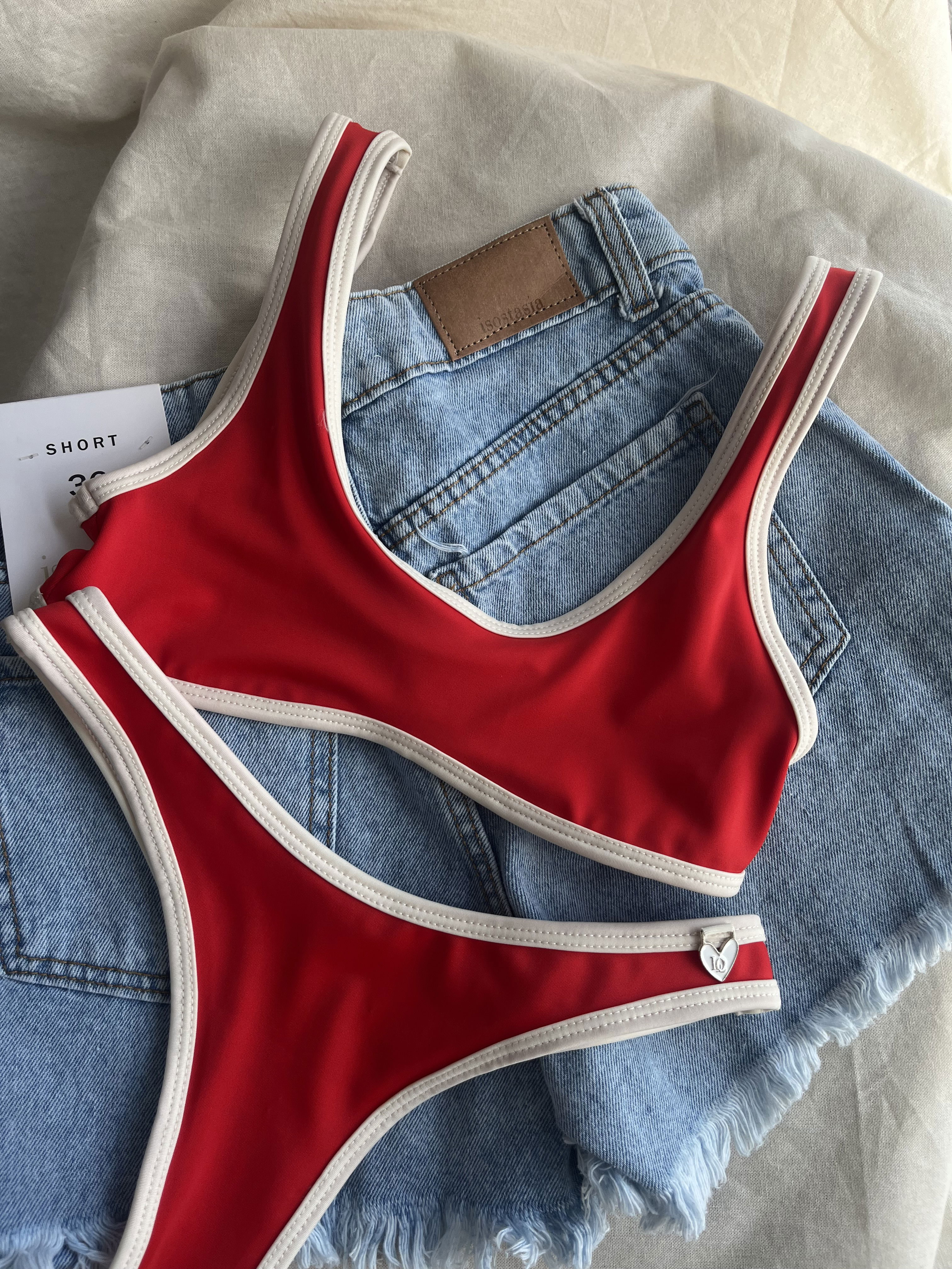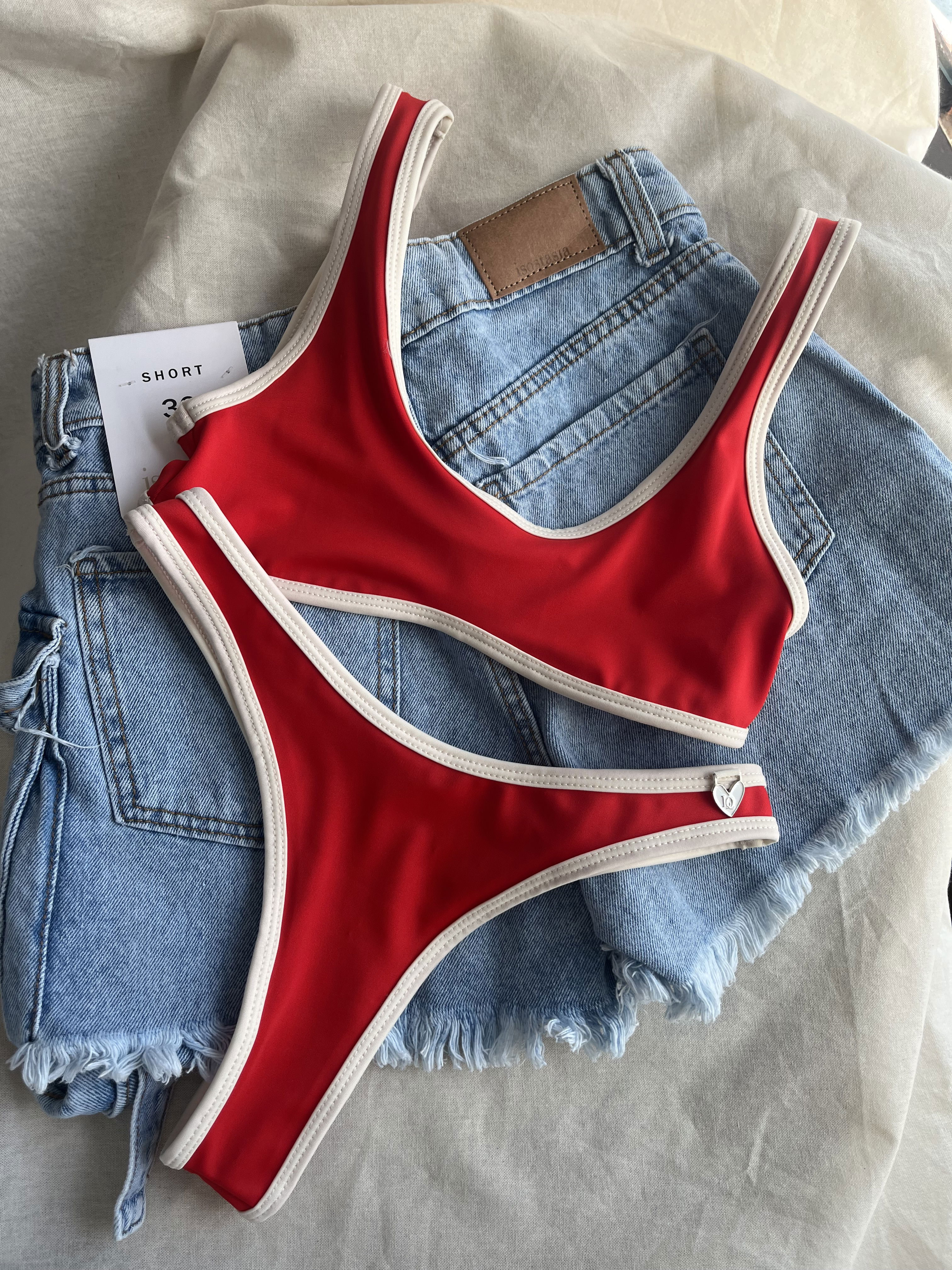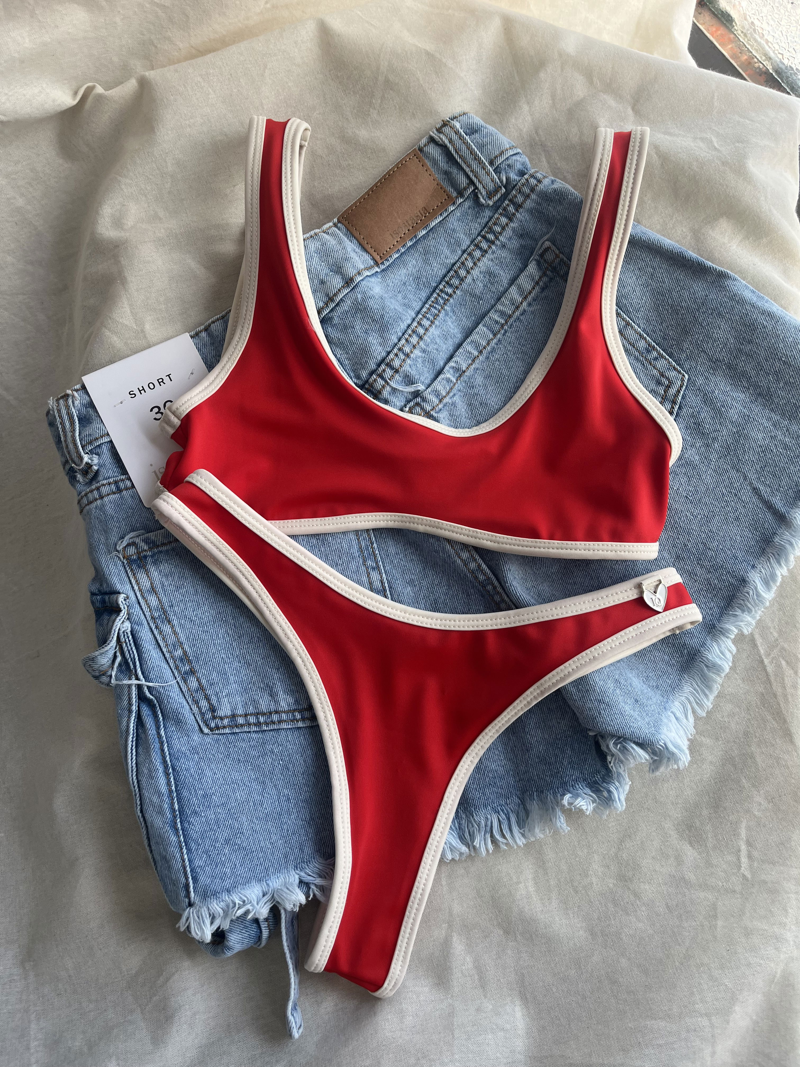 Top entero y bombacha colaless con vivo crema. Corpiño con doble forreria y abertura para poner rellenitos