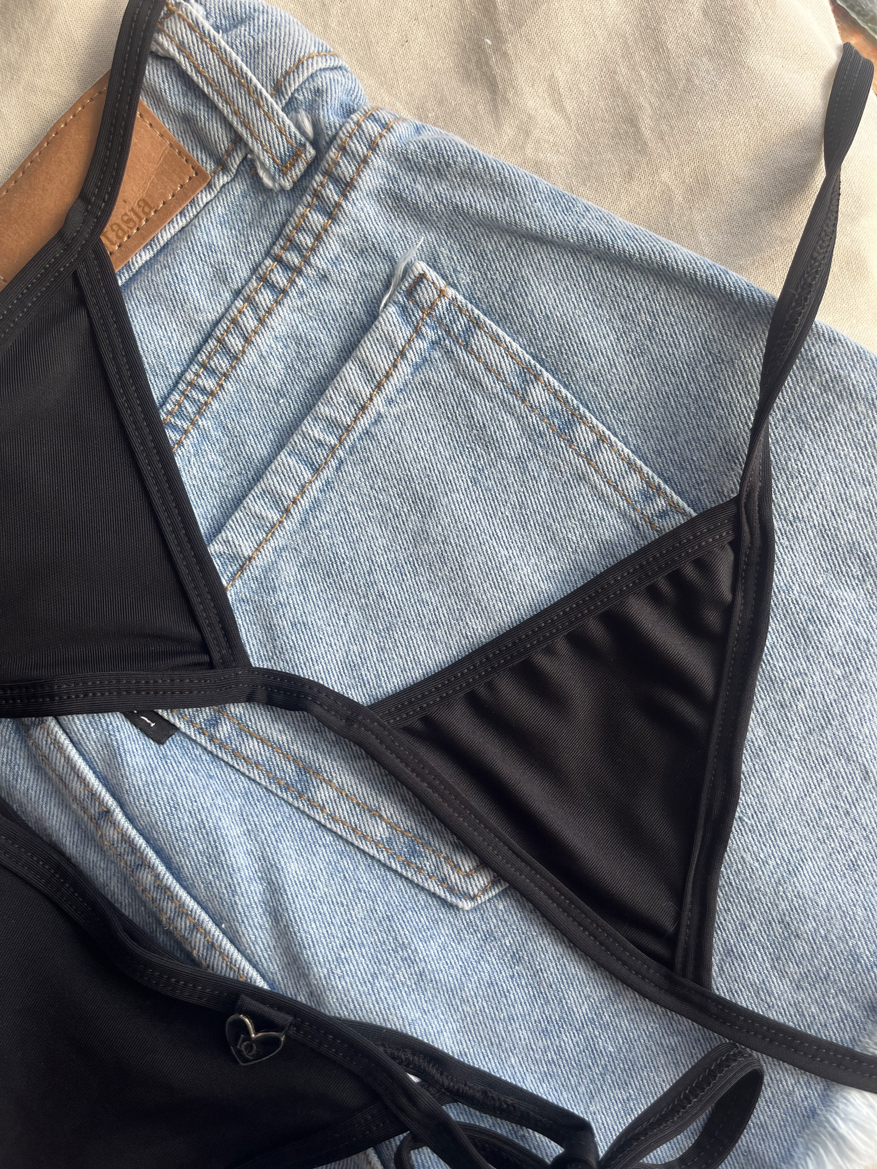 Triángulo fijo del estilo "micro bikini" y colaless con tiras para para atar. Este modelo no trae tazas desmontables y no tiene el hueco para agregarle.