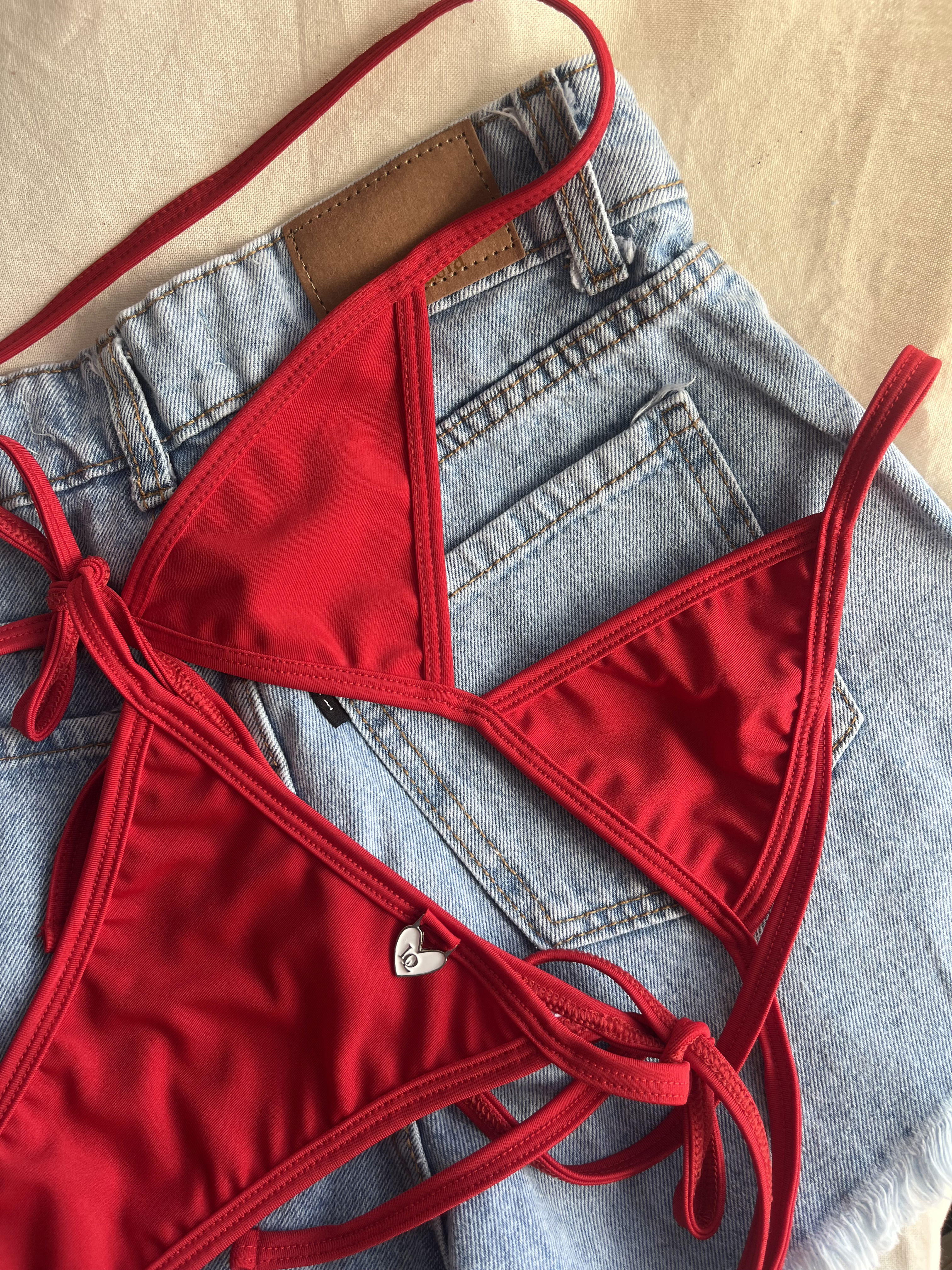 Triángulo fijo del estilo "micro bikini" y colaless con tiras para para atar. Este modelo no trae tazas desmontables y no tiene el hueco para agregarle.