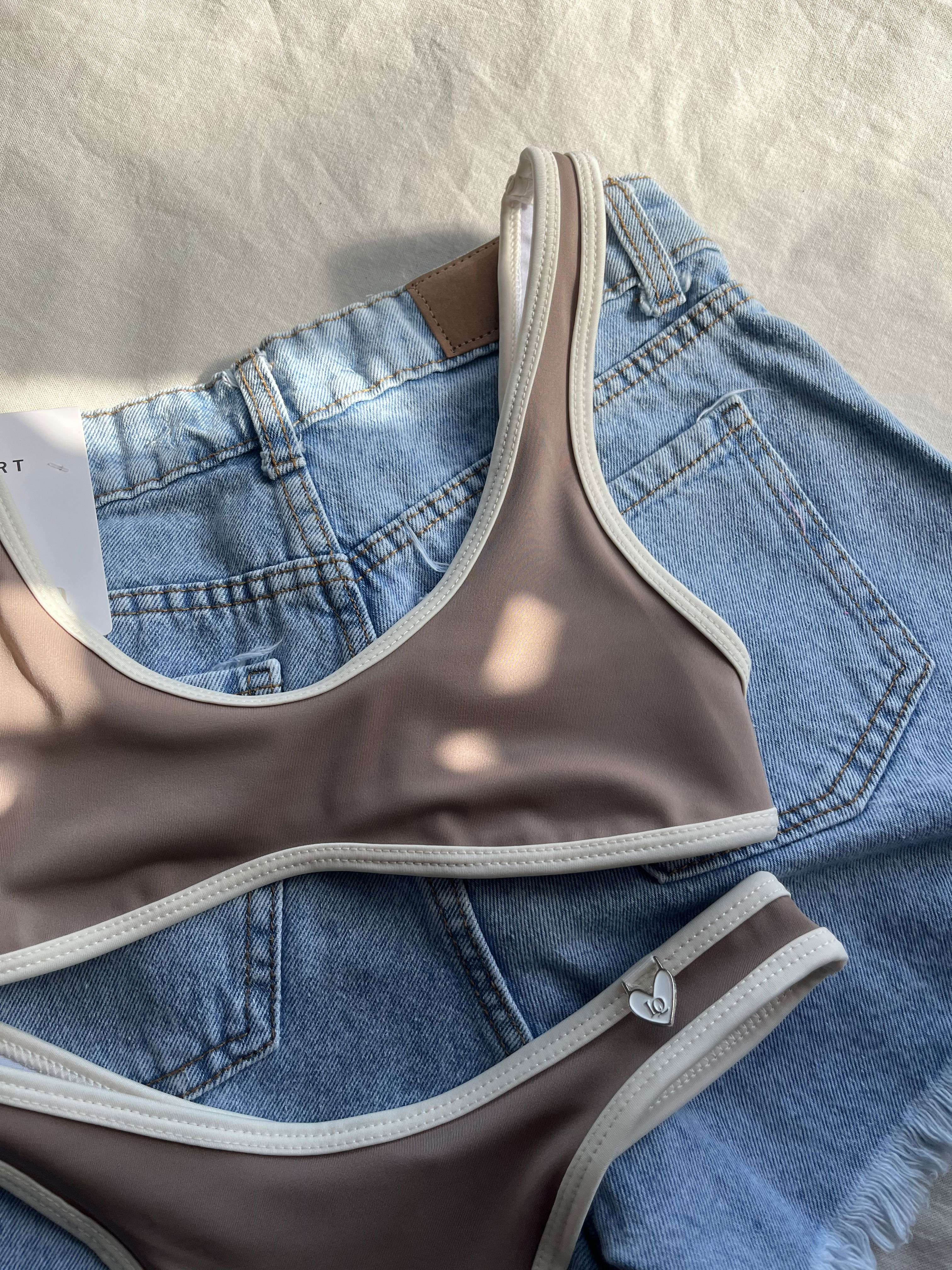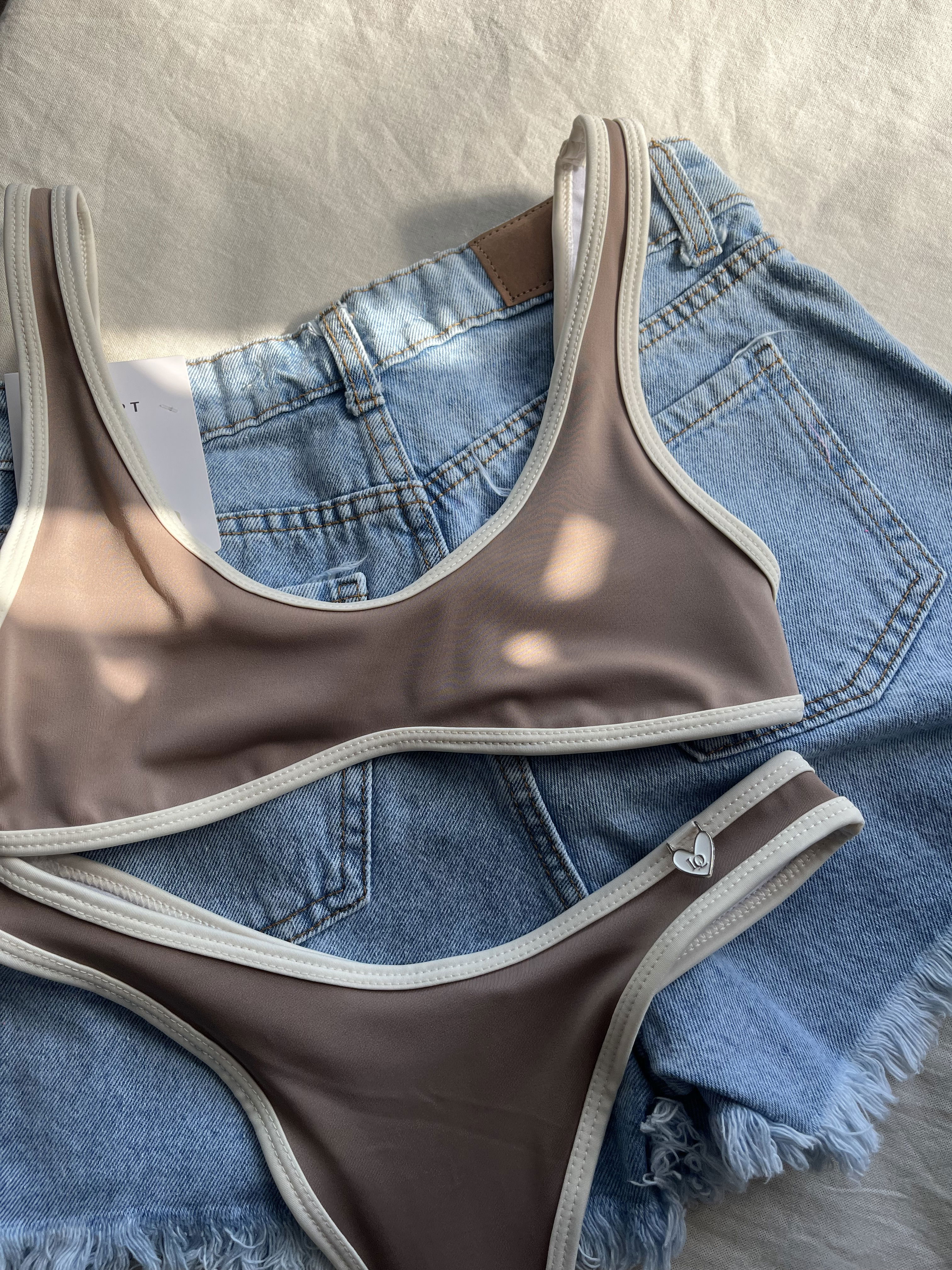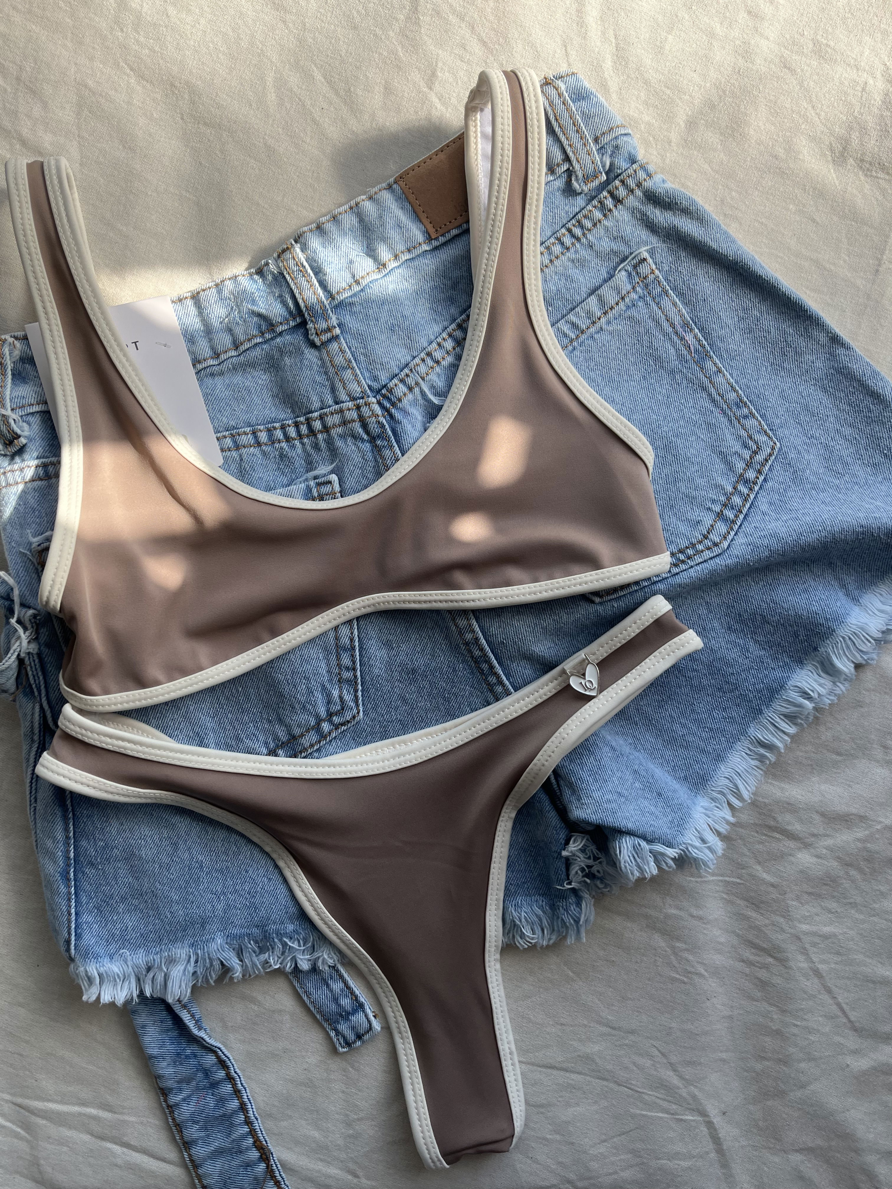 Top entero y bombacha colaless con vivo crema. Corpiño con doble forreria y abertura para poner rellenitos