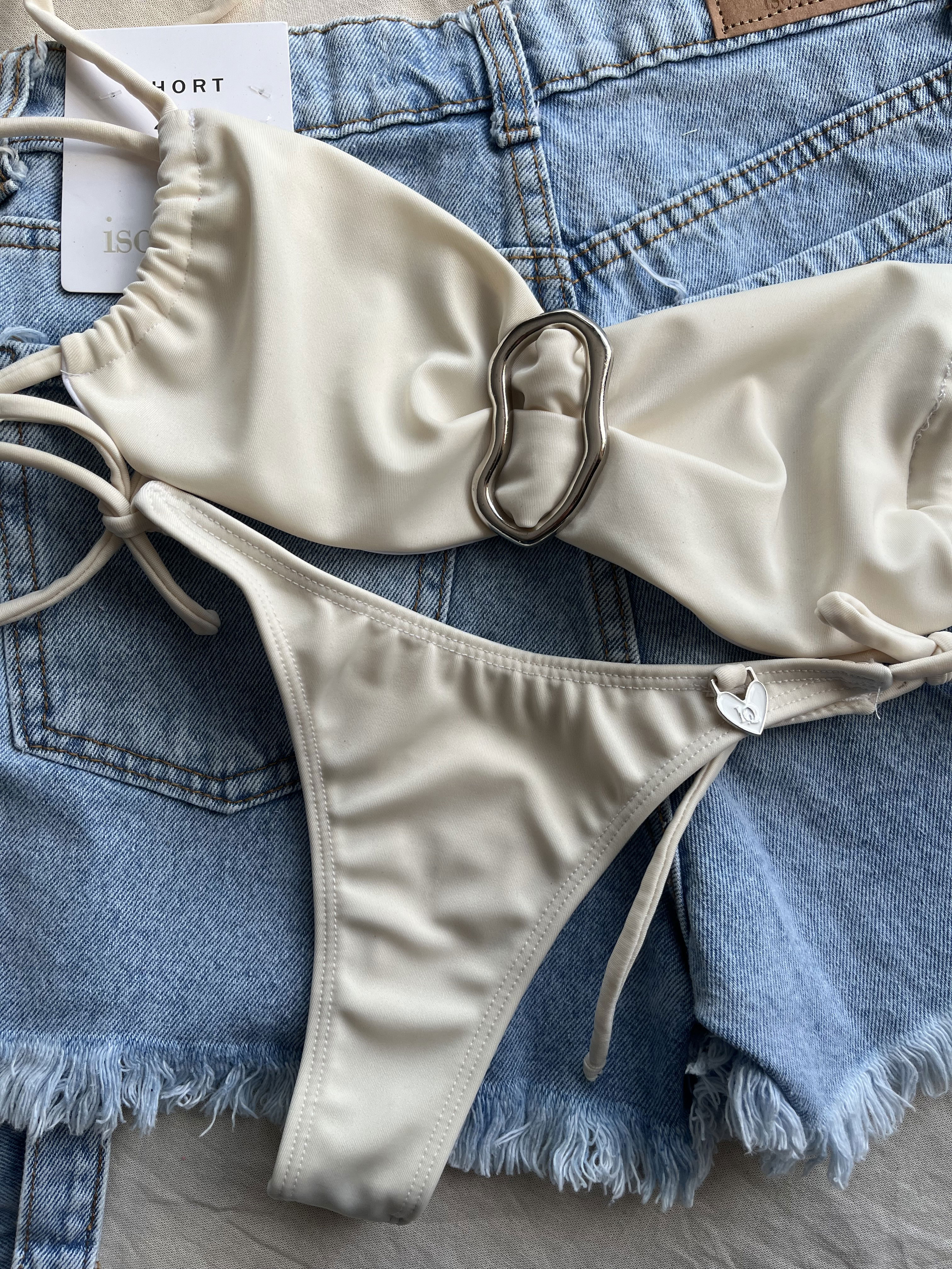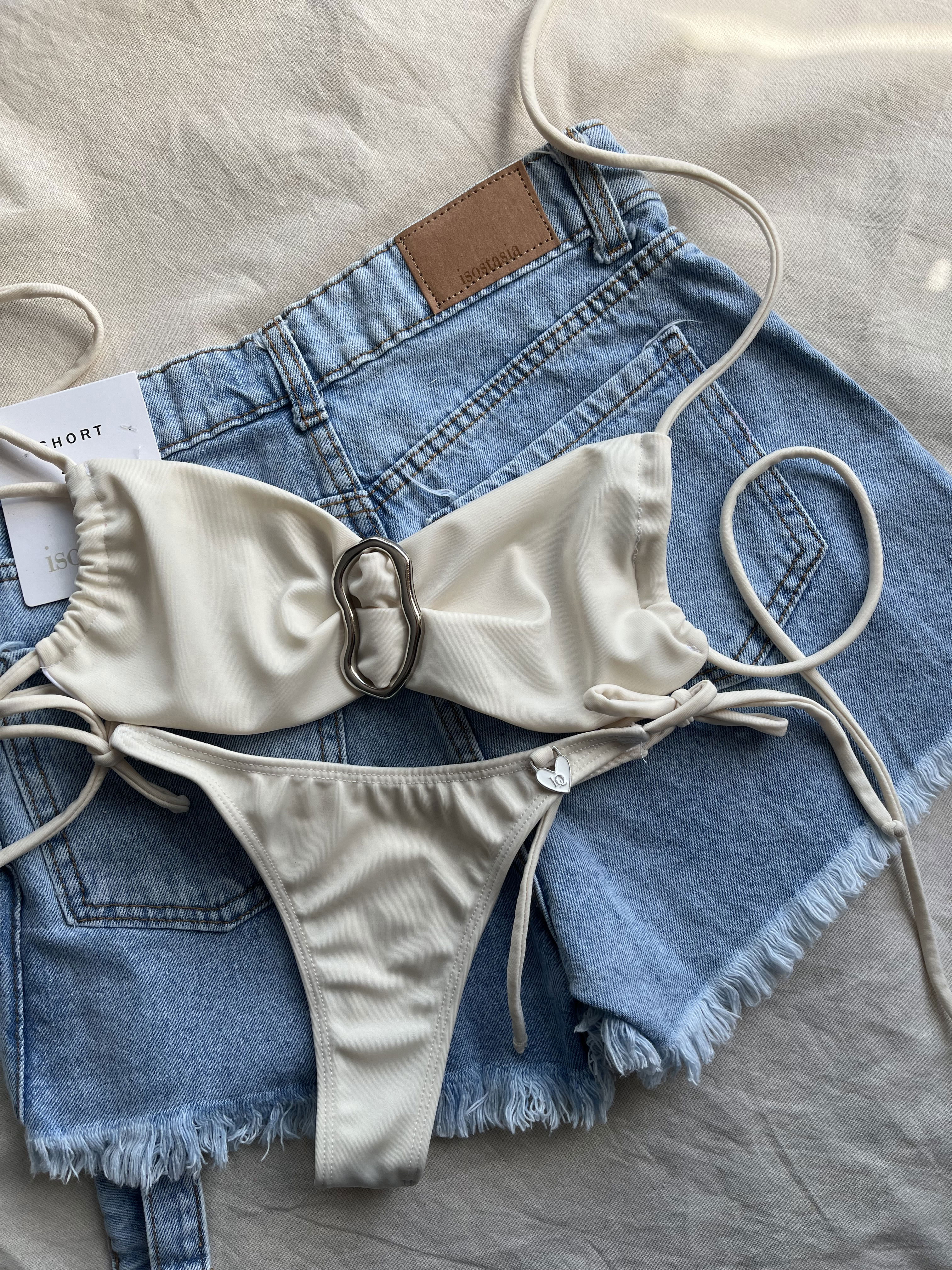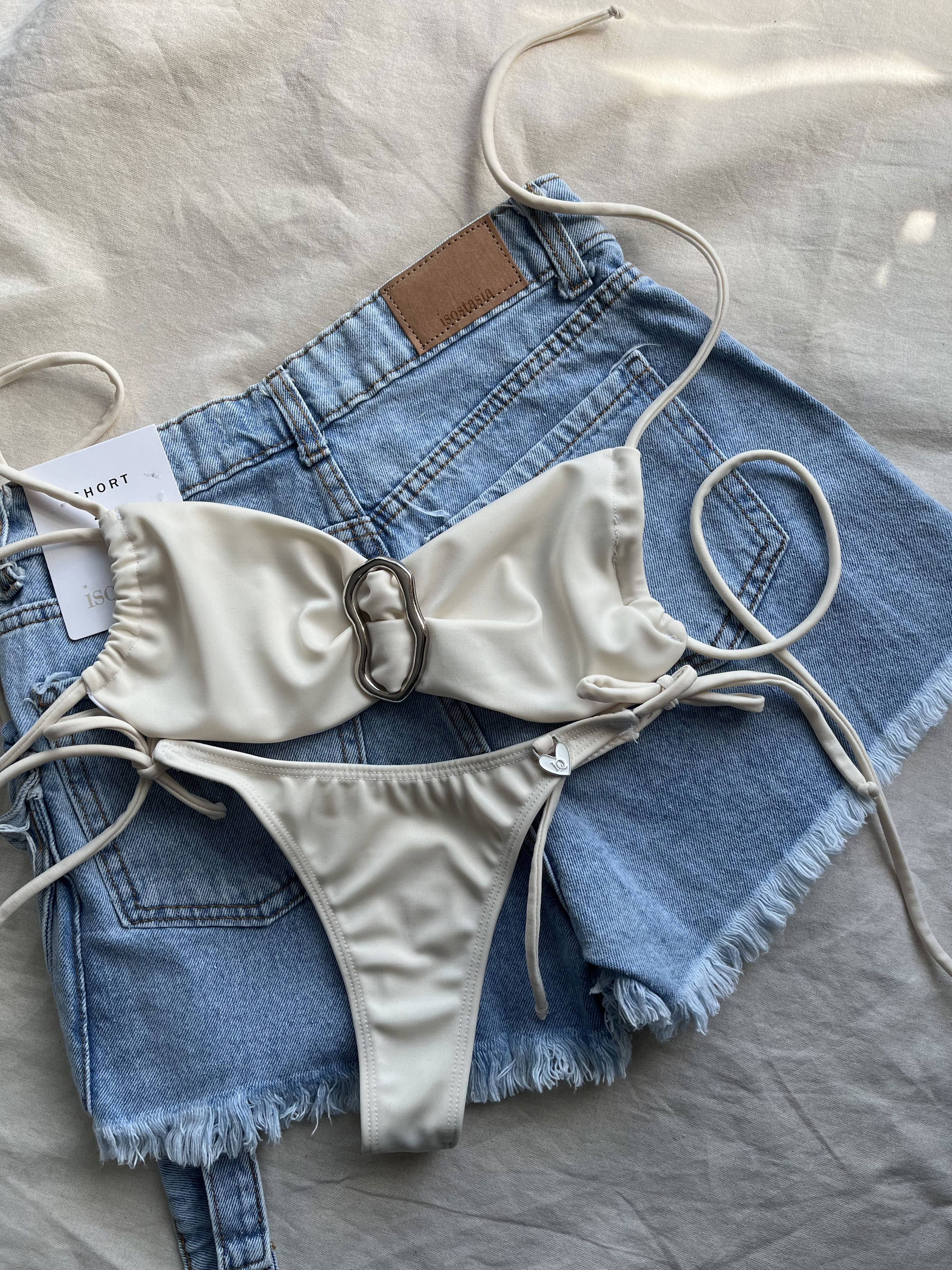 Top con detalle de avío irregular , tiras a los costados para atar.