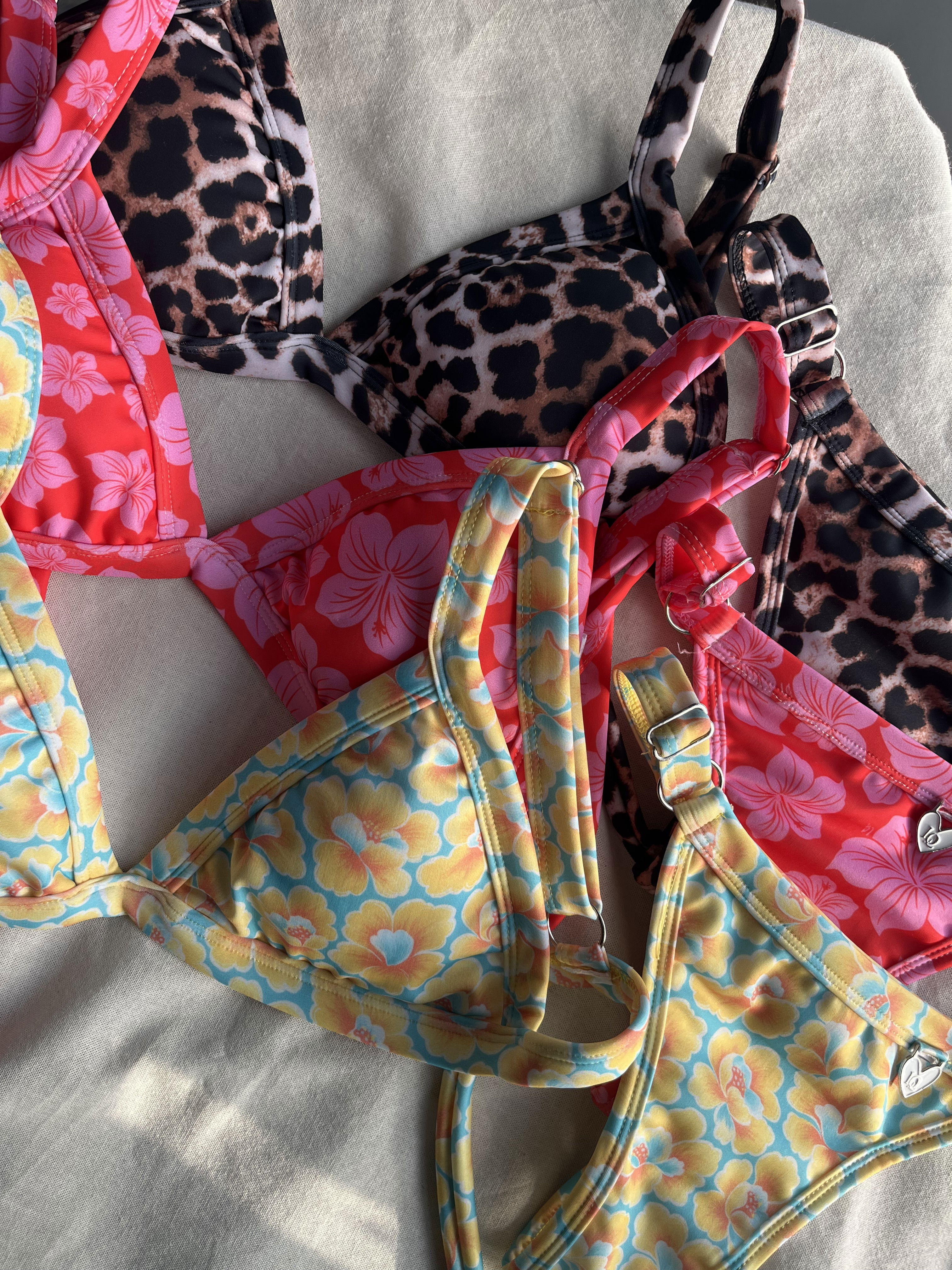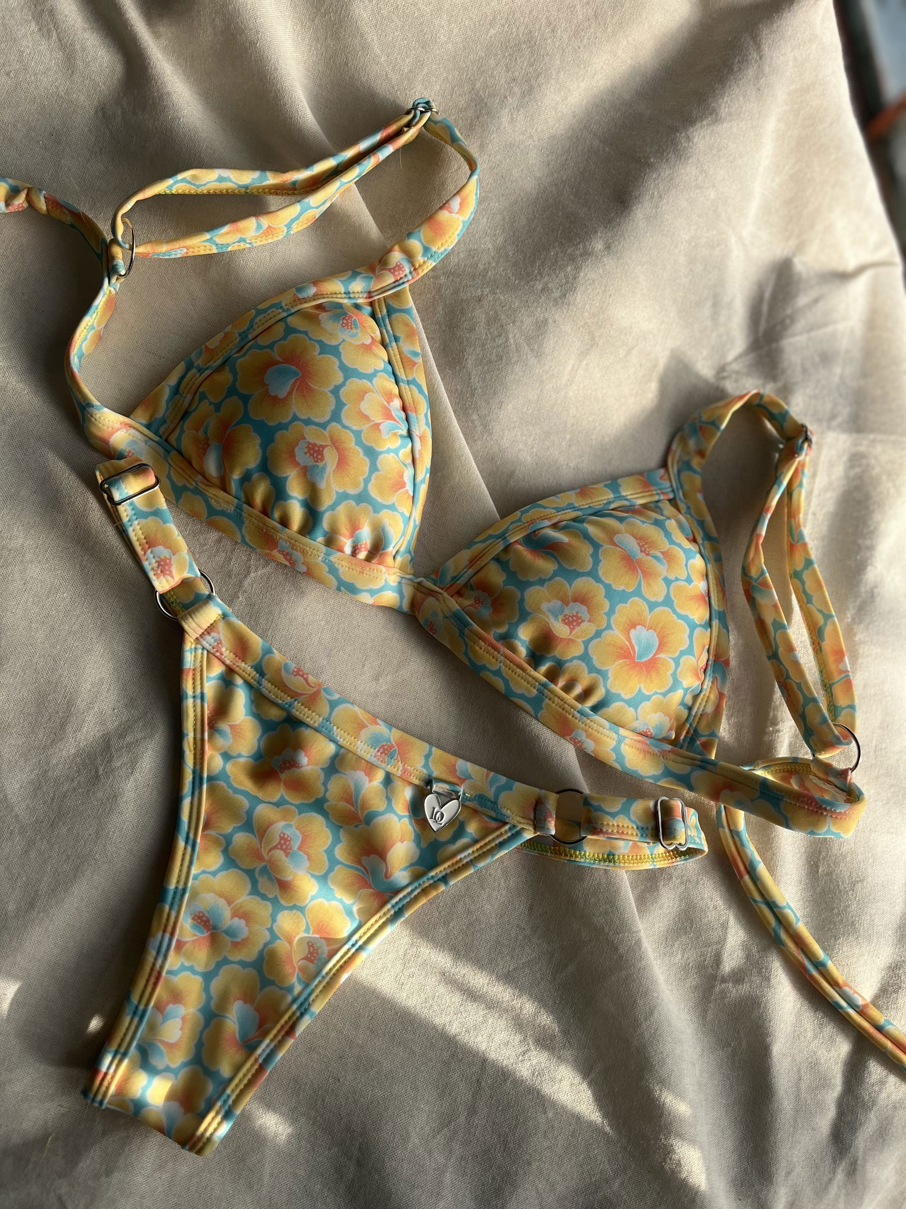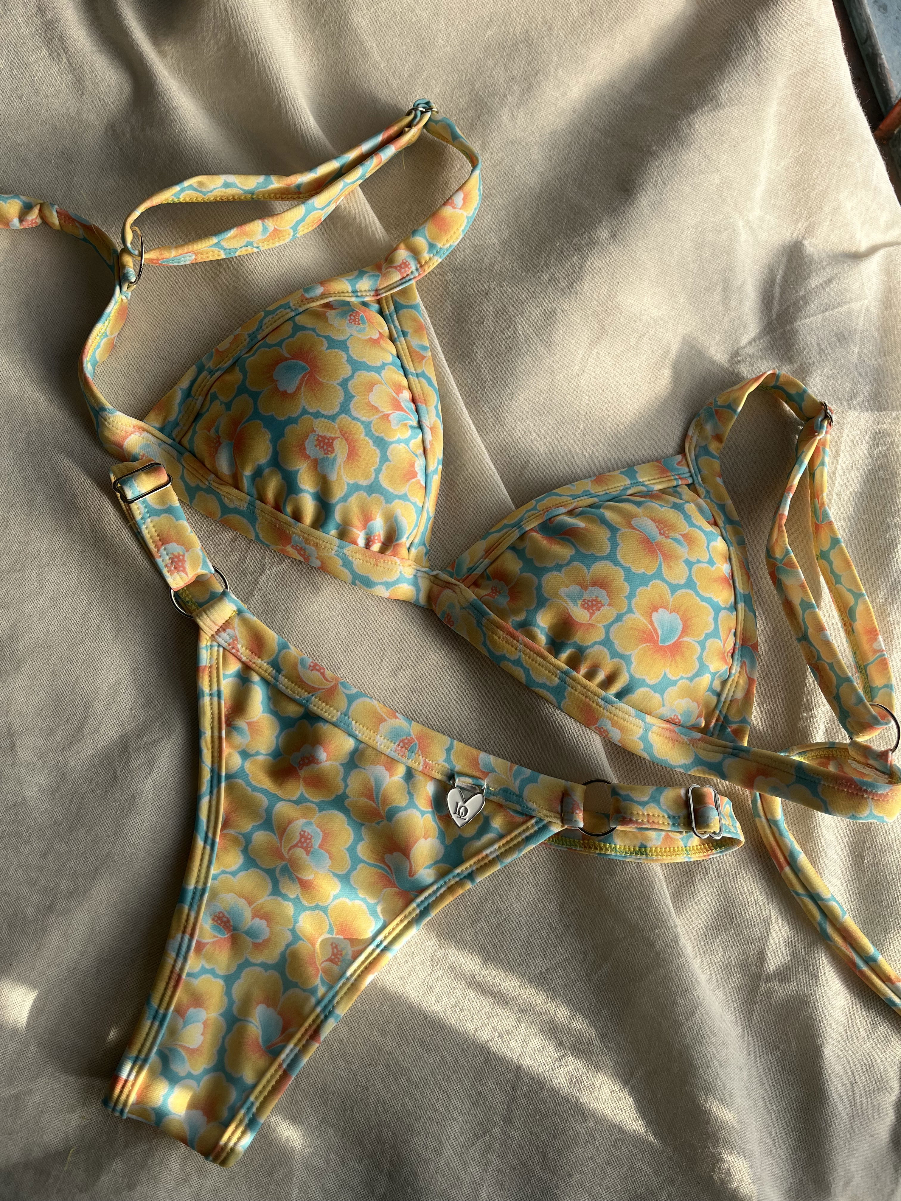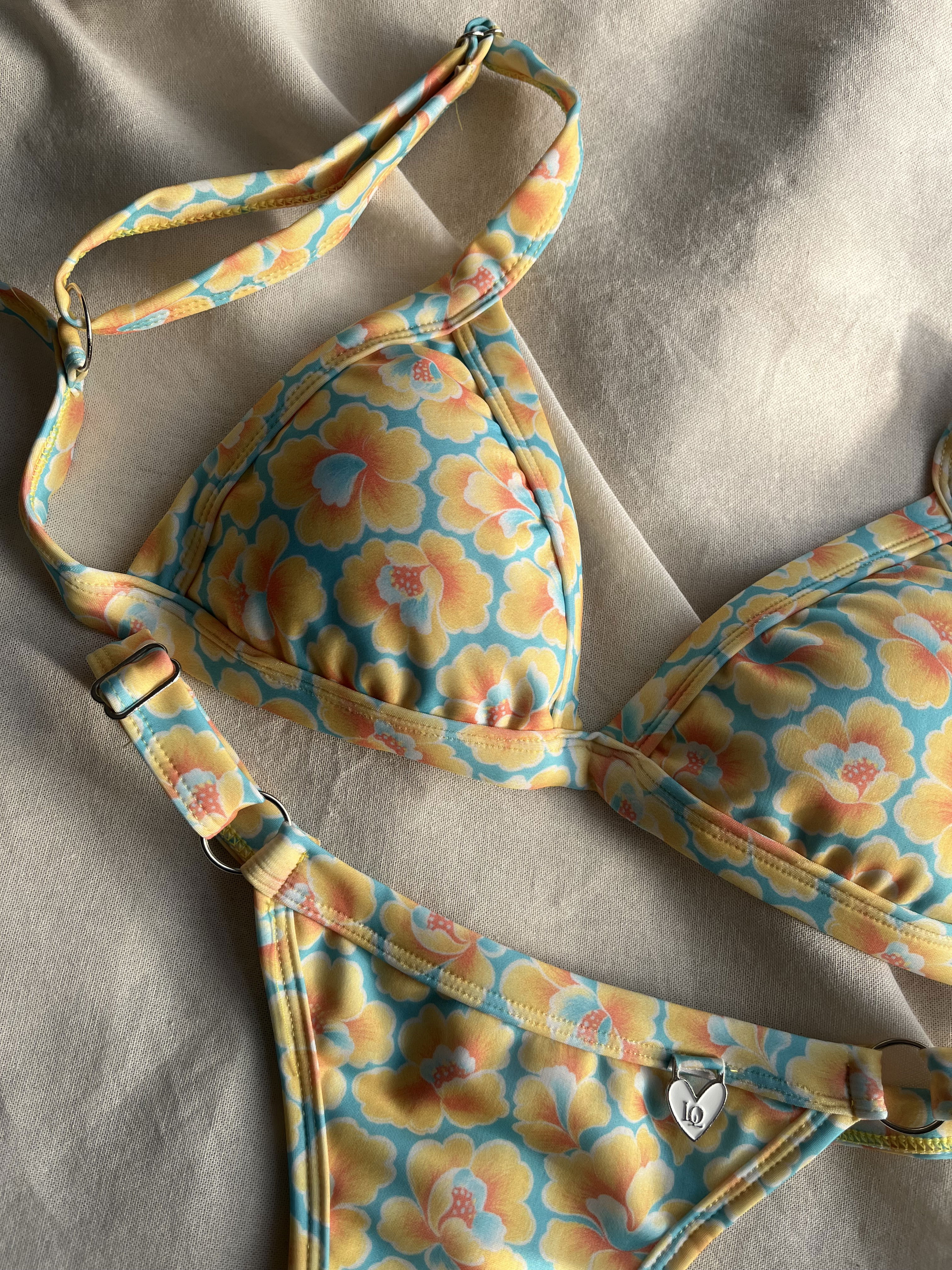 Triángulo lycra tricot estampado. Corpiño con breteles regulables y espalda para atar. Colaless regulable