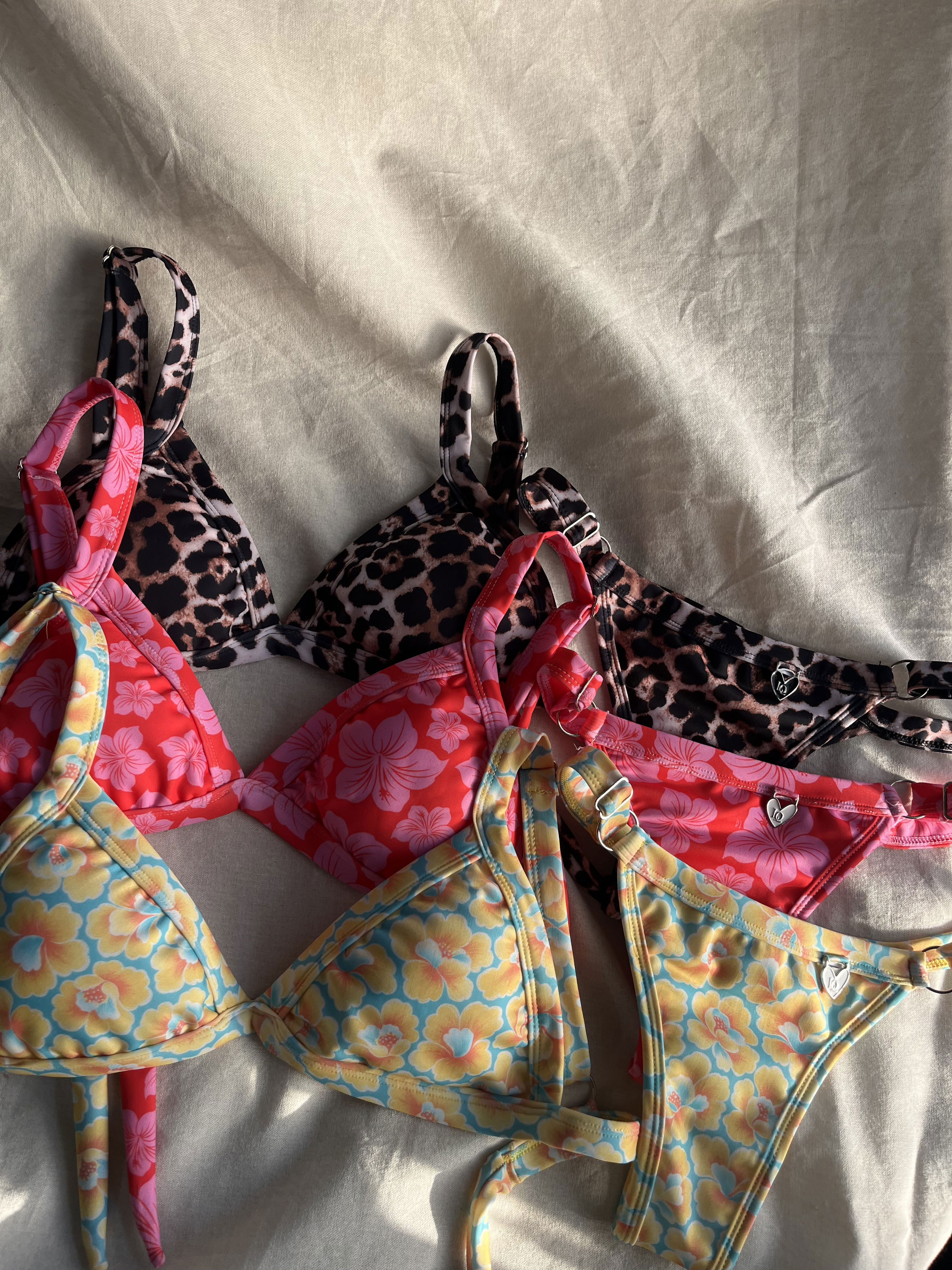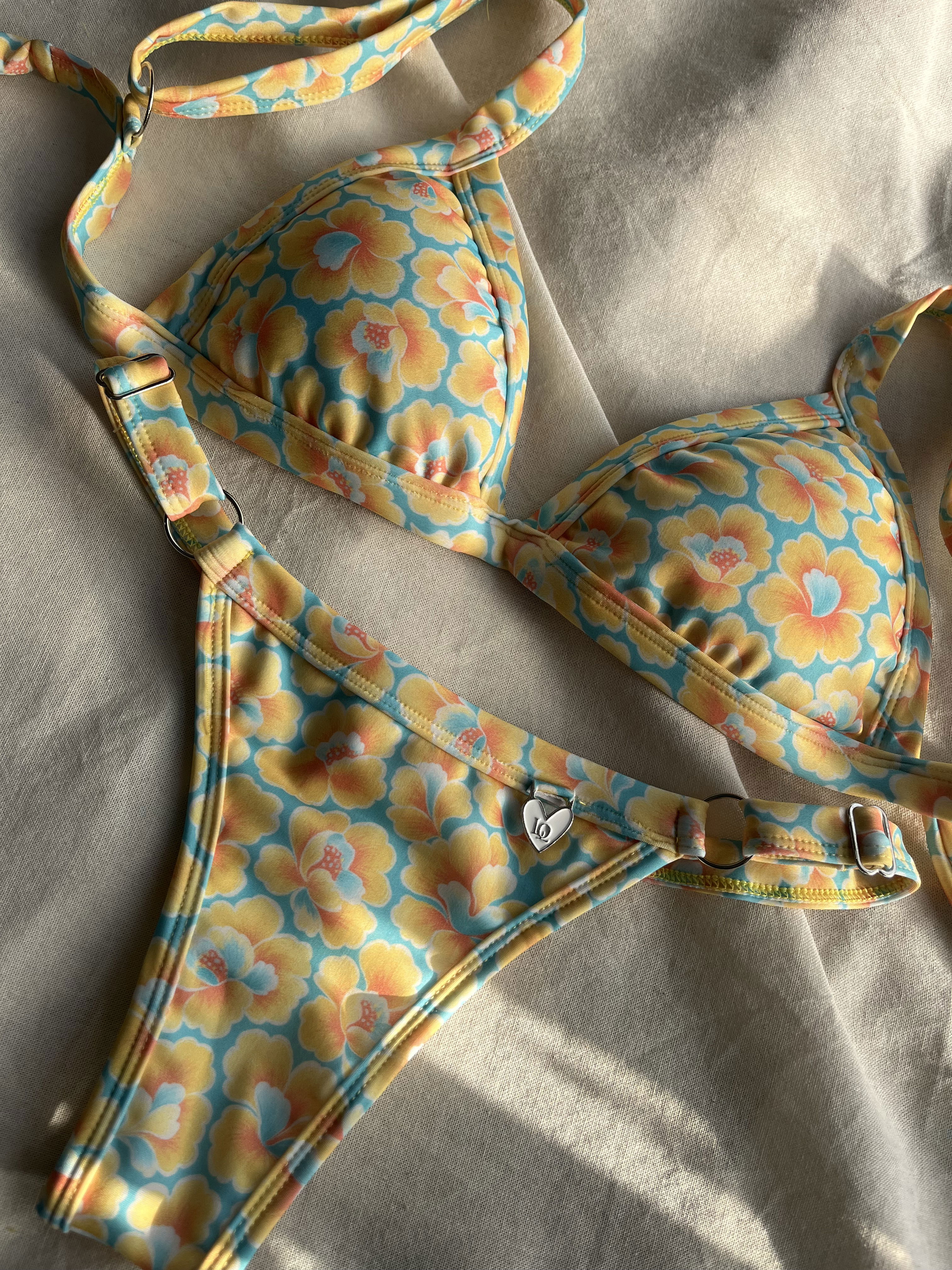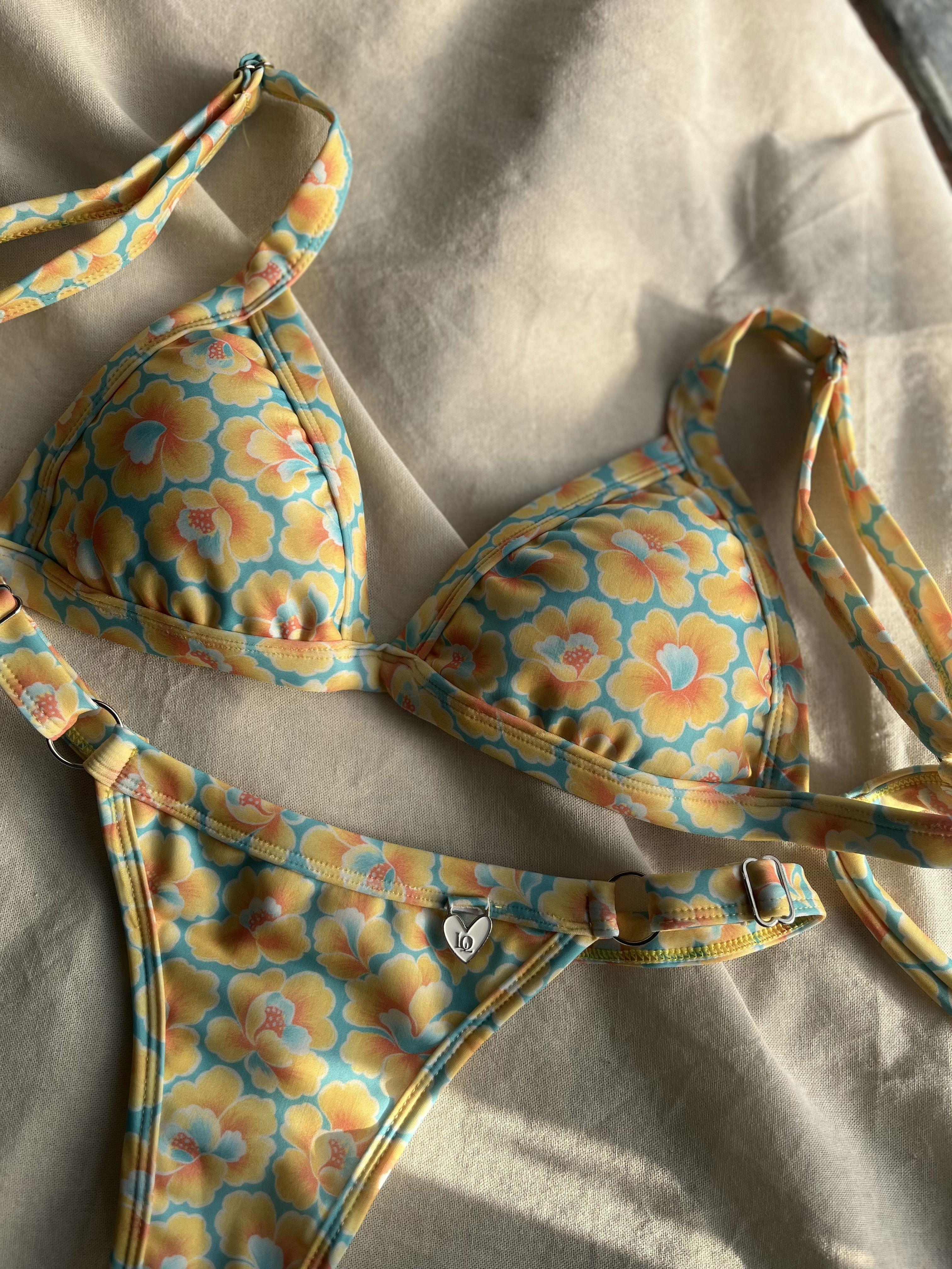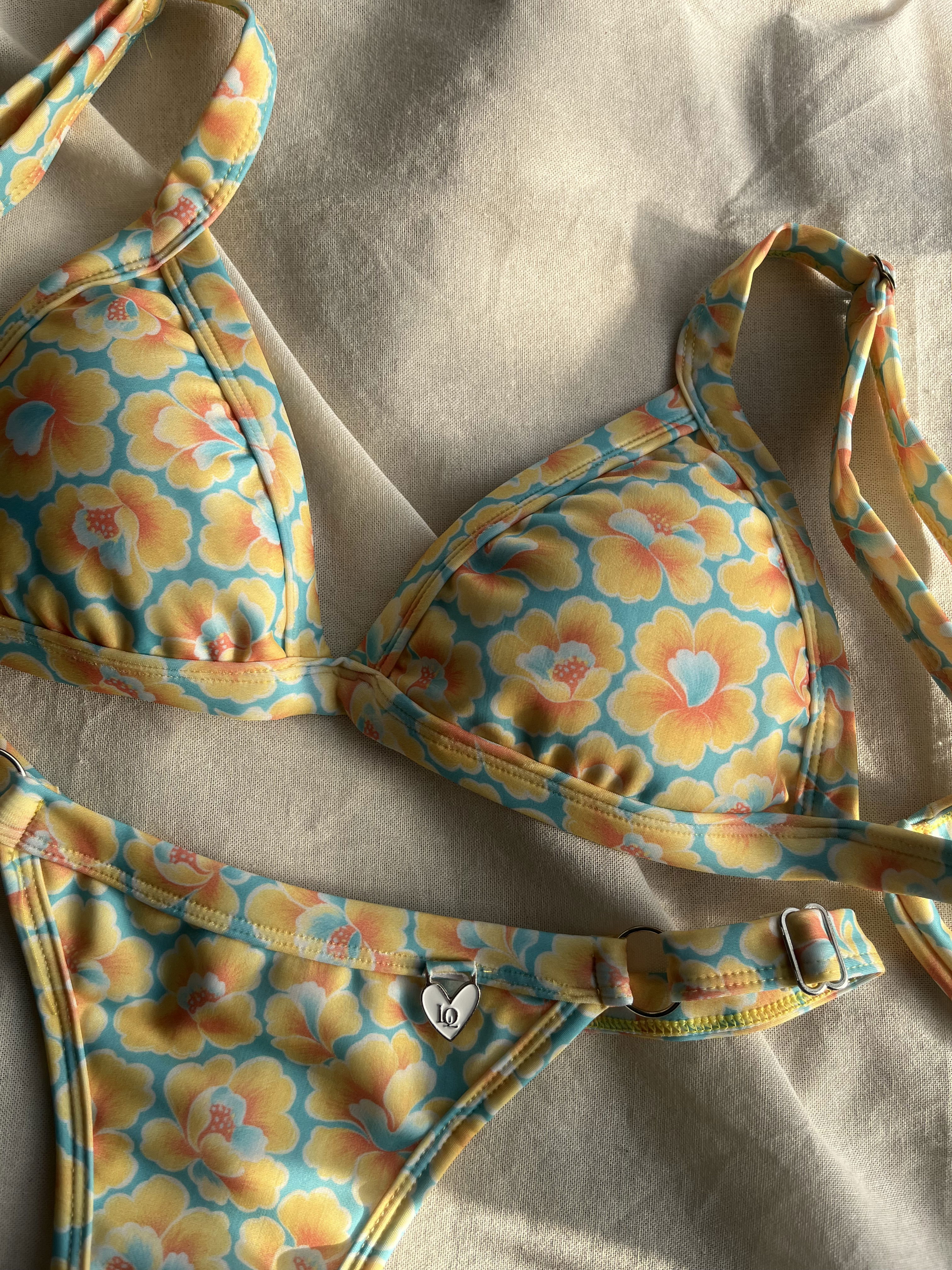 Triángulo lycra tricot estampado. Corpiño con breteles regulables y espalda para atar. Colaless regulable