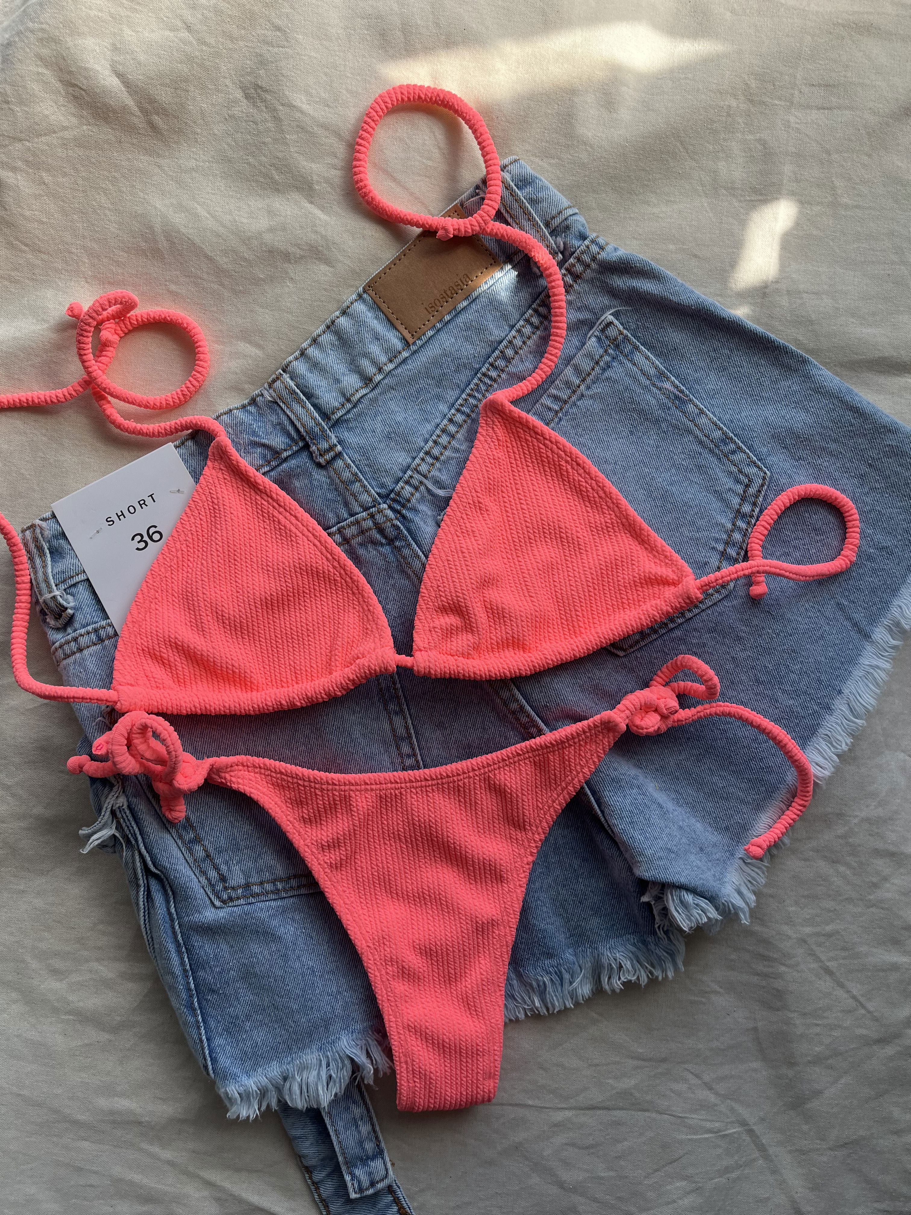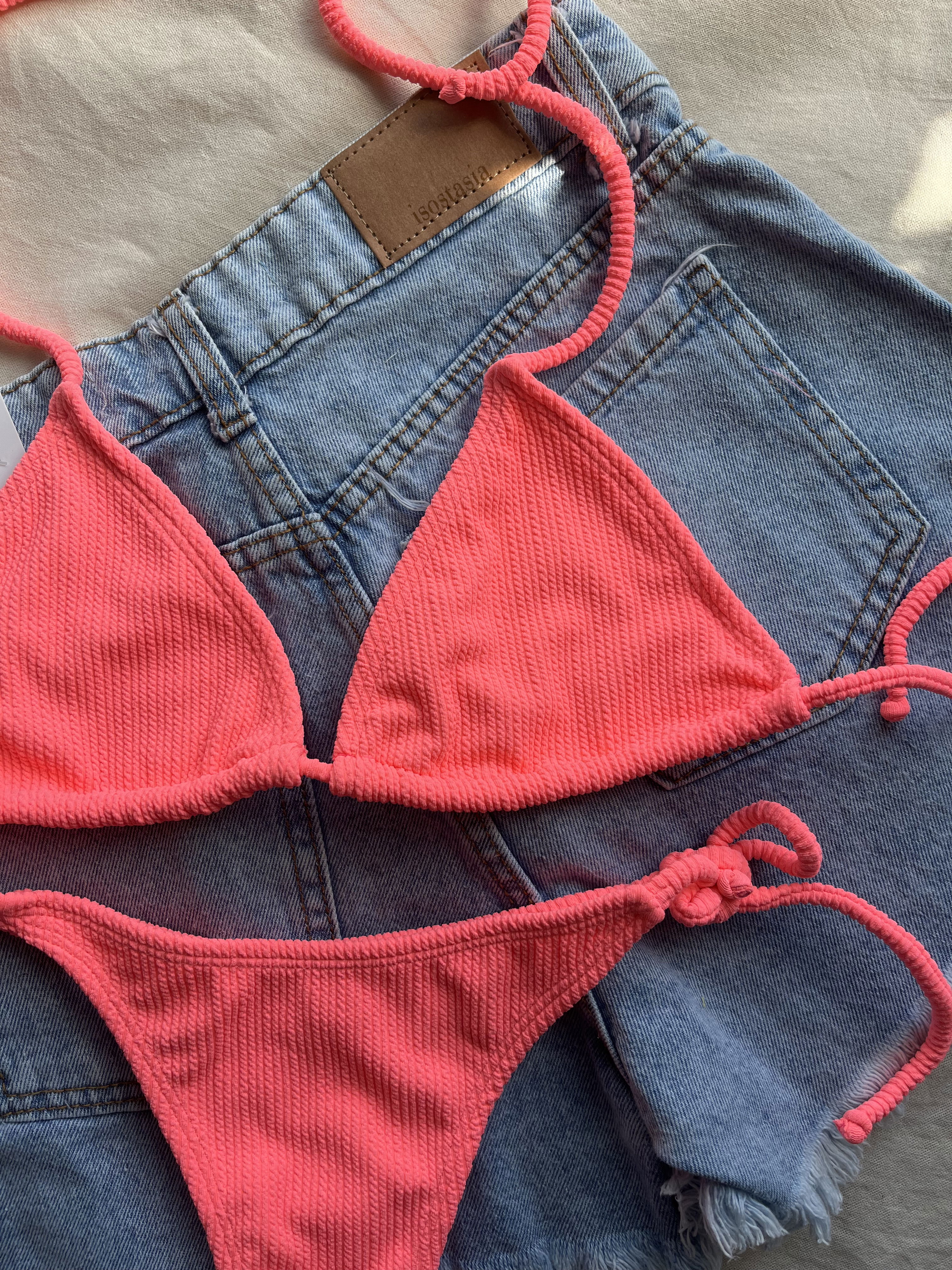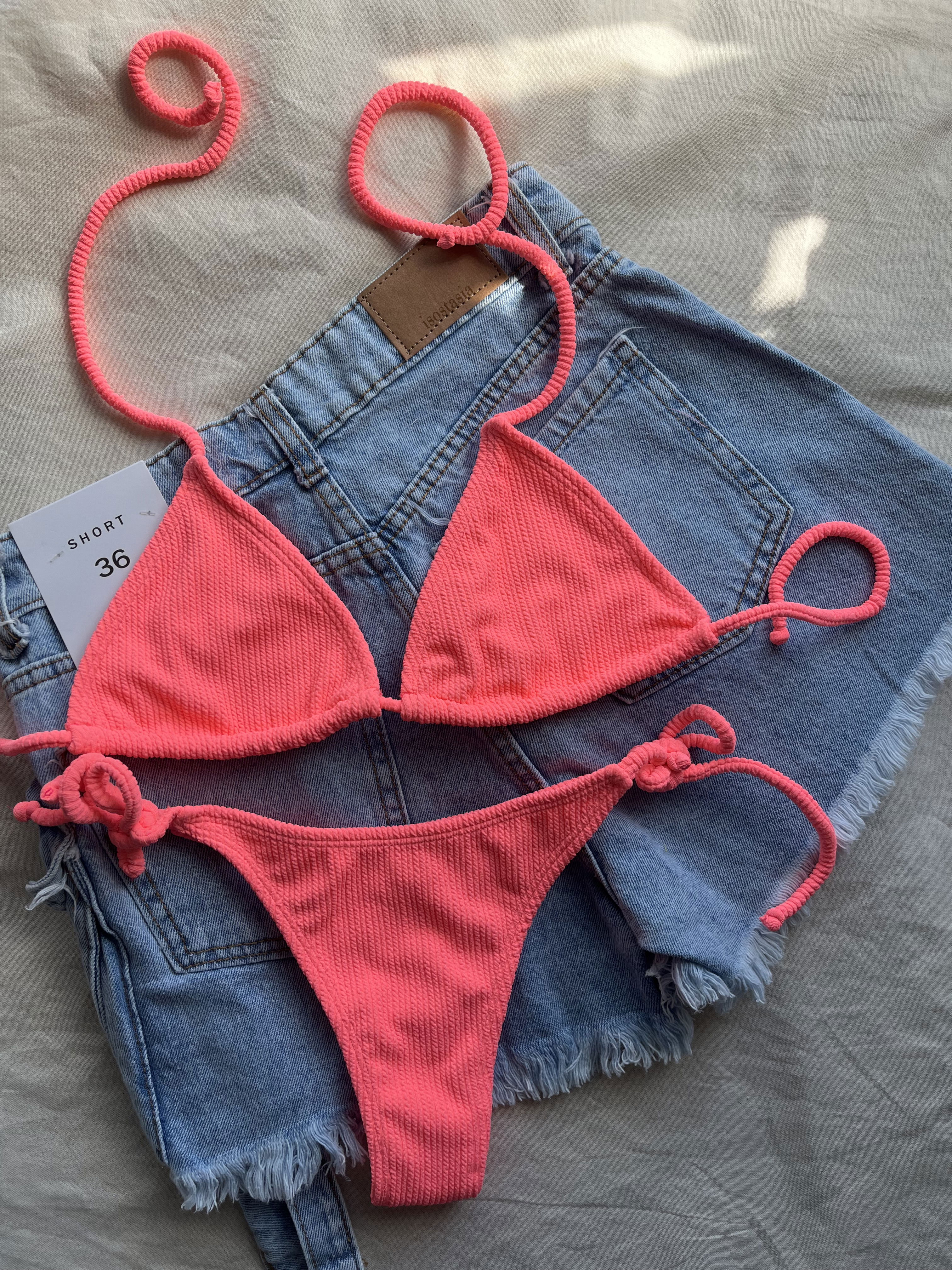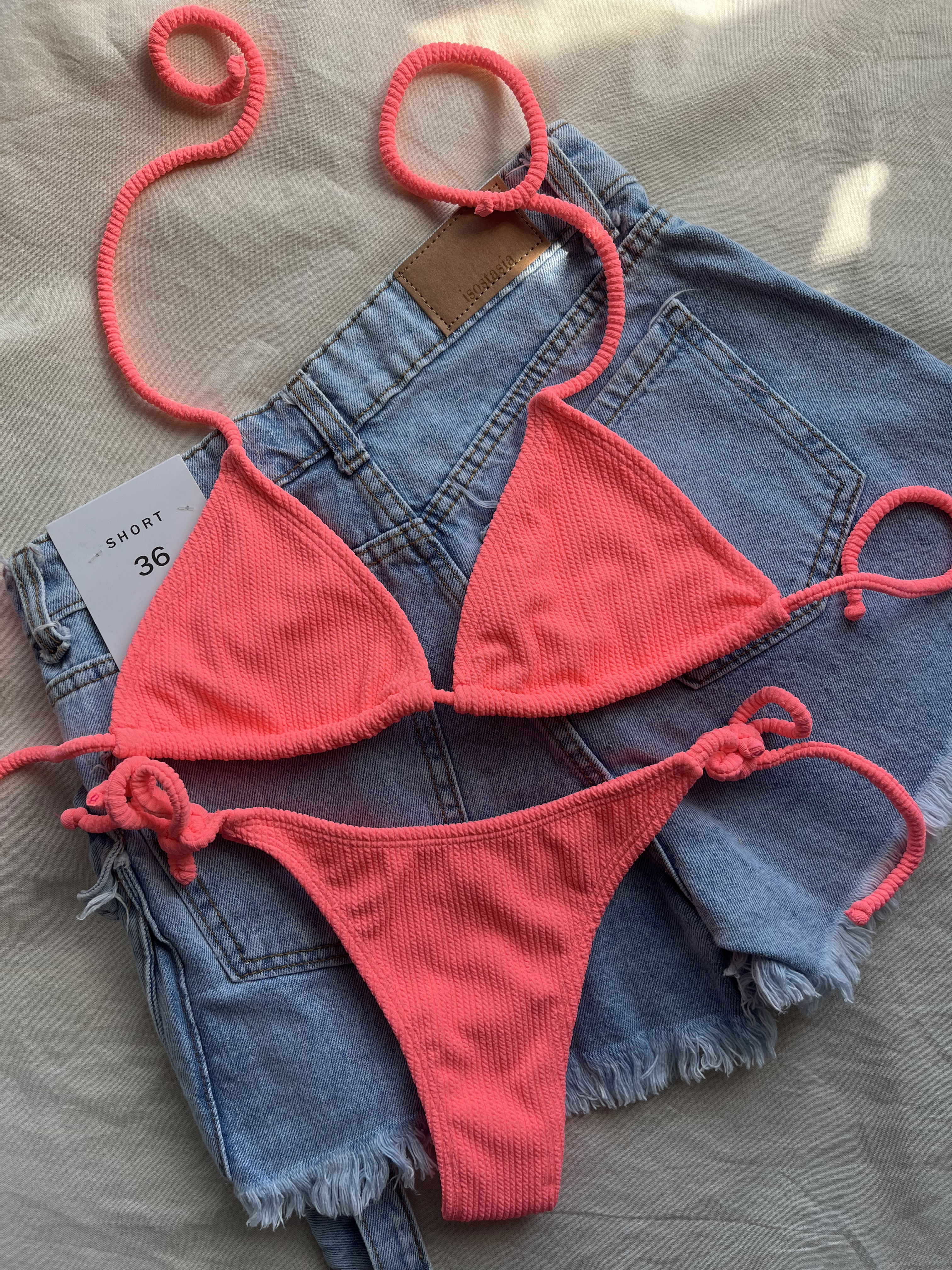 Triángulito texturado y colaless con tiras para atar. Doble forreria y la abertura para agregarle rellenitos.
