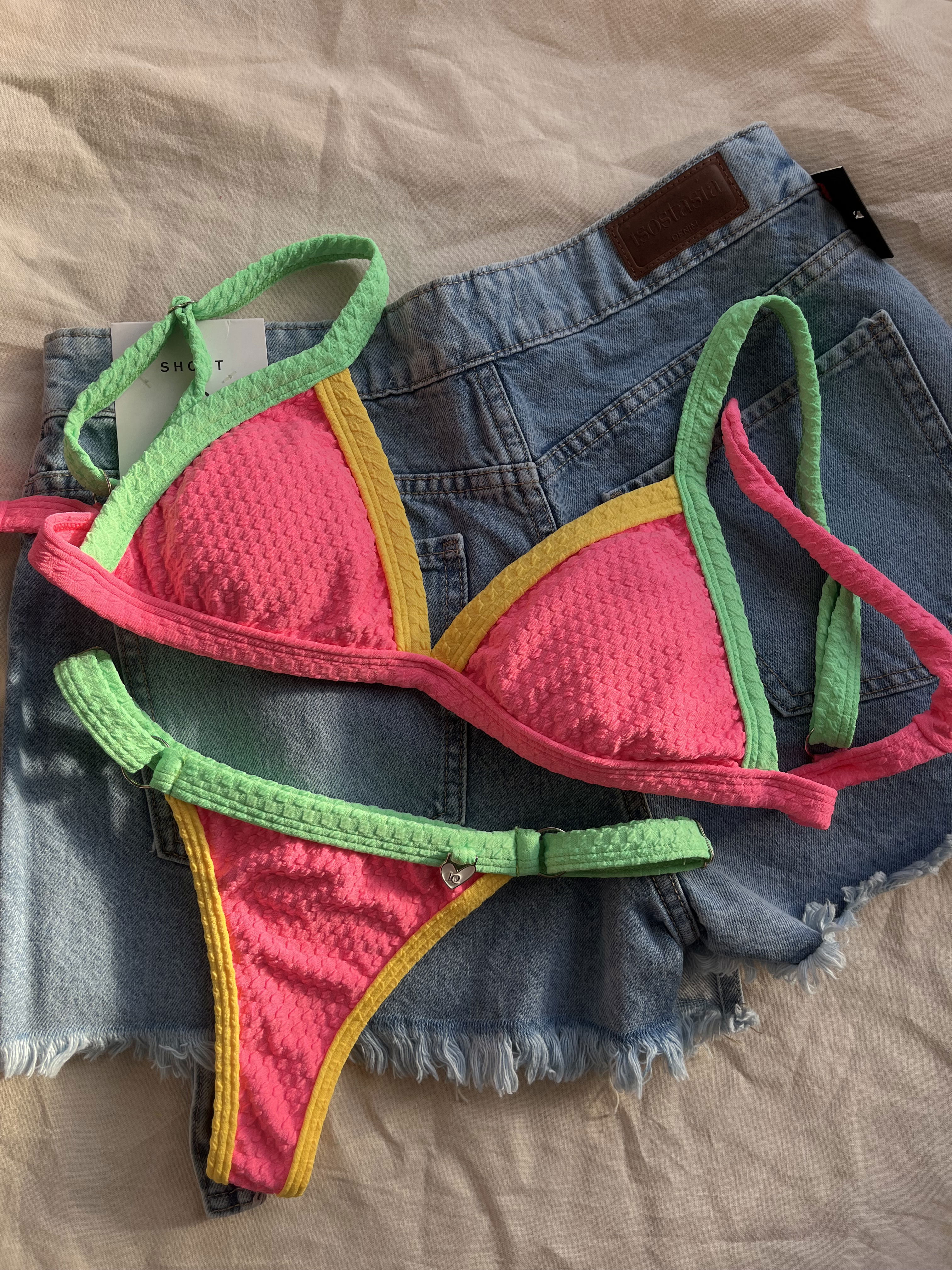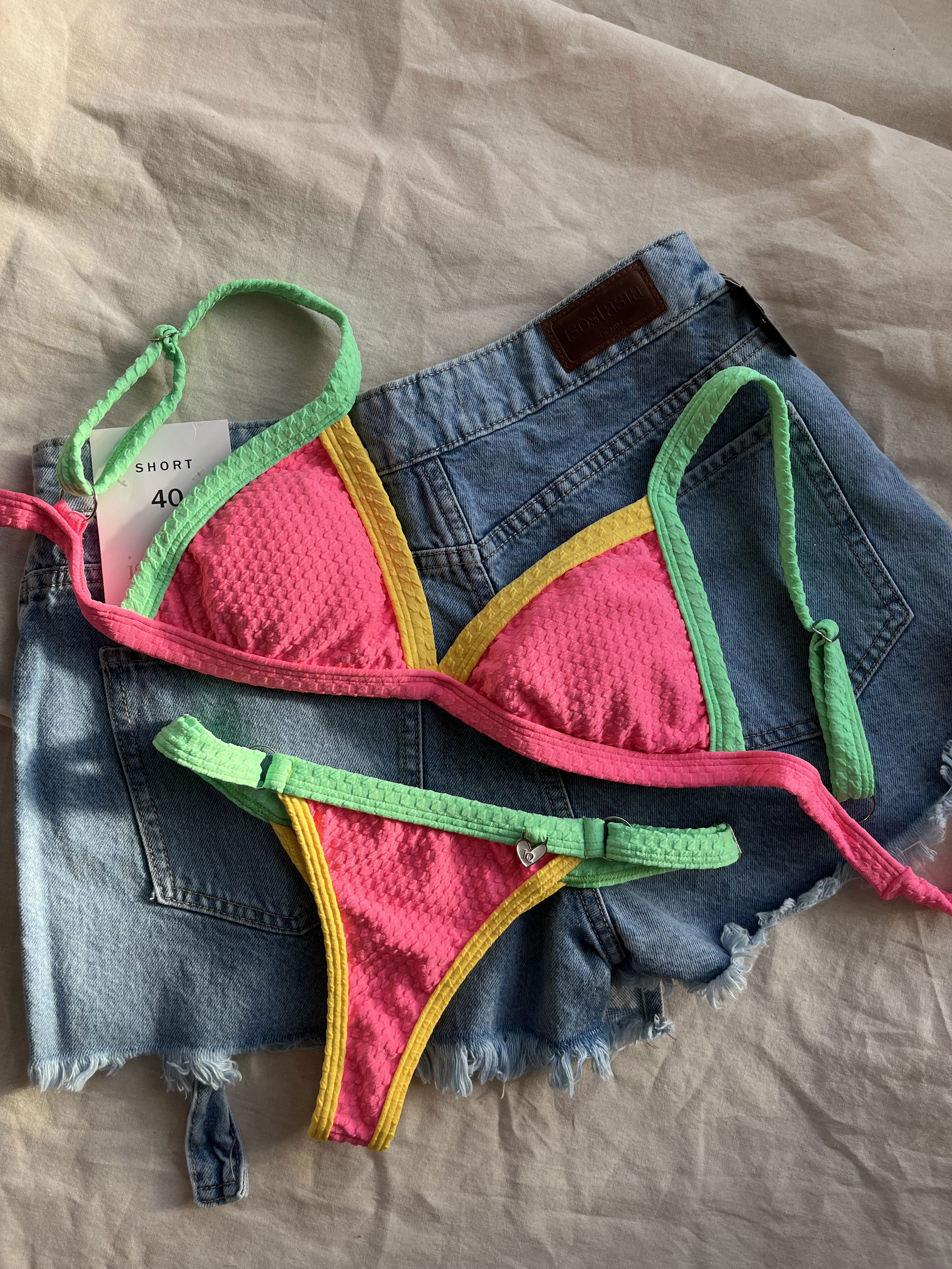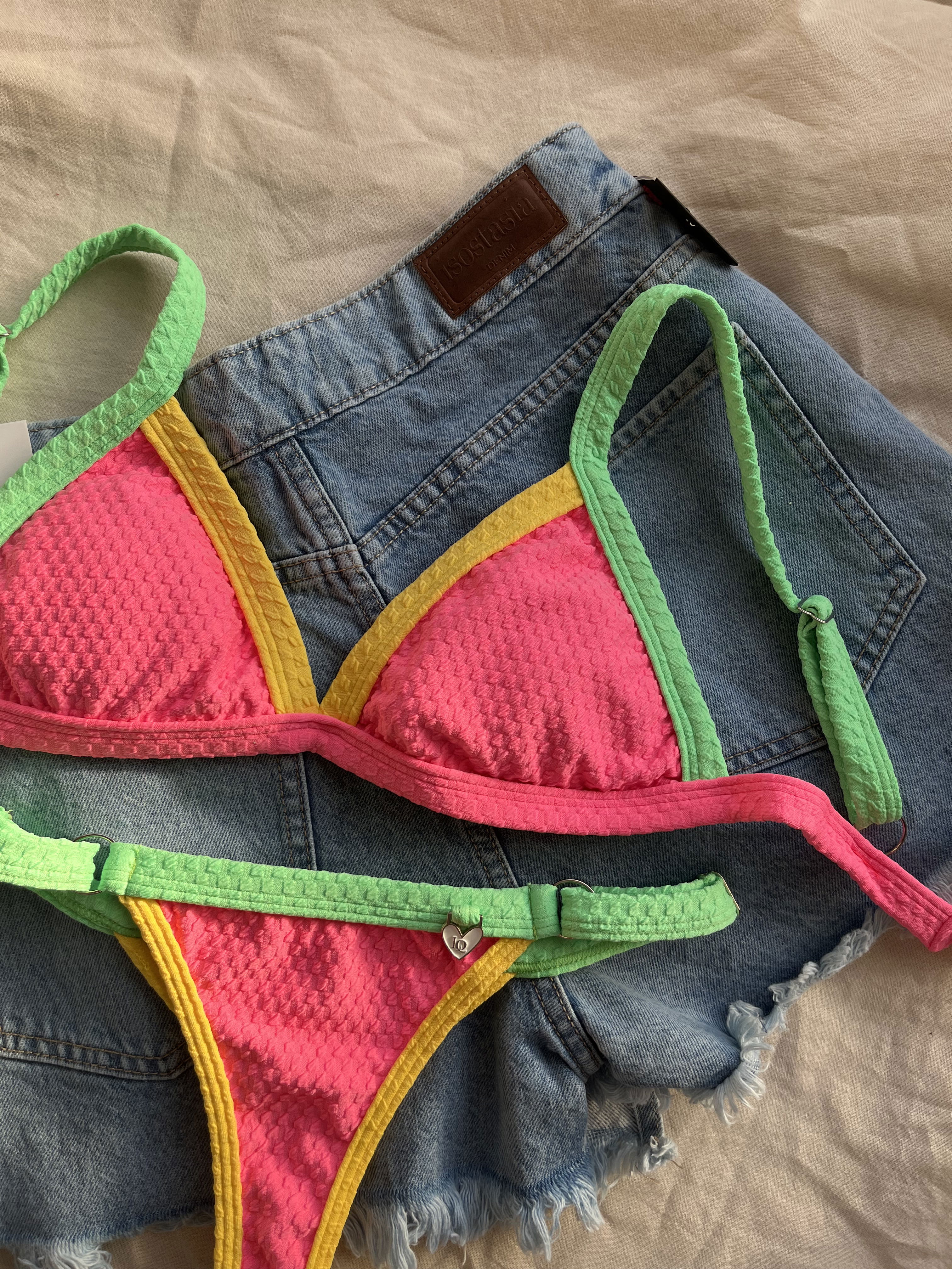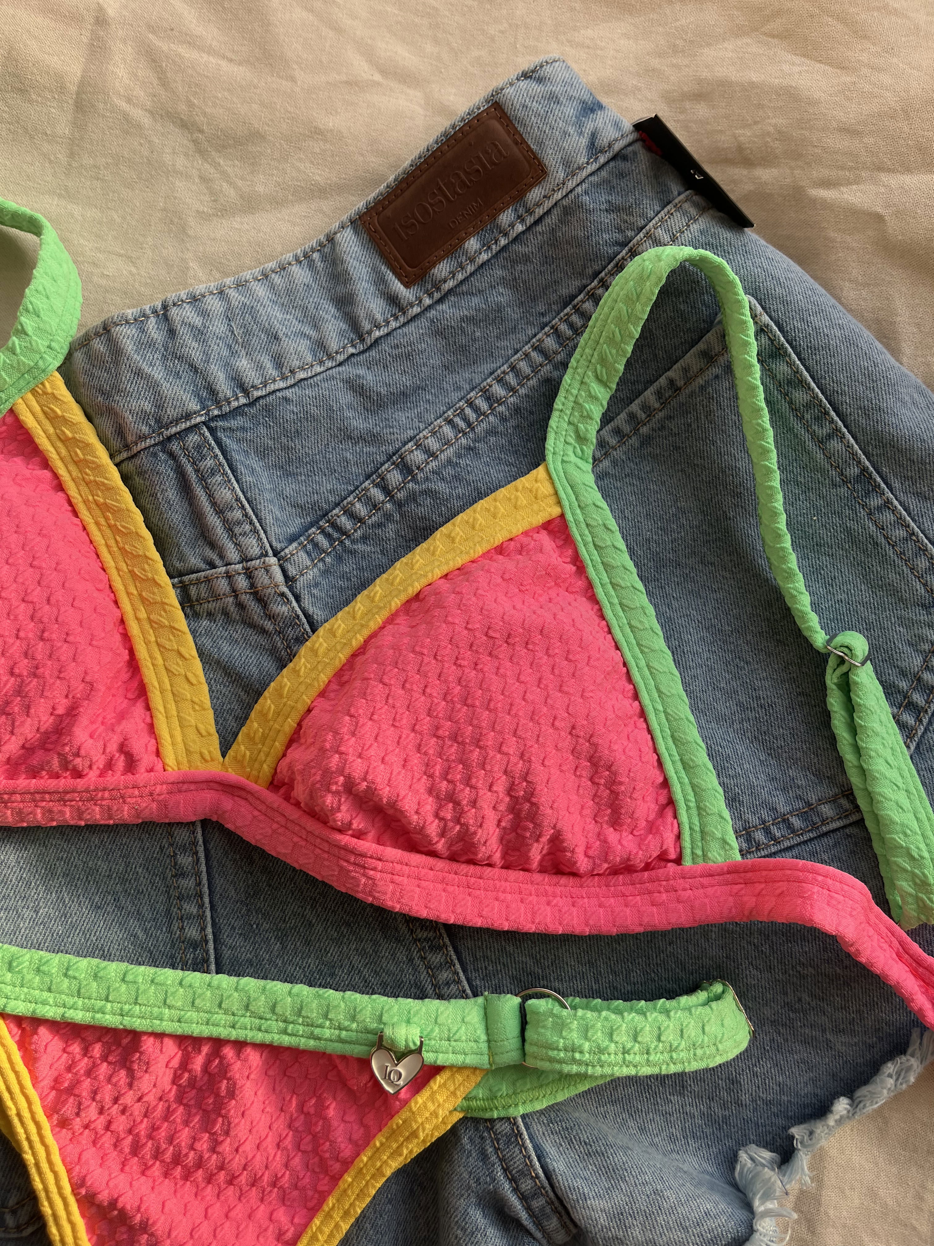 Triángulo texturado. Corpiño con breteles regulables y espalda para atar. Colaless regulable