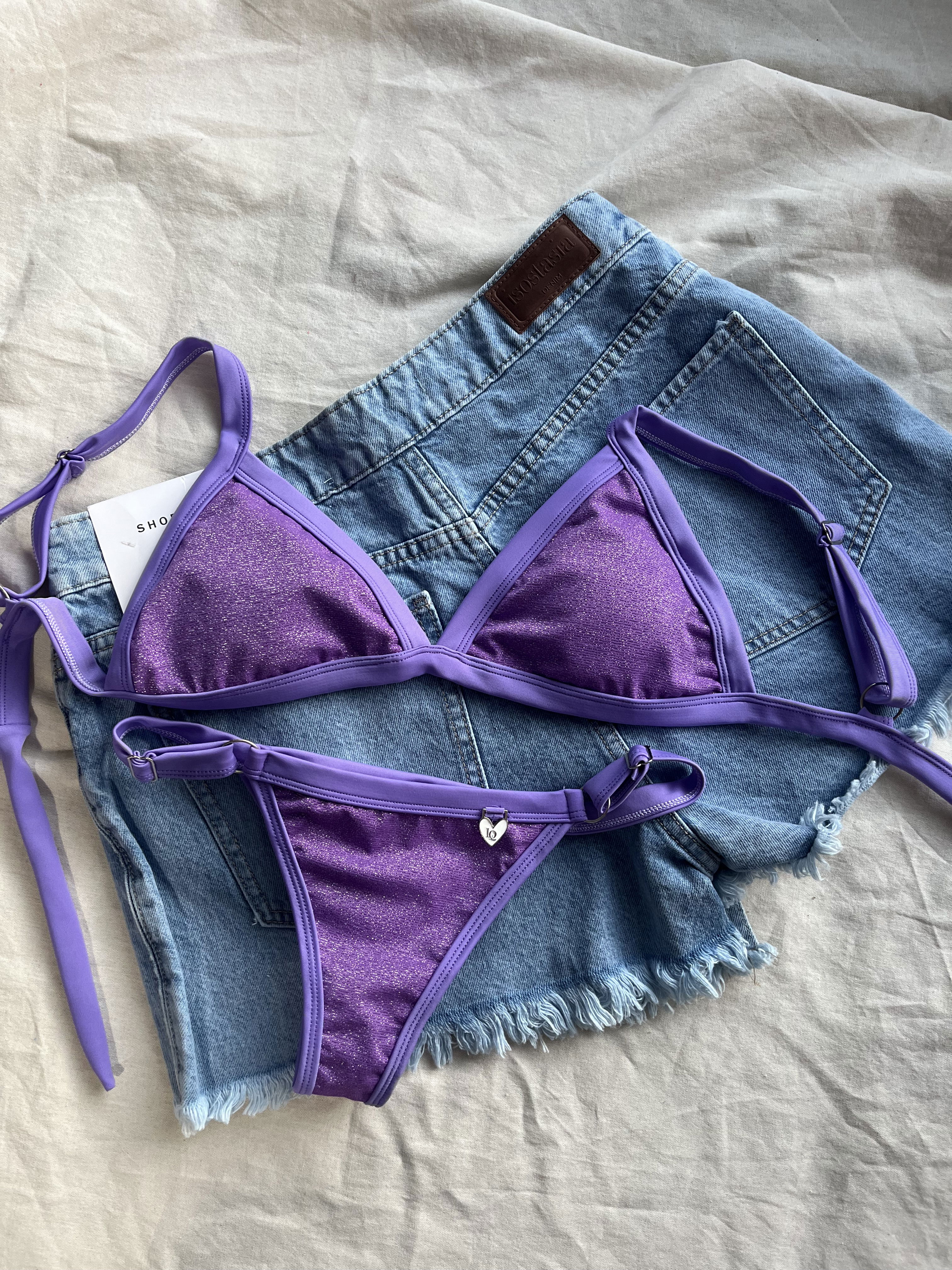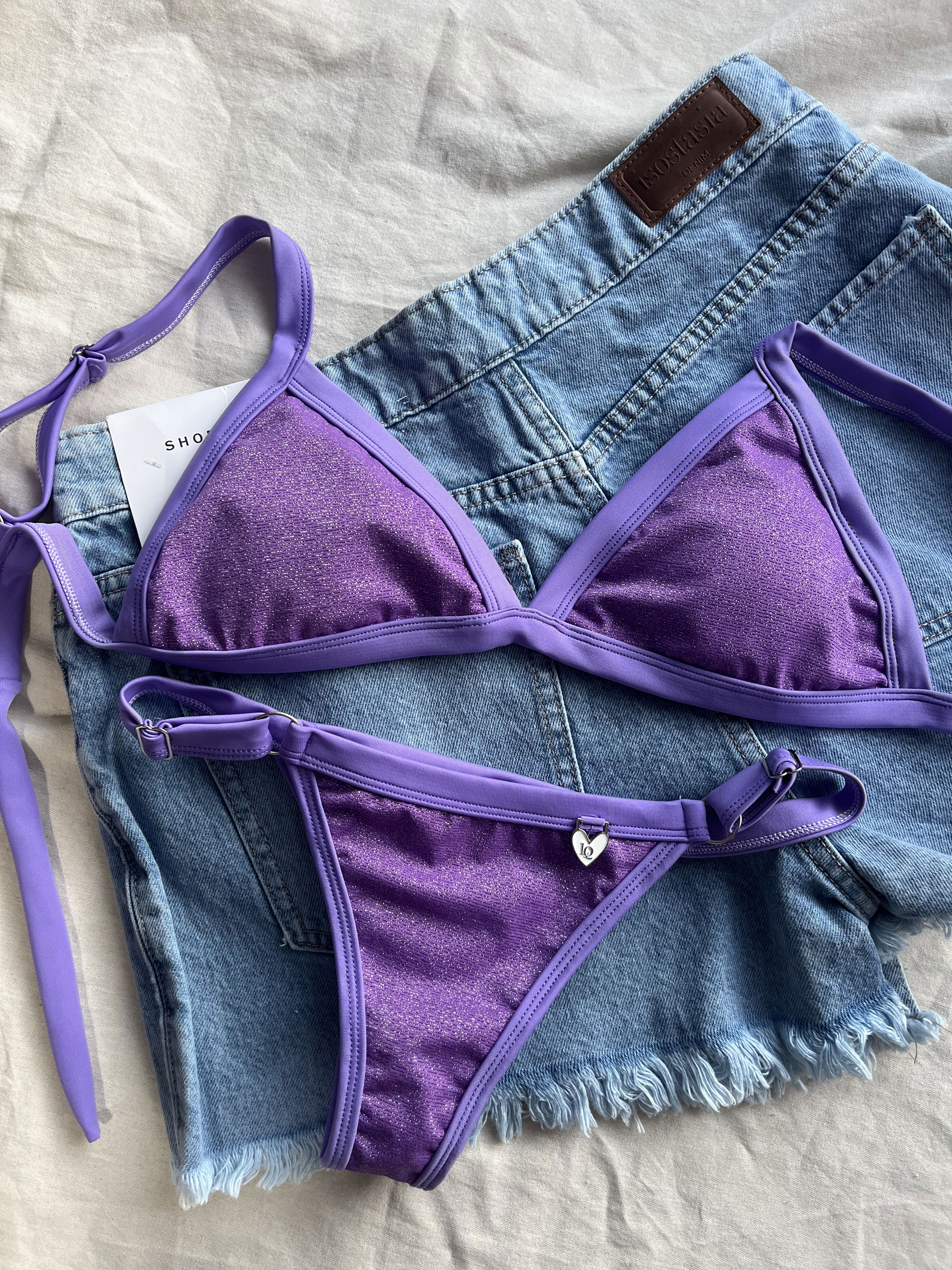 Triángulo lycra tricot glitter. Corpiño con breteles regulables y espalda para atar. Colaless regulable
