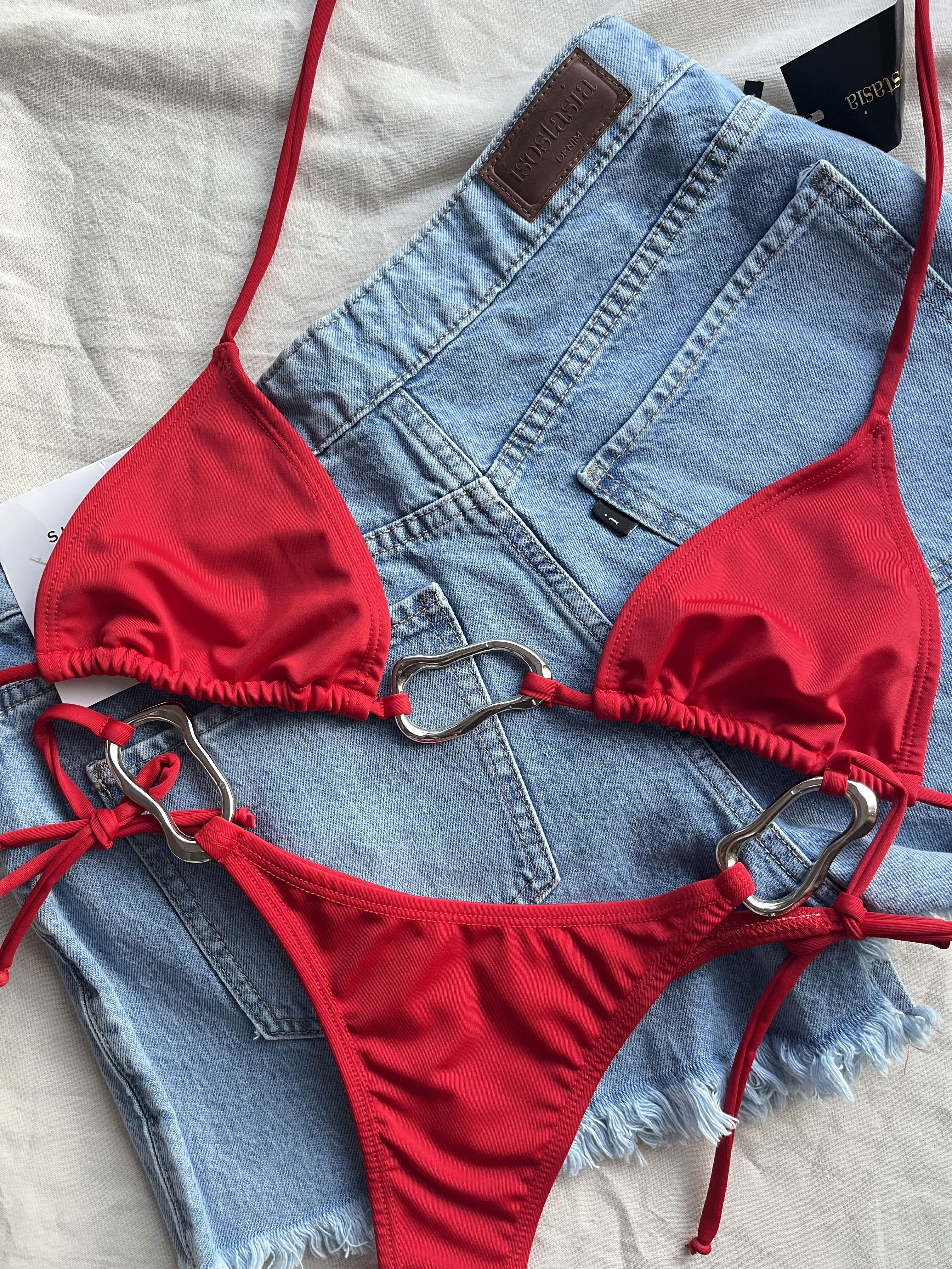 Triángulo con argolla amorfo y tiras para atar , colaless para atar con argollas. Este modelo no incluye tazas desmontables pero si tiene la abertura para agregarle .