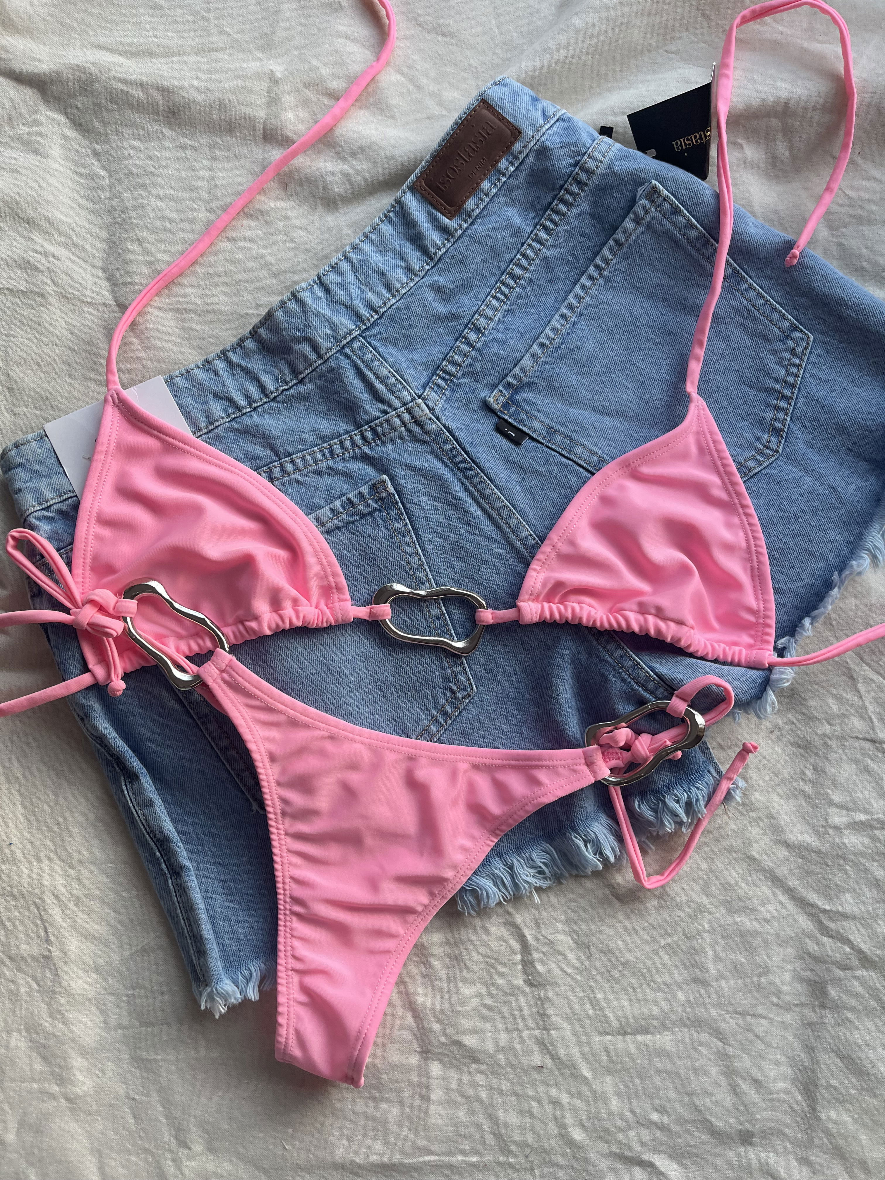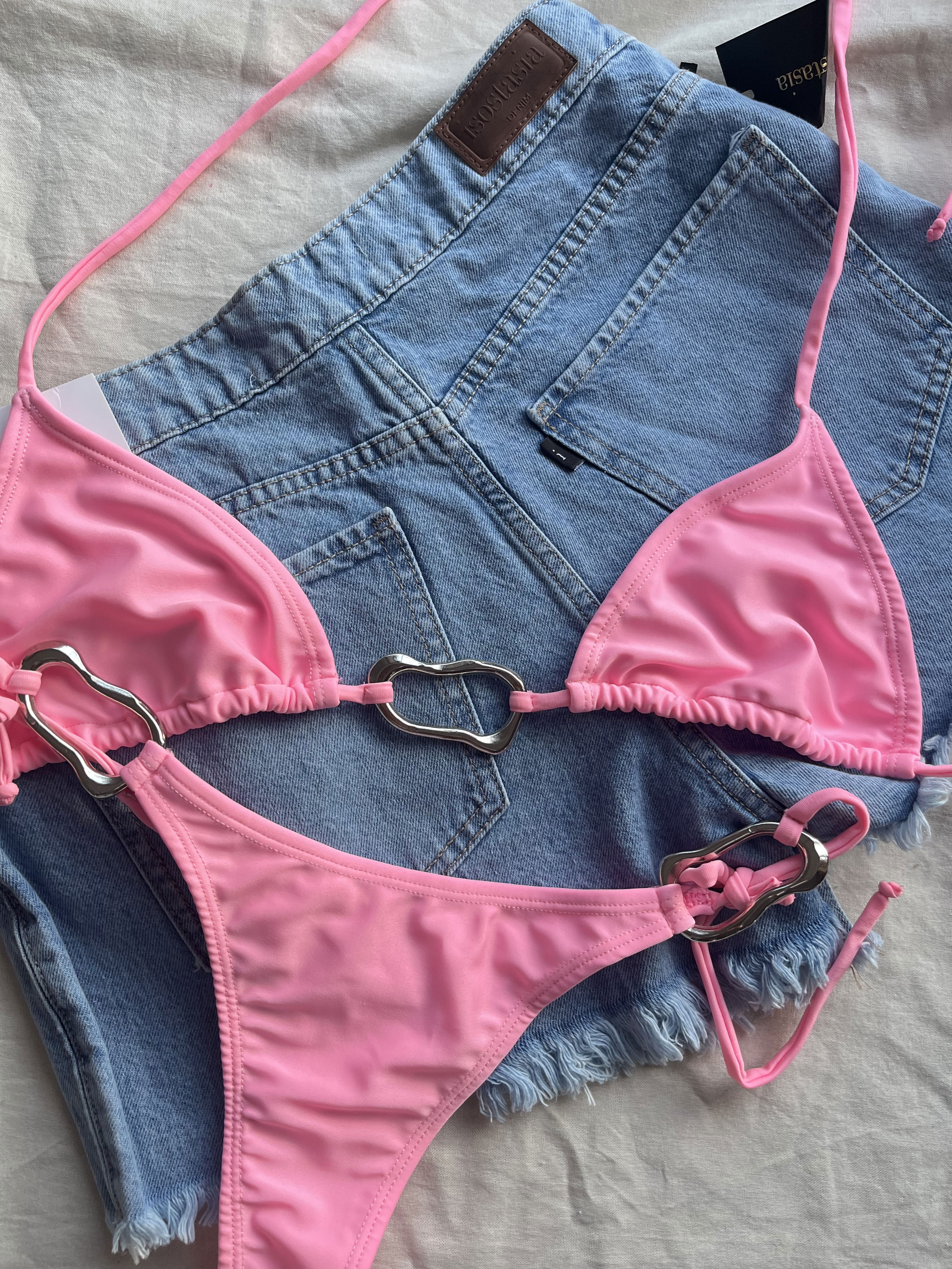 Triángulo con argolla amorfo y tiras para atar , colaless para atar con argollas. Este modelo no incluye tazas desmontables pero si tiene la abertura para agregarle .