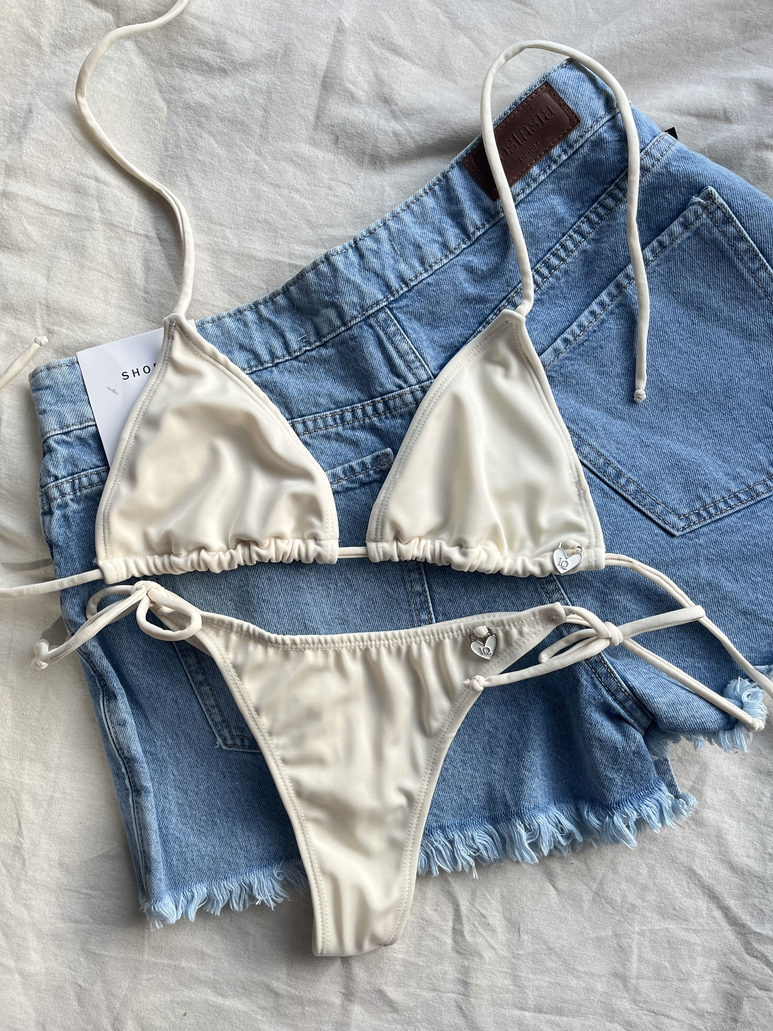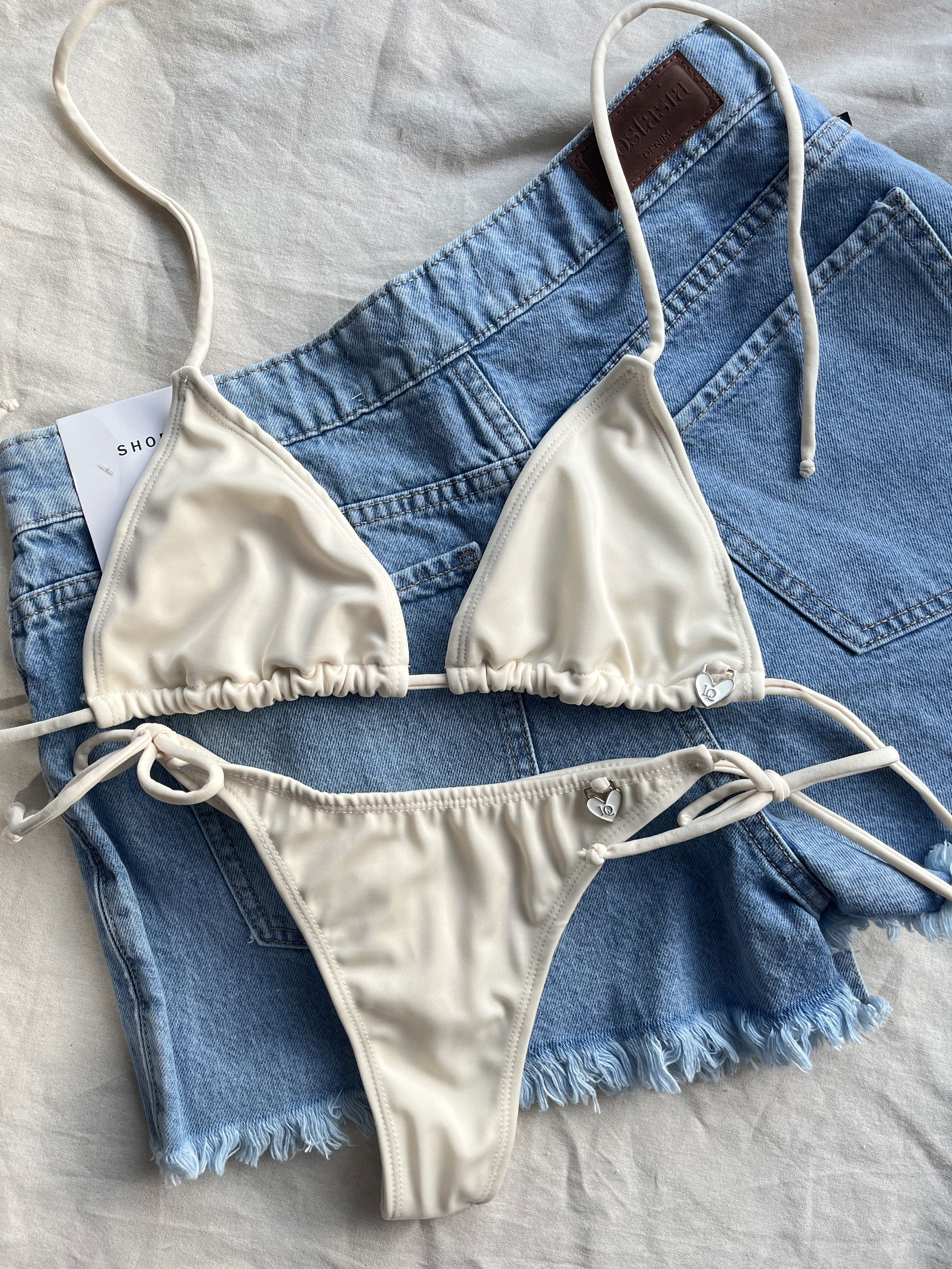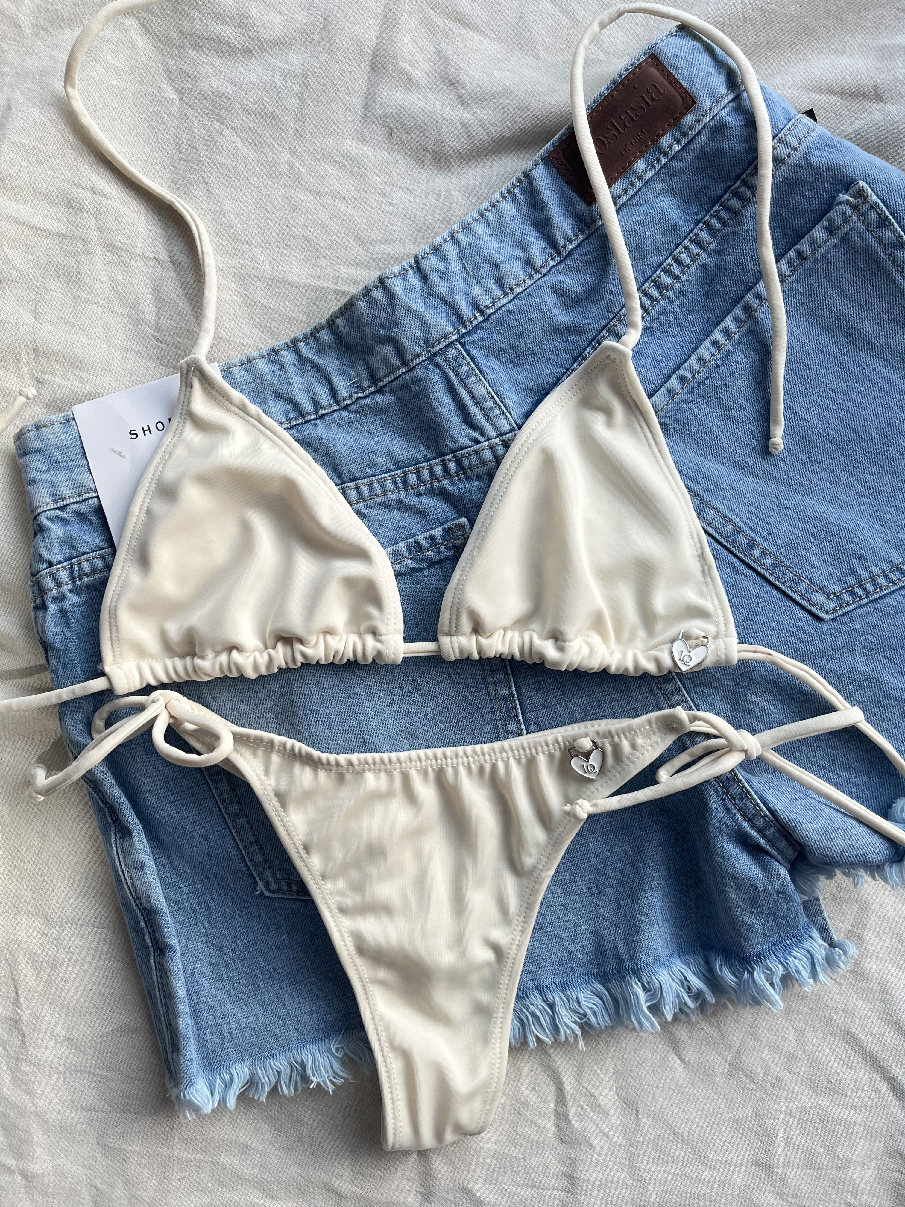 Triángulito en tricot y colaless con tiras para atar. Doble forreria y la abertura para agregarle rellenitos.