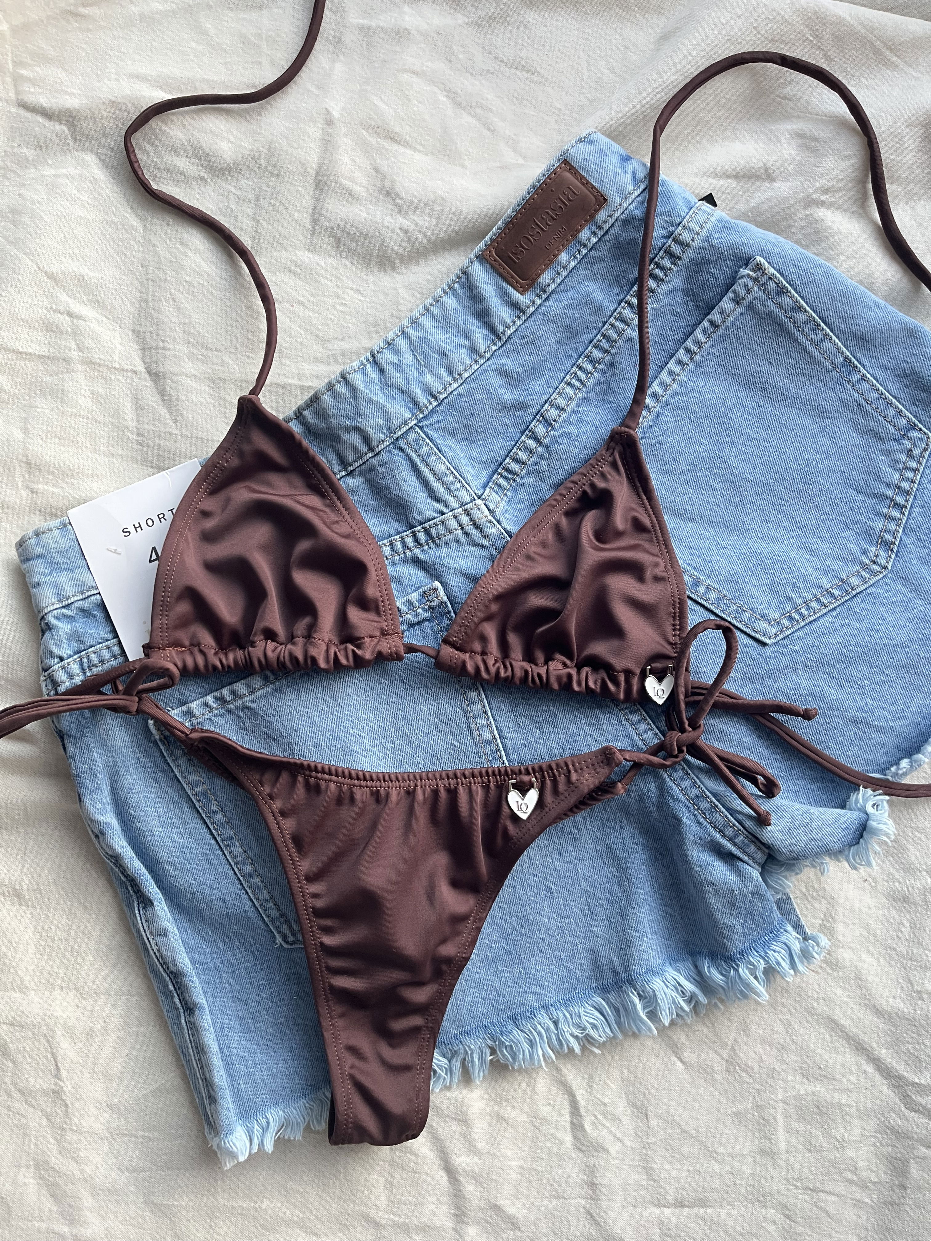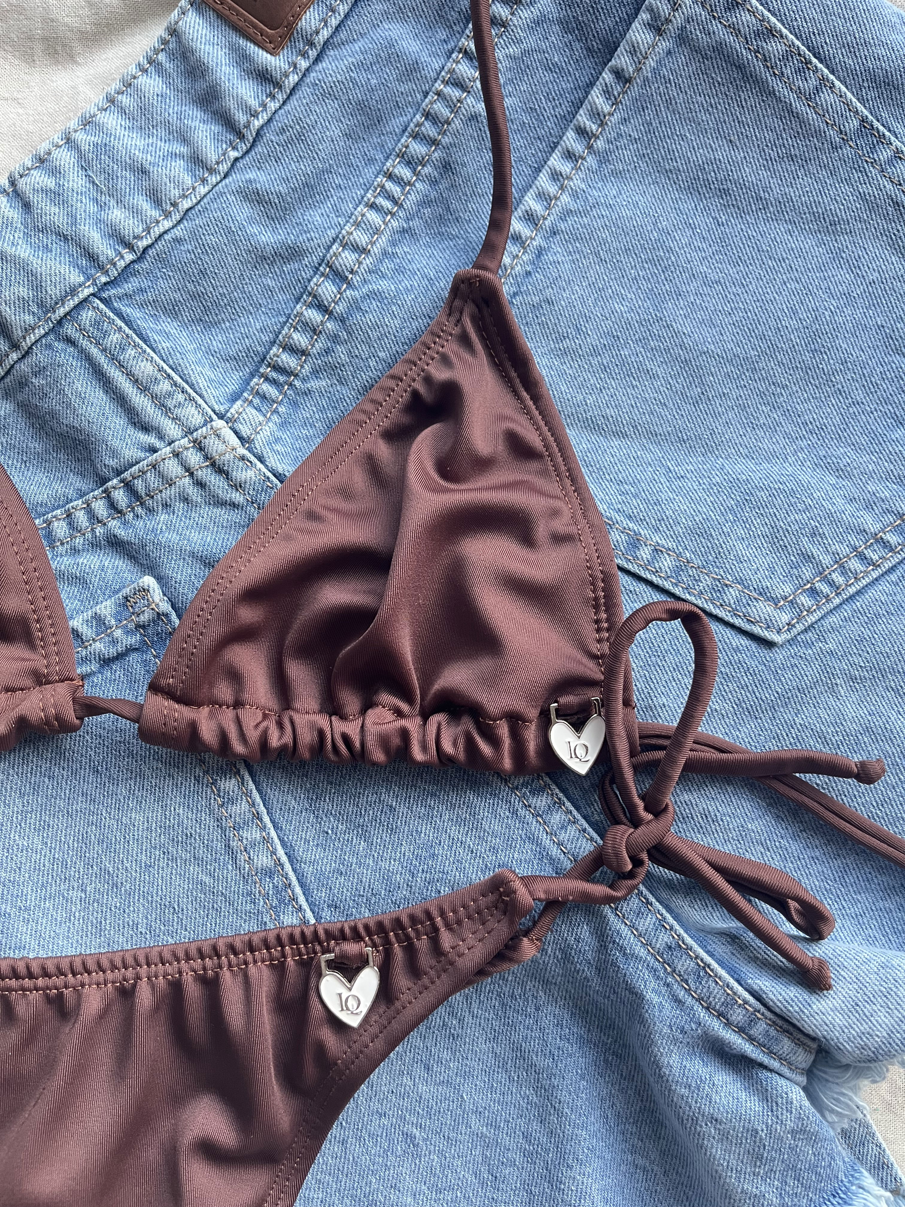 Triángulito en tricot y colaless con tiras para atar. Doble forreria y la abertura para agregarle rellenitos.